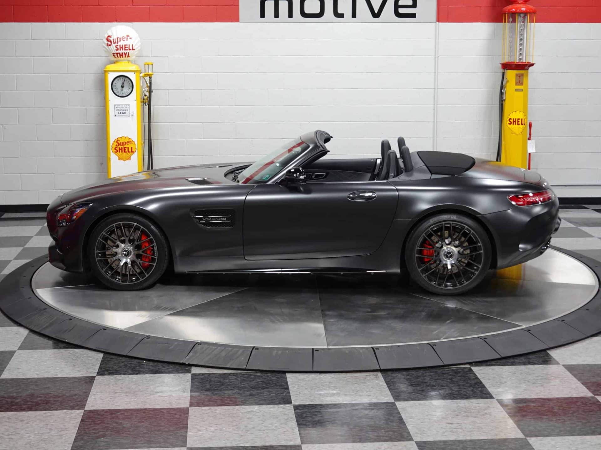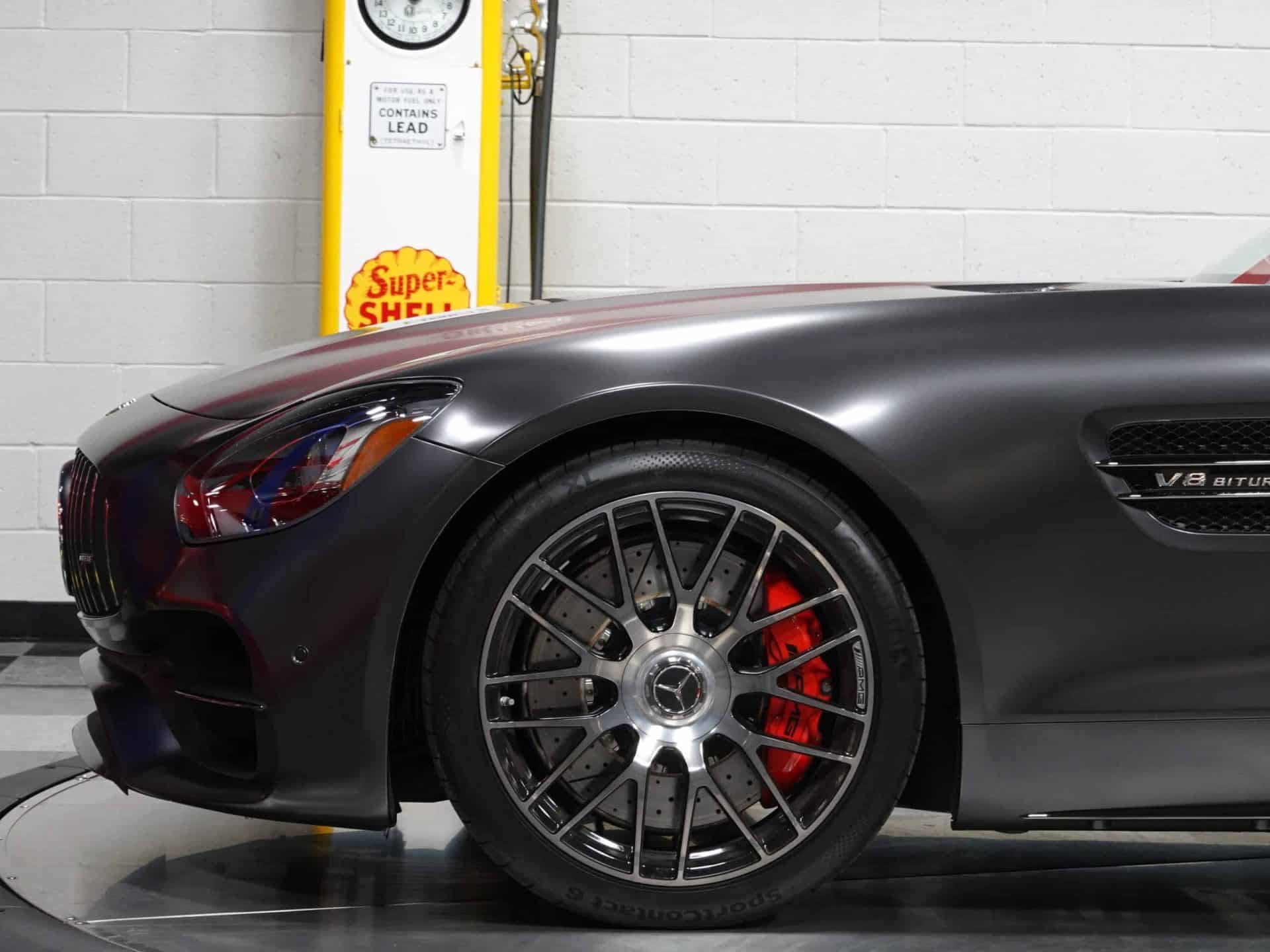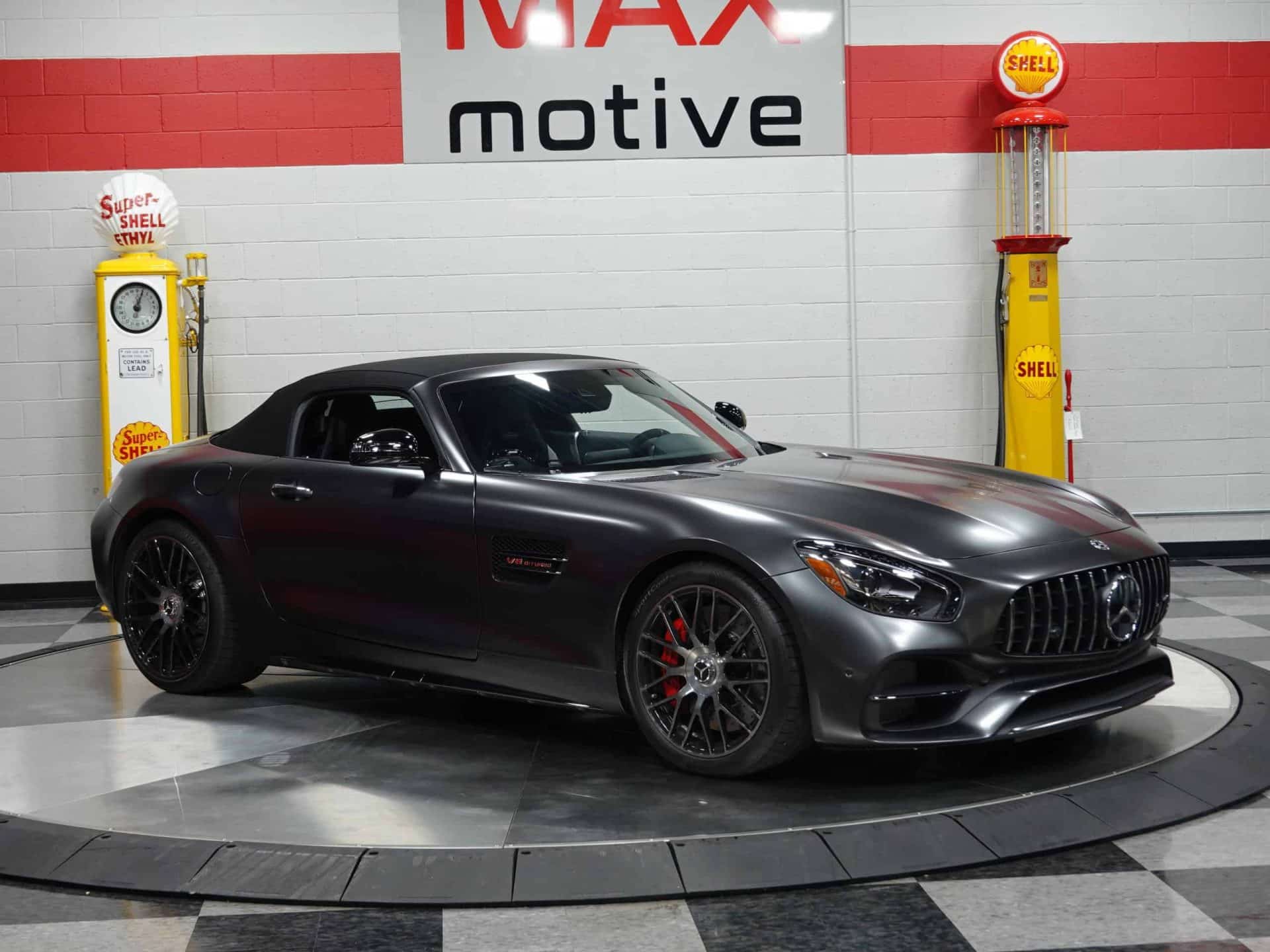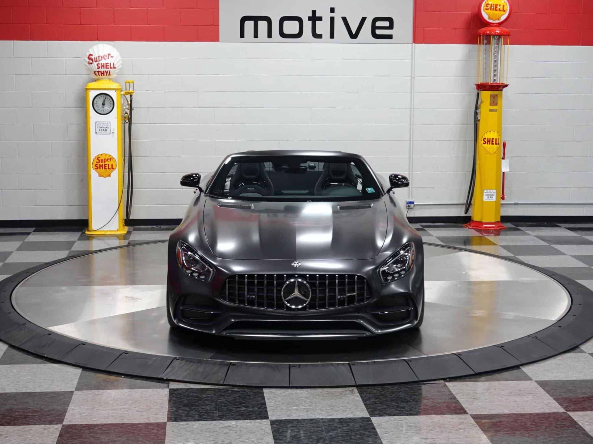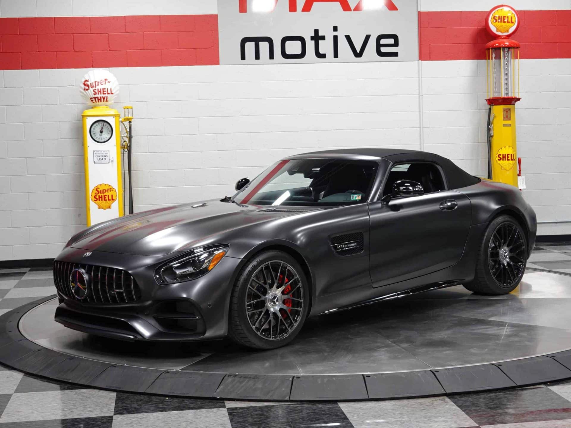 A sight to behold, here is an ultra-exclusive (One of only 50) 2018 Mercedes Benz AMG GT C 50th Anniversary. A mint example with only 552 careful miles, this unique ultra high performance and ultra luxurious Benz offers high-end content and world-class technology. With input from Mercedes Benz’ own Formula 1 World Champion Lewis Hamilton, the company’s AMG racing branch developed the AMG GT entirely in-house. Powered by an authoritative 550 horsepower 4.0L Bi-Turbo V8, it is an extremely engaging automobile with five driving modes. They are Individual (which lets you blend characteristics of the others), Comfort, Sport, Sport +, and Race. You can even adjust the sound of the exhaust. Paddle shifters allow you to operate the AMG Speedshift 7-speed Dual Clutch Automatic Transmission manually. The AMG GT C is a world-class sports car in its own right, but to celebrate the 50th Anniversary of AMG, 50 of these special editions were offered. The 50th Anniversary Edition adds the matte Designo Graphite Gray Magno exterior finish; forged gloss black cross-spoke AMG wheels; black chrome front splitter, fender vent fins, and side skirt inserts; plus black chrome rear diffuser trim and black chrome exhaust outlets. The interior gets silver pearl and black Nappa leather diamond-stitched upholstery, AMG black chrome interior trim, an AMG full Dinamica suede-covered steering wheel (and roof liner), and AMG Edition 50 badging. Burmester High End sound fills the cabin, Mercedes’ optional Parktronic system aids with parking, and the Distronic option is an autonomous cruise-control system. There are many delightful features not found on many cars. The top of the steering wheel is marked just like a Formula 1 car and it’s connected to an electrohydraulic steering rack. The engine and transaxle mounts are electronically controlled to provide an optimum blend of comfort and precision. And there’s a “Handcrafted” badge on the engine cover with the personal signature of the AMG technician who assembled the engine.