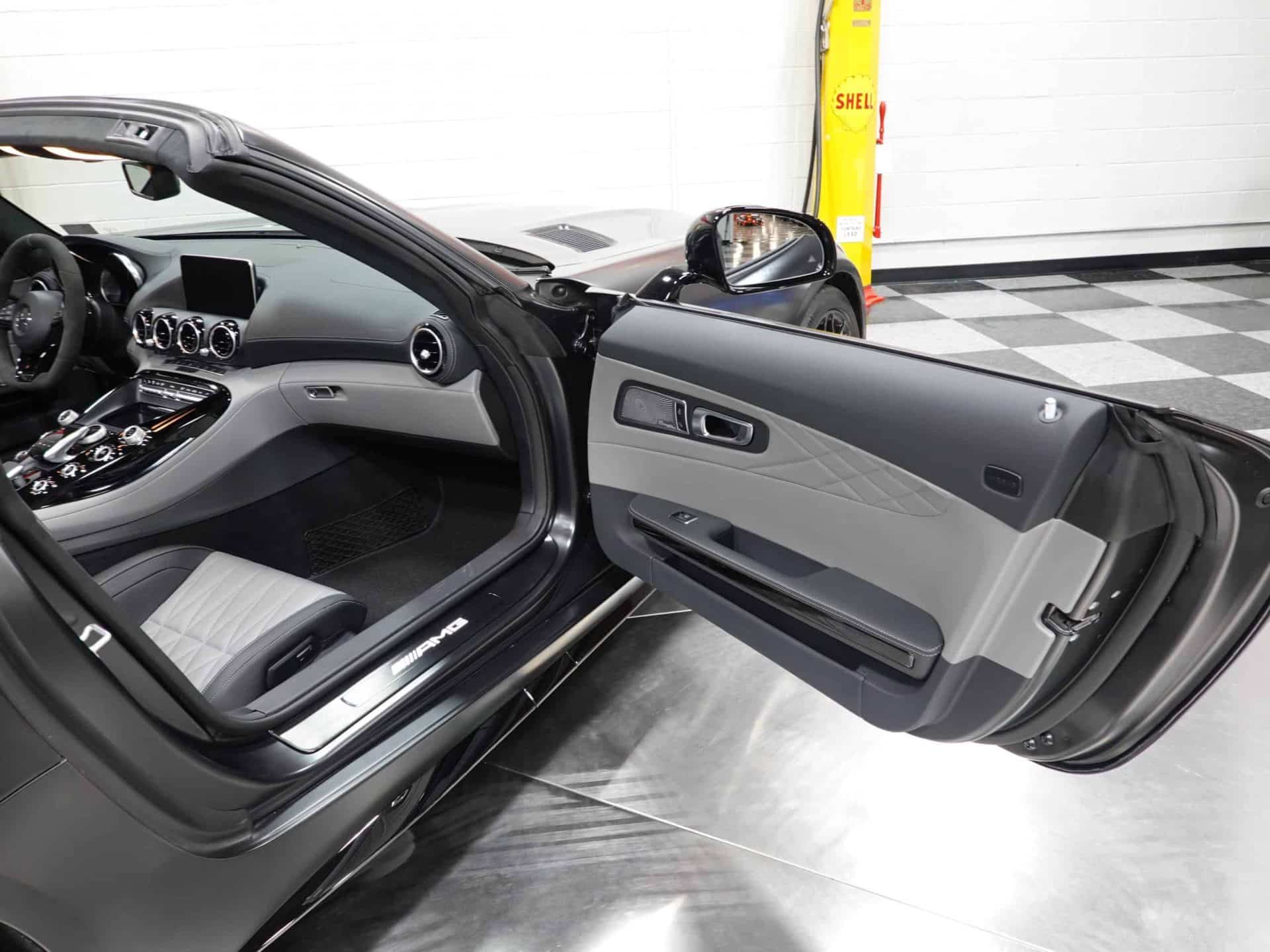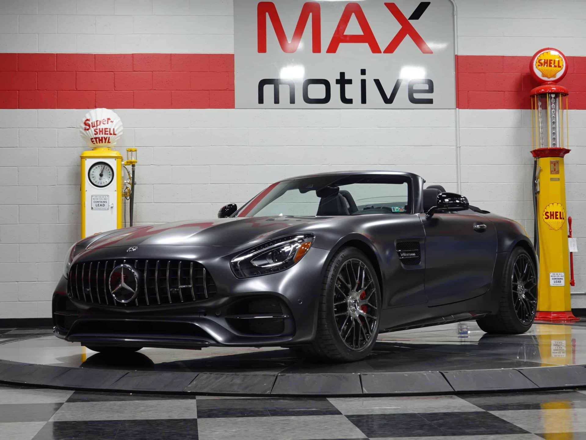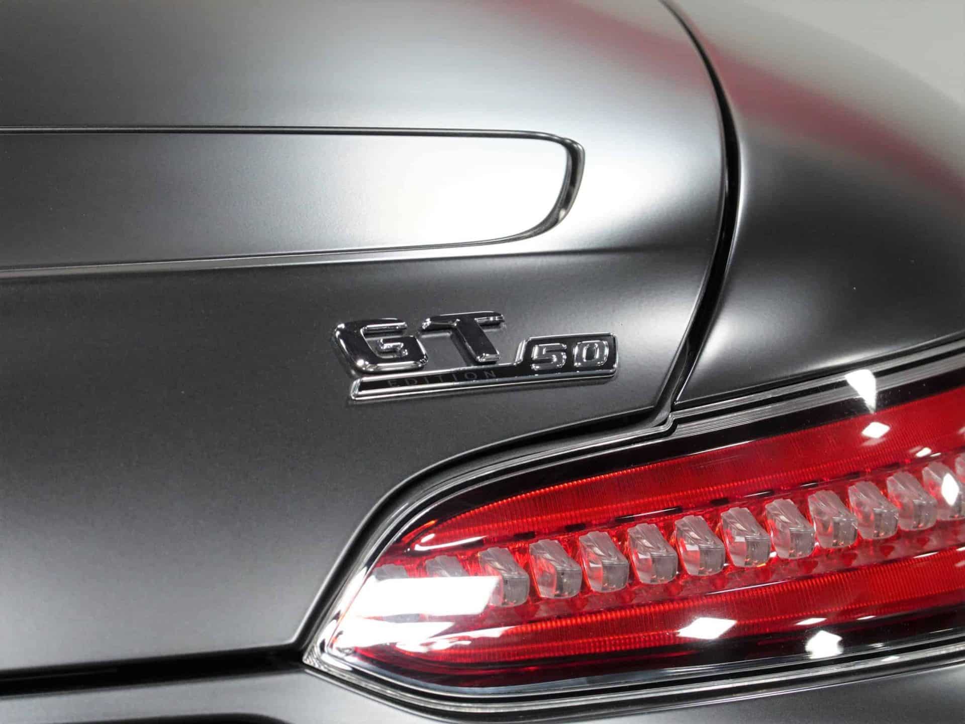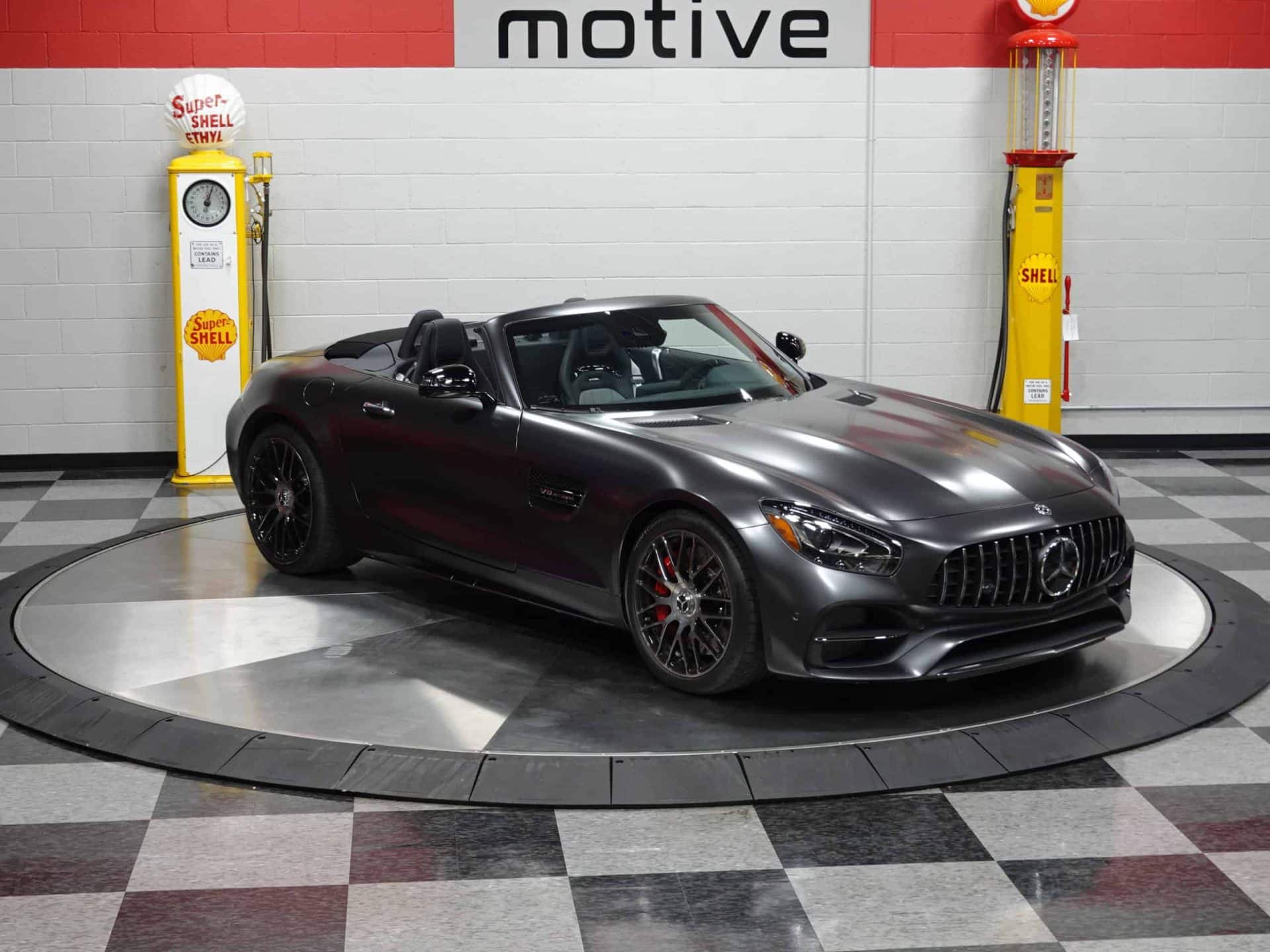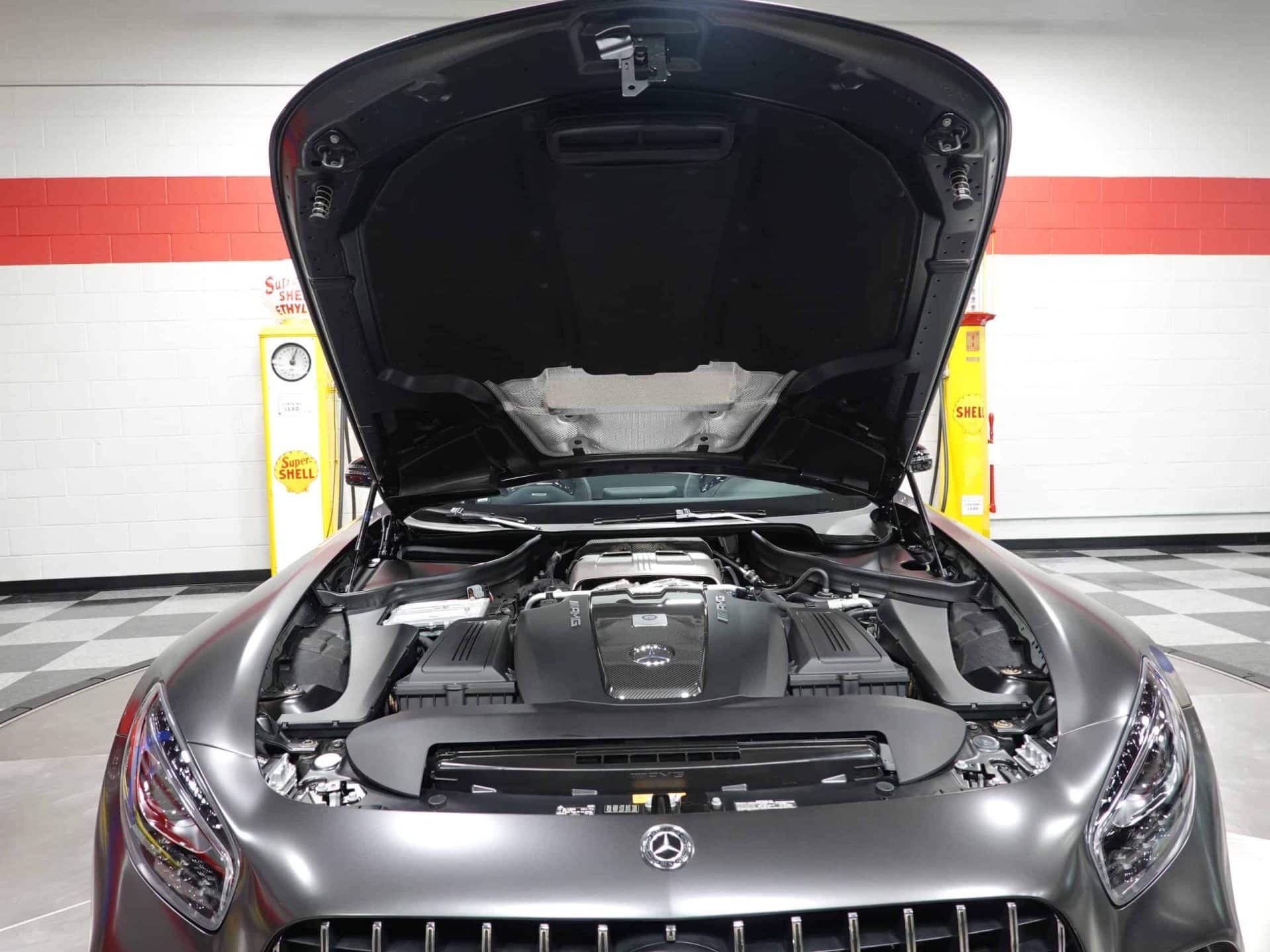 A sight to behold, here is an ultra-exclusive (One of only 50) 2018 Mercedes Benz AMG GT C 50th Anniversary. A mint example with only 552 careful miles, this unique ultra high performance and ultra luxurious Benz offers high-end content and world-class technology. With input from Mercedes Benz’ own Formula 1 World Champion Lewis Hamilton, the company’s AMG racing branch developed the AMG GT entirely in-house. Powered by an authoritative 550 horsepower 4.0L Bi-Turbo V8, it is an extremely engaging automobile with five driving modes. They are Individual (which lets you blend characteristics of the others), Comfort, Sport, Sport +, and Race. You can even adjust the sound of the exhaust. Paddle shifters allow you to operate the AMG Speedshift 7-speed Dual Clutch Automatic Transmission manually. The AMG GT C is a world-class sports car in its own right, but to celebrate the 50th Anniversary of AMG, 50 of these special editions were offered. The 50th Anniversary Edition adds the matte Designo Graphite Gray Magno exterior finish; forged gloss black cross-spoke AMG wheels; black chrome front splitter, fender vent fins, and side skirt inserts; plus black chrome rear diffuser trim and black chrome exhaust outlets. The interior gets silver pearl and black Nappa leather diamond-stitched upholstery, AMG black chrome interior trim, an AMG full Dinamica suede-covered steering wheel (and roof liner), and AMG Edition 50 badging. Burmester High End sound fills the cabin, Mercedes’ optional Parktronic system aids with parking, and the Distronic option is an autonomous cruise-control system. There are many delightful features not found on many cars. The top of the steering wheel is marked just like a Formula 1 car and it’s connected to an electrohydraulic steering rack. The engine and transaxle mounts are electronically controlled to provide an optimum blend of comfort and precision. And there’s a “Handcrafted” badge on the engine cover with the personal signature of the AMG technician who assembled the engine.