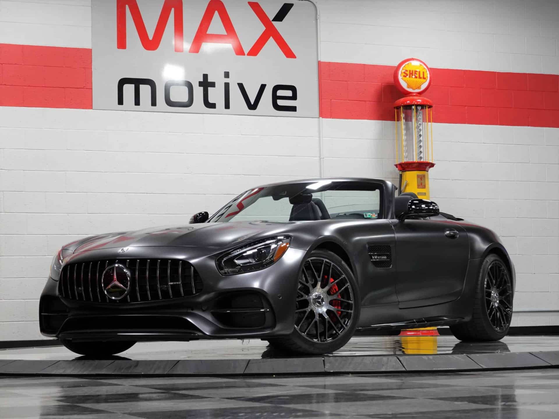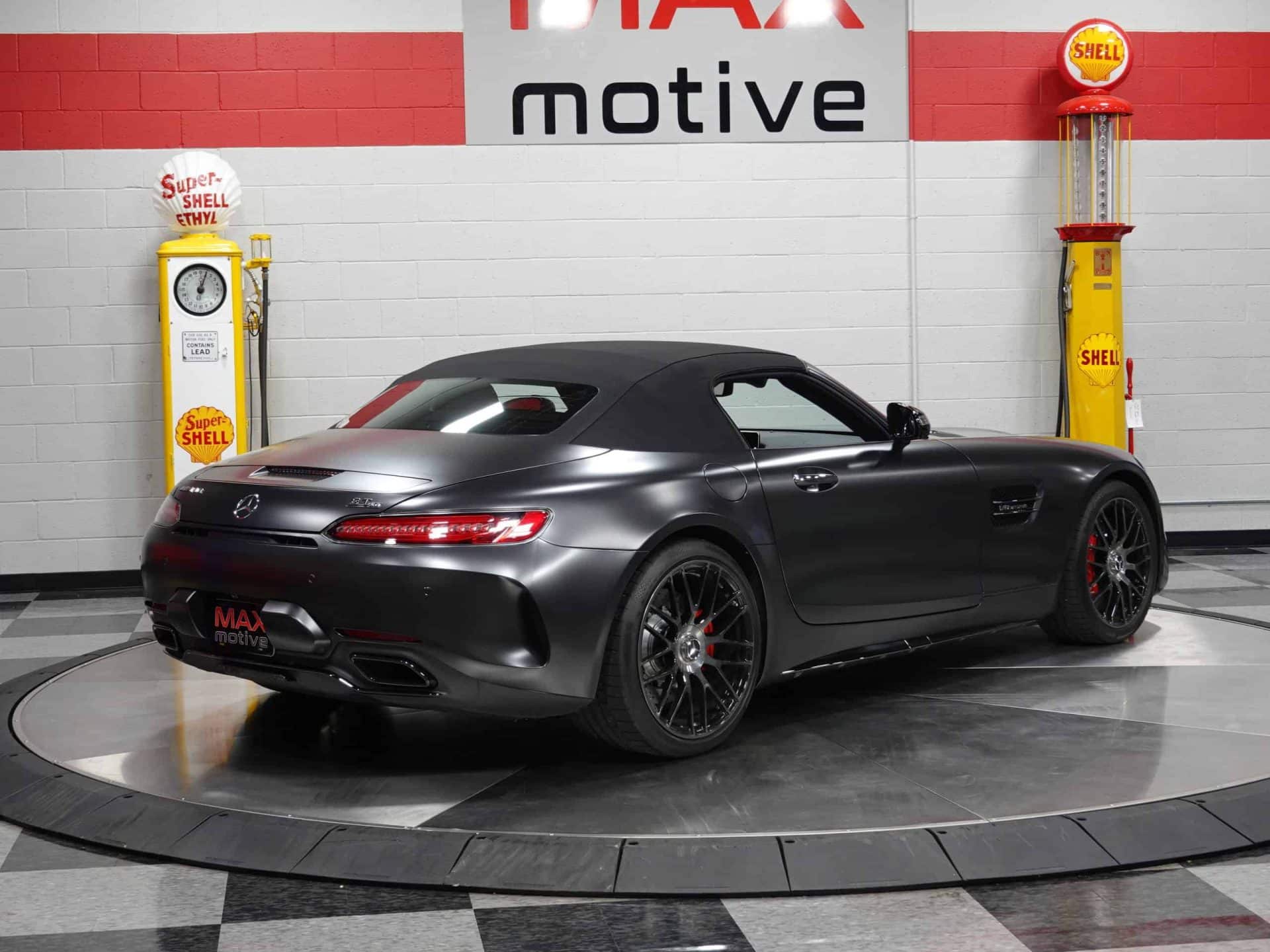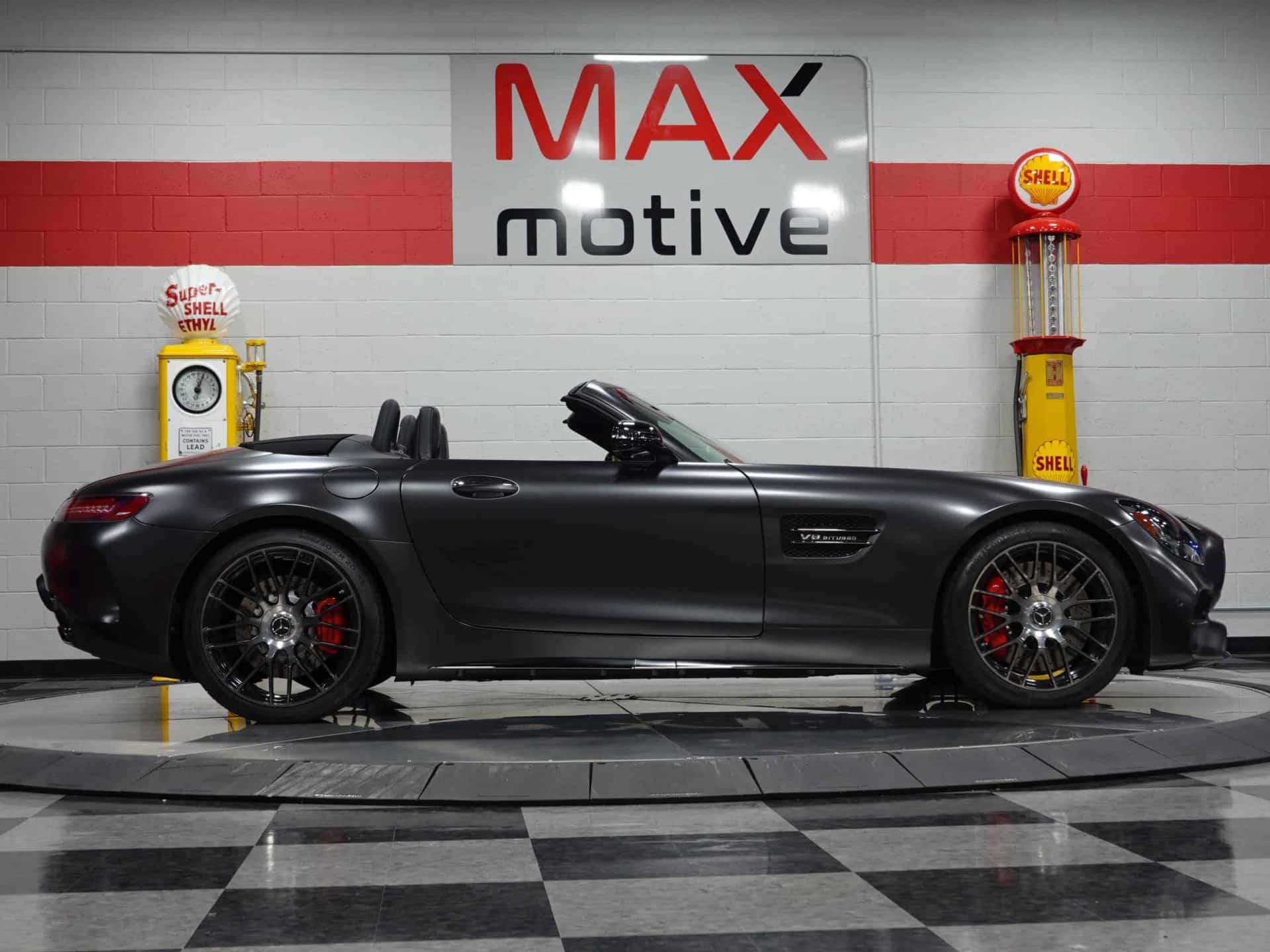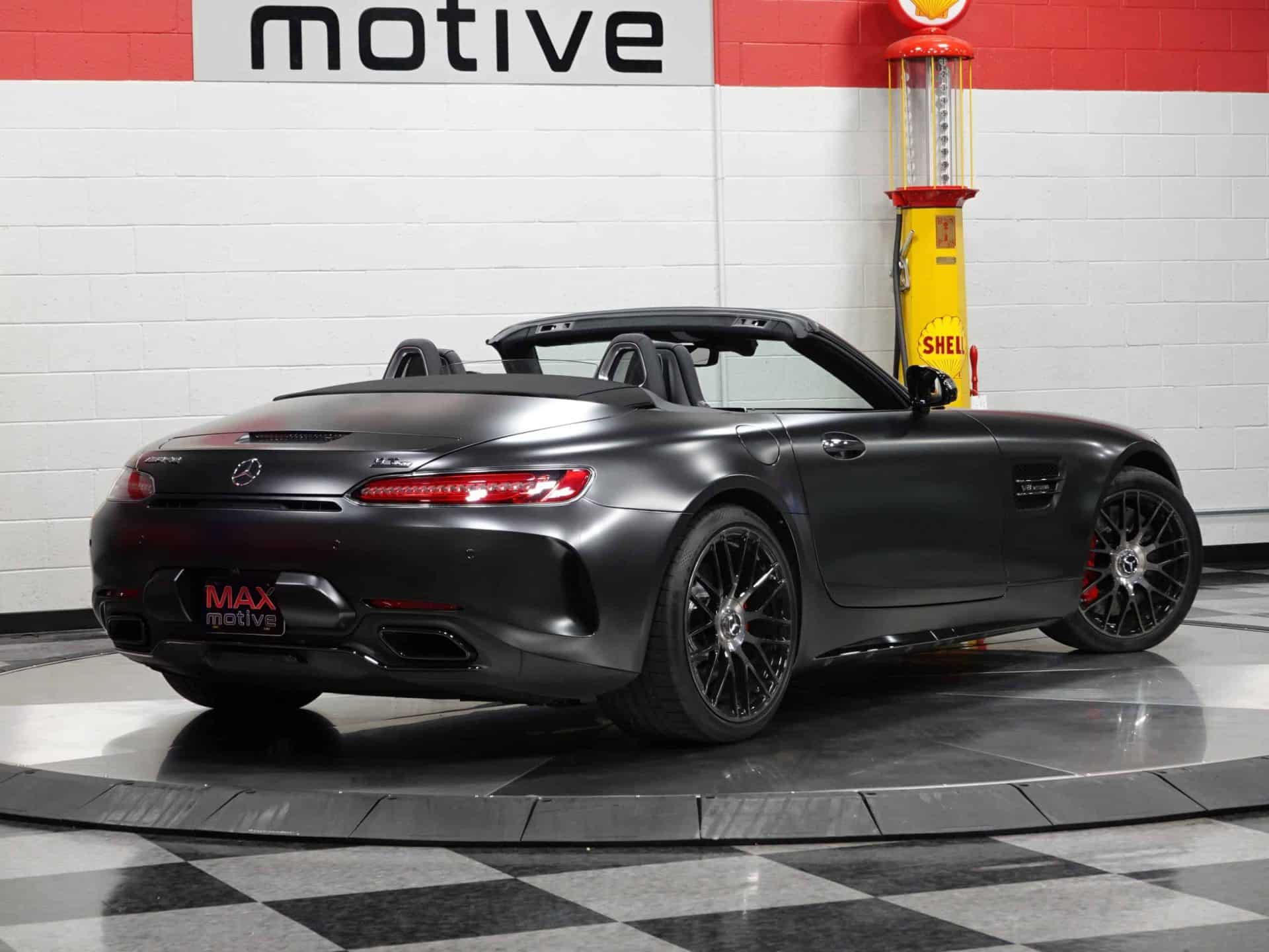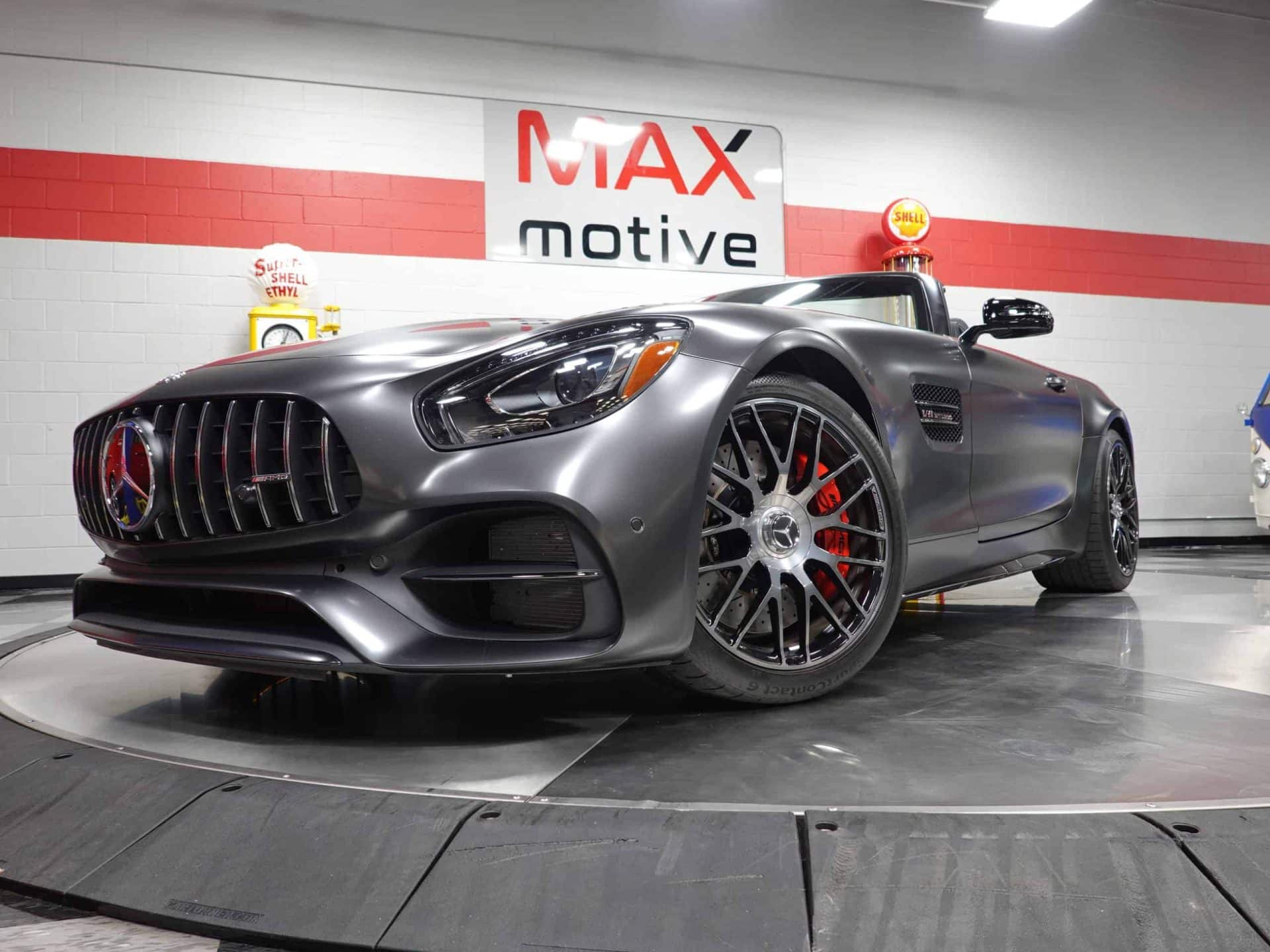 A sight to behold, here is an ultra-exclusive (One of only 50) 2018 Mercedes Benz AMG GT C 50th Anniversary. A mint example with only 552 careful miles, this unique ultra high performance and ultra luxurious Benz offers high-end content and world-class technology. With input from Mercedes Benz’ own Formula 1 World Champion Lewis Hamilton, the company’s AMG racing branch developed the AMG GT entirely in-house. Powered by an authoritative 550 horsepower 4.0L Bi-Turbo V8, it is an extremely engaging automobile with five driving modes. They are Individual (which lets you blend characteristics of the others), Comfort, Sport, Sport +, and Race. You can even adjust the sound of the exhaust. Paddle shifters allow you to operate the AMG Speedshift 7-speed Dual Clutch Automatic Transmission manually. The AMG GT C is a world-class sports car in its own right, but to celebrate the 50th Anniversary of AMG, 50 of these special editions were offered. The 50th Anniversary Edition adds the matte Designo Graphite Gray Magno exterior finish; forged gloss black cross-spoke AMG wheels; black chrome front splitter, fender vent fins, and side skirt inserts; plus black chrome rear diffuser trim and black chrome exhaust outlets. The interior gets silver pearl and black Nappa leather diamond-stitched upholstery, AMG black chrome interior trim, an AMG full Dinamica suede-covered steering wheel (and roof liner), and AMG Edition 50 badging. Burmester High End sound fills the cabin, Mercedes’ optional Parktronic system aids with parking, and the Distronic option is an autonomous cruise-control system. There are many delightful features not found on many cars. The top of the steering wheel is marked just like a Formula 1 car and it’s connected to an electrohydraulic steering rack. The engine and transaxle mounts are electronically controlled to provide an optimum blend of comfort and precision. And there’s a “Handcrafted” badge on the engine cover with the personal signature of the AMG technician who assembled the engine.