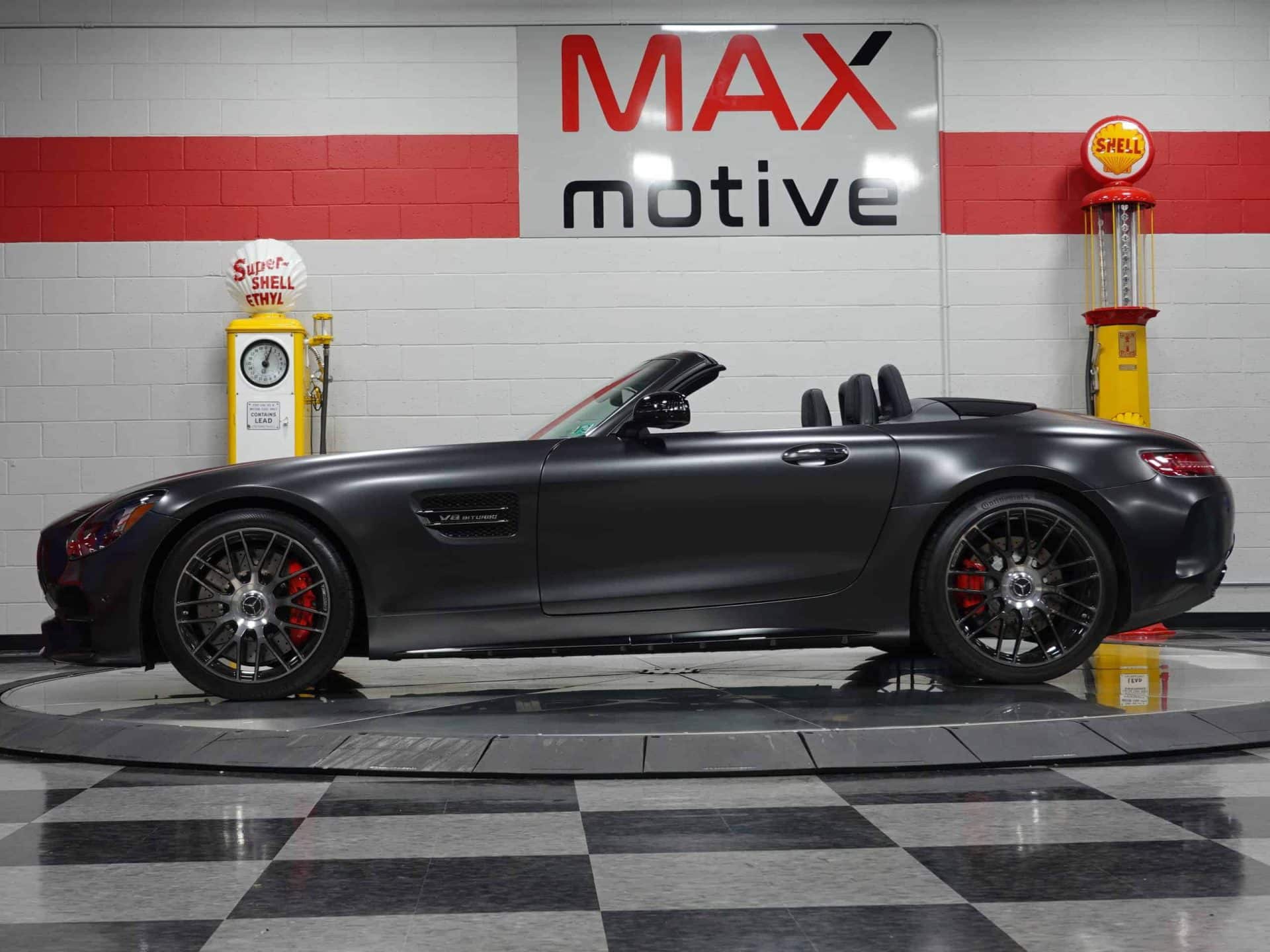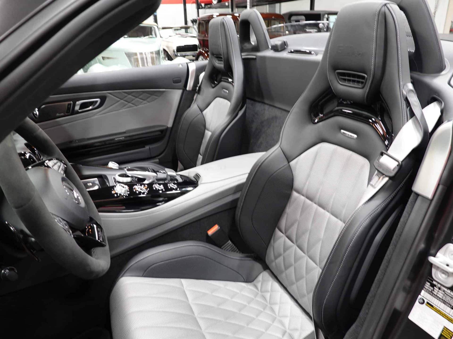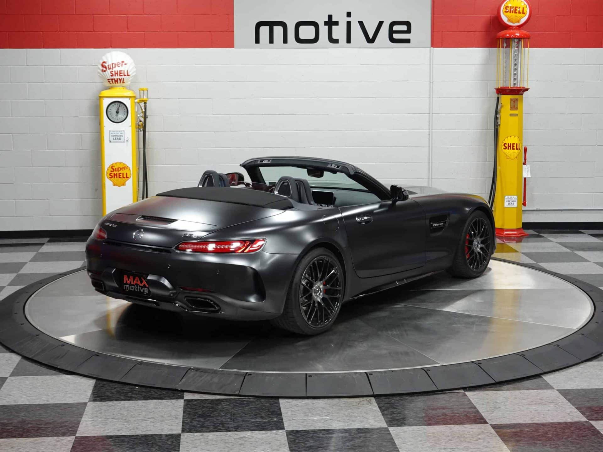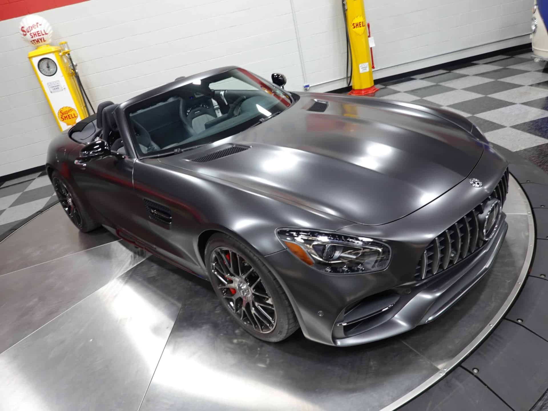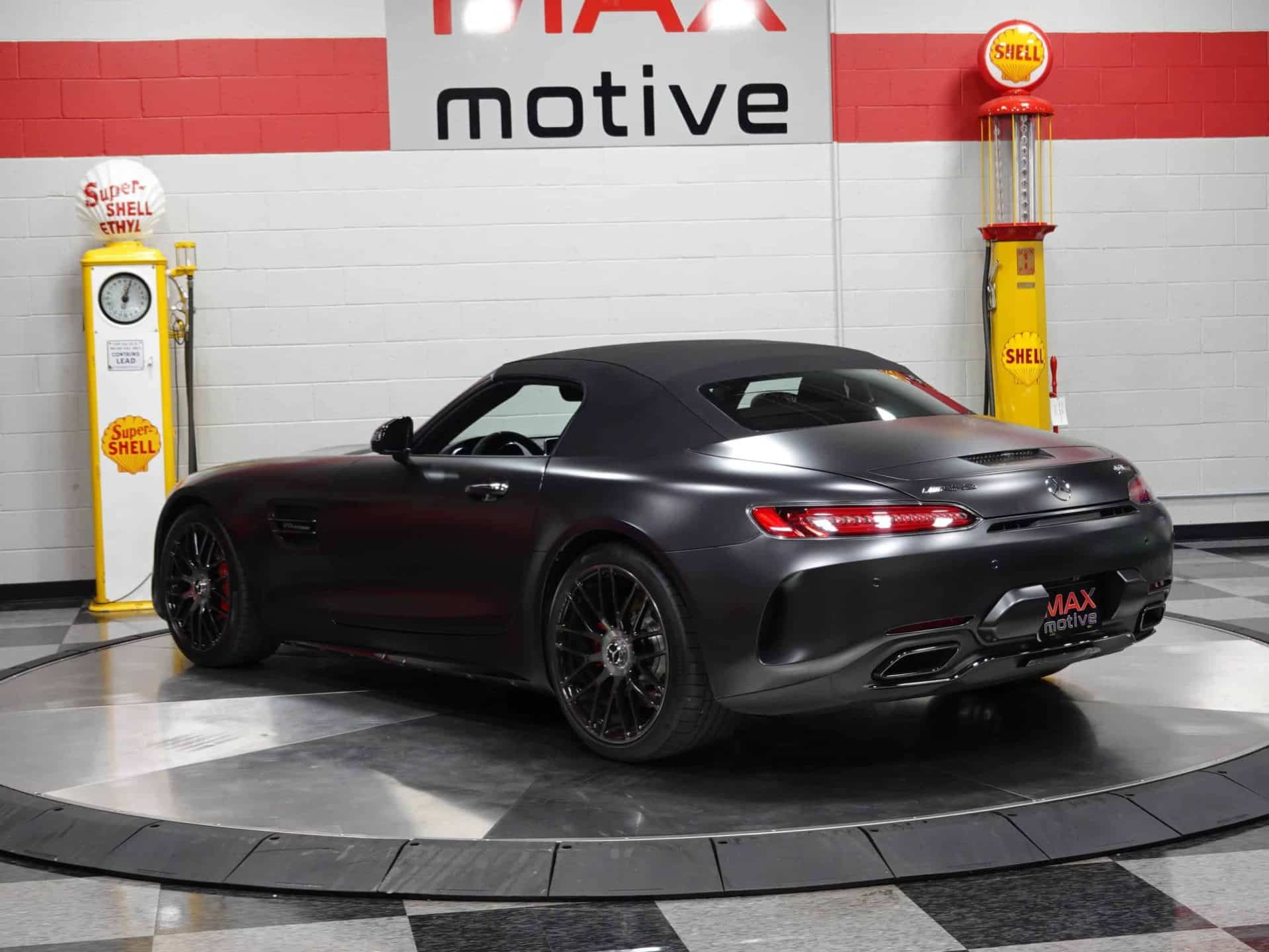 A sight to behold, here is an ultra-exclusive (One of only 50) 2018 Mercedes Benz AMG GT C 50th Anniversary. A mint example with only 552 careful miles, this unique ultra high performance and ultra luxurious Benz offers high-end content and world-class technology. With input from Mercedes Benz’ own Formula 1 World Champion Lewis Hamilton, the company’s AMG racing branch developed the AMG GT entirely in-house. Powered by an authoritative 550 horsepower 4.0L Bi-Turbo V8, it is an extremely engaging automobile with five driving modes. They are Individual (which lets you blend characteristics of the others), Comfort, Sport, Sport +, and Race. You can even adjust the sound of the exhaust. Paddle shifters allow you to operate the AMG Speedshift 7-speed Dual Clutch Automatic Transmission manually. The AMG GT C is a world-class sports car in its own right, but to celebrate the 50th Anniversary of AMG, 50 of these special editions were offered. The 50th Anniversary Edition adds the matte Designo Graphite Gray Magno exterior finish; forged gloss black cross-spoke AMG wheels; black chrome front splitter, fender vent fins, and side skirt inserts; plus black chrome rear diffuser trim and black chrome exhaust outlets. The interior gets silver pearl and black Nappa leather diamond-stitched upholstery, AMG black chrome interior trim, an AMG full Dinamica suede-covered steering wheel (and roof liner), and AMG Edition 50 badging. Burmester High End sound fills the cabin, Mercedes’ optional Parktronic system aids with parking, and the Distronic option is an autonomous cruise-control system. There are many delightful features not found on many cars. The top of the steering wheel is marked just like a Formula 1 car and it’s connected to an electrohydraulic steering rack. The engine and transaxle mounts are electronically controlled to provide an optimum blend of comfort and precision. And there’s a “Handcrafted” badge on the engine cover with the personal signature of the AMG technician who assembled the engine.