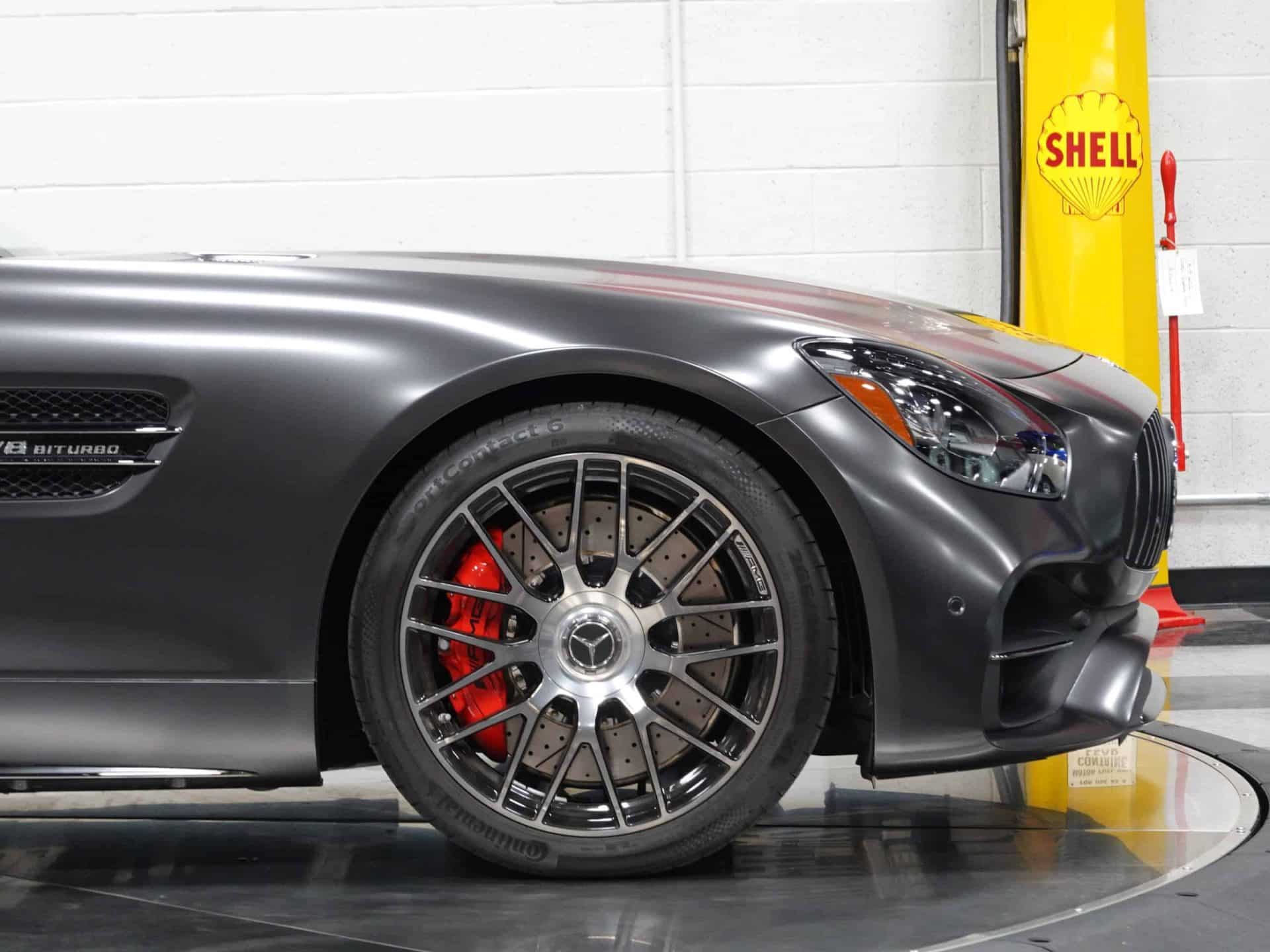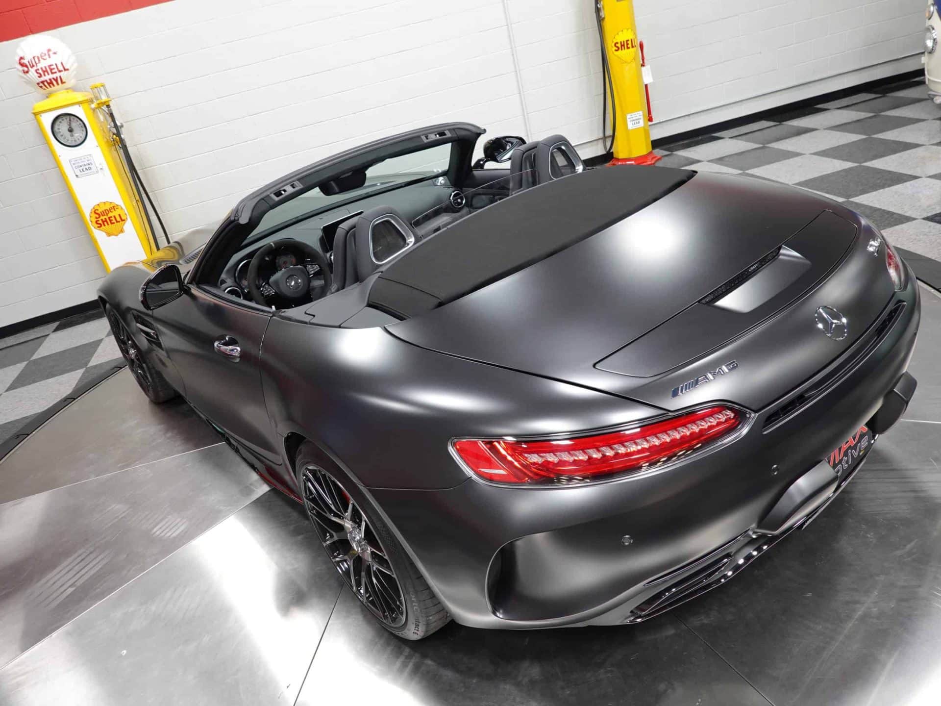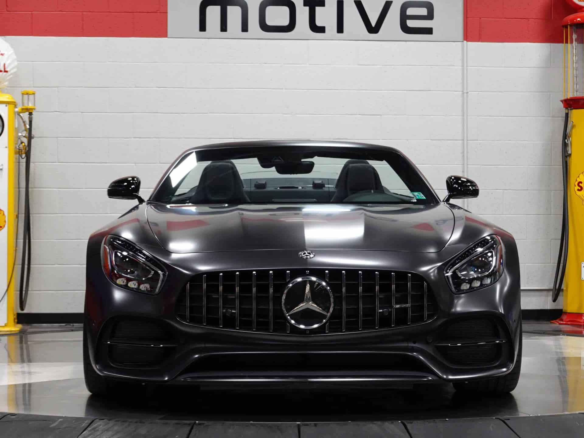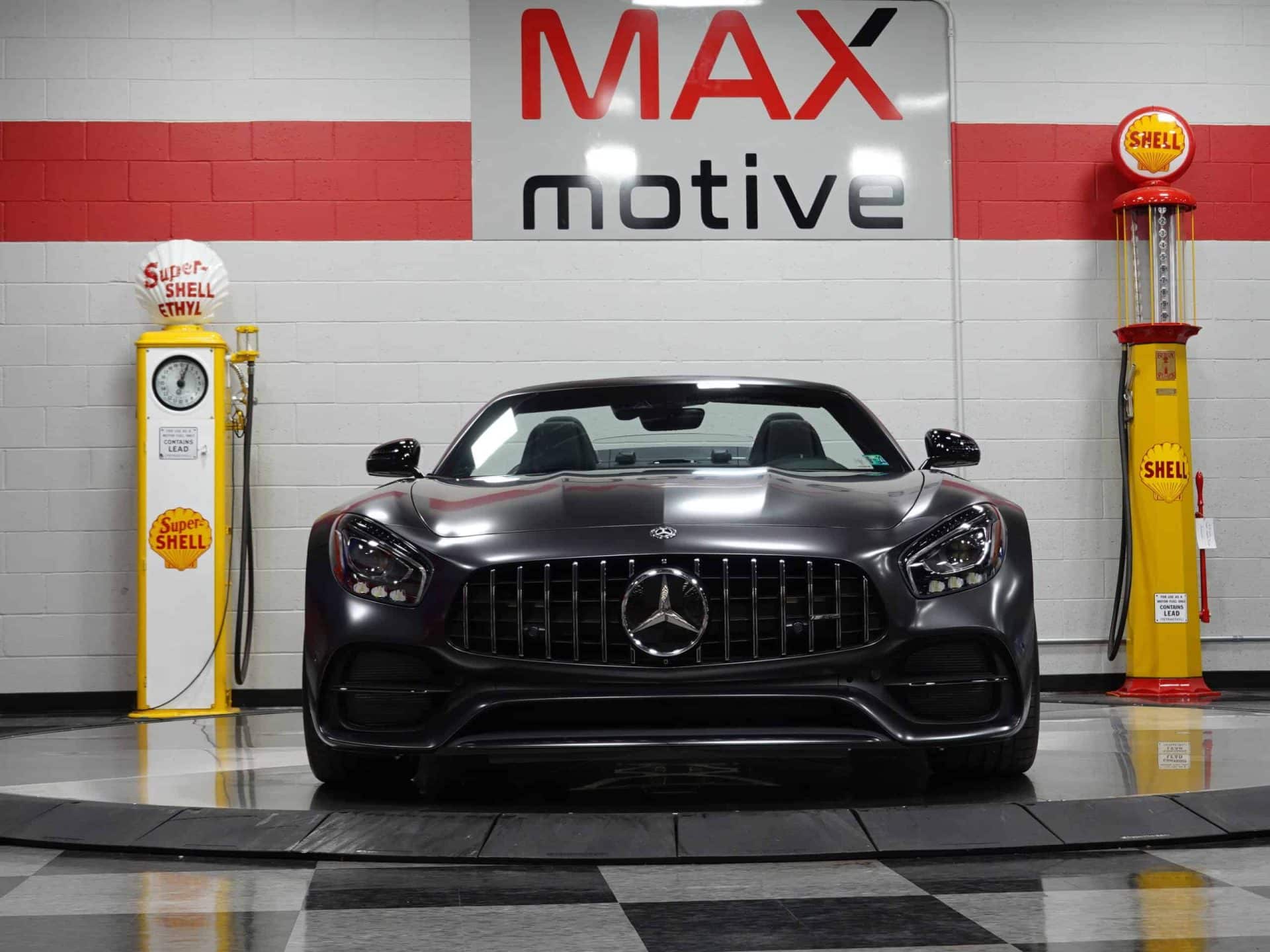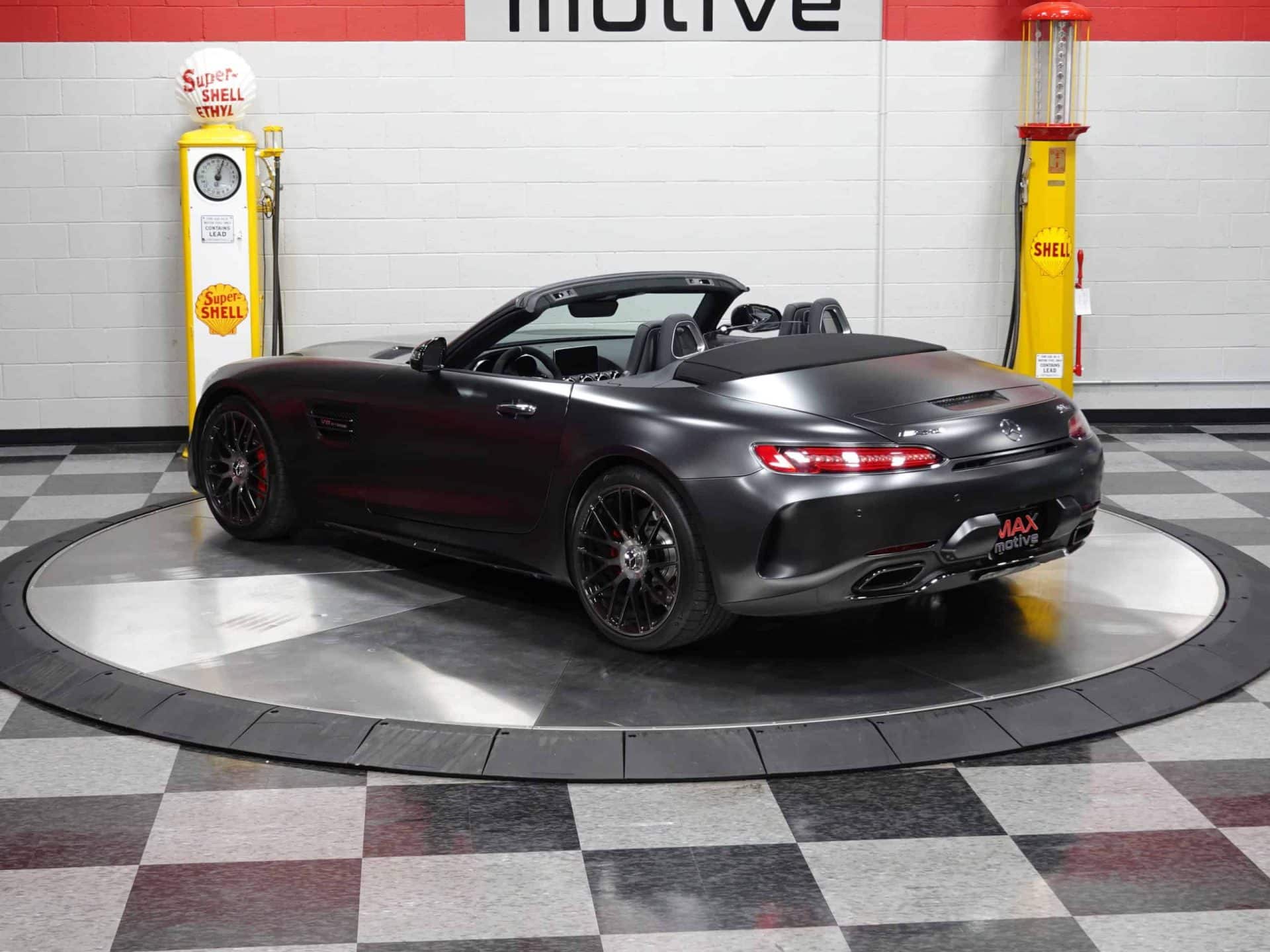 A sight to behold, here is an ultra-exclusive (One of only 50) 2018 Mercedes Benz AMG GT C 50th Anniversary. A mint example with only 552 careful miles, this unique ultra high performance and ultra luxurious Benz offers high-end content and world-class technology. With input from Mercedes Benz’ own Formula 1 World Champion Lewis Hamilton, the company’s AMG racing branch developed the AMG GT entirely in-house. Powered by an authoritative 550 horsepower 4.0L Bi-Turbo V8, it is an extremely engaging automobile with five driving modes. They are Individual (which lets you blend characteristics of the others), Comfort, Sport, Sport +, and Race. You can even adjust the sound of the exhaust. Paddle shifters allow you to operate the AMG Speedshift 7-speed Dual Clutch Automatic Transmission manually. The AMG GT C is a world-class sports car in its own right, but to celebrate the 50th Anniversary of AMG, 50 of these special editions were offered. The 50th Anniversary Edition adds the matte Designo Graphite Gray Magno exterior finish; forged gloss black cross-spoke AMG wheels; black chrome front splitter, fender vent fins, and side skirt inserts; plus black chrome rear diffuser trim and black chrome exhaust outlets. The interior gets silver pearl and black Nappa leather diamond-stitched upholstery, AMG black chrome interior trim, an AMG full Dinamica suede-covered steering wheel (and roof liner), and AMG Edition 50 badging. Burmester High End sound fills the cabin, Mercedes’ optional Parktronic system aids with parking, and the Distronic option is an autonomous cruise-control system. There are many delightful features not found on many cars. The top of the steering wheel is marked just like a Formula 1 car and it’s connected to an electrohydraulic steering rack. The engine and transaxle mounts are electronically controlled to provide an optimum blend of comfort and precision. And there’s a “Handcrafted” badge on the engine cover with the personal signature of the AMG technician who assembled the engine.