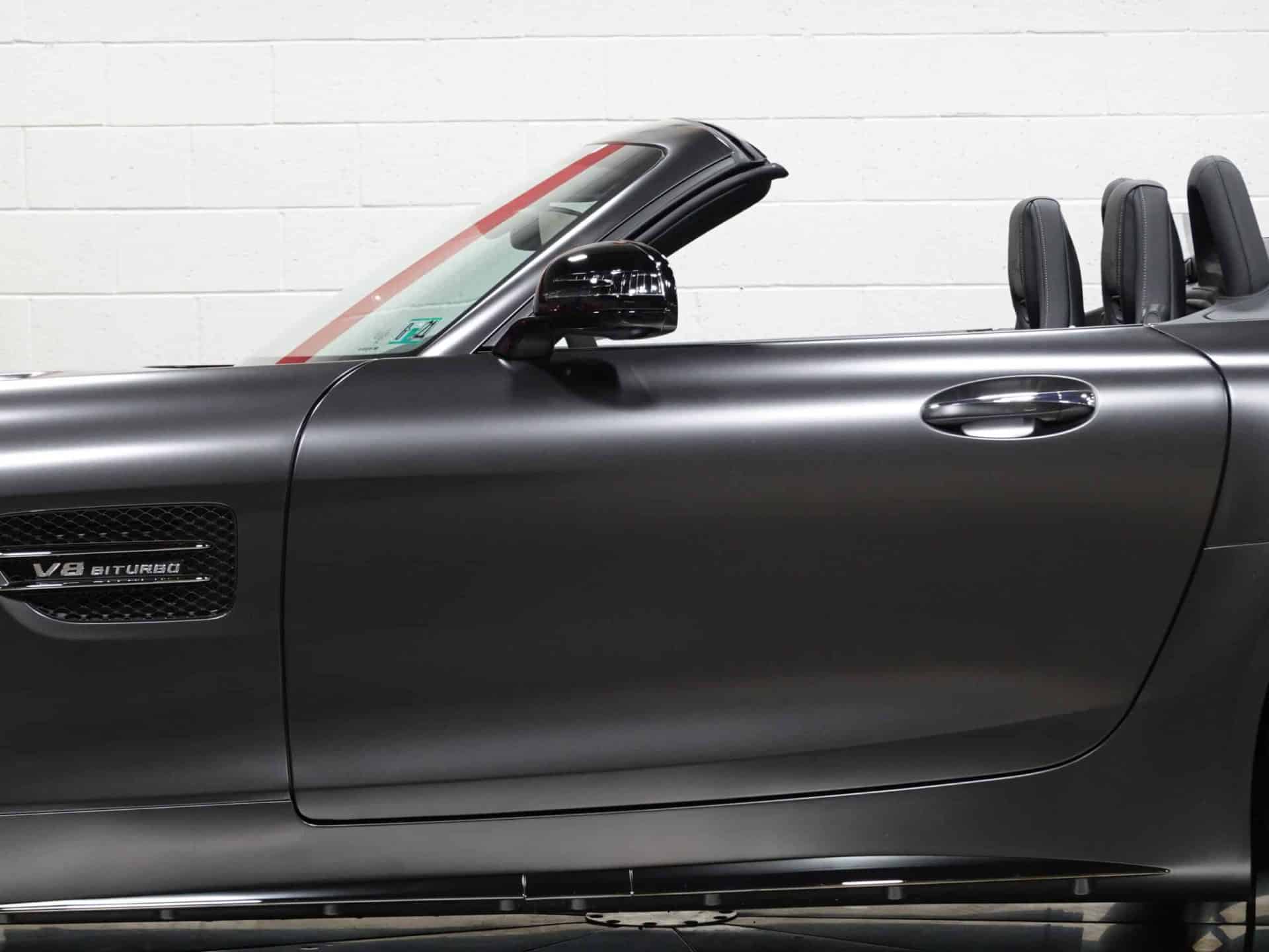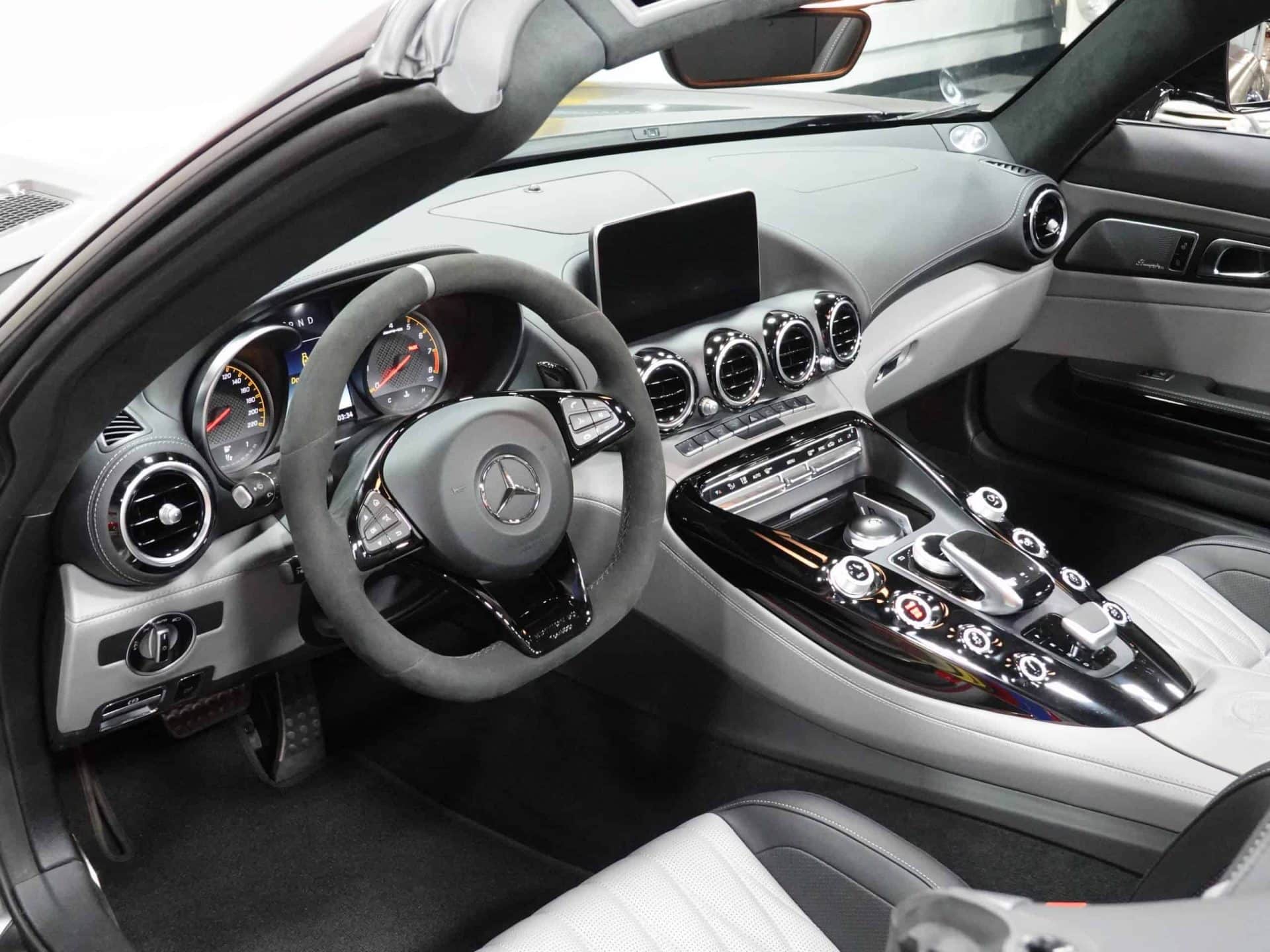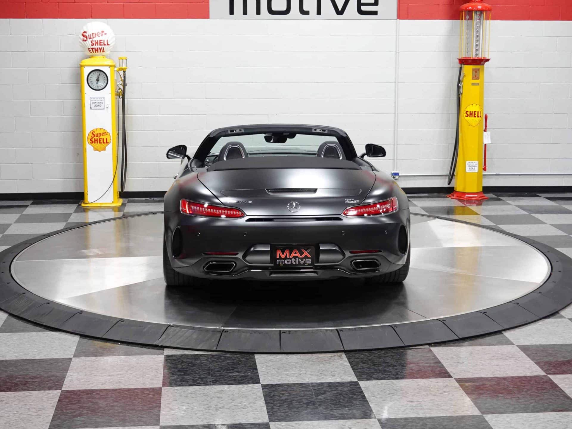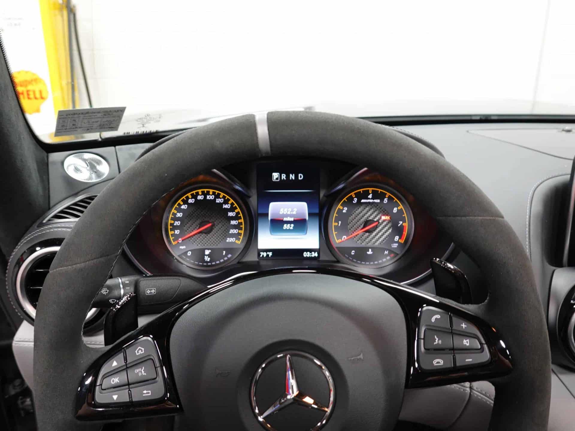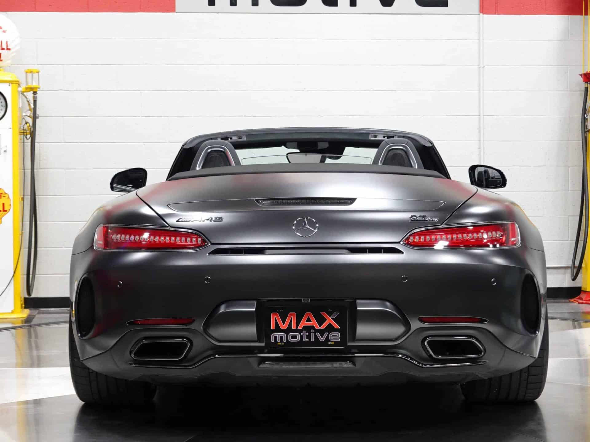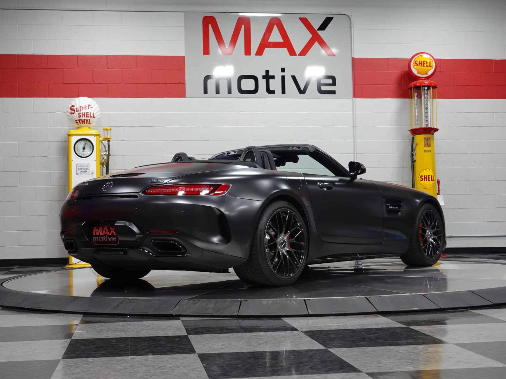 A sight to behold, here is an ultra-exclusive (One of only 50) 2018 Mercedes Benz AMG GT C 50th Anniversary. A mint example with only 552 careful miles, this unique ultra high performance and ultra luxurious Benz offers high-end content and world-class technology. With input from Mercedes Benz’ own Formula 1 World Champion Lewis Hamilton, the company’s AMG racing branch developed the AMG GT entirely in-house. Powered by an authoritative 550 horsepower 4.0L Bi-Turbo V8, it is an extremely engaging automobile with five driving modes. They are Individual (which lets you blend characteristics of the others), Comfort, Sport, Sport +, and Race. You can even adjust the sound of the exhaust. Paddle shifters allow you to operate the AMG Speedshift 7-speed Dual Clutch Automatic Transmission manually. The AMG GT C is a world-class sports car in its own right, but to celebrate the 50th Anniversary of AMG, 50 of these special editions were offered. The 50th Anniversary Edition adds the matte Designo Graphite Gray Magno exterior finish; forged gloss black cross-spoke AMG wheels; black chrome front splitter, fender vent fins, and side skirt inserts; plus black chrome rear diffuser trim and black chrome exhaust outlets. The interior gets silver pearl and black Nappa leather diamond-stitched upholstery, AMG black chrome interior trim, an AMG full Dinamica suede-covered steering wheel (and roof liner), and AMG Edition 50 badging. Burmester High End sound fills the cabin, Mercedes’ optional Parktronic system aids with parking, and the Distronic option is an autonomous cruise-control system. There are many delightful features not found on many cars. The top of the steering wheel is marked just like a Formula 1 car and it’s connected to an electrohydraulic steering rack. The engine and transaxle mounts are electronically controlled to provide an optimum blend of comfort and precision. And there’s a “Handcrafted” badge on the engine cover with the personal signature of the AMG technician who assembled the engine.