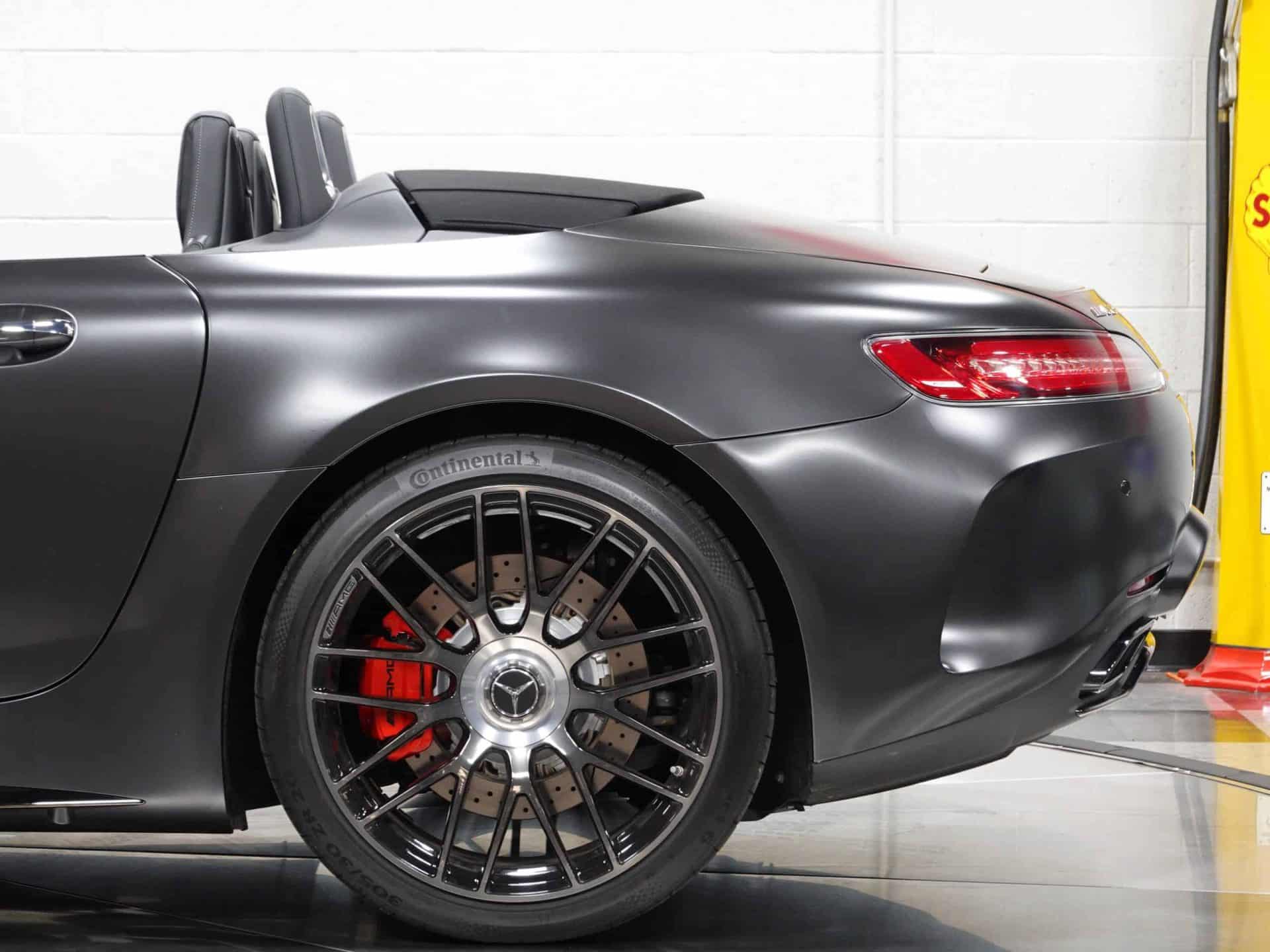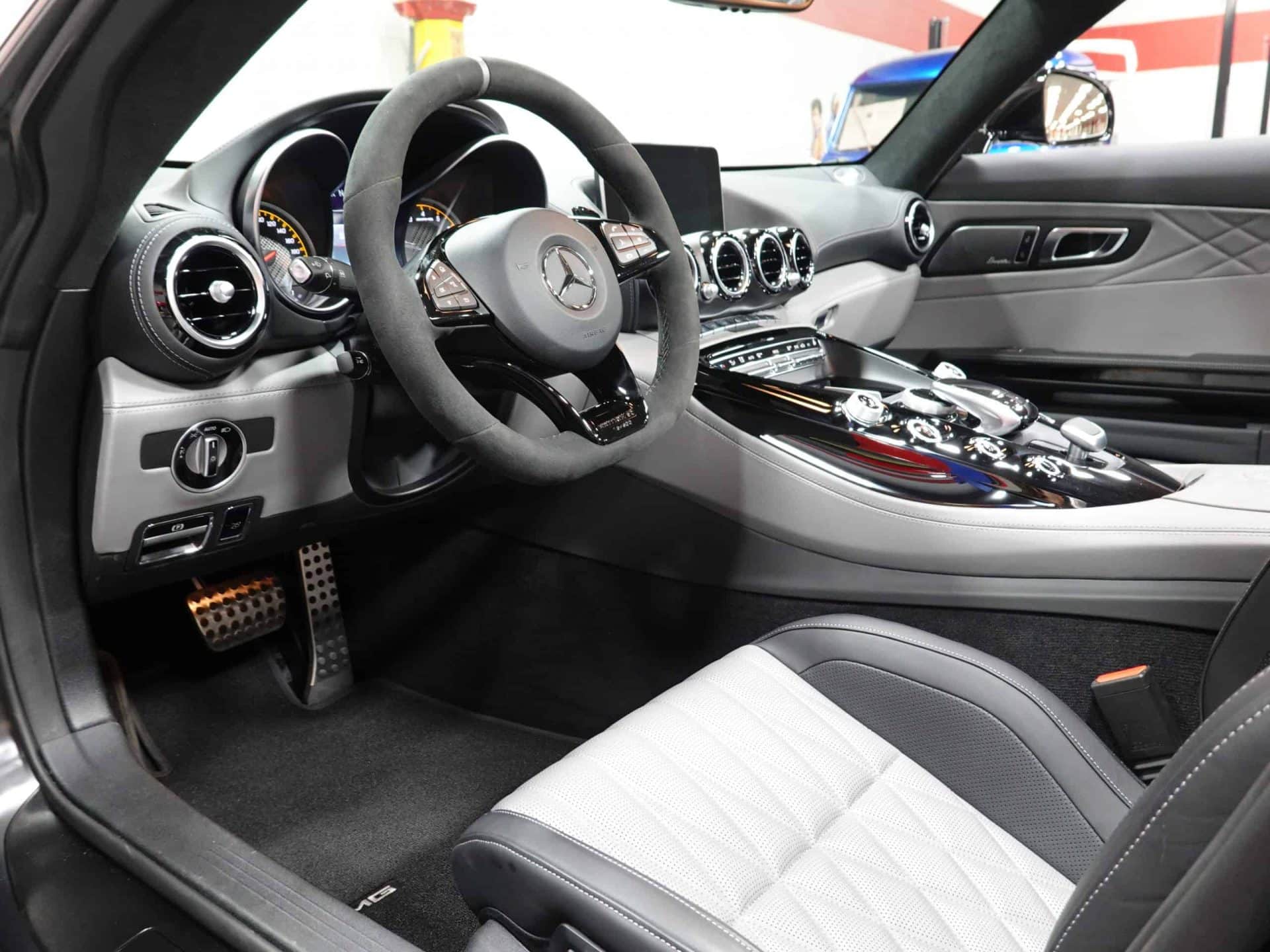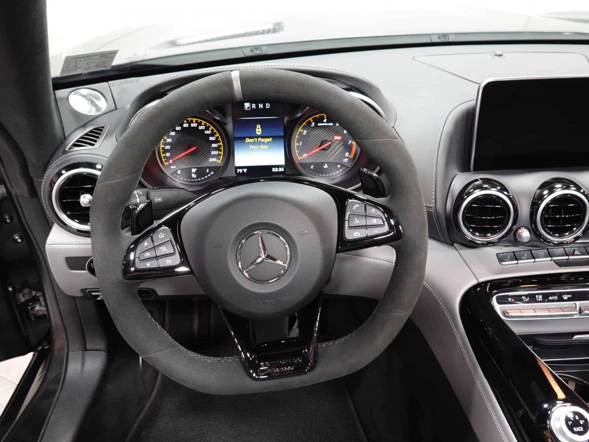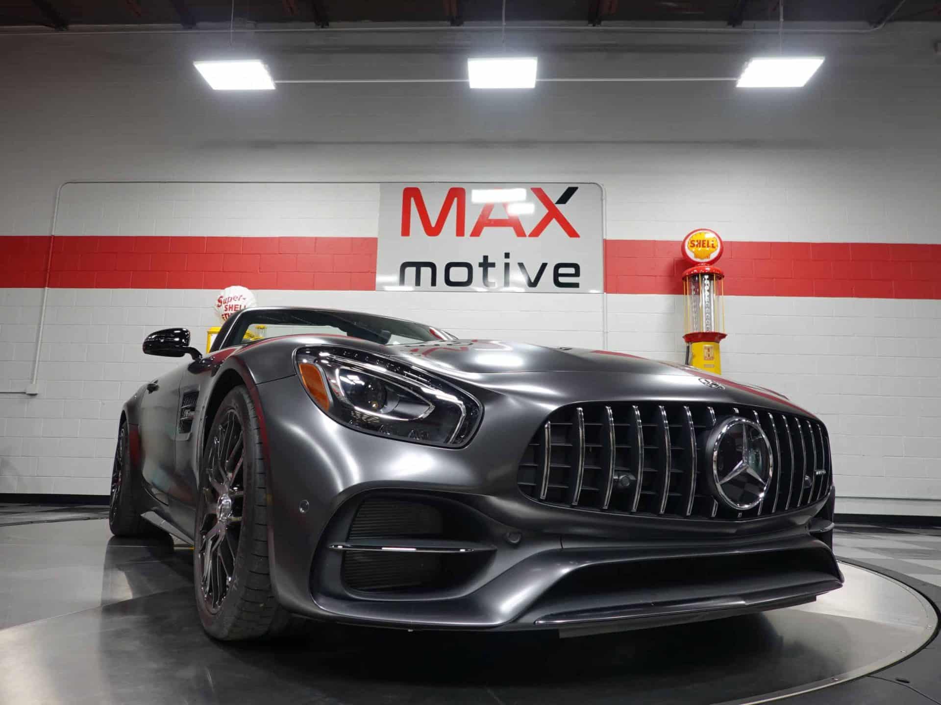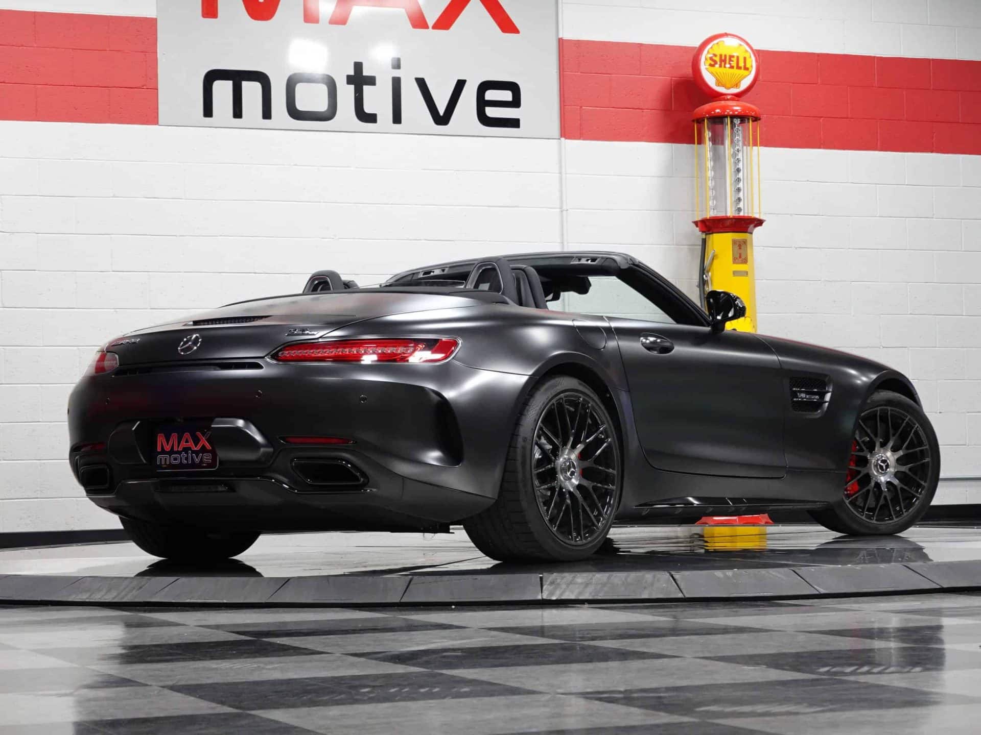 A sight to behold, here is an ultra-exclusive (One of only 50) 2018 Mercedes Benz AMG GT C 50th Anniversary. A mint example with only 552 careful miles, this unique ultra high performance and ultra luxurious Benz offers high-end content and world-class technology. With input from Mercedes Benz’ own Formula 1 World Champion Lewis Hamilton, the company’s AMG racing branch developed the AMG GT entirely in-house. Powered by an authoritative 550 horsepower 4.0L Bi-Turbo V8, it is an extremely engaging automobile with five driving modes. They are Individual (which lets you blend characteristics of the others), Comfort, Sport, Sport +, and Race. You can even adjust the sound of the exhaust. Paddle shifters allow you to operate the AMG Speedshift 7-speed Dual Clutch Automatic Transmission manually. The AMG GT C is a world-class sports car in its own right, but to celebrate the 50th Anniversary of AMG, 50 of these special editions were offered. The 50th Anniversary Edition adds the matte Designo Graphite Gray Magno exterior finish; forged gloss black cross-spoke AMG wheels; black chrome front splitter, fender vent fins, and side skirt inserts; plus black chrome rear diffuser trim and black chrome exhaust outlets. The interior gets silver pearl and black Nappa leather diamond-stitched upholstery, AMG black chrome interior trim, an AMG full Dinamica suede-covered steering wheel (and roof liner), and AMG Edition 50 badging. Burmester High End sound fills the cabin, Mercedes’ optional Parktronic system aids with parking, and the Distronic option is an autonomous cruise-control system. There are many delightful features not found on many cars. The top of the steering wheel is marked just like a Formula 1 car and it’s connected to an electrohydraulic steering rack. The engine and transaxle mounts are electronically controlled to provide an optimum blend of comfort and precision. And there’s a “Handcrafted” badge on the engine cover with the personal signature of the AMG technician who assembled the engine.