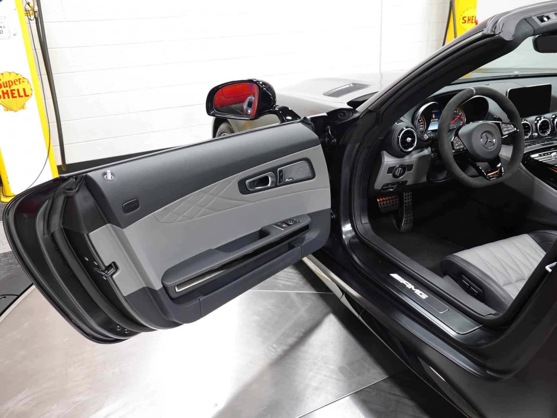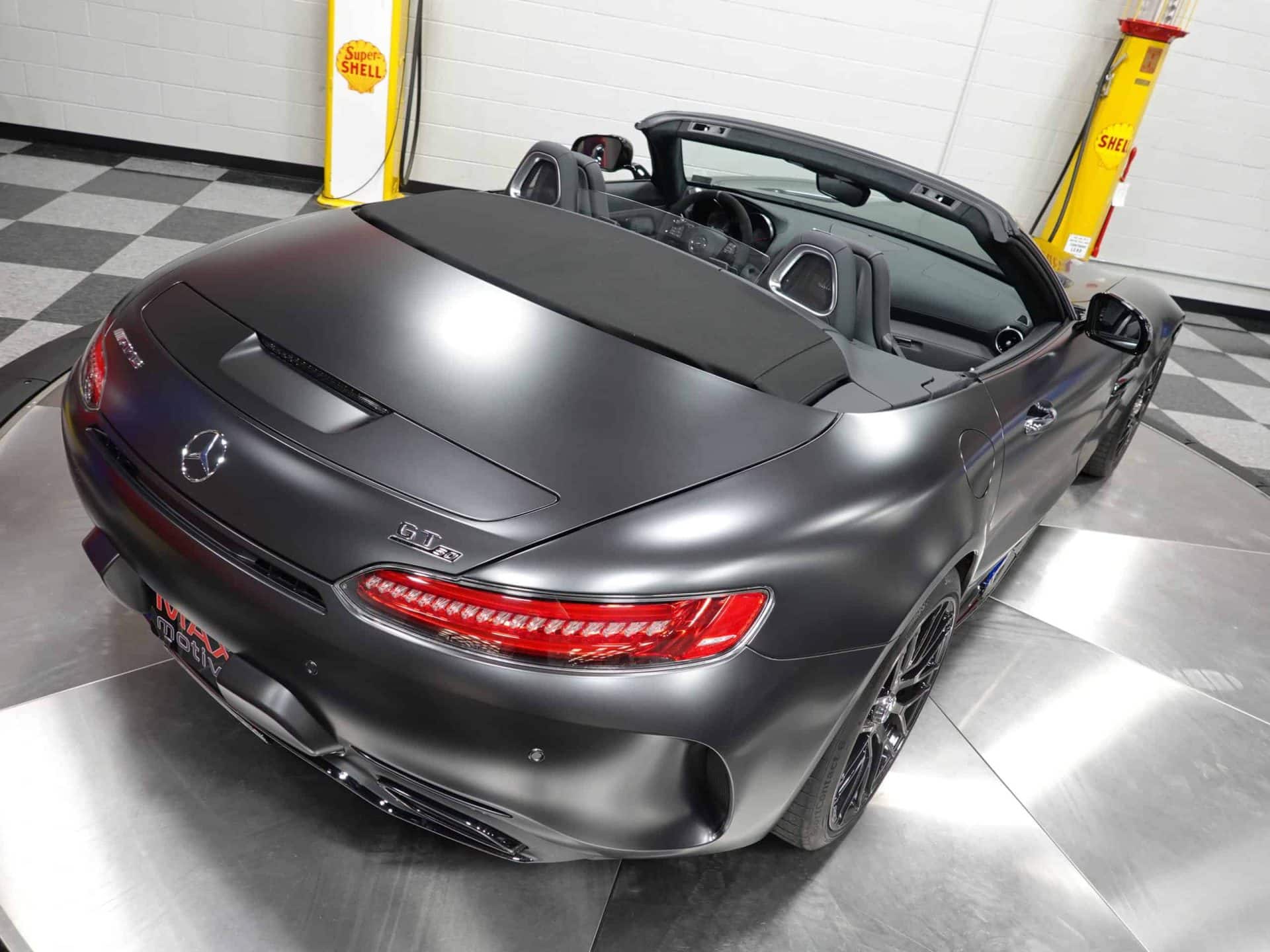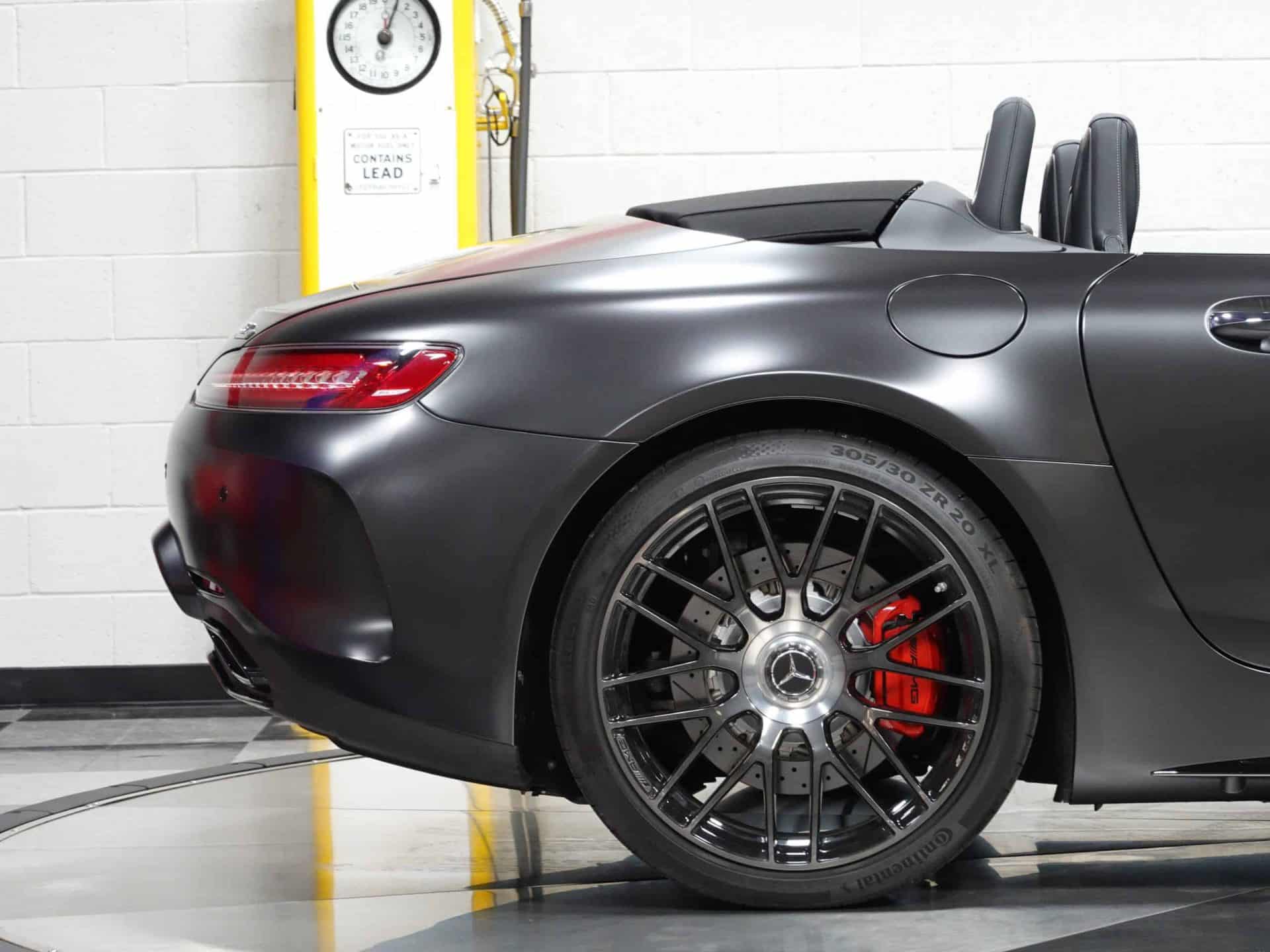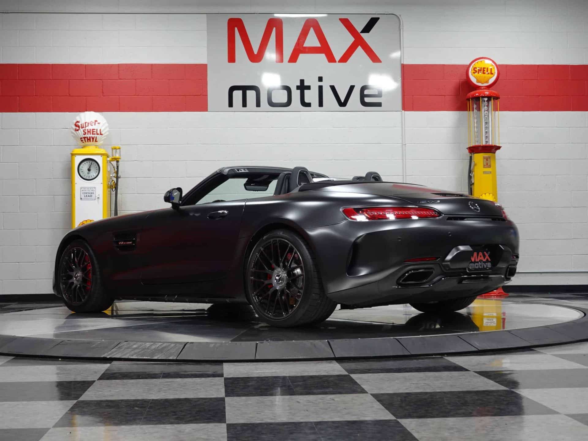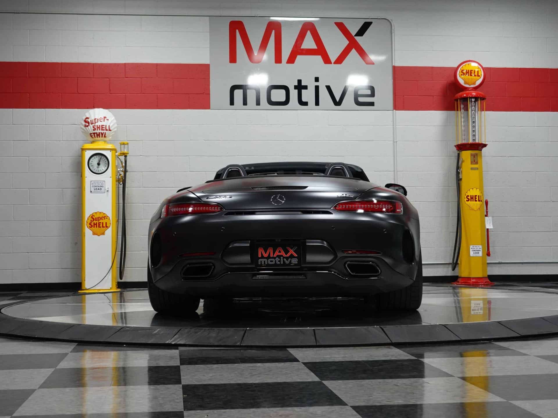 A sight to behold, here is an ultra-exclusive (One of only 50) 2018 Mercedes Benz AMG GT C 50th Anniversary. A mint example with only 552 careful miles, this unique ultra high performance and ultra luxurious Benz offers high-end content and world-class technology. With input from Mercedes Benz’ own Formula 1 World Champion Lewis Hamilton, the company’s AMG racing branch developed the AMG GT entirely in-house. Powered by an authoritative 550 horsepower 4.0L Bi-Turbo V8, it is an extremely engaging automobile with five driving modes. They are Individual (which lets you blend characteristics of the others), Comfort, Sport, Sport +, and Race. You can even adjust the sound of the exhaust. Paddle shifters allow you to operate the AMG Speedshift 7-speed Dual Clutch Automatic Transmission manually. The AMG GT C is a world-class sports car in its own right, but to celebrate the 50th Anniversary of AMG, 50 of these special editions were offered. The 50th Anniversary Edition adds the matte Designo Graphite Gray Magno exterior finish; forged gloss black cross-spoke AMG wheels; black chrome front splitter, fender vent fins, and side skirt inserts; plus black chrome rear diffuser trim and black chrome exhaust outlets. The interior gets silver pearl and black Nappa leather diamond-stitched upholstery, AMG black chrome interior trim, an AMG full Dinamica suede-covered steering wheel (and roof liner), and AMG Edition 50 badging. Burmester High End sound fills the cabin, Mercedes’ optional Parktronic system aids with parking, and the Distronic option is an autonomous cruise-control system. There are many delightful features not found on many cars. The top of the steering wheel is marked just like a Formula 1 car and it’s connected to an electrohydraulic steering rack. The engine and transaxle mounts are electronically controlled to provide an optimum blend of comfort and precision. And there’s a “Handcrafted” badge on the engine cover with the personal signature of the AMG technician who assembled the engine.