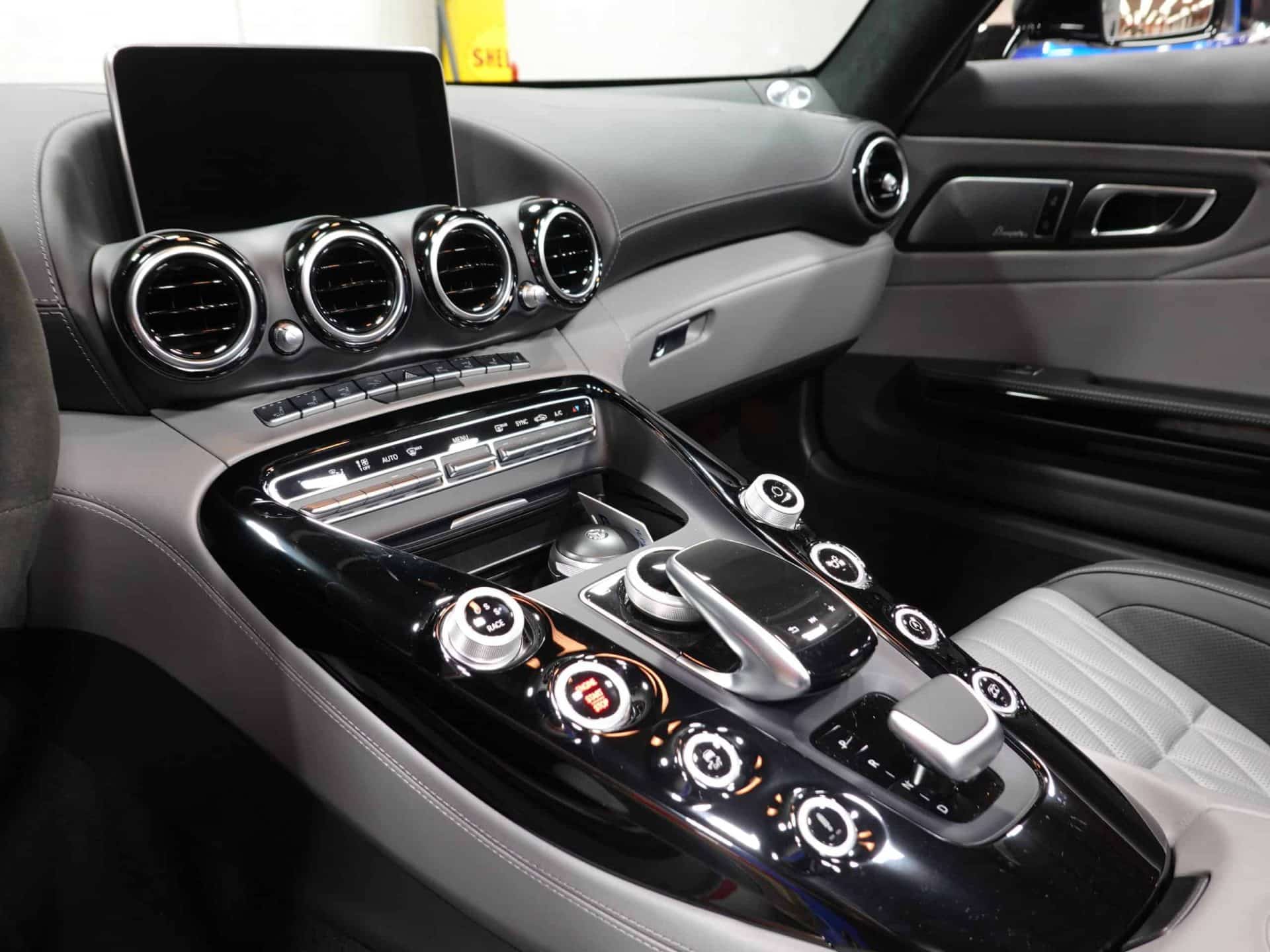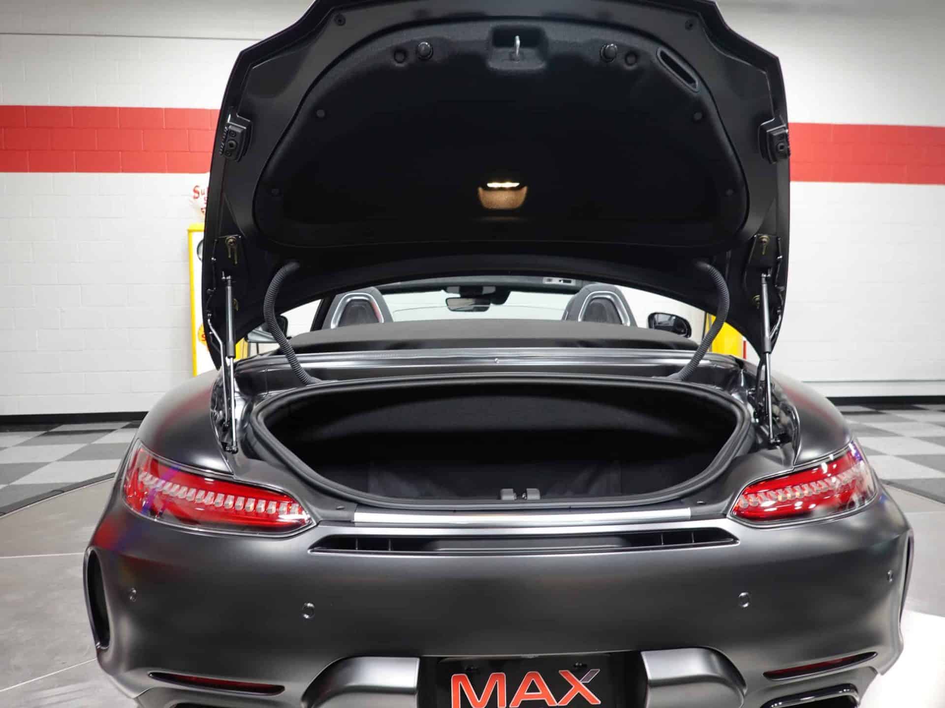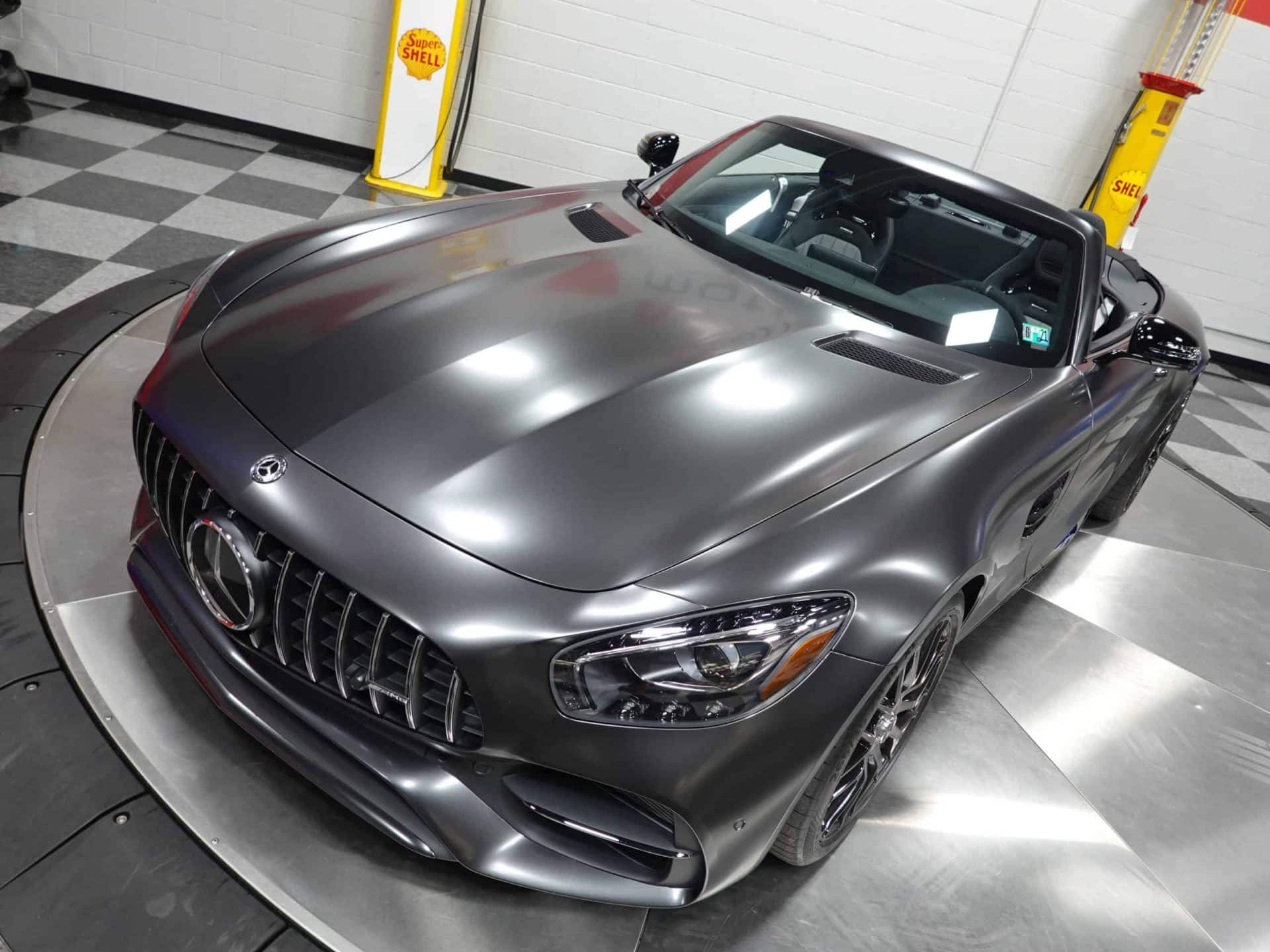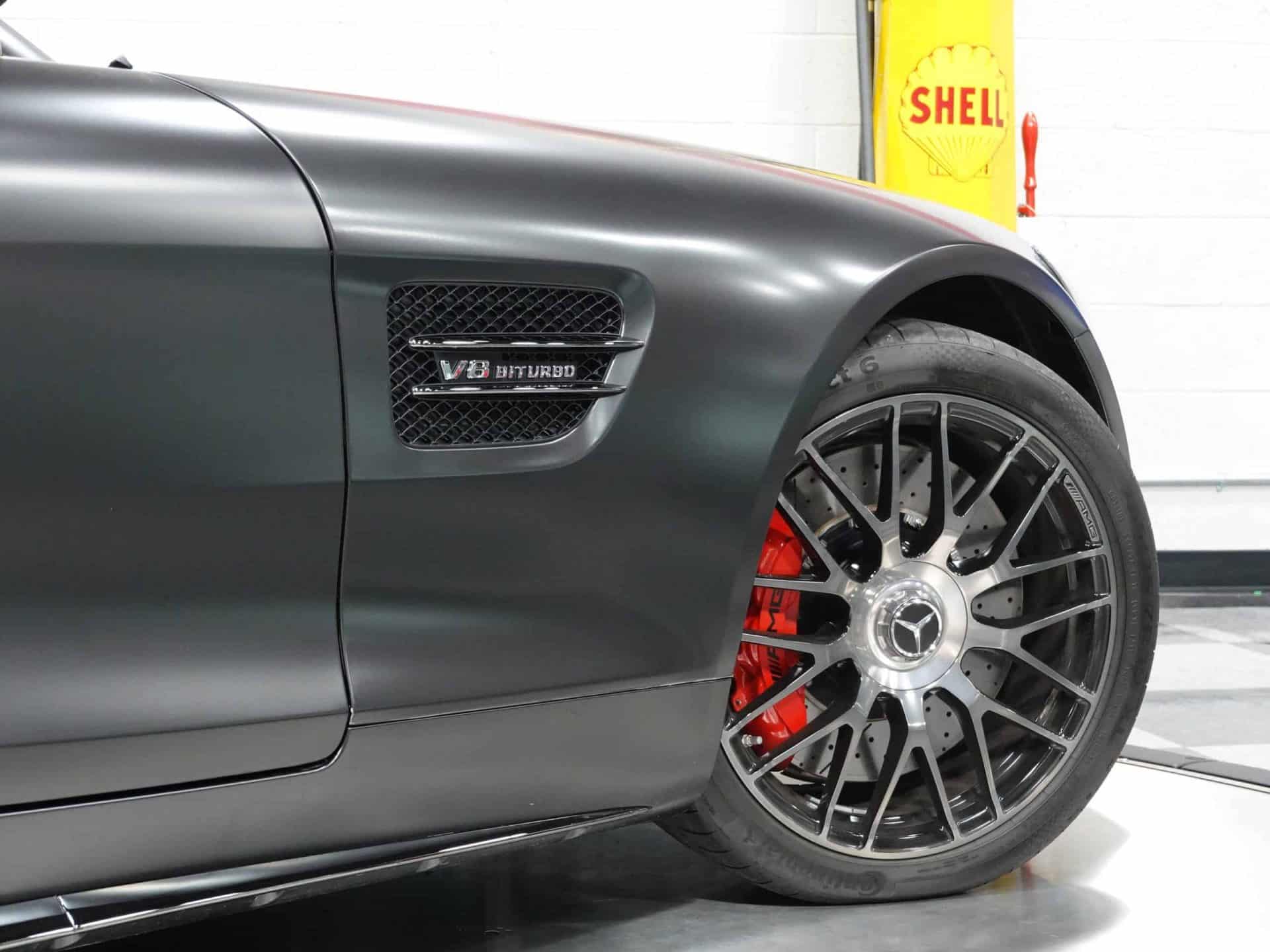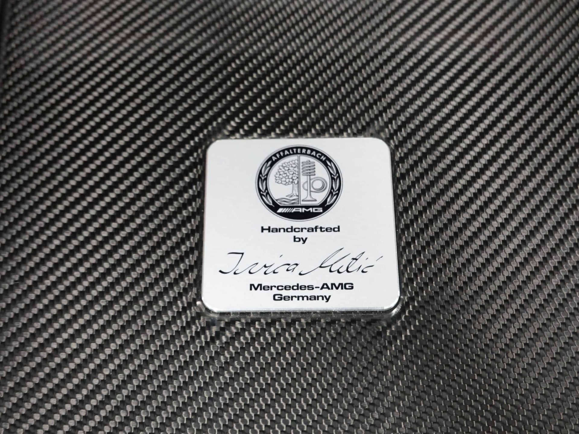 A sight to behold, here is an ultra-exclusive (One of only 50) 2018 Mercedes Benz AMG GT C 50th Anniversary. A mint example with only 552 careful miles, this unique ultra high performance and ultra luxurious Benz offers high-end content and world-class technology. With input from Mercedes Benz’ own Formula 1 World Champion Lewis Hamilton, the company’s AMG racing branch developed the AMG GT entirely in-house. Powered by an authoritative 550 horsepower 4.0L Bi-Turbo V8, it is an extremely engaging automobile with five driving modes. They are Individual (which lets you blend characteristics of the others), Comfort, Sport, Sport +, and Race. You can even adjust the sound of the exhaust. Paddle shifters allow you to operate the AMG Speedshift 7-speed Dual Clutch Automatic Transmission manually. The AMG GT C is a world-class sports car in its own right, but to celebrate the 50th Anniversary of AMG, 50 of these special editions were offered. The 50th Anniversary Edition adds the matte Designo Graphite Gray Magno exterior finish; forged gloss black cross-spoke AMG wheels; black chrome front splitter, fender vent fins, and side skirt inserts; plus black chrome rear diffuser trim and black chrome exhaust outlets. The interior gets silver pearl and black Nappa leather diamond-stitched upholstery, AMG black chrome interior trim, an AMG full Dinamica suede-covered steering wheel (and roof liner), and AMG Edition 50 badging. Burmester High End sound fills the cabin, Mercedes’ optional Parktronic system aids with parking, and the Distronic option is an autonomous cruise-control system. There are many delightful features not found on many cars. The top of the steering wheel is marked just like a Formula 1 car and it’s connected to an electrohydraulic steering rack. The engine and transaxle mounts are electronically controlled to provide an optimum blend of comfort and precision. And there’s a “Handcrafted” badge on the engine cover with the personal signature of the AMG technician who assembled the engine.