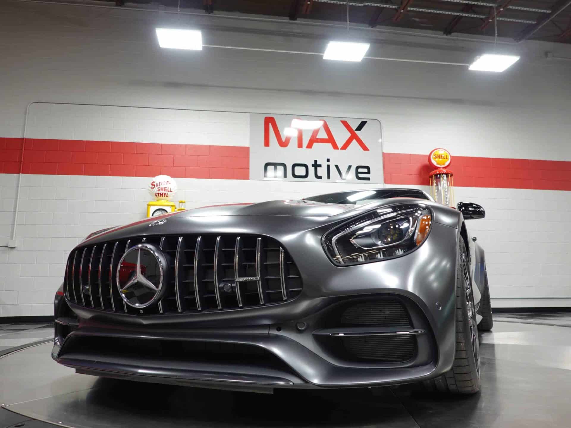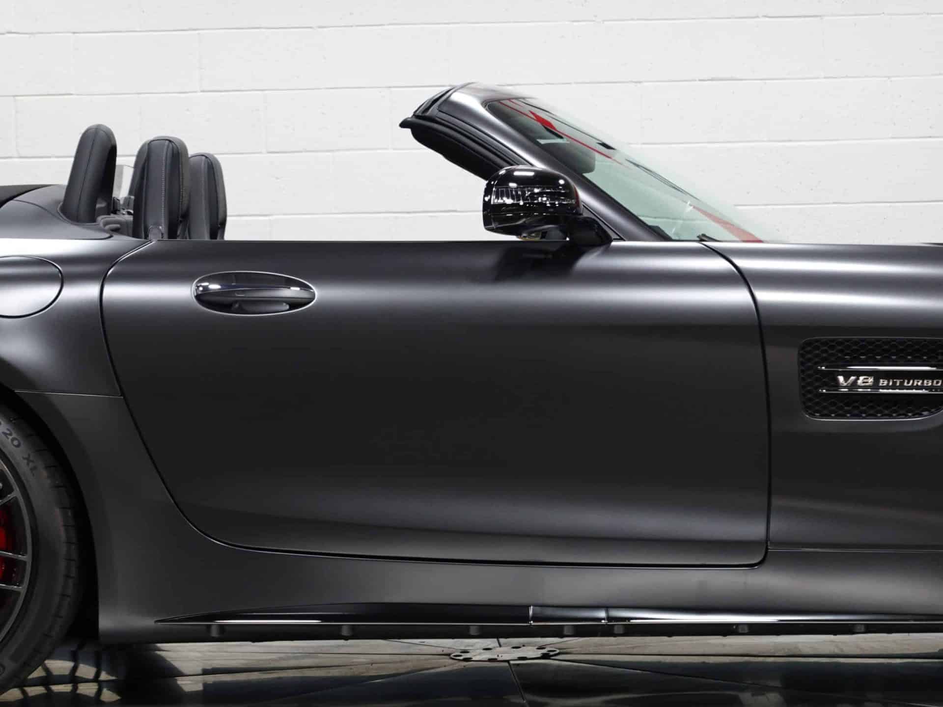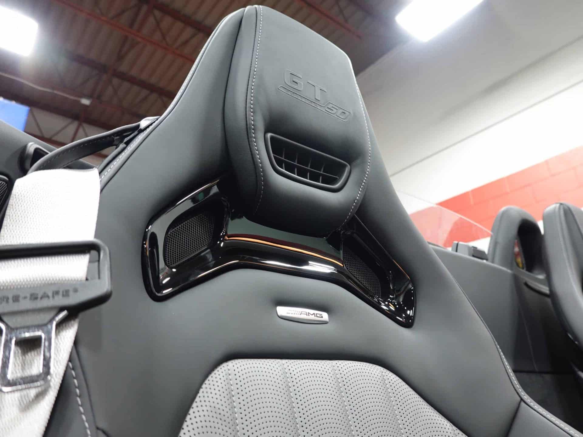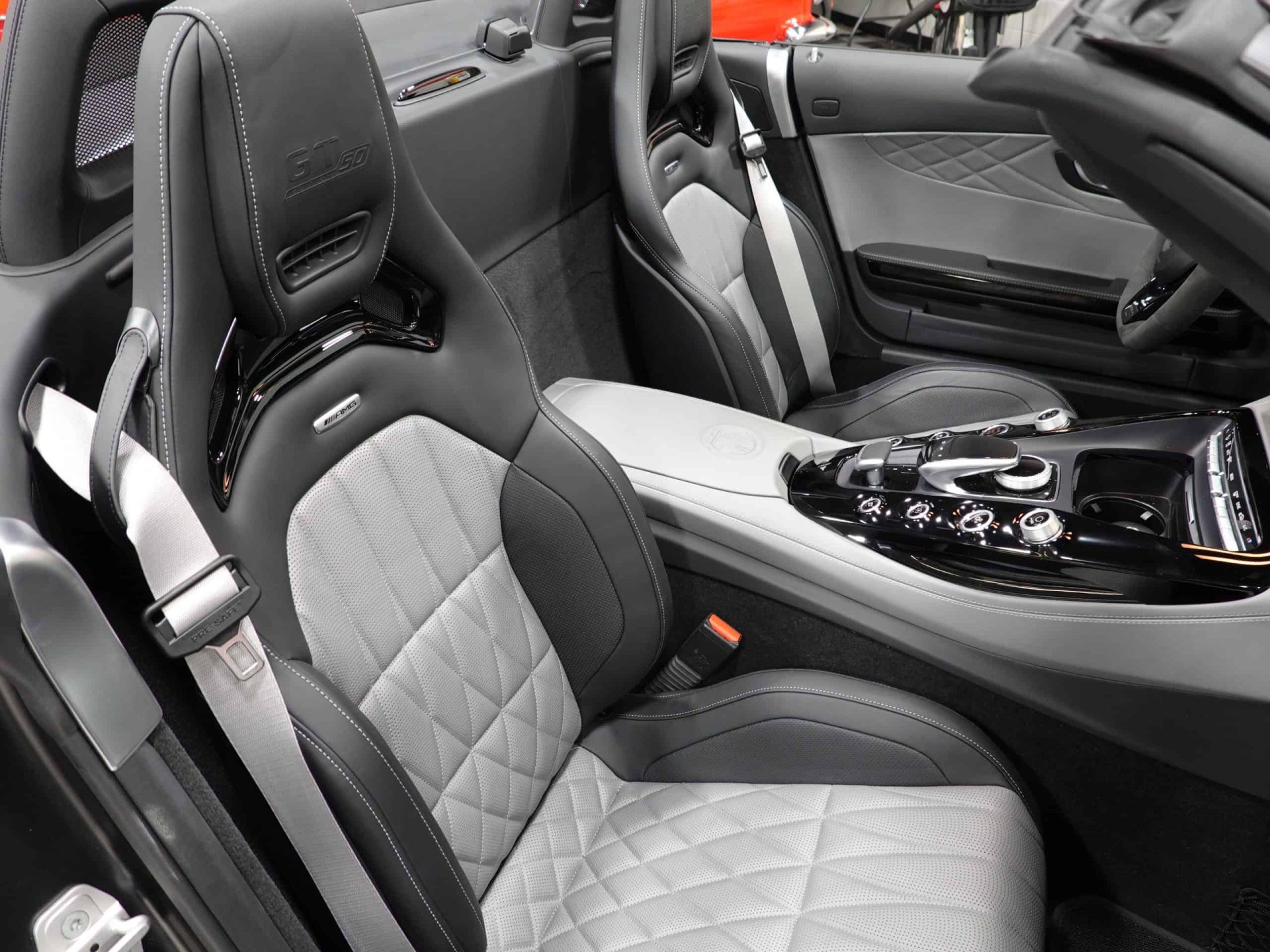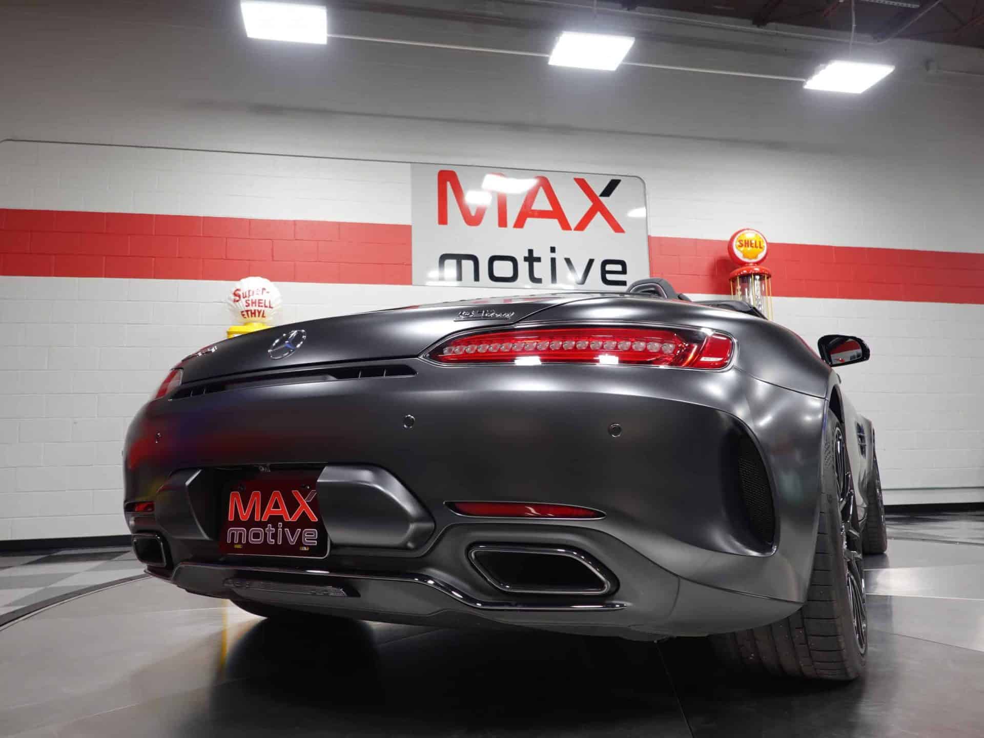 A sight to behold, here is an ultra-exclusive (One of only 50) 2018 Mercedes Benz AMG GT C 50th Anniversary. A mint example with only 552 careful miles, this unique ultra high performance and ultra luxurious Benz offers high-end content and world-class technology. With input from Mercedes Benz’ own Formula 1 World Champion Lewis Hamilton, the company’s AMG racing branch developed the AMG GT entirely in-house. Powered by an authoritative 550 horsepower 4.0L Bi-Turbo V8, it is an extremely engaging automobile with five driving modes. They are Individual (which lets you blend characteristics of the others), Comfort, Sport, Sport +, and Race. You can even adjust the sound of the exhaust. Paddle shifters allow you to operate the AMG Speedshift 7-speed Dual Clutch Automatic Transmission manually. The AMG GT C is a world-class sports car in its own right, but to celebrate the 50th Anniversary of AMG, 50 of these special editions were offered. The 50th Anniversary Edition adds the matte Designo Graphite Gray Magno exterior finish; forged gloss black cross-spoke AMG wheels; black chrome front splitter, fender vent fins, and side skirt inserts; plus black chrome rear diffuser trim and black chrome exhaust outlets. The interior gets silver pearl and black Nappa leather diamond-stitched upholstery, AMG black chrome interior trim, an AMG full Dinamica suede-covered steering wheel (and roof liner), and AMG Edition 50 badging. Burmester High End sound fills the cabin, Mercedes’ optional Parktronic system aids with parking, and the Distronic option is an autonomous cruise-control system. There are many delightful features not found on many cars. The top of the steering wheel is marked just like a Formula 1 car and it’s connected to an electrohydraulic steering rack. The engine and transaxle mounts are electronically controlled to provide an optimum blend of comfort and precision. And there’s a “Handcrafted” badge on the engine cover with the personal signature of the AMG technician who assembled the engine.