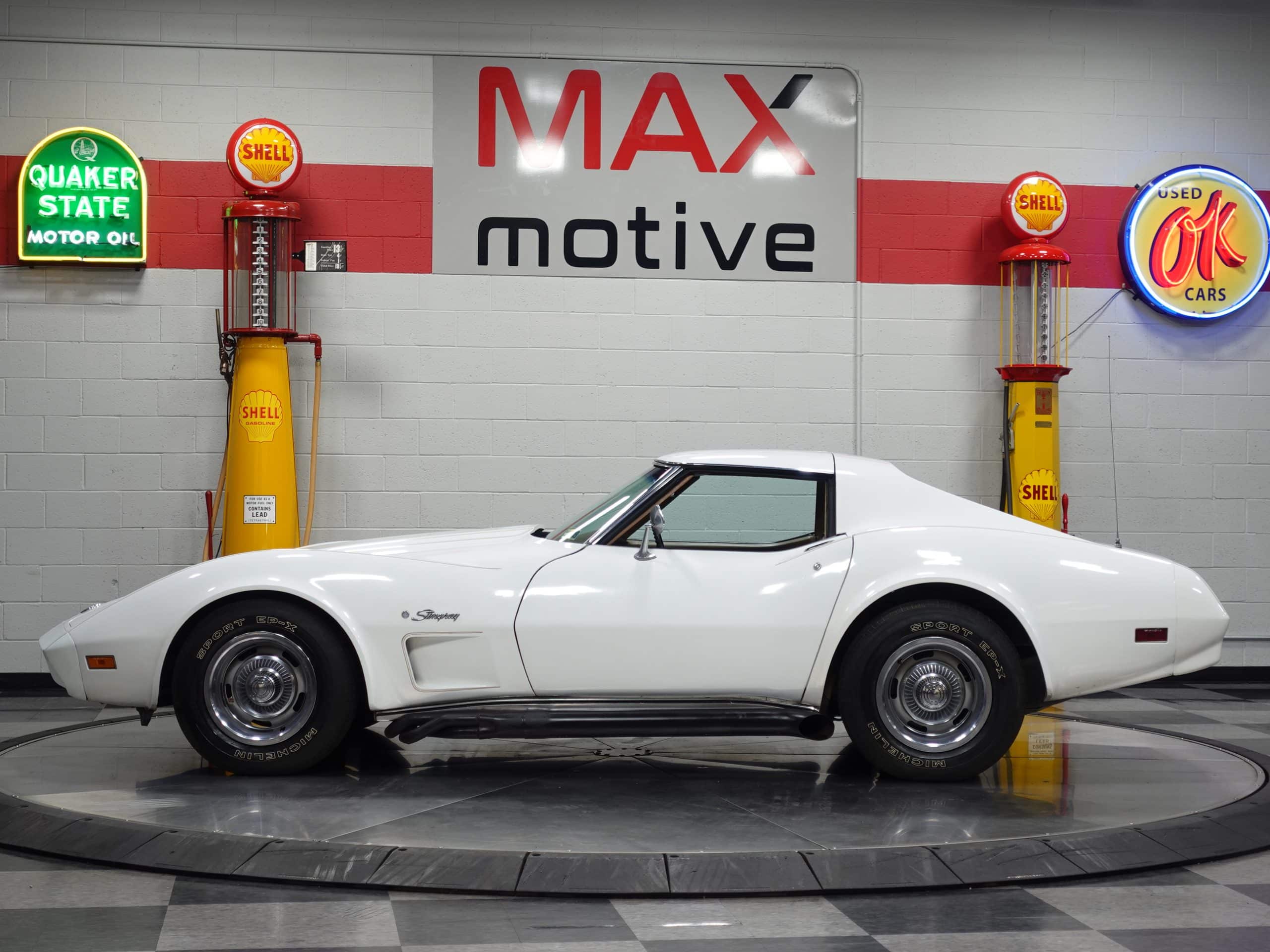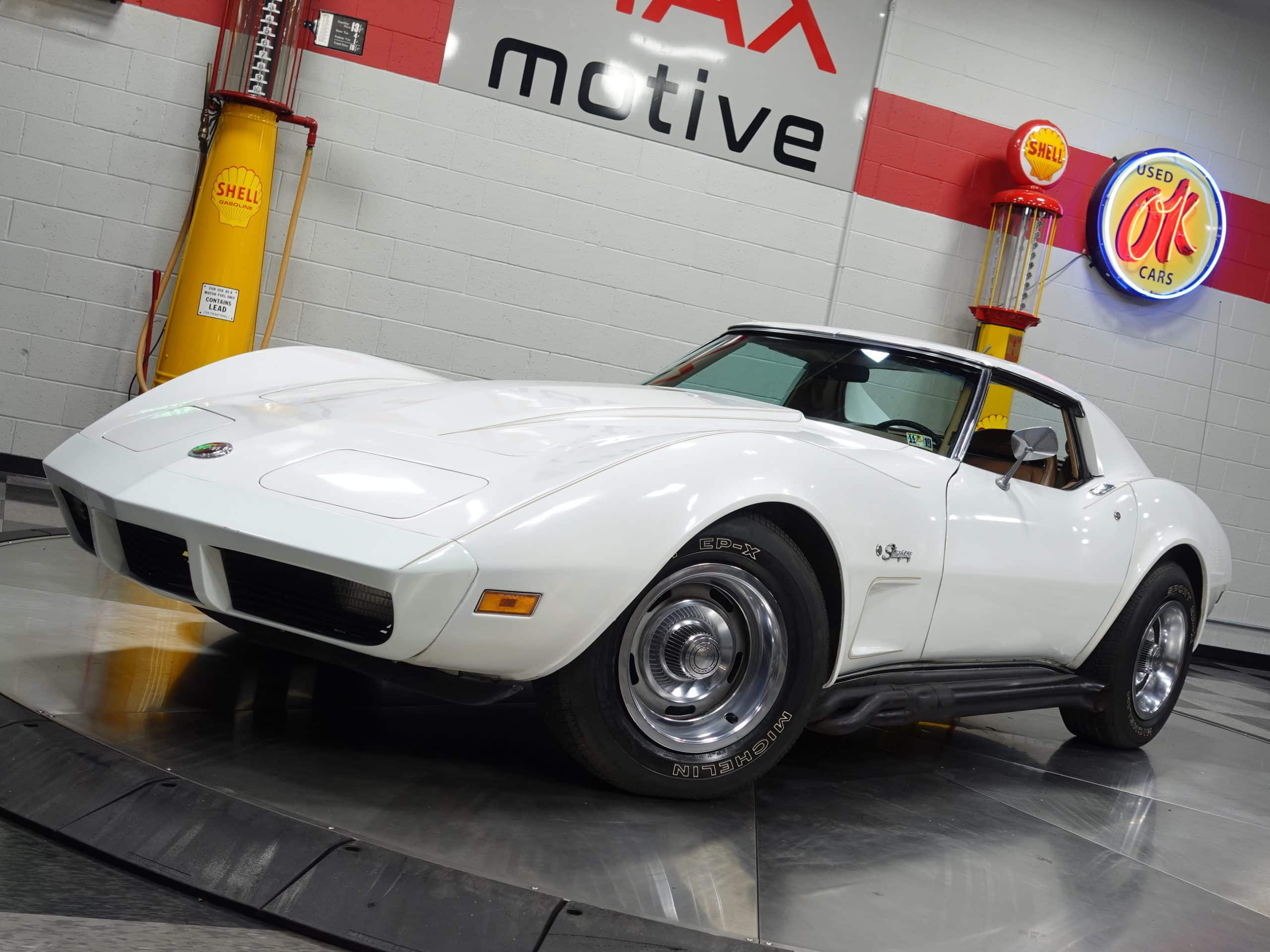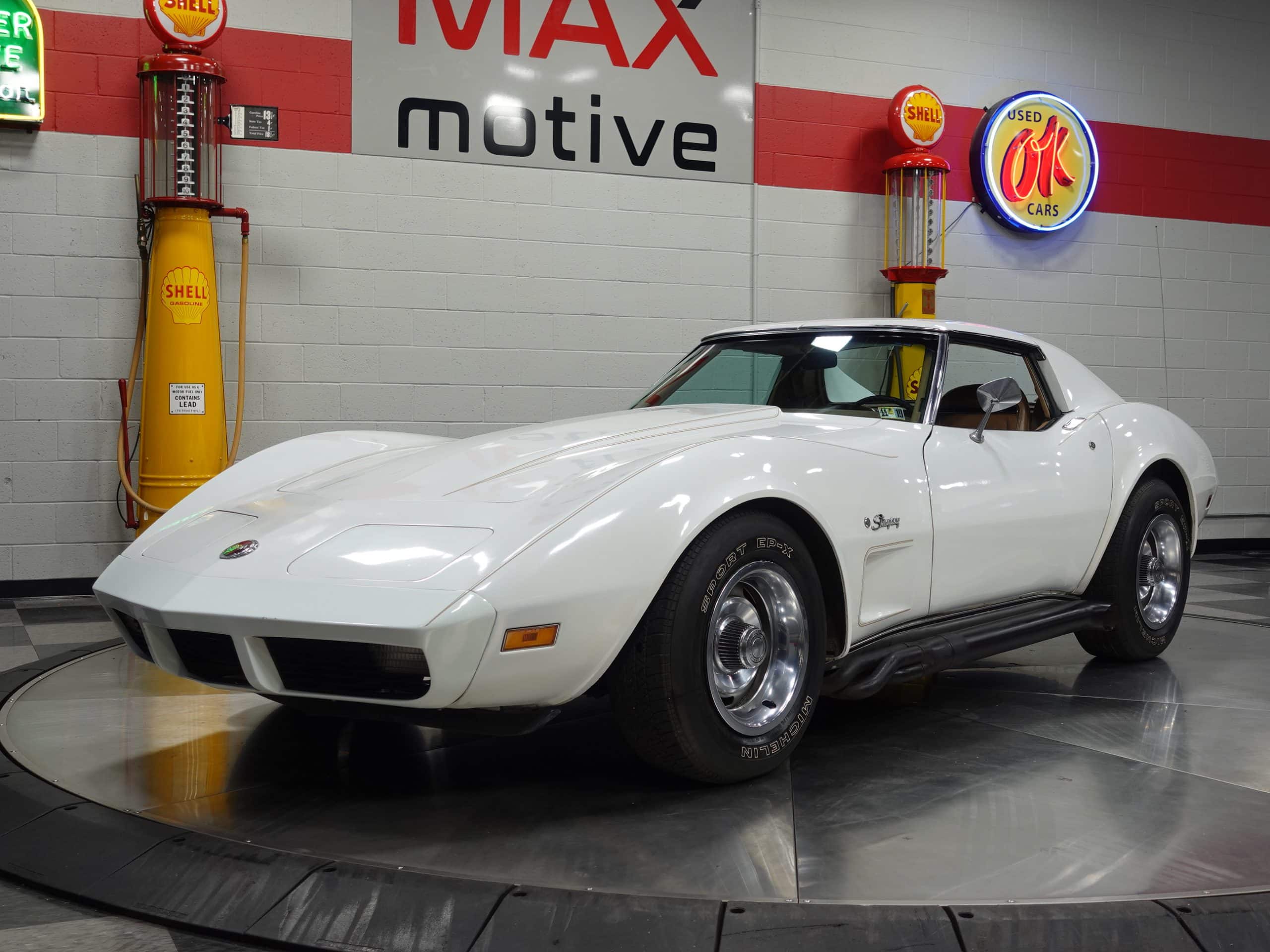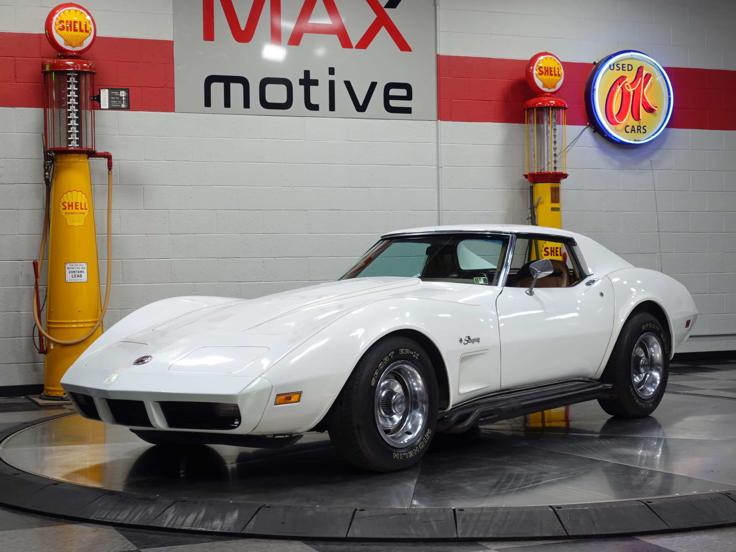 This handsome and original 1974 Chevrolet Corvette Coupe is now available from the MaxMotive Pittsburgh Showroom. The original drivetrain, consisting of the solid, numbers-matching L48 350 V8 and a four-speed manual transmission, has been left stock as has the body, the optional Custom Leather Interior, and even the Rallye wheels with hubcaps and trim rings. A complete set of Michelin tires in the stock replacement size 225/70R15 assures smooth ride and handling. The popular T-roof body allows open air motoring plus the rigid structure of a coupe. The car came equipped with air conditioning, but it is currently not blowing cold. The factory tach is also not functioning. All other systems are go, and this 1974 Chevrolet Corvette Coupe runs and looks great. Please be sure to see the detailed photos at www.maxmotive.com.