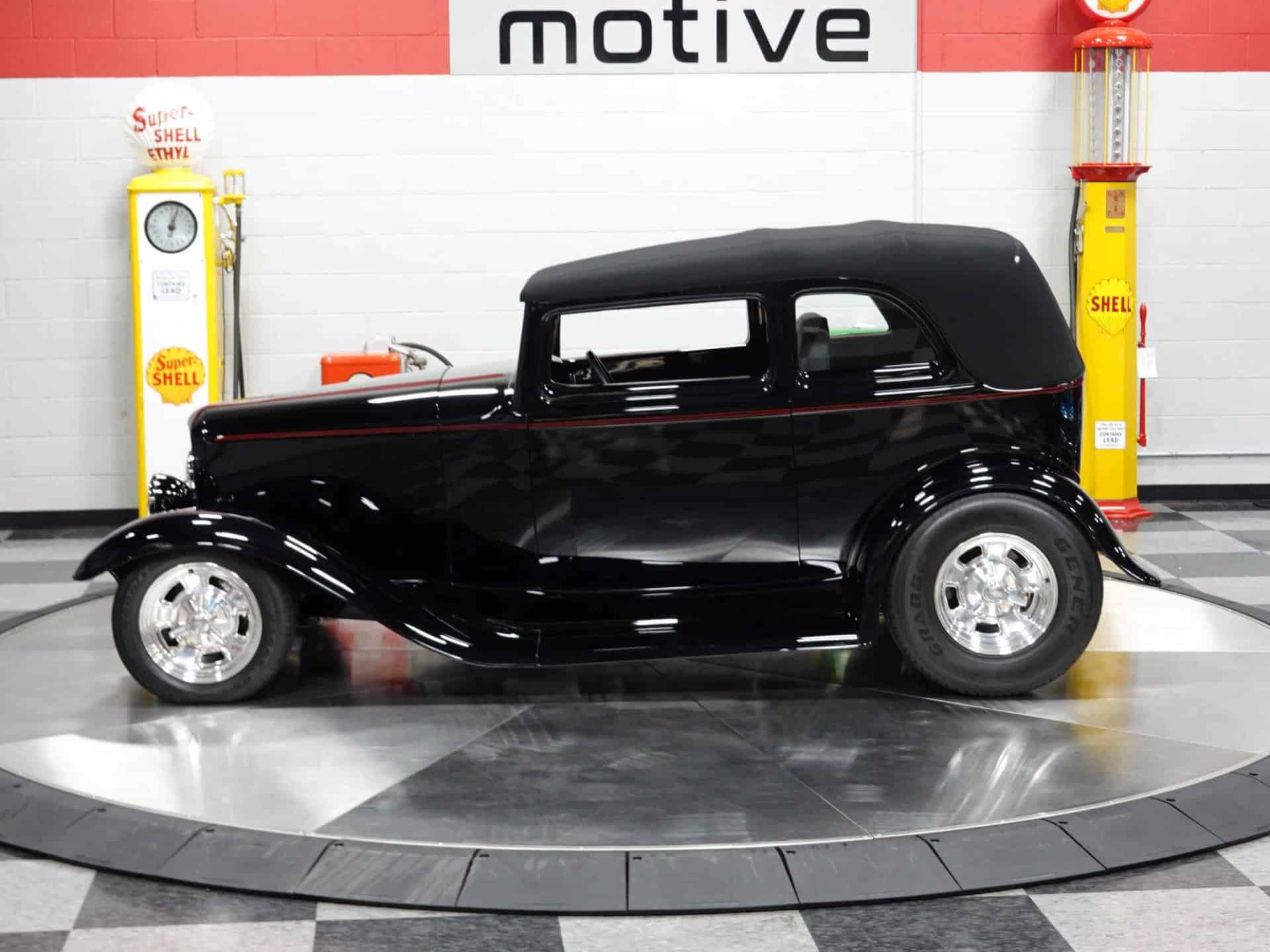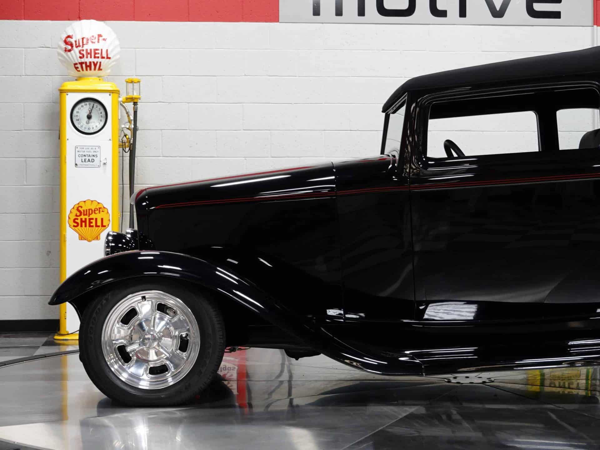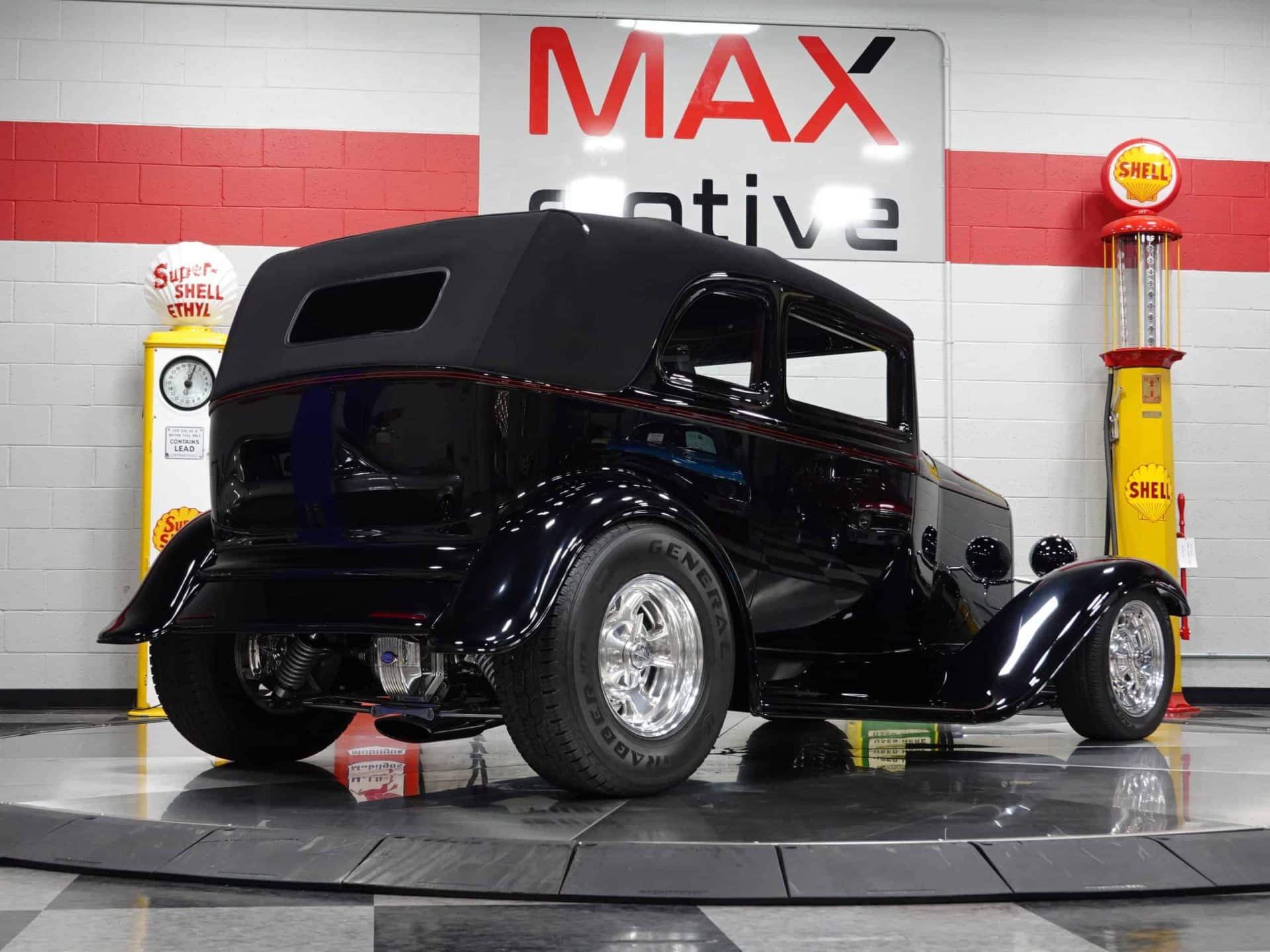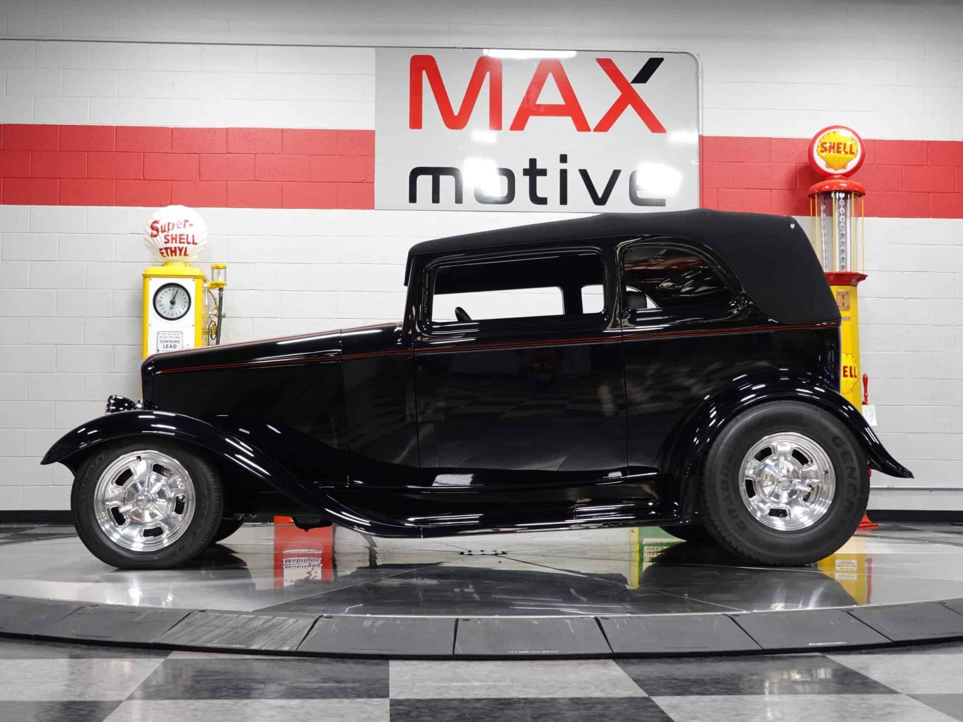 “This was one of the last cars Boyd had his mind and hands on before his passing. And just like all his projects, this ‘32 utilizes only the best products, and greatest depth of skill available.” - Roger C. Johnson. This is the car that became known as “The Master’s Last Hod Rod” after the untimely passing of master builder Boyd Coddington. Boyd was indeed a master, building cars for star personalities and launching the careers of the likes of Chip Foose, Jesse James, and Larry Erickson, Chief Designer of the Mustang and Thunderbird at Ford Motor Company. You would expect the product of Boyd’s many successful years of design and building experience to be something special - and it is. Boyd personally took the car to 90% complete status. Then, as a tribute to the legend, some of the greatest names in the custom car industry brought it to completion. The body was recreated by Coddington’s Shop of Wonders with help from Marcel's Custom Metal Shaping, creating a longer hood and side panels, and matching stretched fenders. The finish is a simple but effective application of rich black exterior paint by Bernet Carlsen. The crowning touch is the one-of-a-kind steel lift-off top. Ample power is supplied by none other than Roush Racing - a 358 cubic inch fuel injected Ford small block with a complete roller valvetrain and custom fabbed headers. The exhaust exits in a marvelously executed single outlet that fits ingeniously beneath the chromed independent rear suspension.…