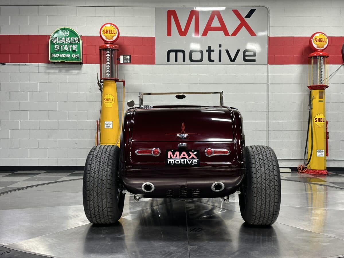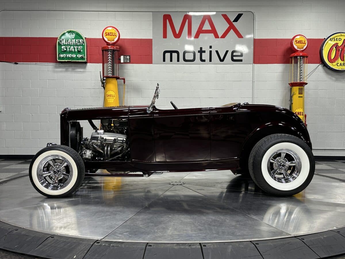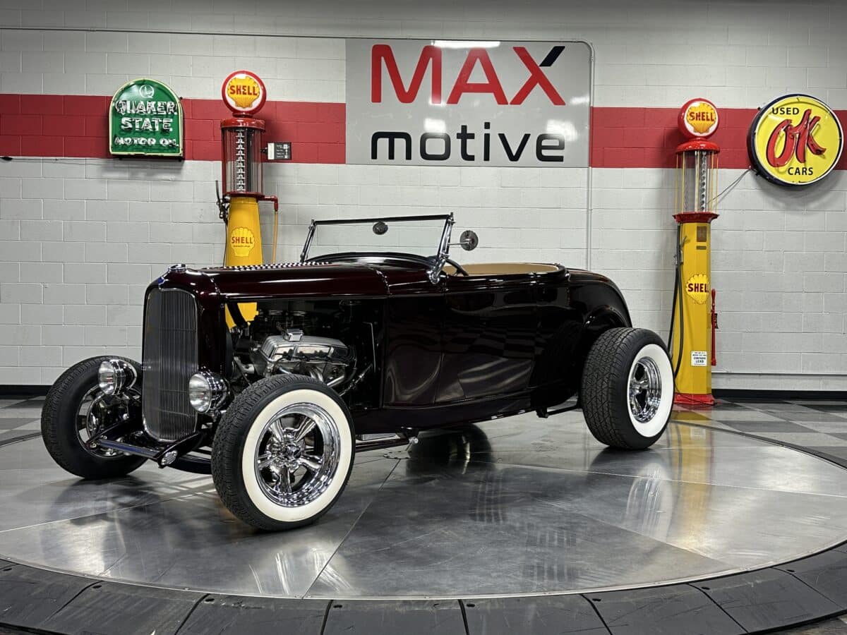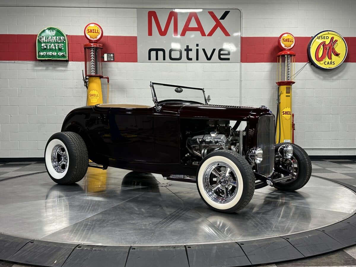 It doesn’t get more classic in the classic car/hot rod world than a 1932 Ford Model A Roadster, and MaxMotive has a top tier example here for you. Completed in 2022 by the previous owner, this hot rod has seen just 1308 miles. The classicness continues with a 350ci small block Chevrolet V8 engine pumping out an estimated 450 horsepower through a Turbo 350 transmission to a 9-inch rear with 3.50 gears. On top are twin 500cfm Edelbrock carburetors The foundation is a body and chassis by the legendary Downs Manufacturing, with a straight axle front suspension, four-link rear suspension, and 4-wheel disc brakes. The body sports a hand-crafted all-aluminum hood with louvers. Harley Davidson Typhoon Maroon makes a nice contrast to the beige vinyl interior. Here you’ll find a Stewart-Warner tach and gauges and a quick release steering wheel for easy entry and exit. A new aftermarket wiring harness handles all the electricals and there’s a 15 gallon aluminum fuel tank with an electric fuel pump. Details such as stainless headers and exhaust and a fully upholstered trunk are further hints to the quality of the build, riding on staggered Coker wide whites on chrome 5-spoke Supreme Wheels. Honoring time-honored hot rod heritage with modern technology in the mix, this 1932 Ford Model A Roadster was recently completed and is ready to show and go. Please see the photos, videos, and details at maxmotive.com.