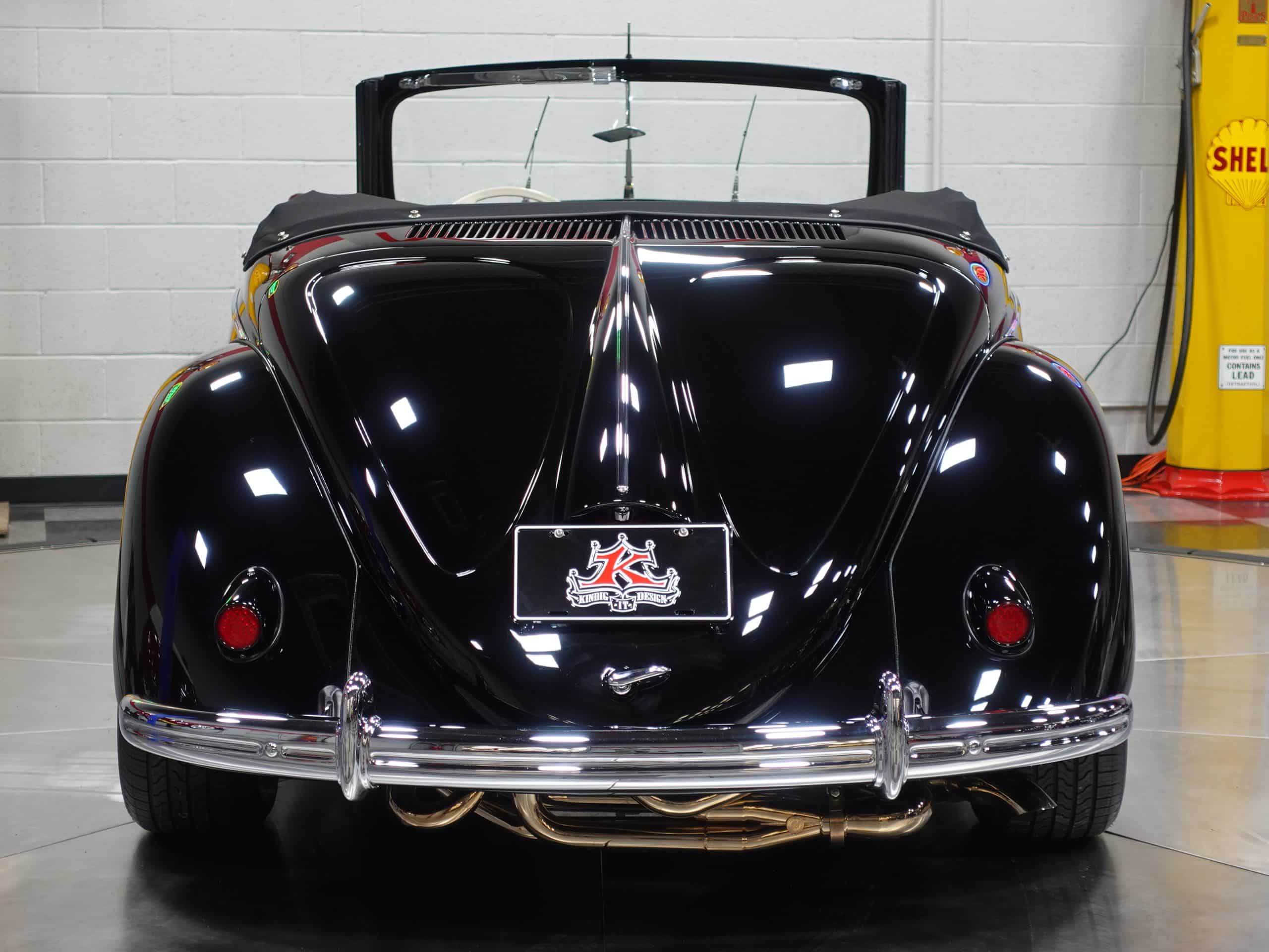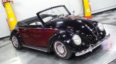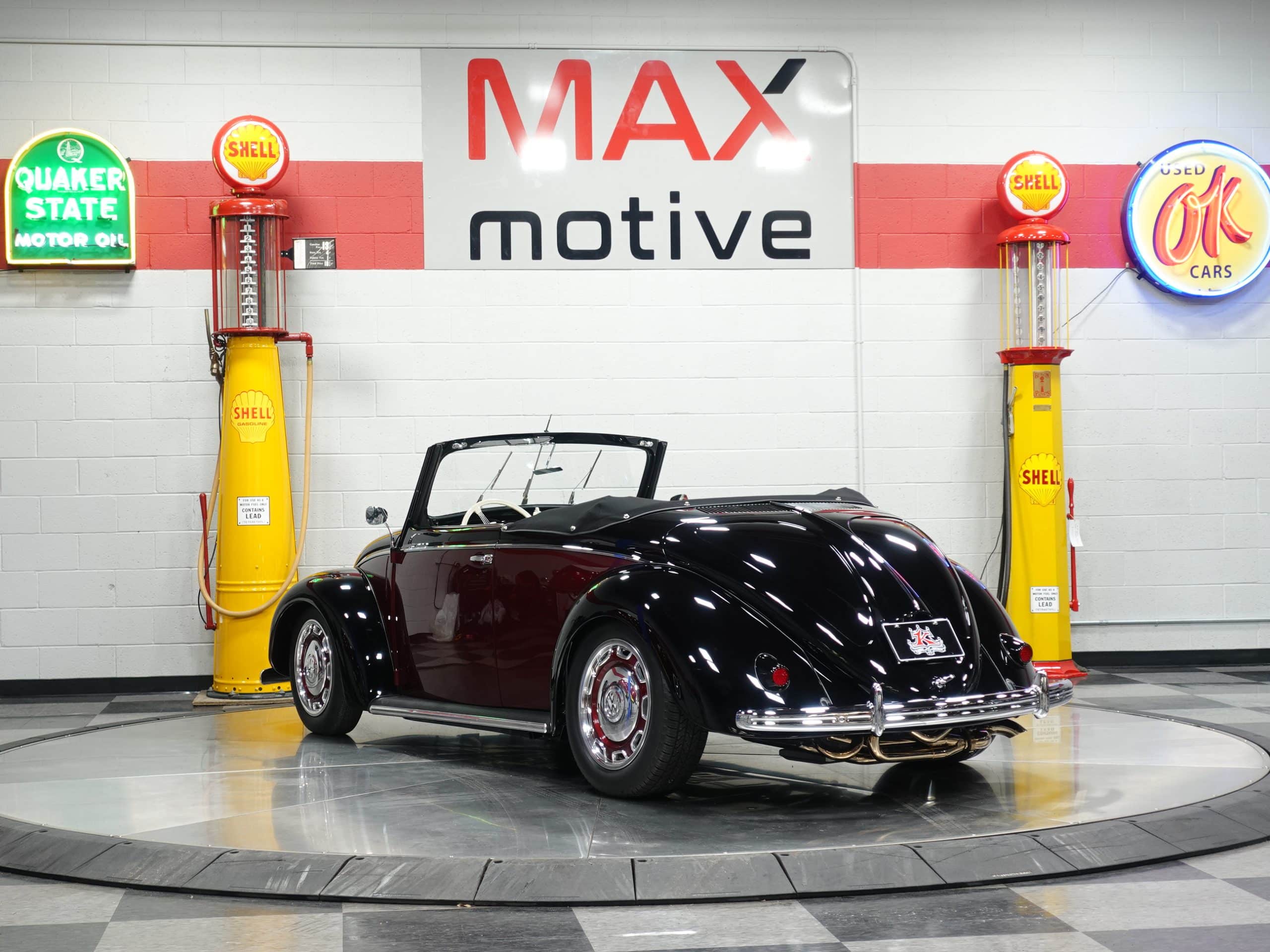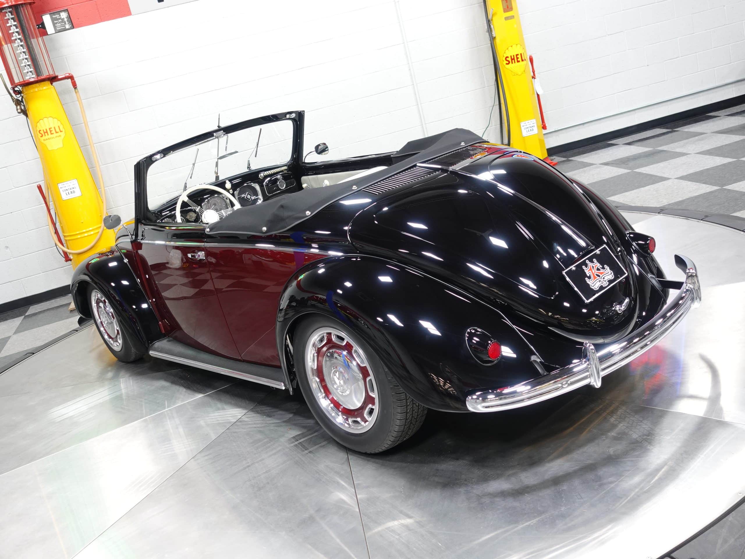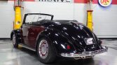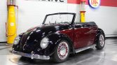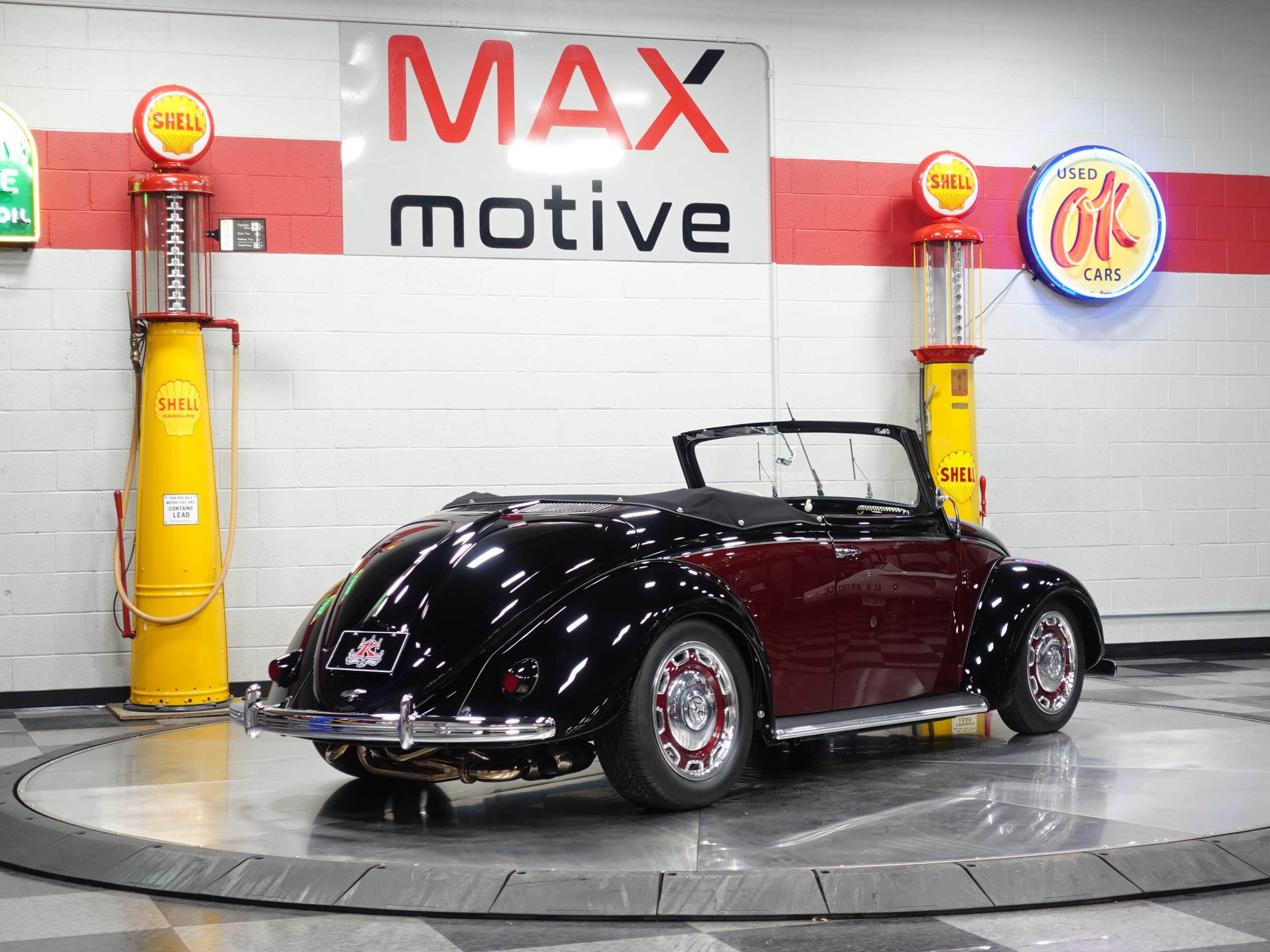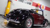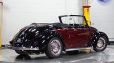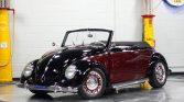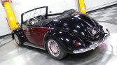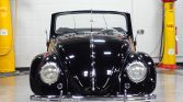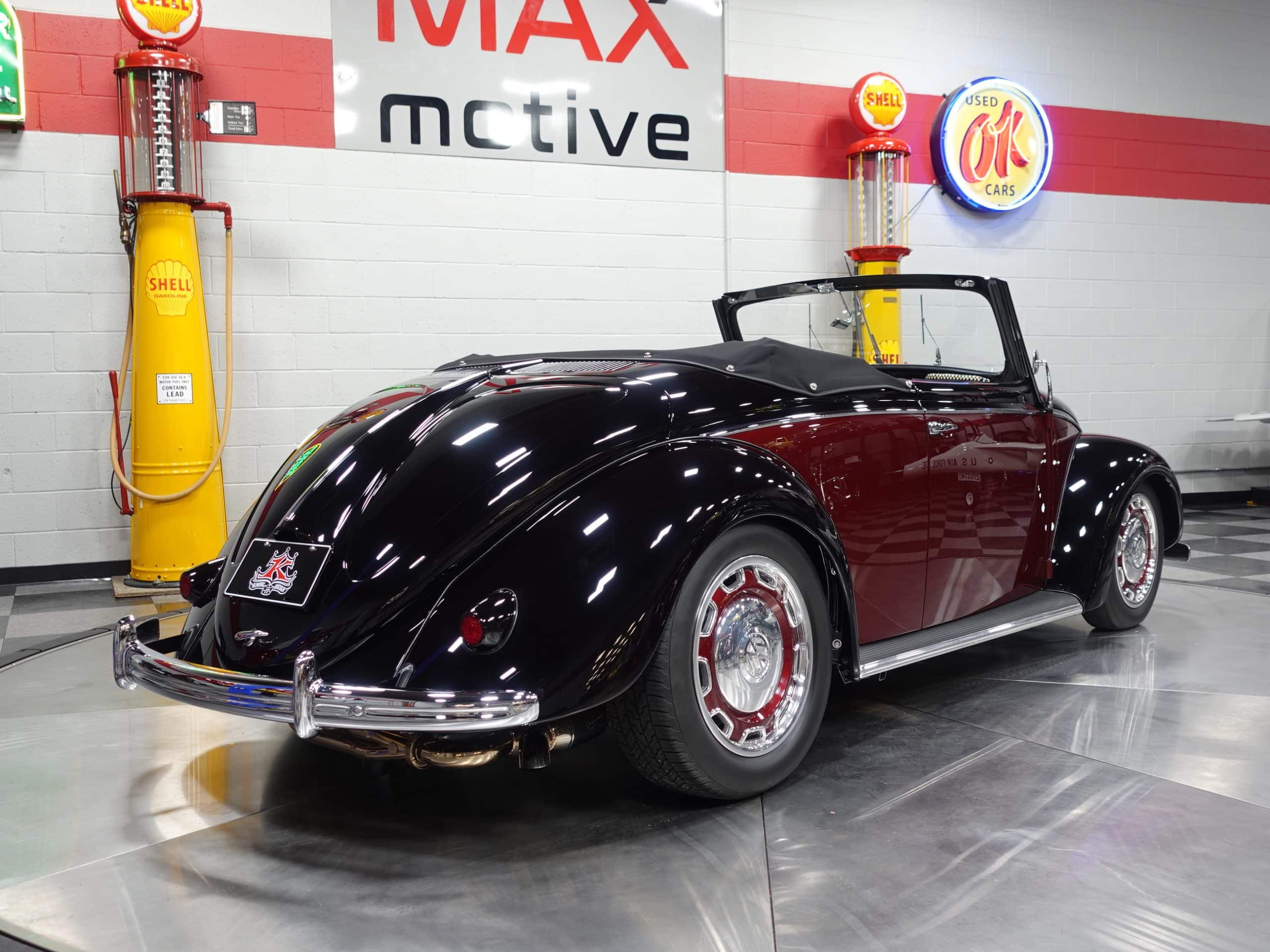 Renowned custom builder Dave Kindig and his team performed a complete body-off custom build to create a one-of-a-kind 1950 Volkswagen Hebmuller Cabriolet. Kindig, of Kindig-It Design in Utah, calls the Hebmuller the rarest and coolest Volkswagen. The team started with a complete genuine Hebmuller, a special sports version of the VW Type 1 of which fewer than 700 were produced. VW Trends Magazine says approximately 100 are believed to exist today. The Kindig team started by installing a custom VW engine generating 176 horsepower. Then the engineers went to work to install a Vanagon automatic transmission for driving ease and to handle the extra power. Other mechanical upgrades include 4-wheel disc brakes, and a fully independent coilover suspension, which gives the car a refined, lowered stance. The sheetmetal was stripped, custom metalwork performed, and custom paint applied. The two-tone paint colors are Kindig’s own mixes of Bad Blood Red and Black Hole Black. Soft leather seats in pale gray complement the gray and black interior, which is a fascinating blend of classic and modern elements from the vintage analog clock to the tidy Dakota Digital gauges. Please be sure to see the detailed photos at www.maxmotive.com.