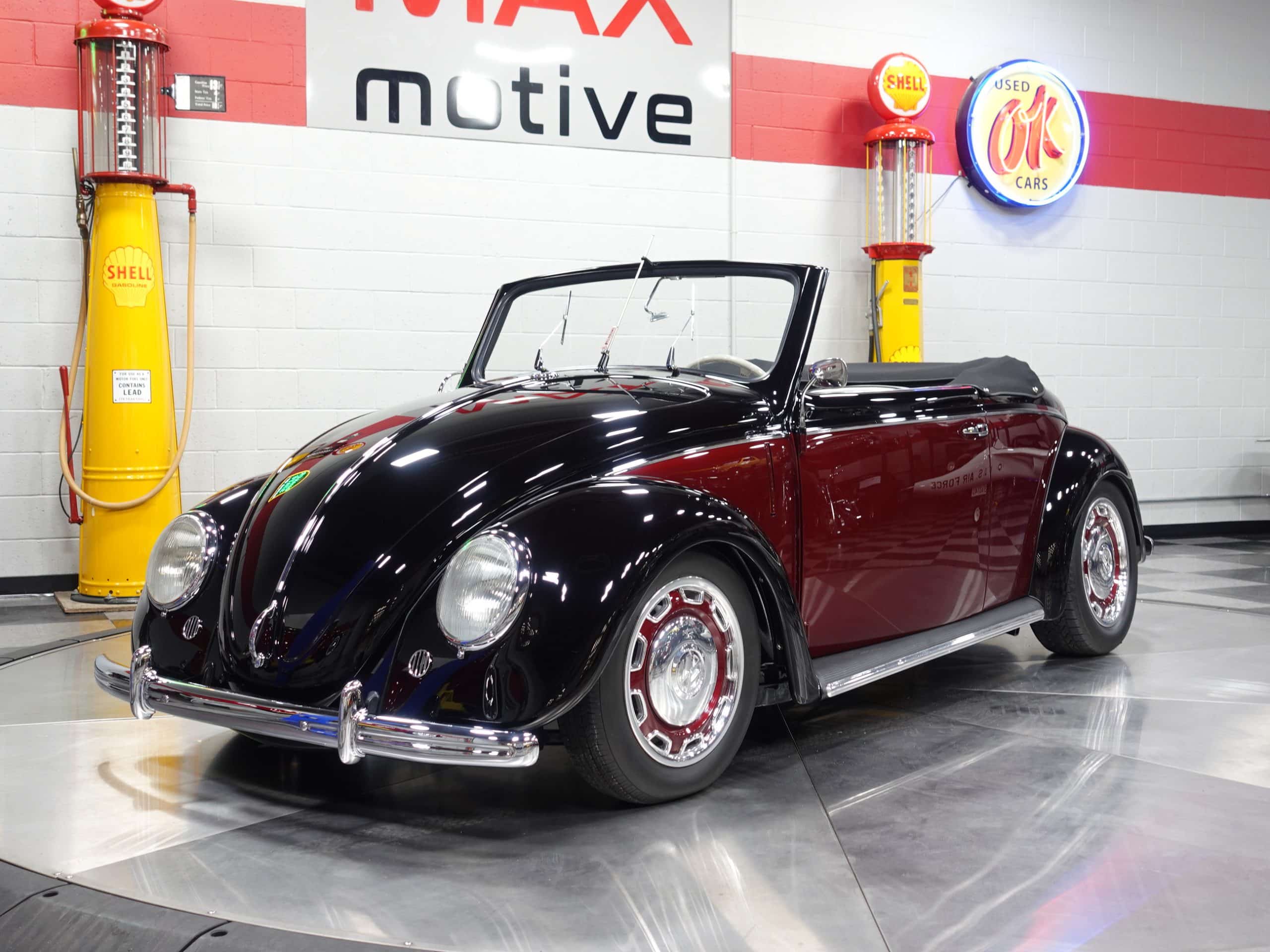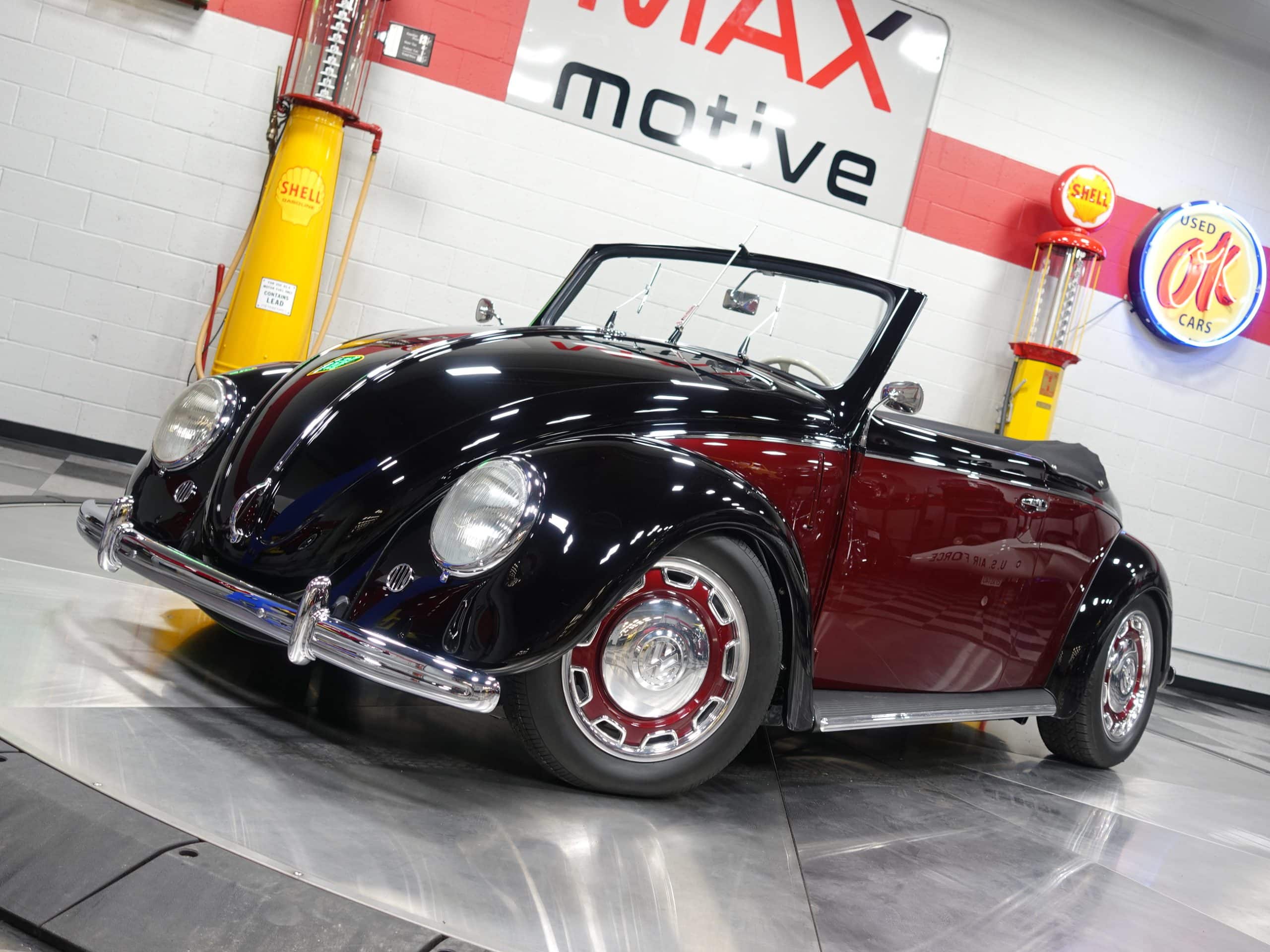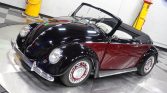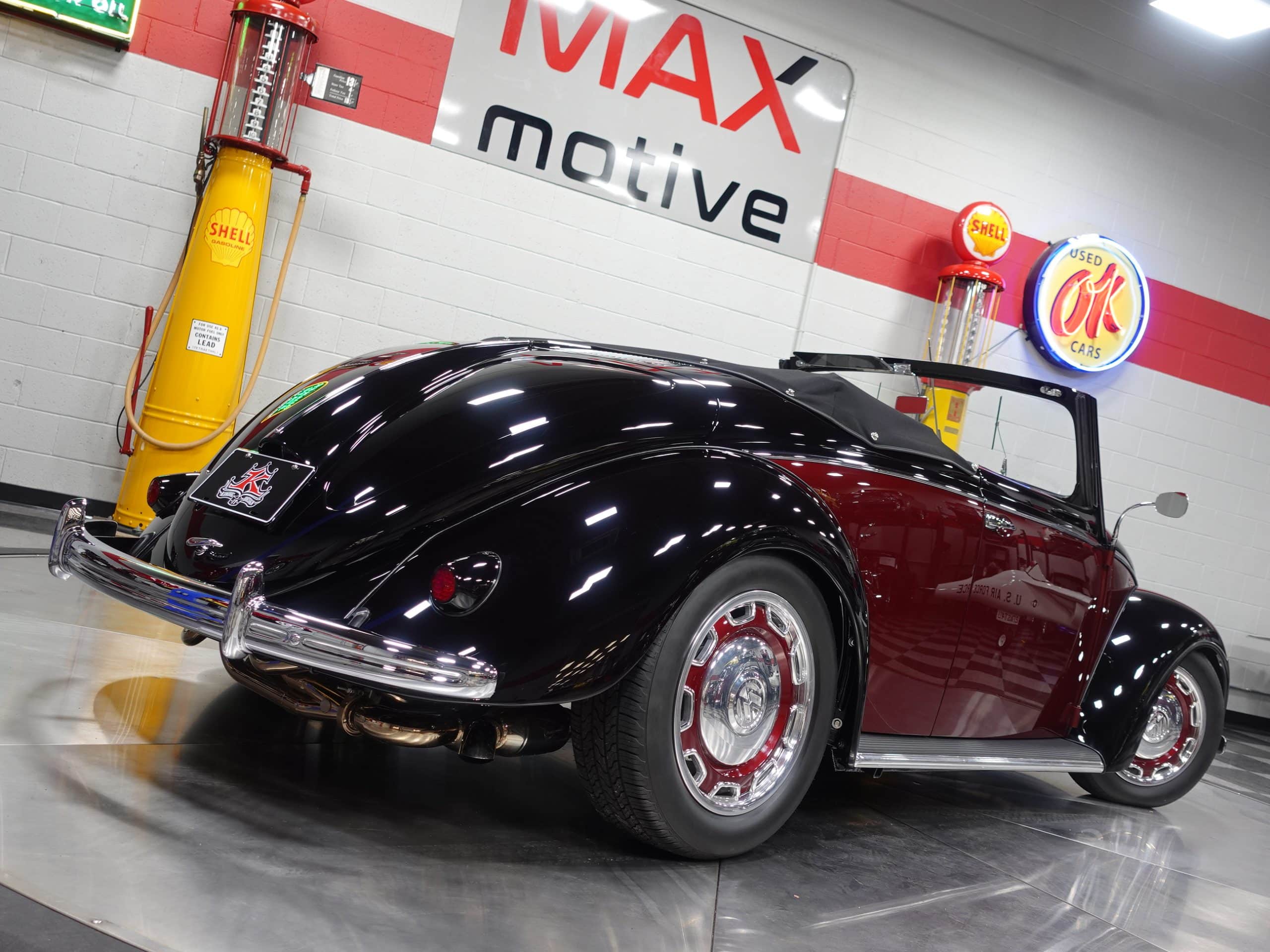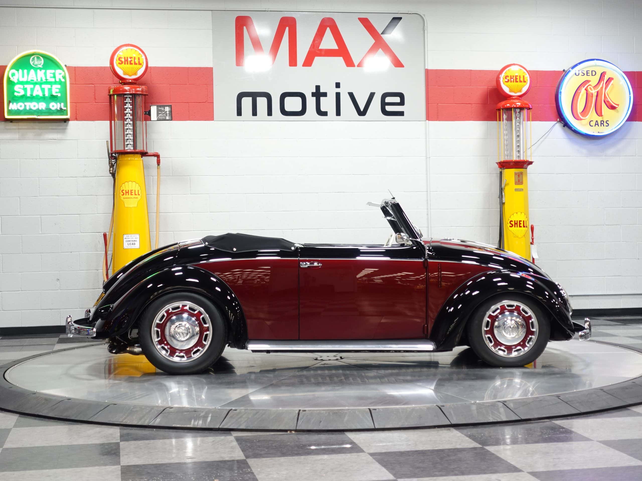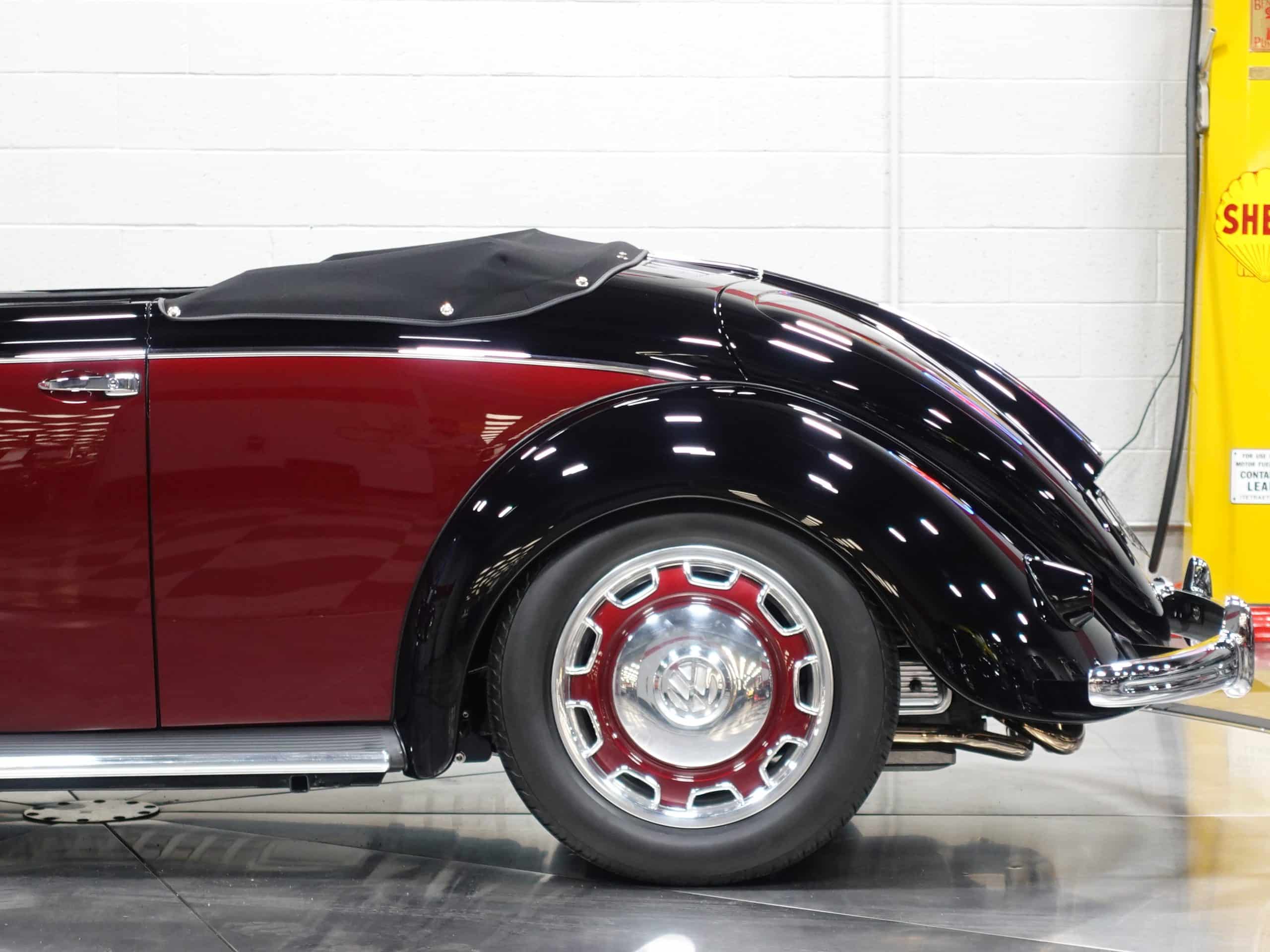 Renowned custom builder Dave Kindig and his team performed a complete body-off custom build to create a one-of-a-kind 1950 Volkswagen Hebmuller Cabriolet. Kindig, of Kindig-It Design in Utah, calls the Hebmuller the rarest and coolest Volkswagen. The team started with a complete genuine Hebmuller, a special sports version of the VW Type 1 of which fewer than 700 were produced. VW Trends Magazine says approximately 100 are believed to exist today. The Kindig team started by installing a custom VW engine generating 176 horsepower. Then the engineers went to work to install a Vanagon automatic transmission for driving ease and to handle the extra power. Other mechanical upgrades include 4-wheel disc brakes, and a fully independent coilover suspension, which gives the car a refined, lowered stance. The sheetmetal was stripped, custom metalwork performed, and custom paint applied. The two-tone paint colors are Kindig’s own mixes of Bad Blood Red and Black Hole Black. Soft leather seats in pale gray complement the gray and black interior, which is a fascinating blend of classic and modern elements from the vintage analog clock to the tidy Dakota Digital gauges. Please be sure to see the detailed photos at www.maxmotive.com.