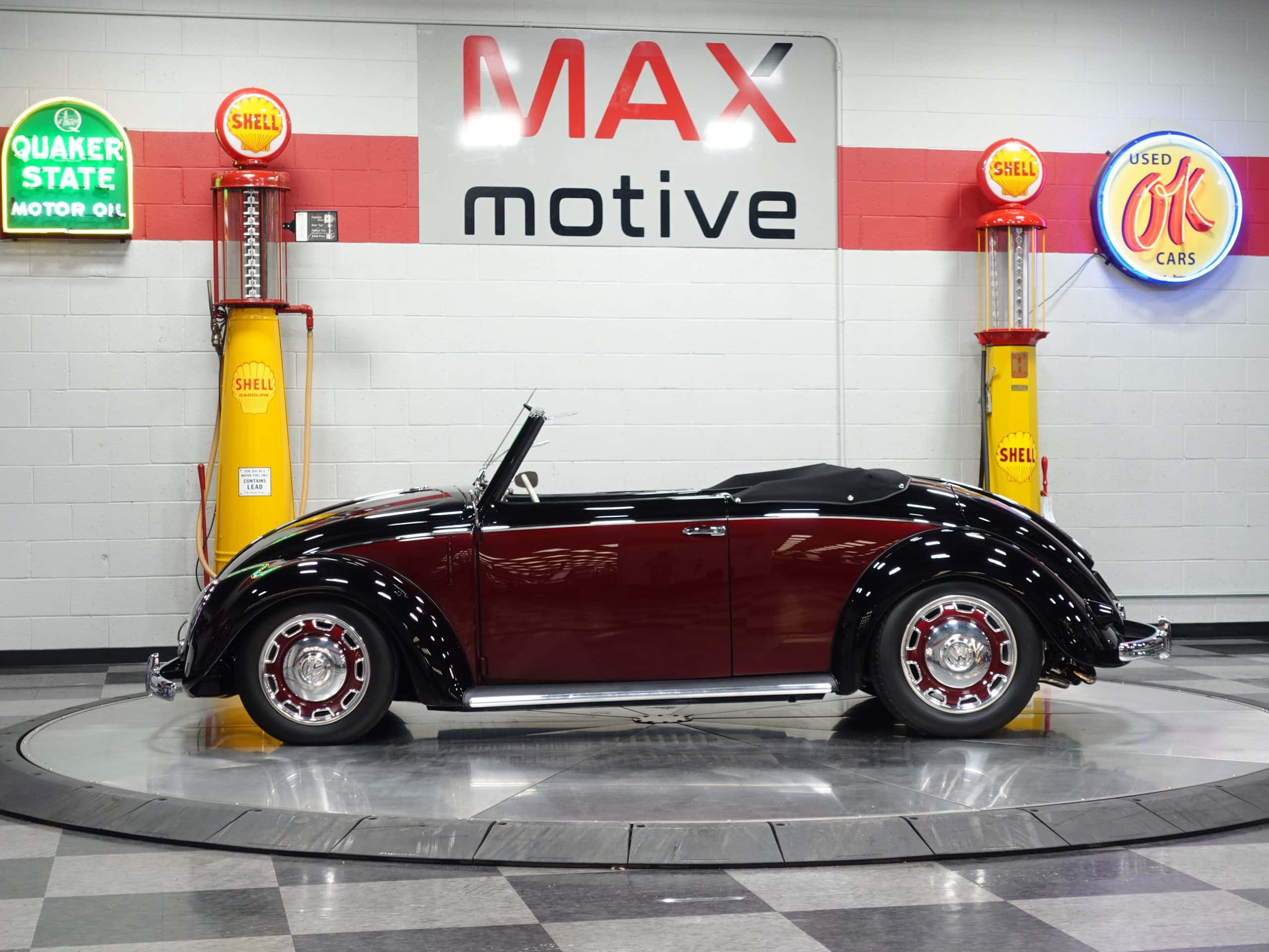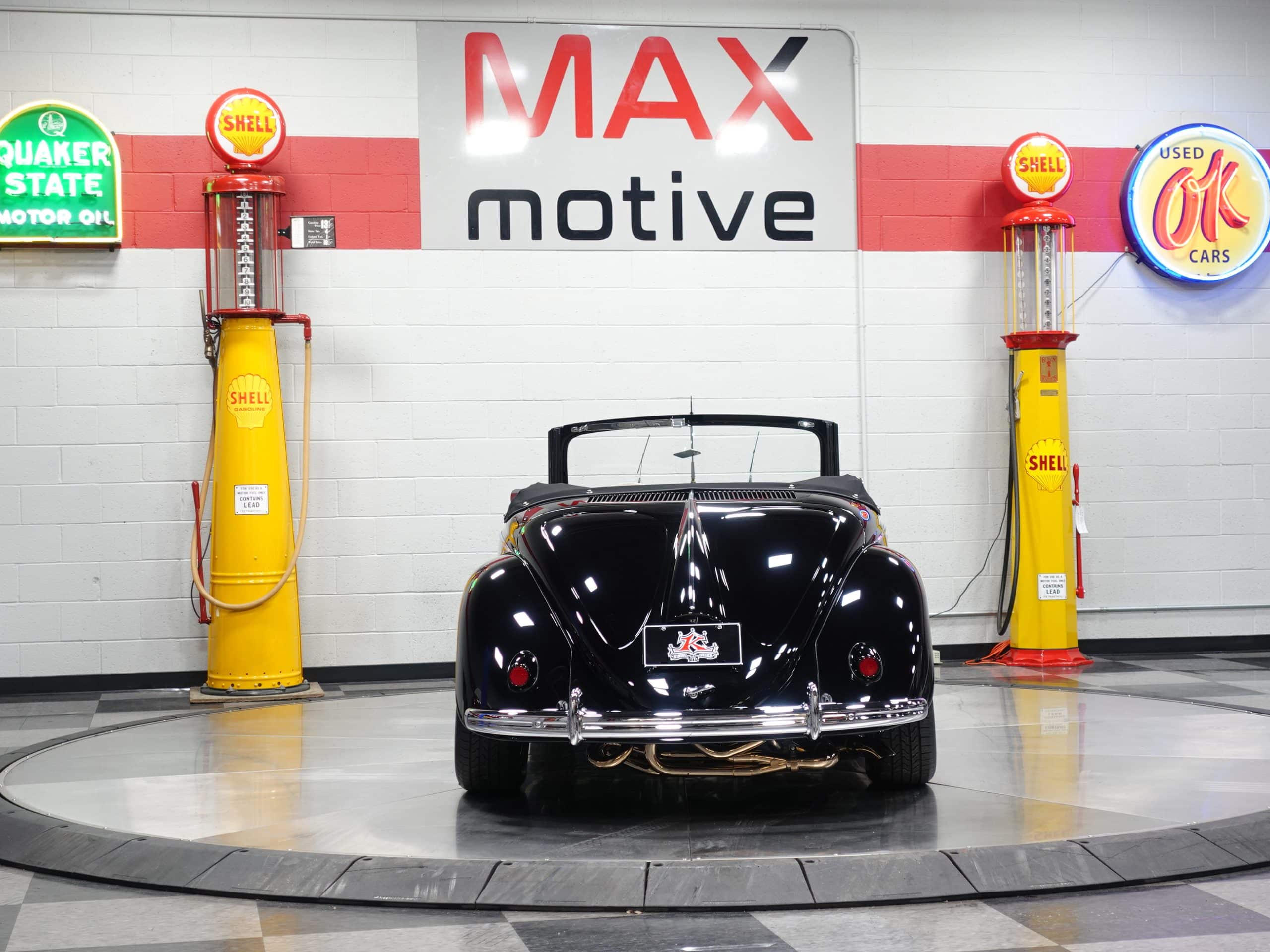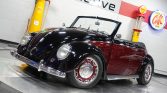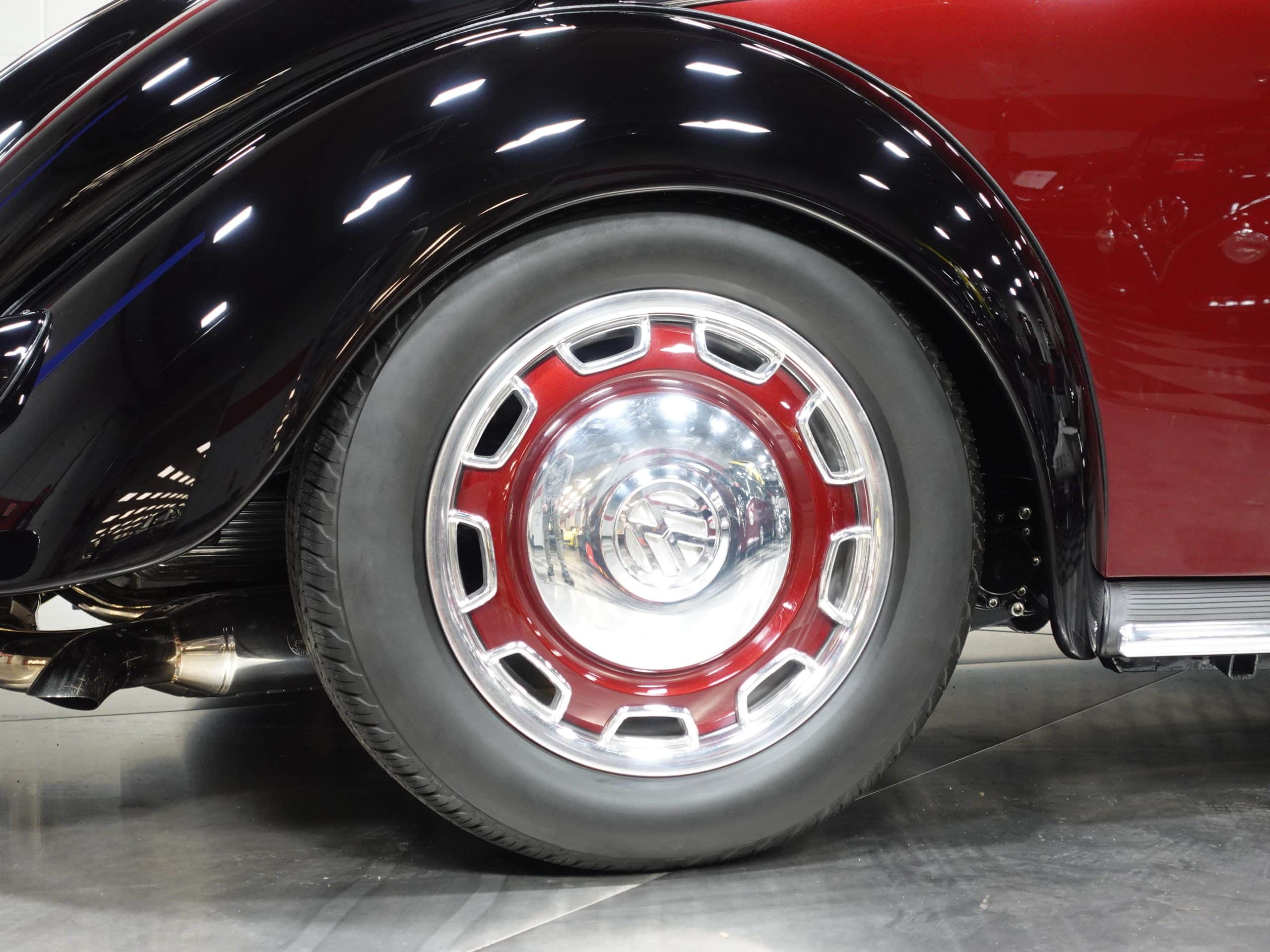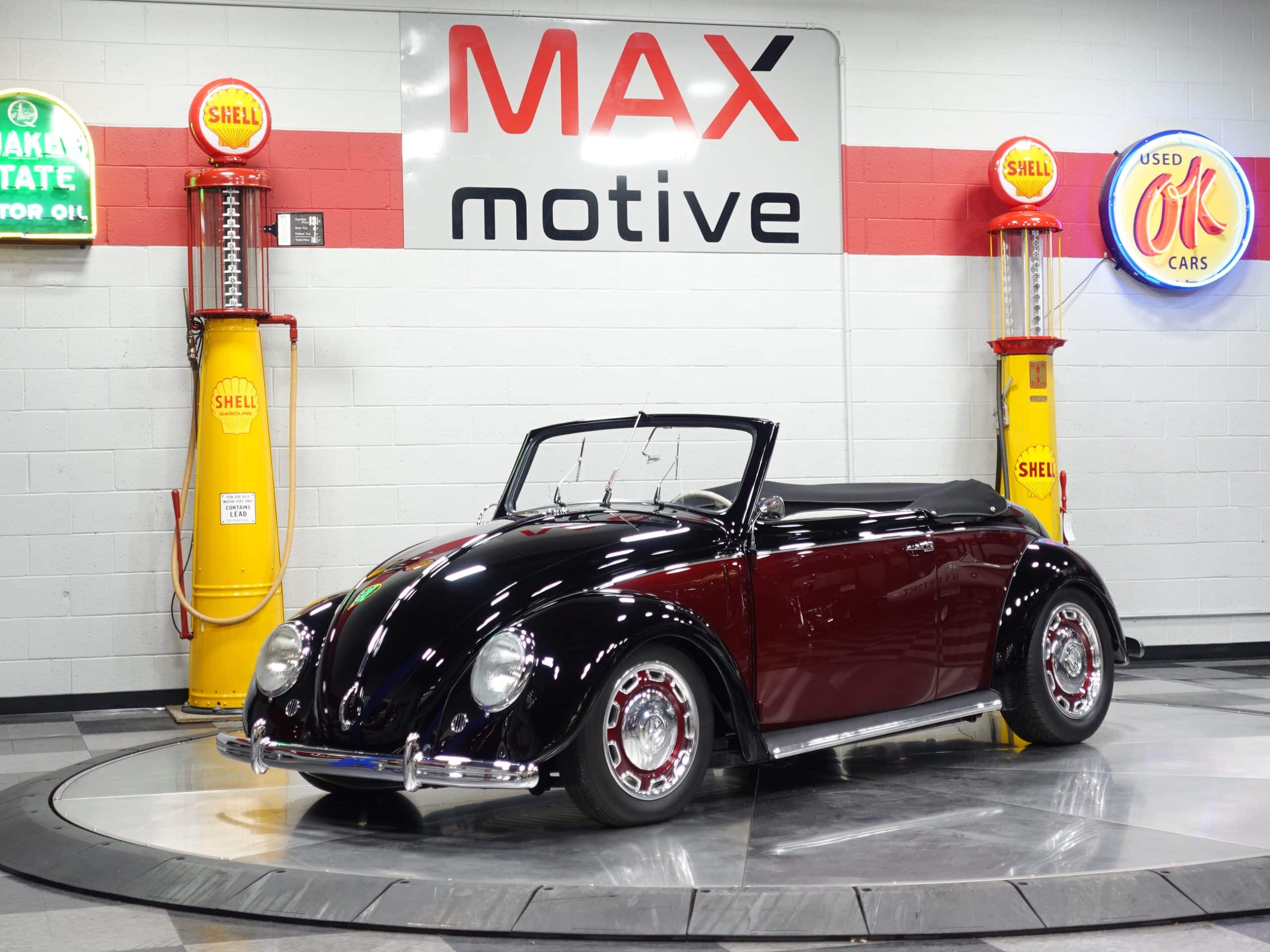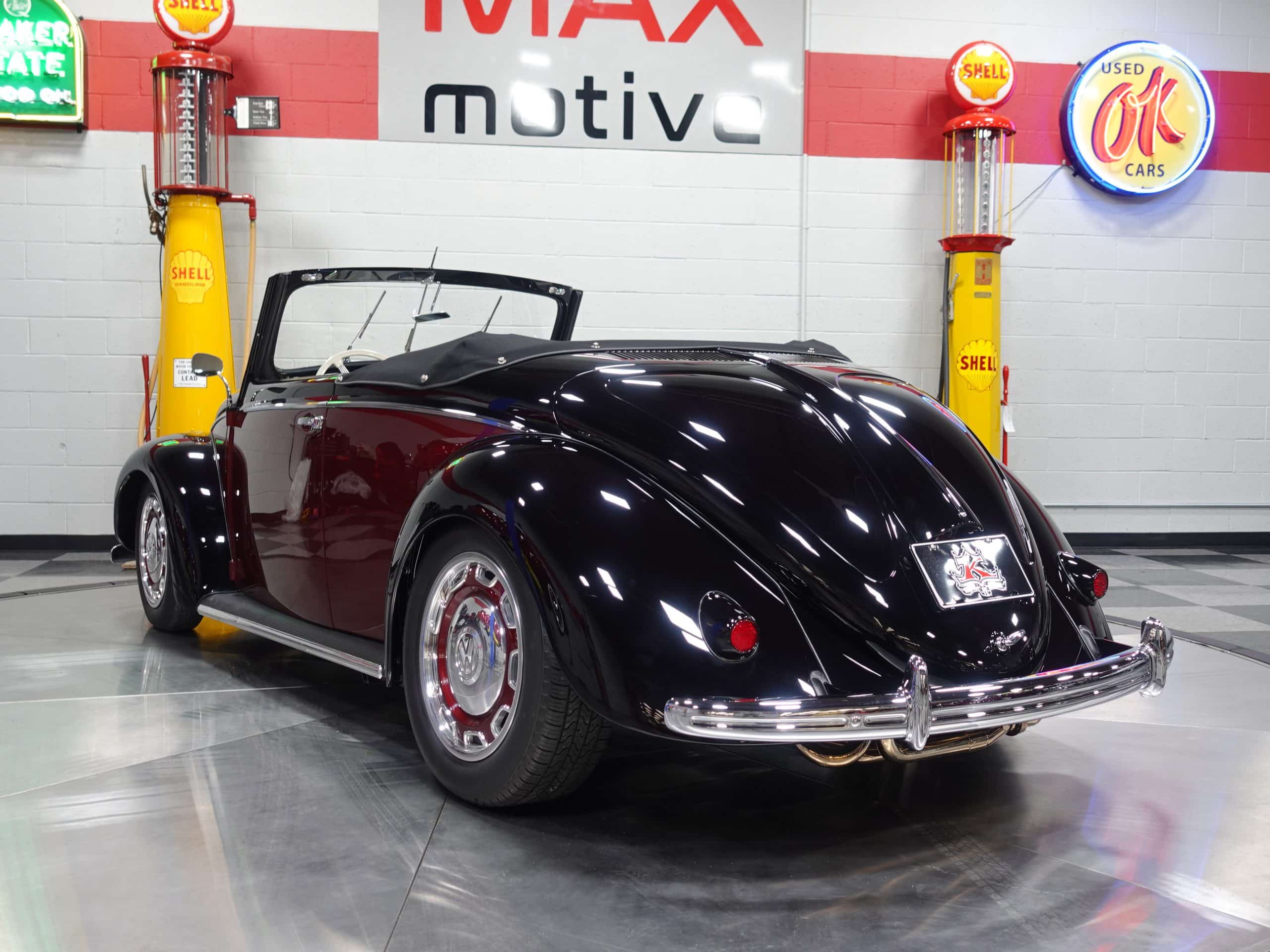 Renowned custom builder Dave Kindig and his team performed a complete body-off custom build to create a one-of-a-kind 1950 Volkswagen Hebmuller Cabriolet. Kindig, of Kindig-It Design in Utah, calls the Hebmuller the rarest and coolest Volkswagen. The team started with a complete genuine Hebmuller, a special sports version of the VW Type 1 of which fewer than 700 were produced. VW Trends Magazine says approximately 100 are believed to exist today. The Kindig team started by installing a custom VW engine generating 176 horsepower. Then the engineers went to work to install a Vanagon automatic transmission for driving ease and to handle the extra power. Other mechanical upgrades include 4-wheel disc brakes, and a fully independent coilover suspension, which gives the car a refined, lowered stance. The sheetmetal was stripped, custom metalwork performed, and custom paint applied. The two-tone paint colors are Kindig’s own mixes of Bad Blood Red and Black Hole Black. Soft leather seats in pale gray complement the gray and black interior, which is a fascinating blend of classic and modern elements from the vintage analog clock to the tidy Dakota Digital gauges. Please be sure to see the detailed photos at www.maxmotive.com.