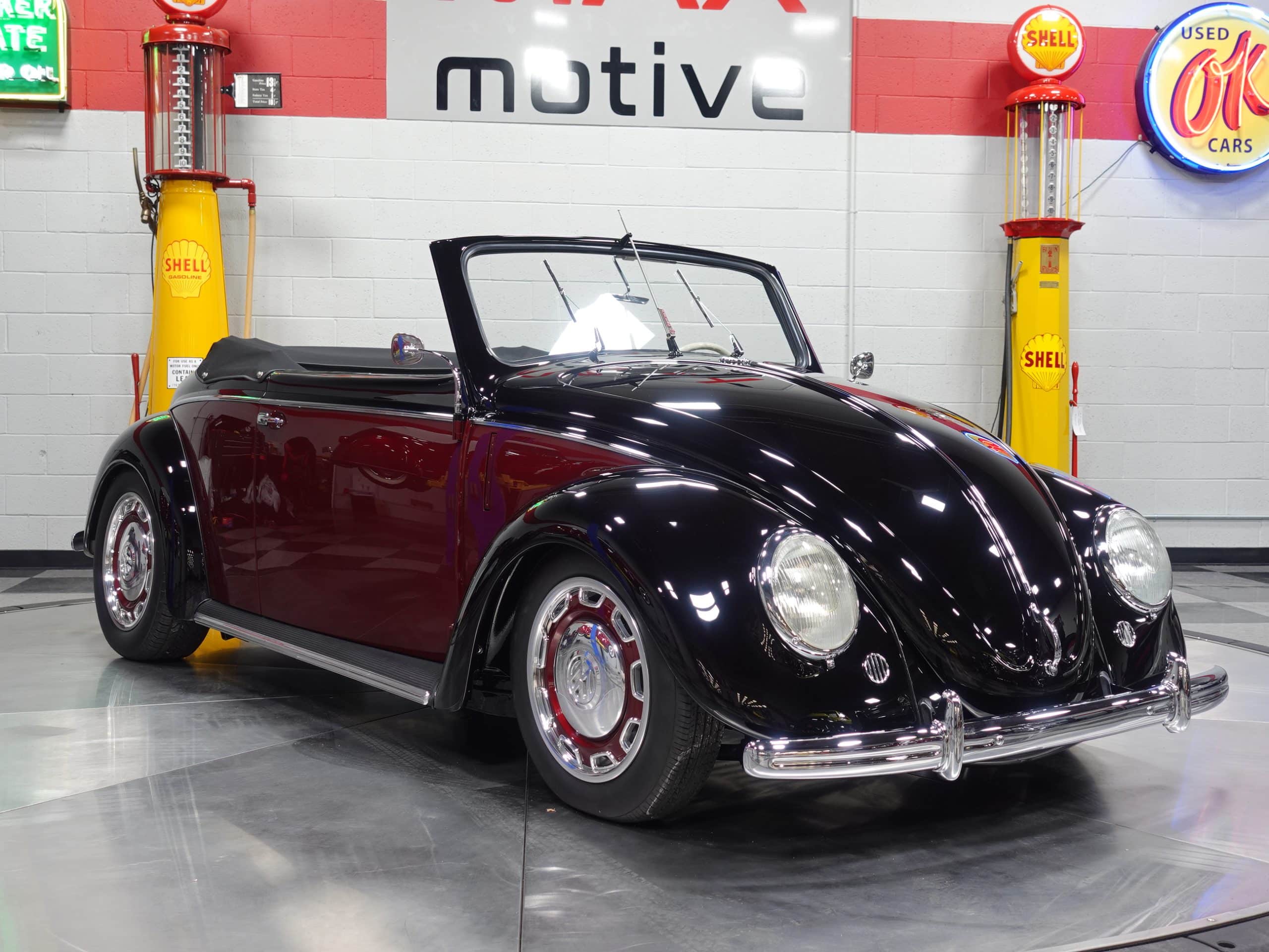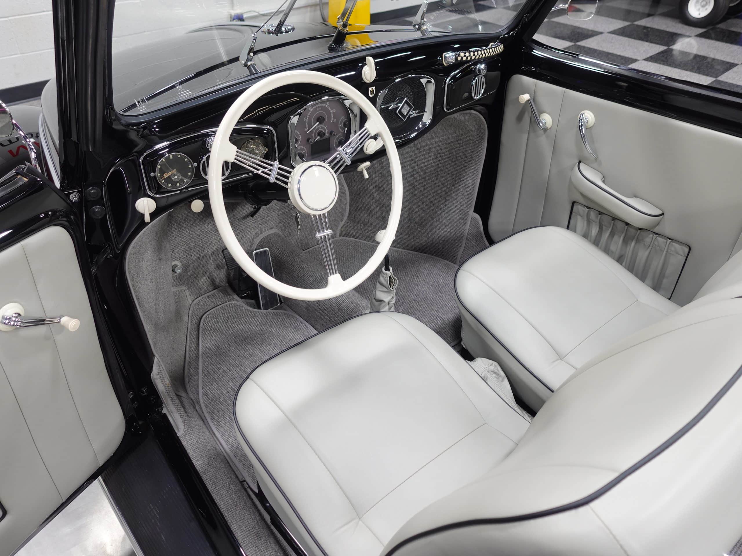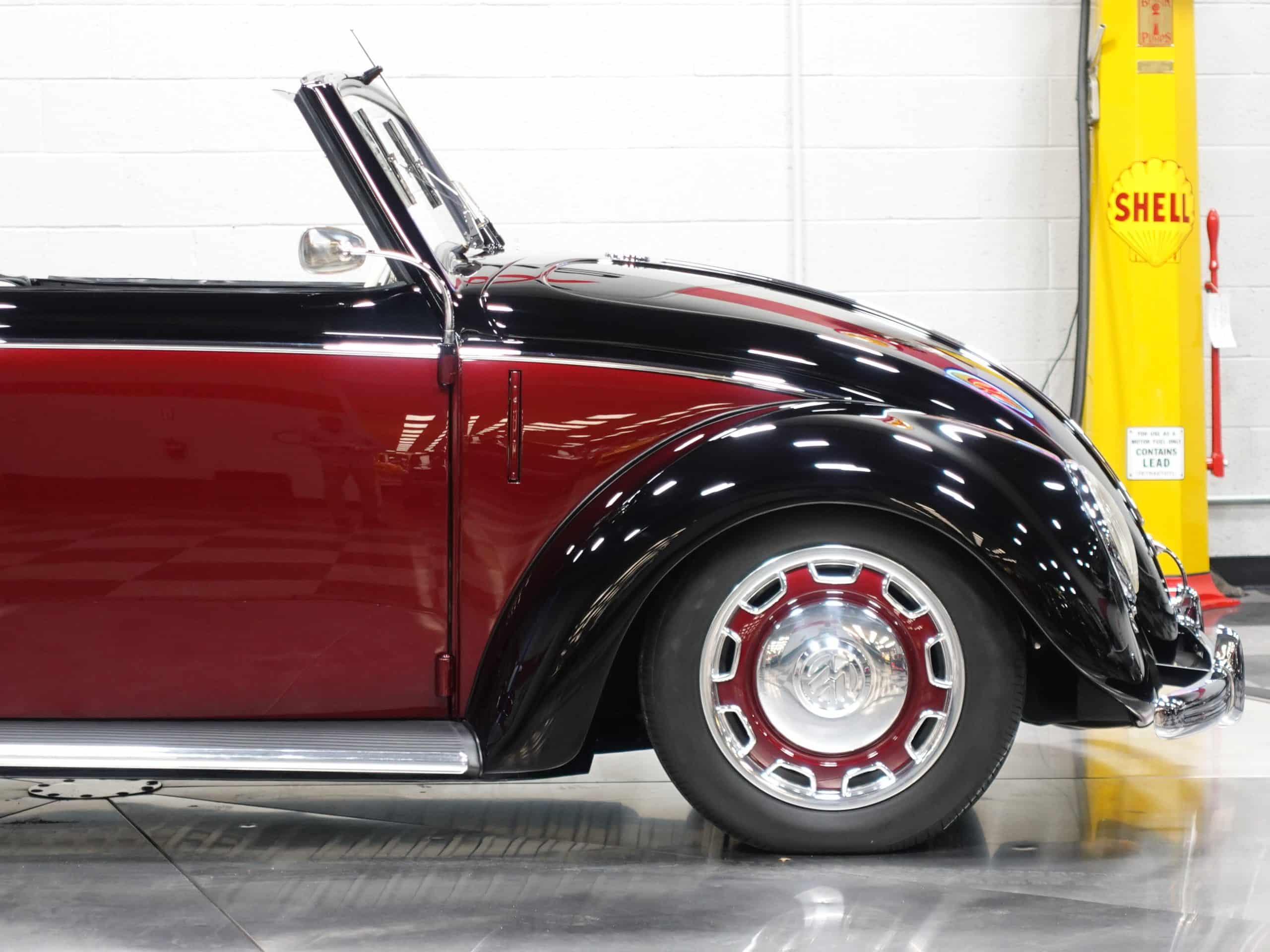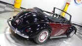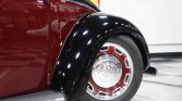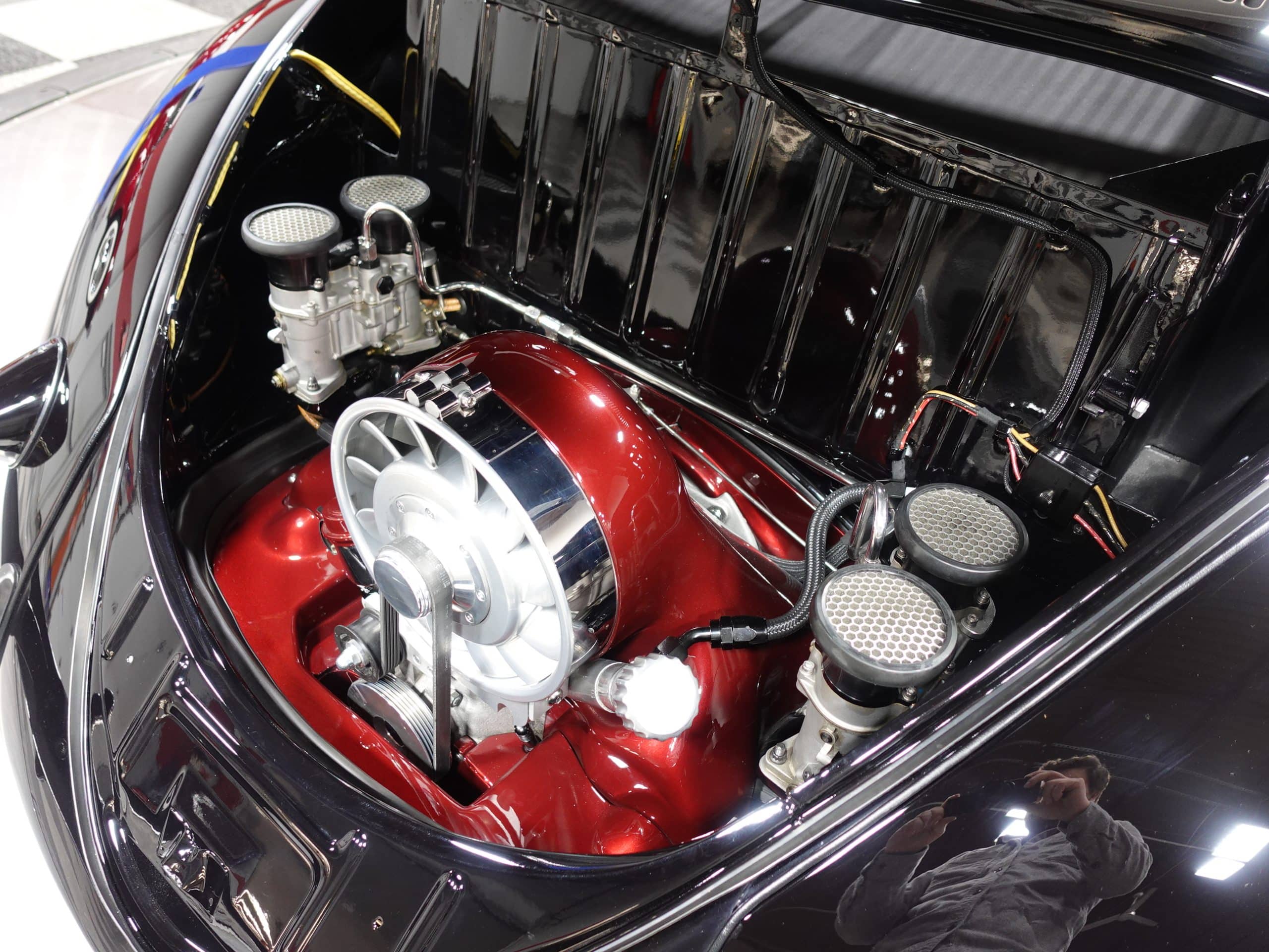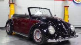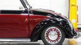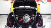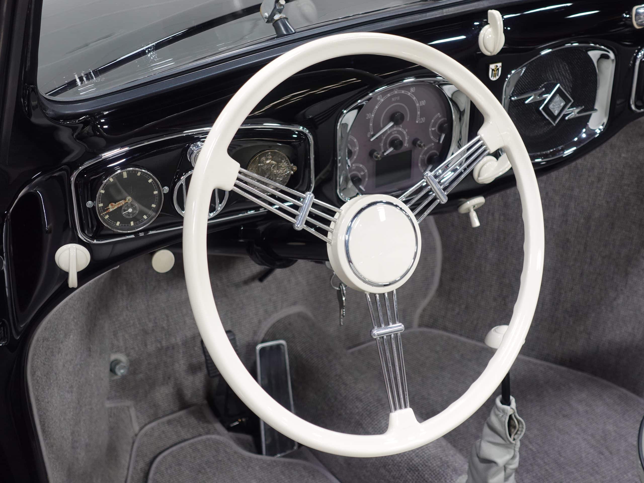 Renowned custom builder Dave Kindig and his team performed a complete body-off custom build to create a one-of-a-kind 1950 Volkswagen Hebmuller Cabriolet. Kindig, of Kindig-It Design in Utah, calls the Hebmuller the rarest and coolest Volkswagen. The team started with a complete genuine Hebmuller, a special sports version of the VW Type 1 of which fewer than 700 were produced. VW Trends Magazine says approximately 100 are believed to exist today. The Kindig team started by installing a custom VW engine generating 176 horsepower. Then the engineers went to work to install a Vanagon automatic transmission for driving ease and to handle the extra power. Other mechanical upgrades include 4-wheel disc brakes, and a fully independent coilover suspension, which gives the car a refined, lowered stance. The sheetmetal was stripped, custom metalwork performed, and custom paint applied. The two-tone paint colors are Kindig’s own mixes of Bad Blood Red and Black Hole Black. Soft leather seats in pale gray complement the gray and black interior, which is a fascinating blend of classic and modern elements from the vintage analog clock to the tidy Dakota Digital gauges. Please be sure to see the detailed photos at www.maxmotive.com.