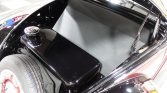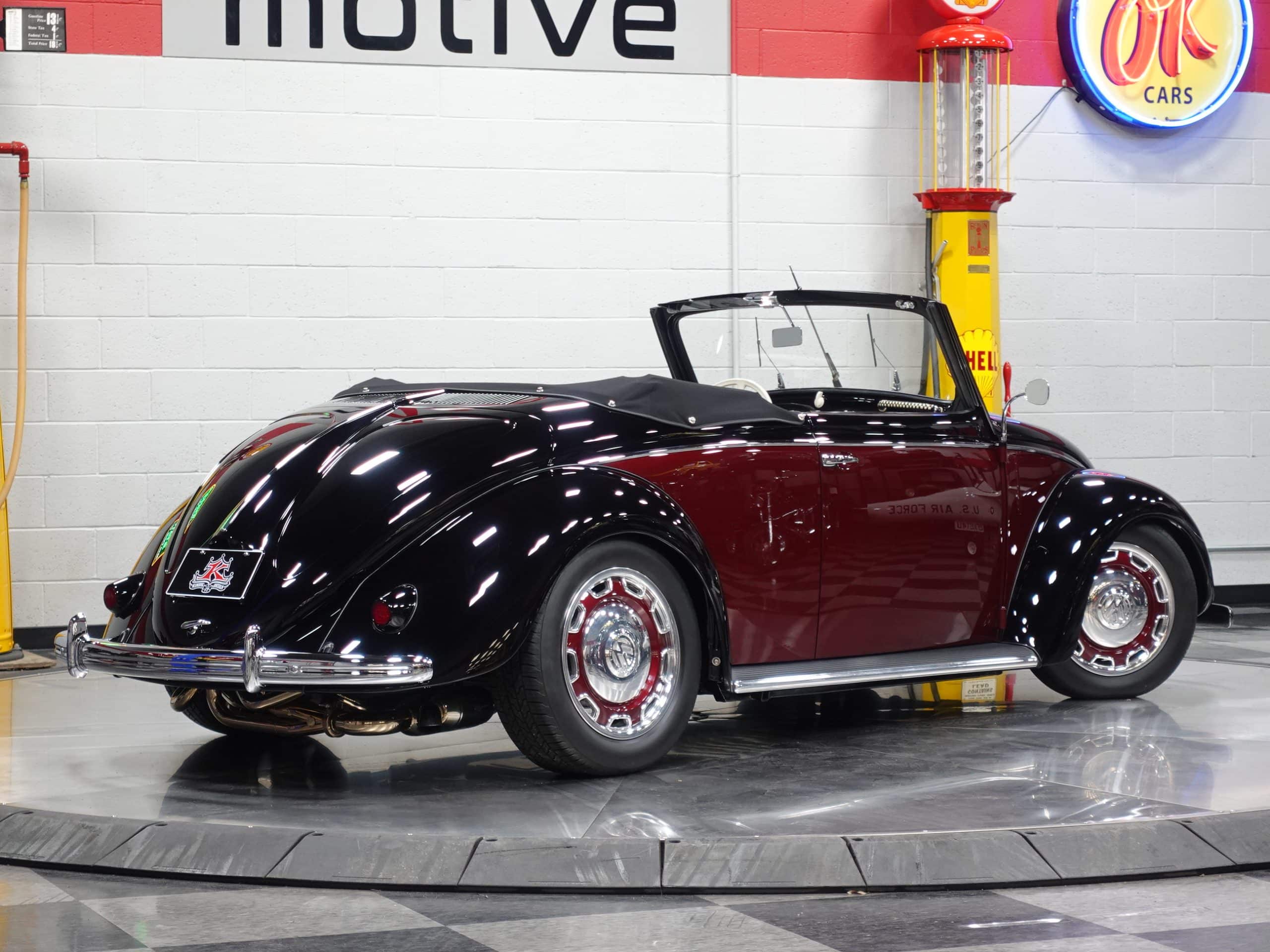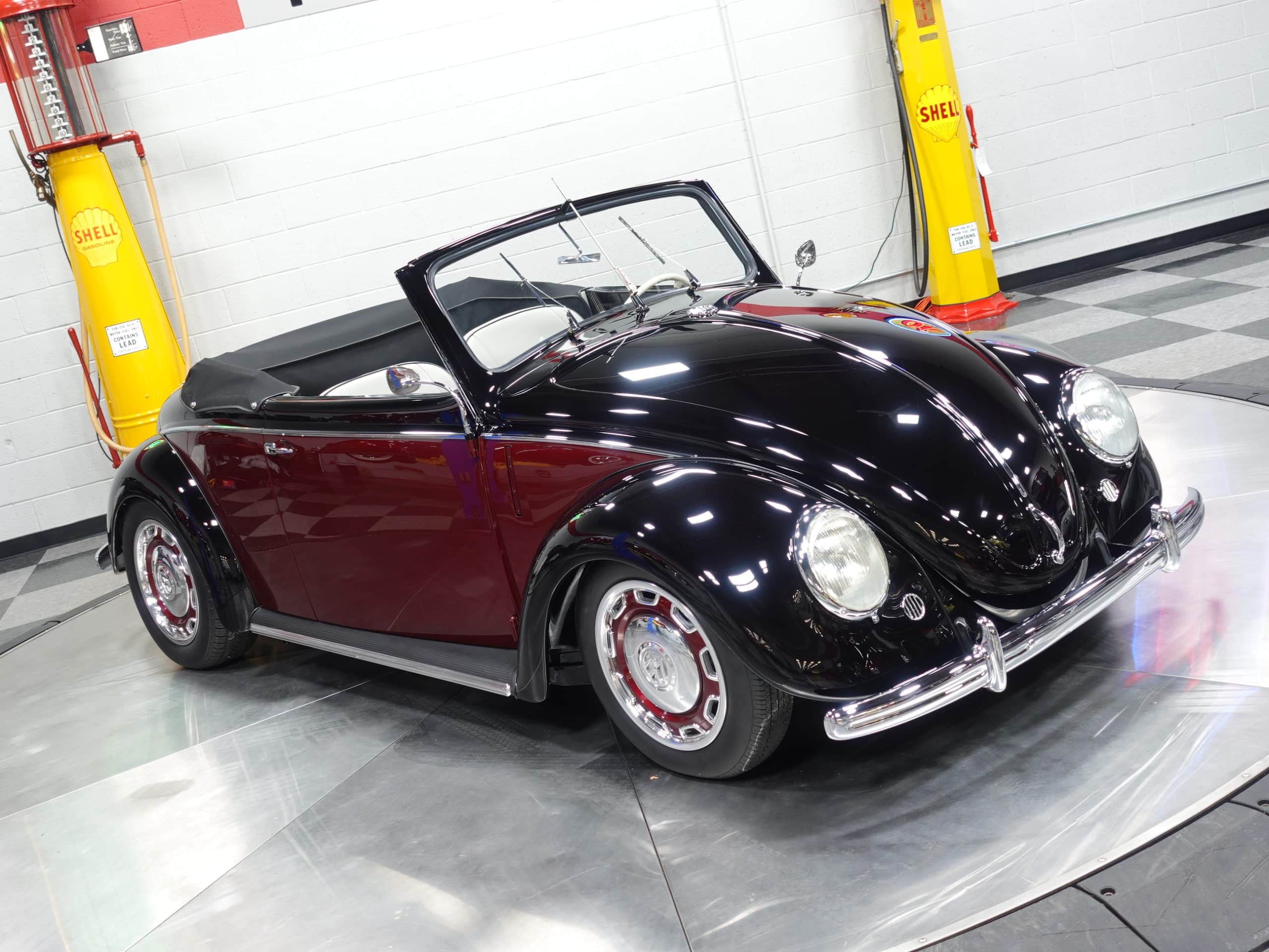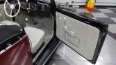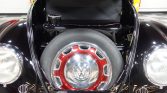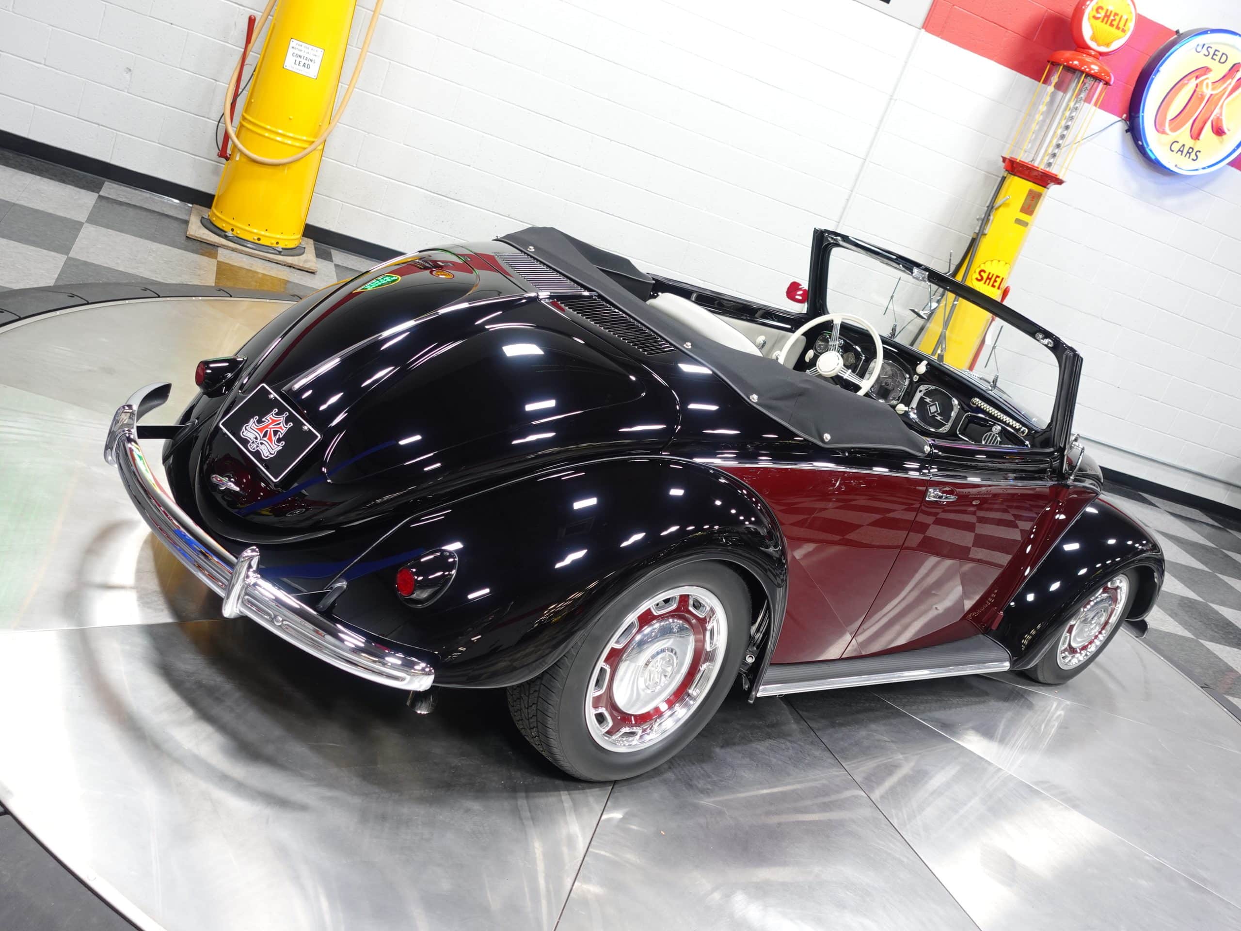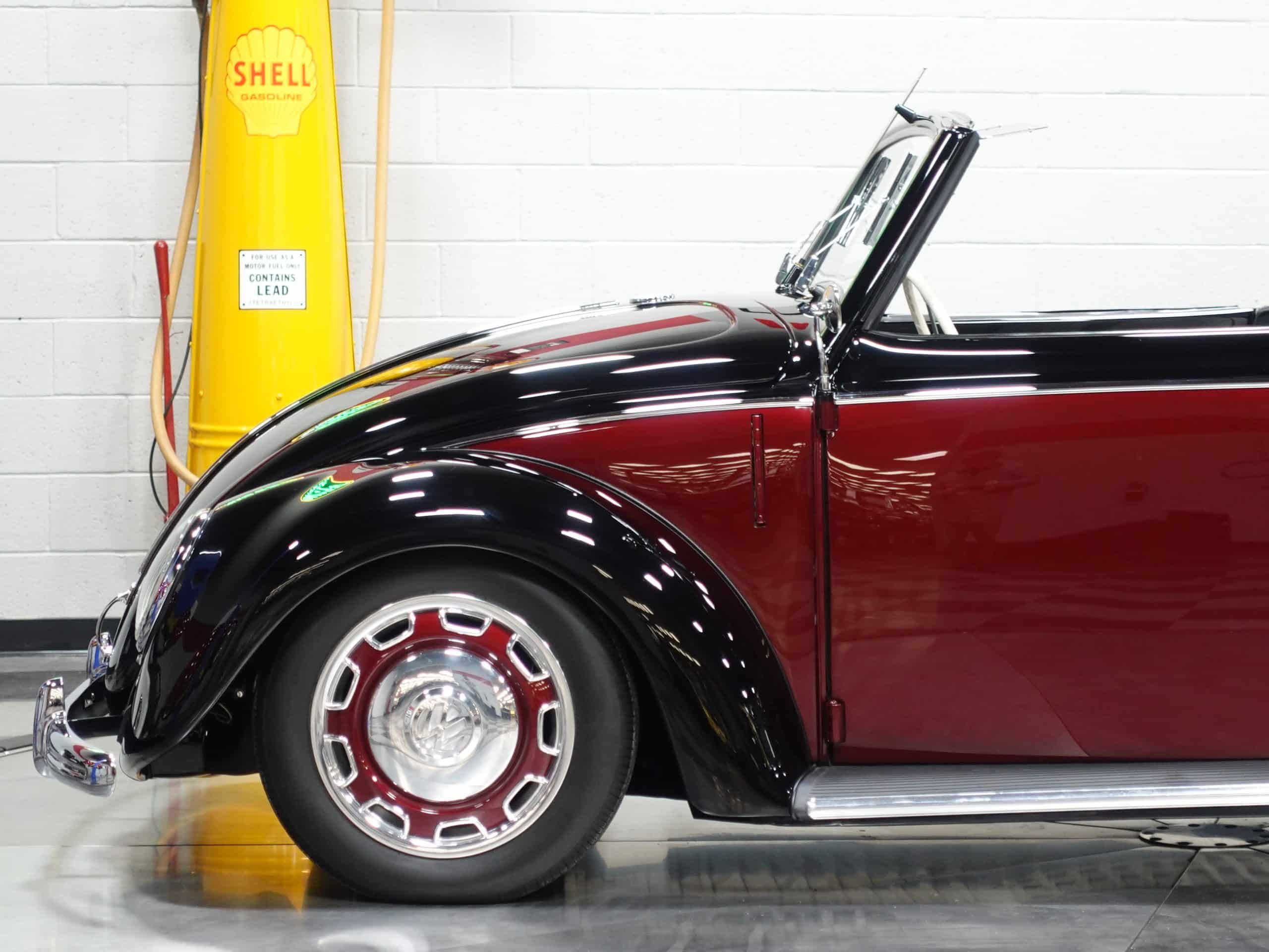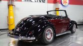 Renowned custom builder Dave Kindig and his team performed a complete body-off custom build to create a one-of-a-kind 1950 Volkswagen Hebmuller Cabriolet. Kindig, of Kindig-It Design in Utah, calls the Hebmuller the rarest and coolest Volkswagen. The team started with a complete genuine Hebmuller, a special sports version of the VW Type 1 of which fewer than 700 were produced. VW Trends Magazine says approximately 100 are believed to exist today. The Kindig team started by installing a custom VW engine generating 176 horsepower. Then the engineers went to work to install a Vanagon automatic transmission for driving ease and to handle the extra power. Other mechanical upgrades include 4-wheel disc brakes, and a fully independent coilover suspension, which gives the car a refined, lowered stance. The sheetmetal was stripped, custom metalwork performed, and custom paint applied. The two-tone paint colors are Kindig’s own mixes of Bad Blood Red and Black Hole Black. Soft leather seats in pale gray complement the gray and black interior, which is a fascinating blend of classic and modern elements from the vintage analog clock to the tidy Dakota Digital gauges. Please be sure to see the detailed photos at www.maxmotive.com.