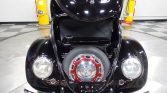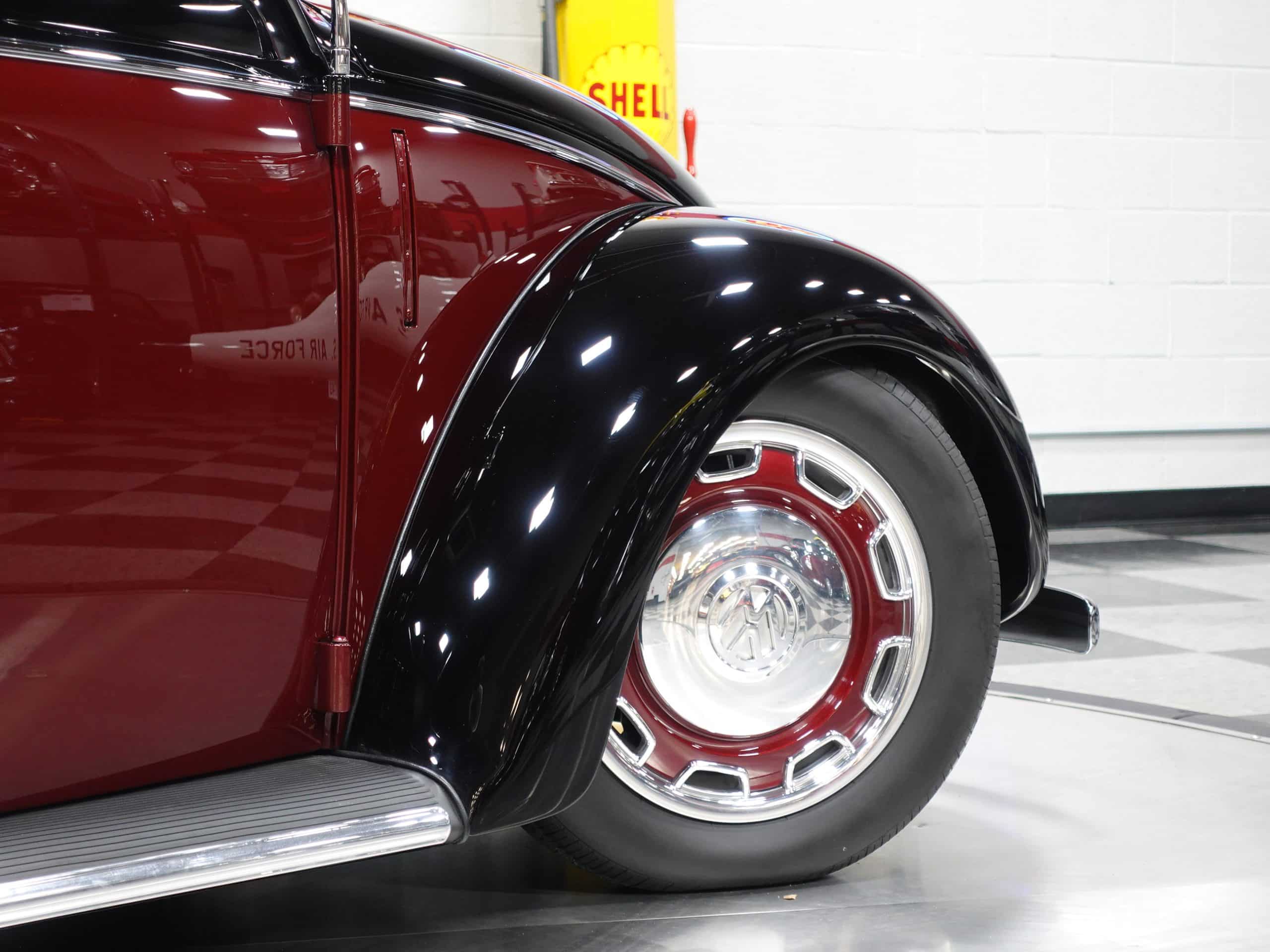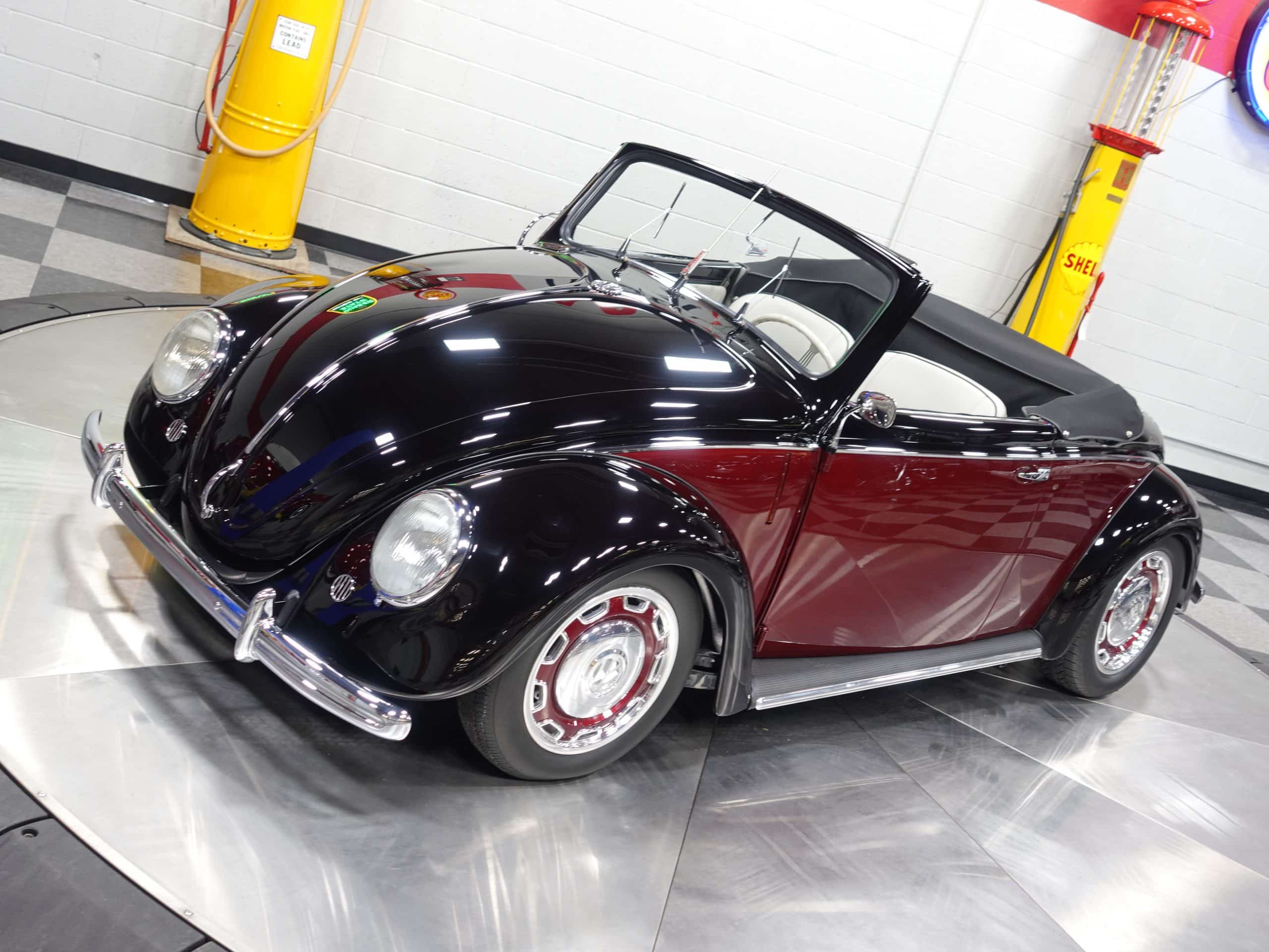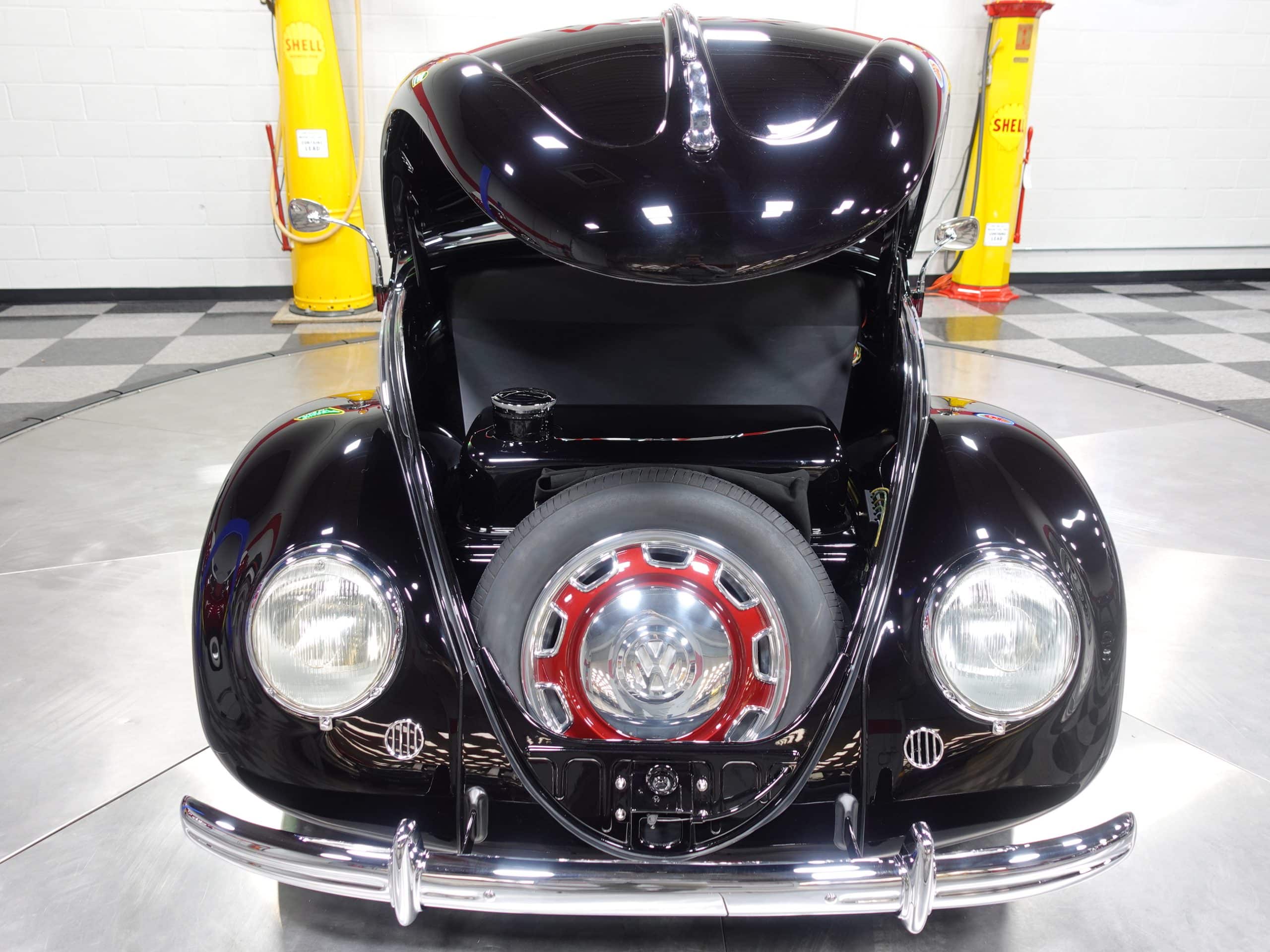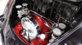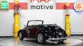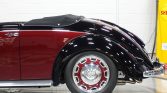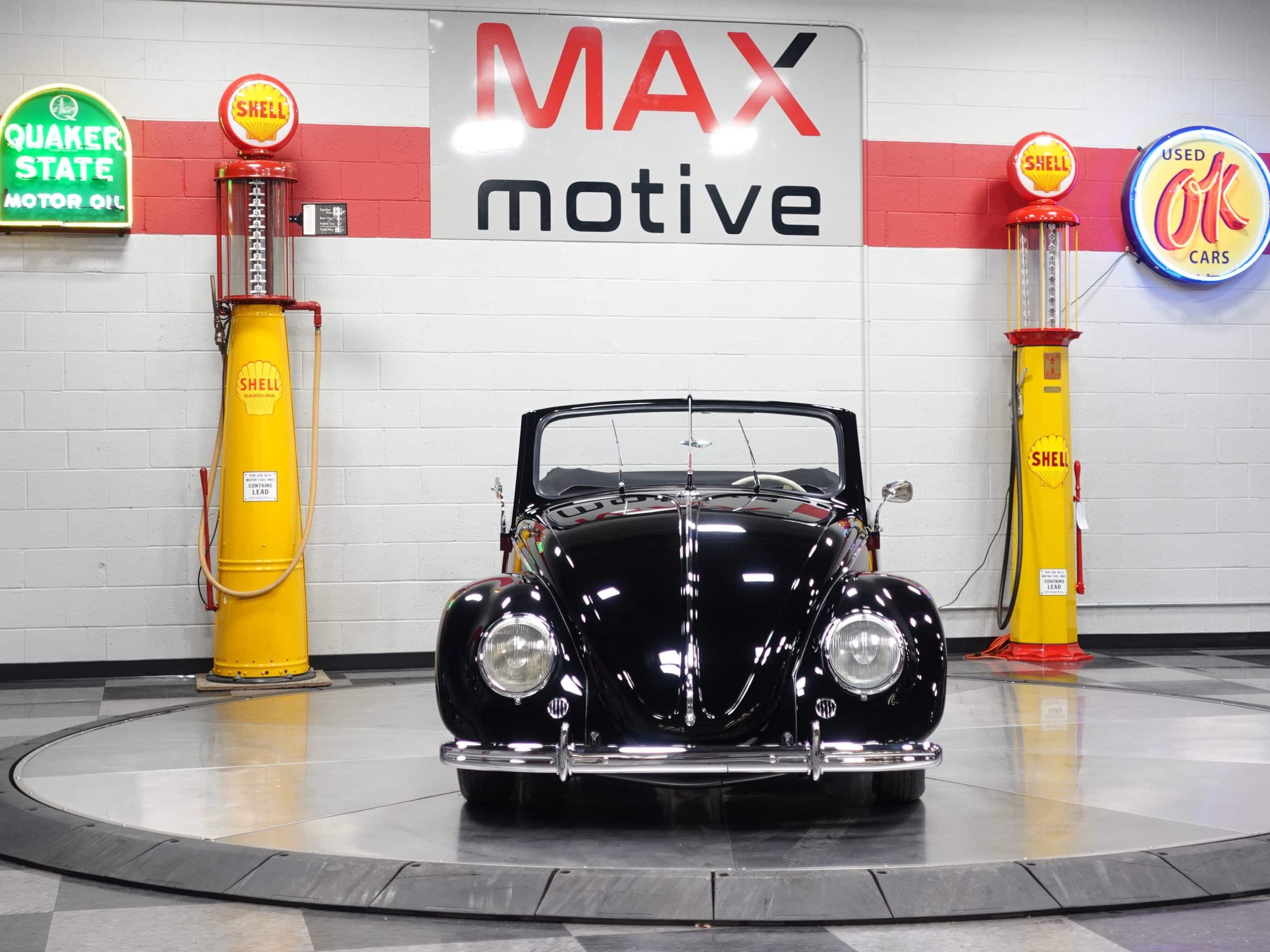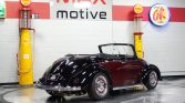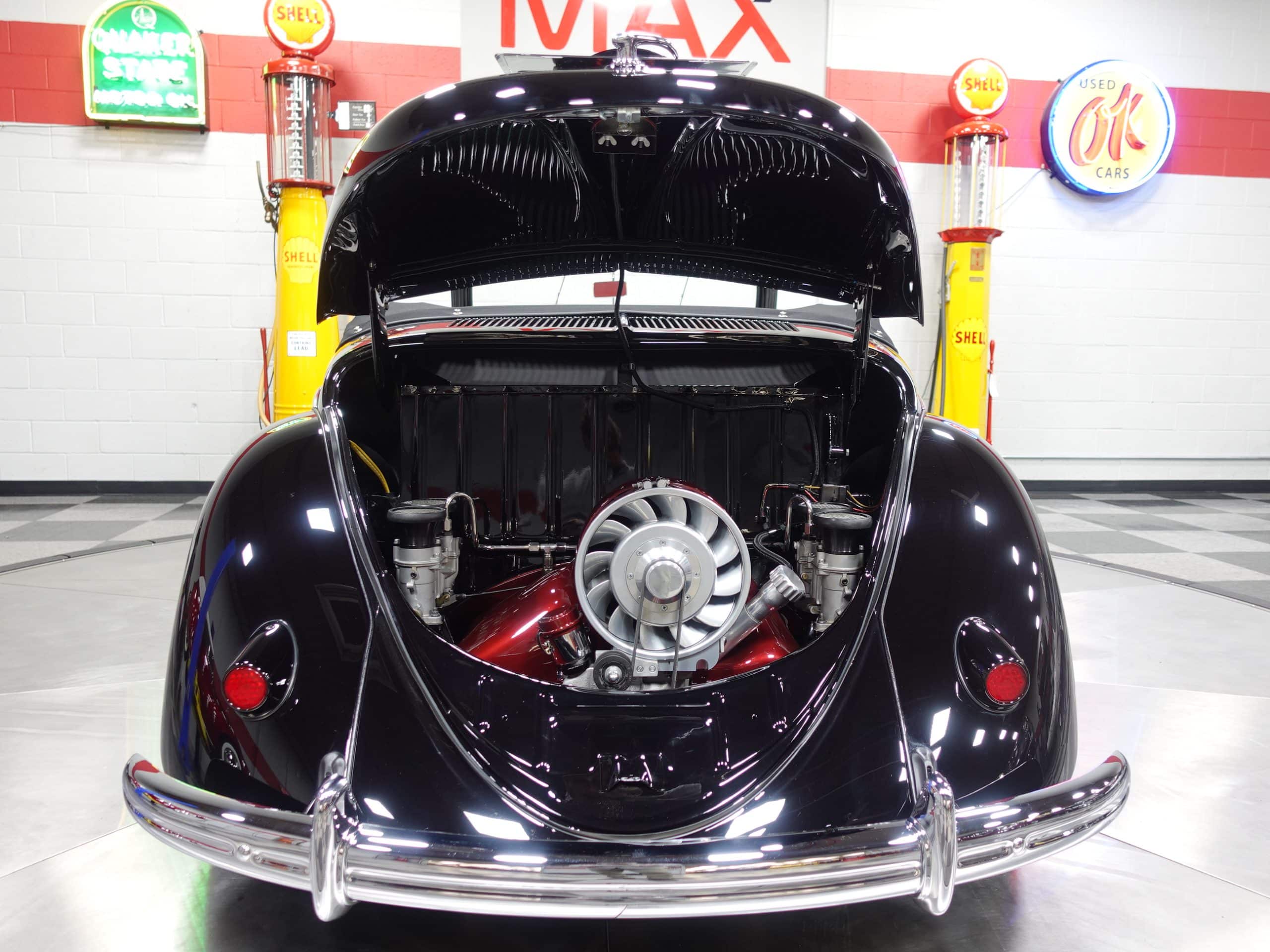 Renowned custom builder Dave Kindig and his team performed a complete body-off custom build to create a one-of-a-kind 1950 Volkswagen Hebmuller Cabriolet. Kindig, of Kindig-It Design in Utah, calls the Hebmuller the rarest and coolest Volkswagen. The team started with a complete genuine Hebmuller, a special sports version of the VW Type 1 of which fewer than 700 were produced. VW Trends Magazine says approximately 100 are believed to exist today. The Kindig team started by installing a custom VW engine generating 176 horsepower. Then the engineers went to work to install a Vanagon automatic transmission for driving ease and to handle the extra power. Other mechanical upgrades include 4-wheel disc brakes, and a fully independent coilover suspension, which gives the car a refined, lowered stance. The sheetmetal was stripped, custom metalwork performed, and custom paint applied. The two-tone paint colors are Kindig’s own mixes of Bad Blood Red and Black Hole Black. Soft leather seats in pale gray complement the gray and black interior, which is a fascinating blend of classic and modern elements from the vintage analog clock to the tidy Dakota Digital gauges. Please be sure to see the detailed photos at www.maxmotive.com.