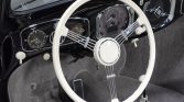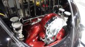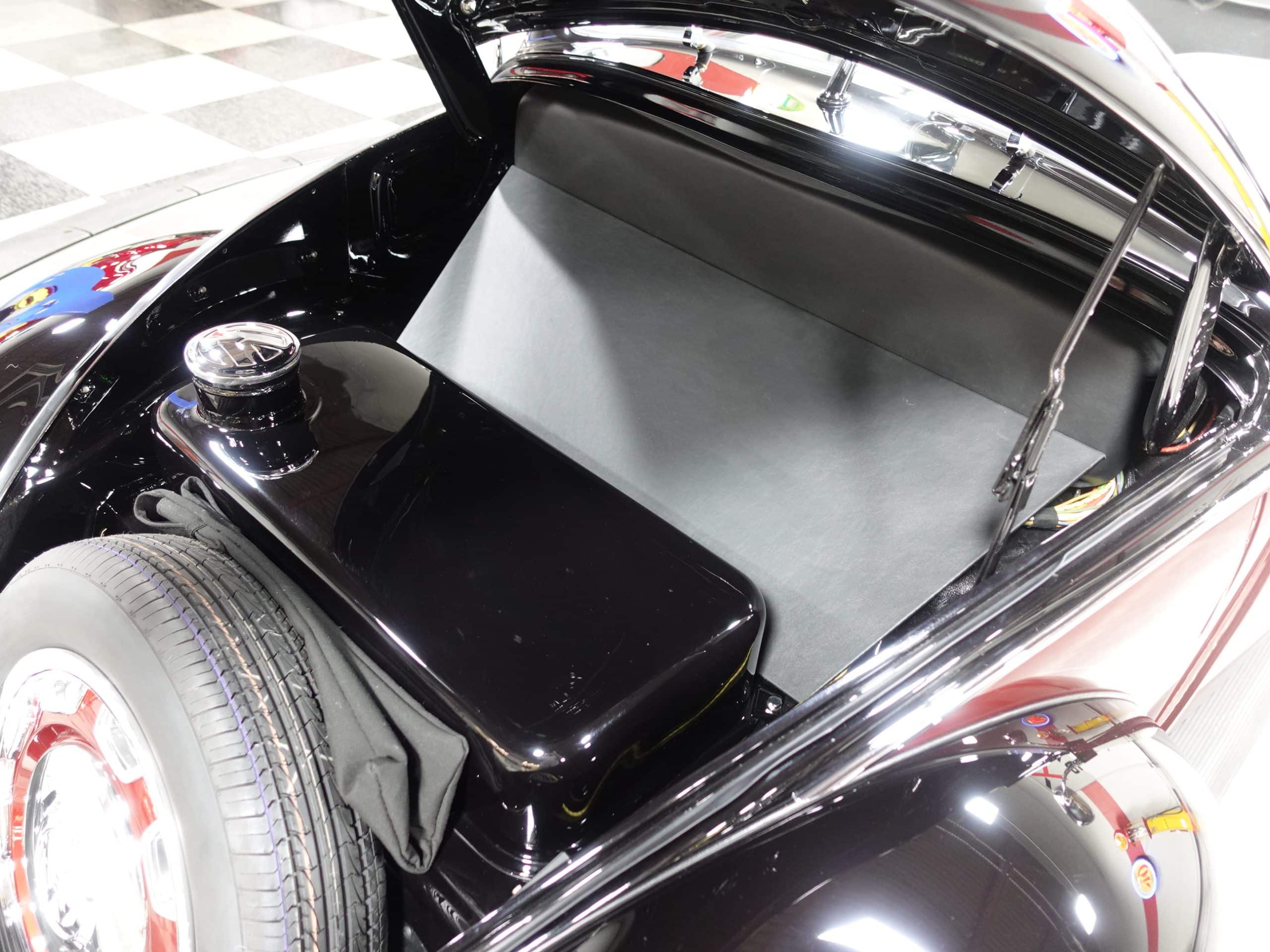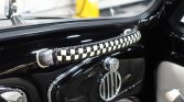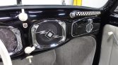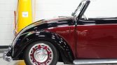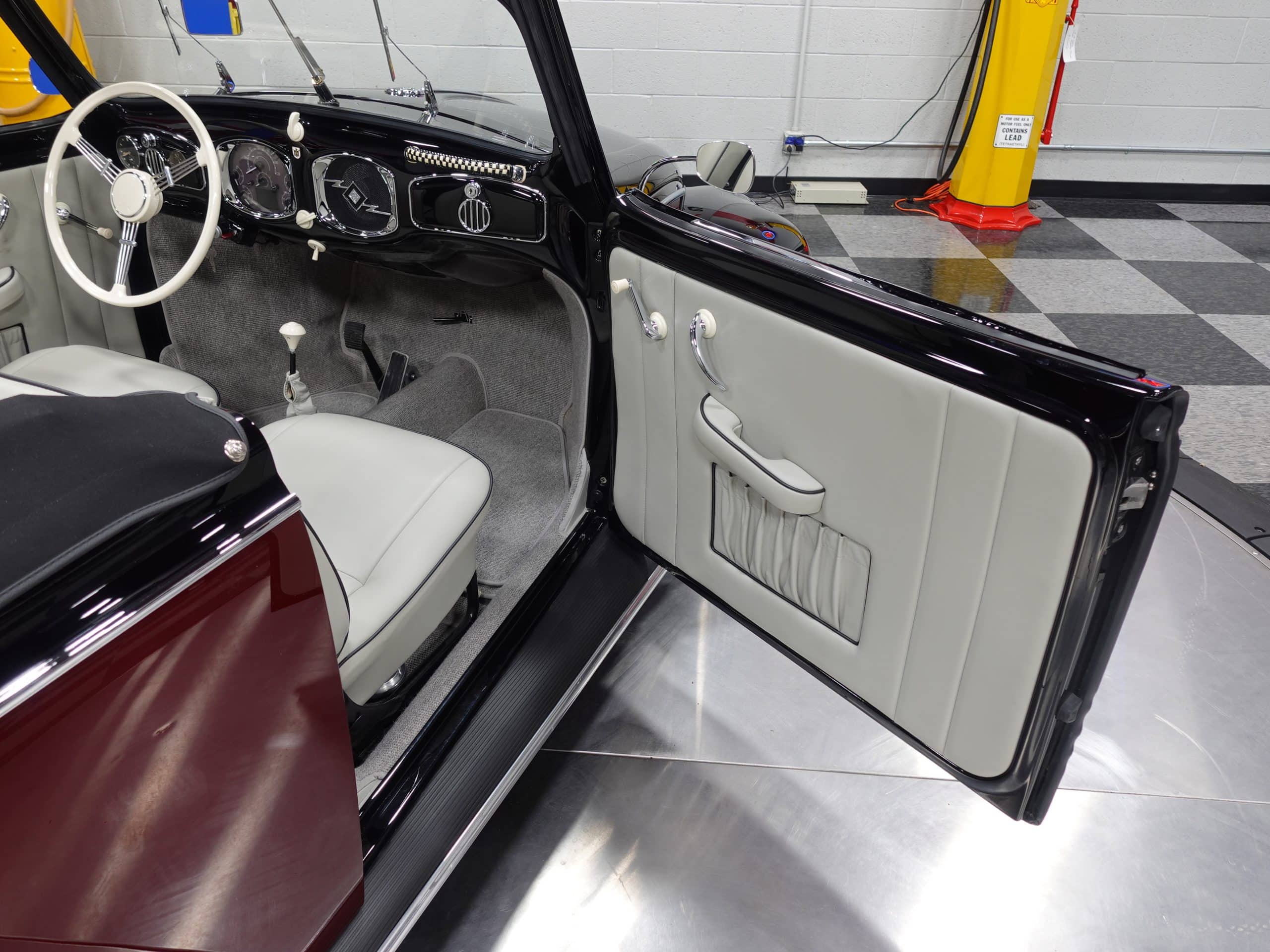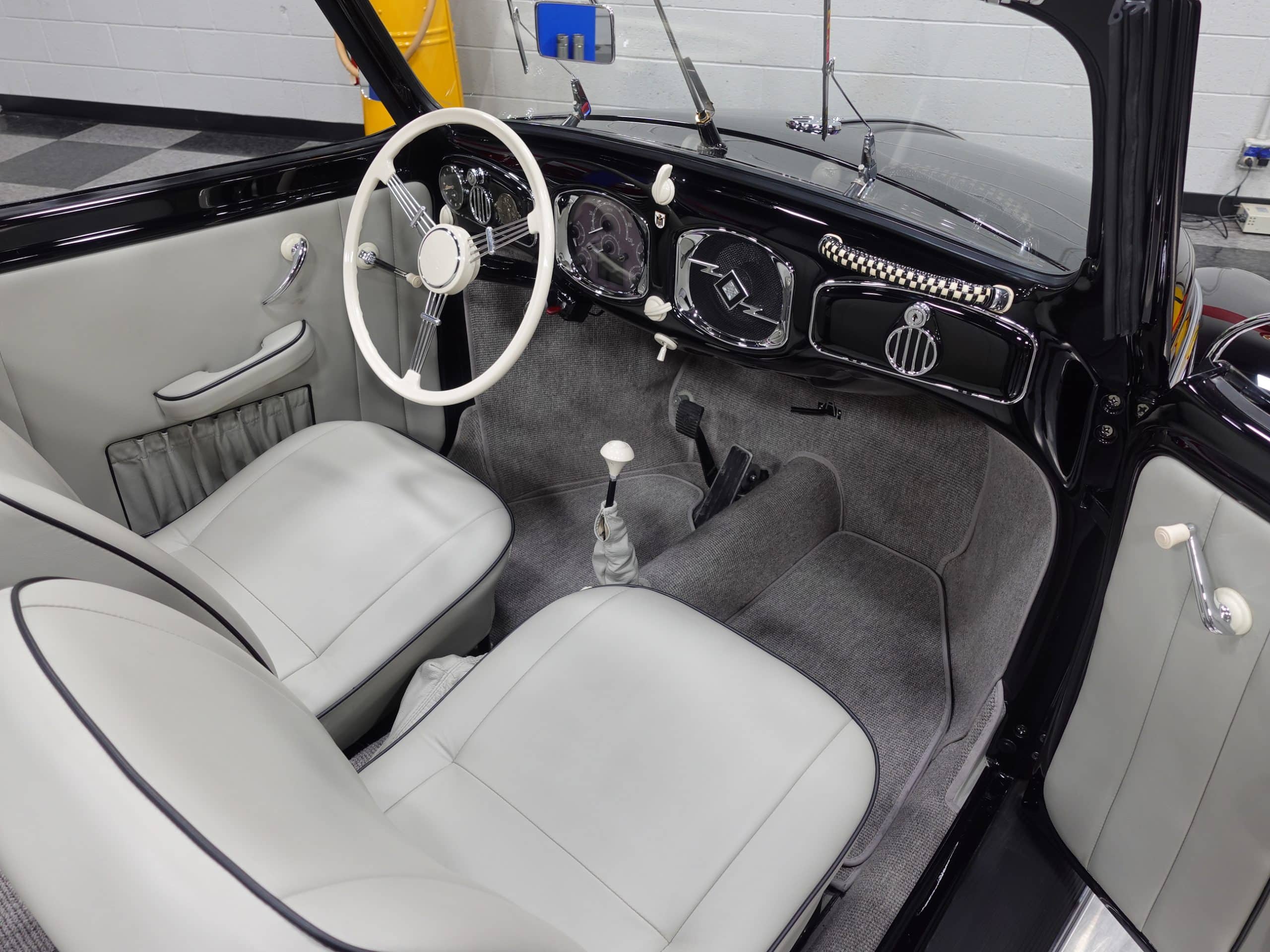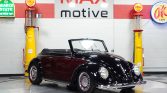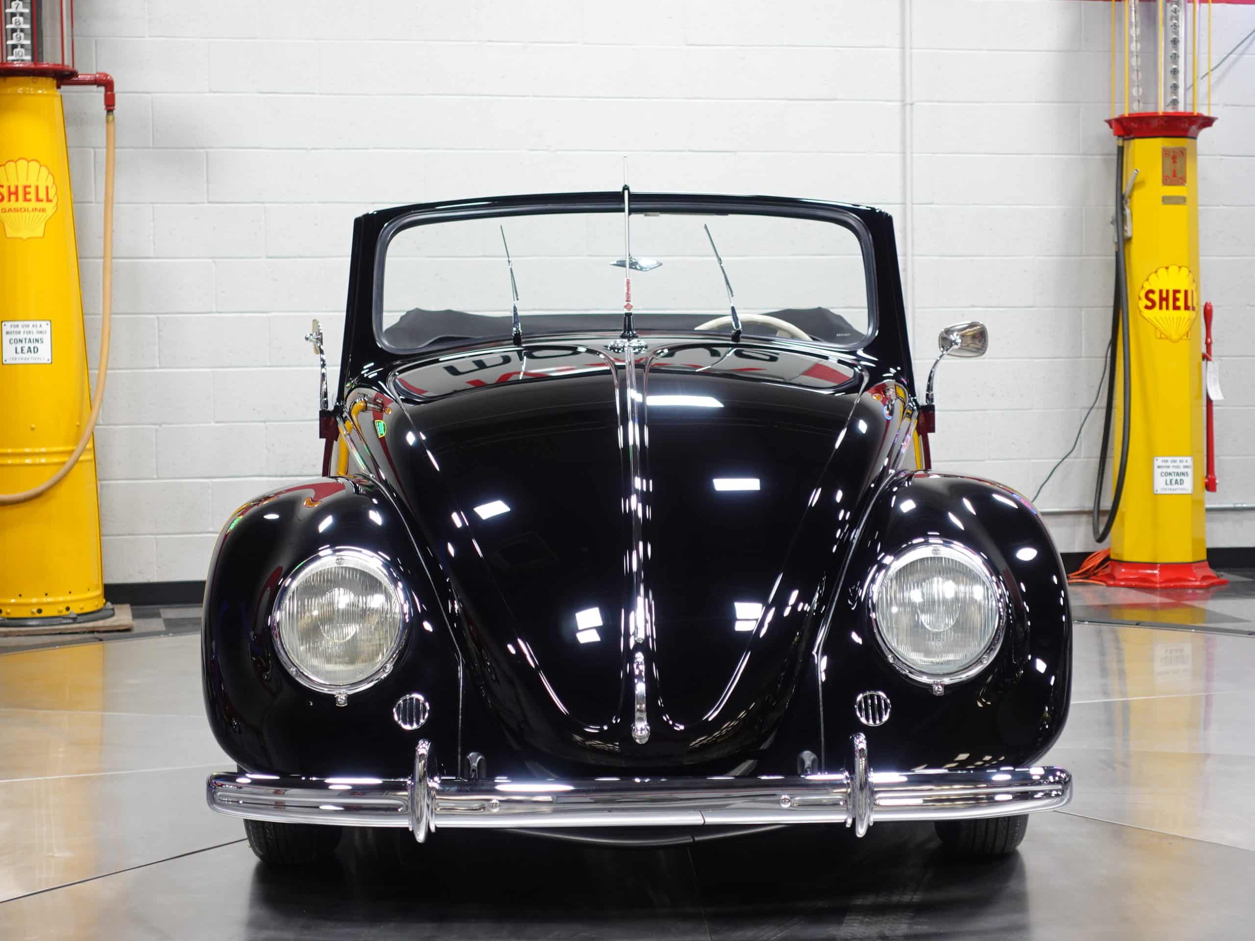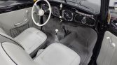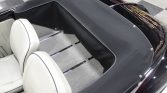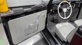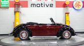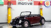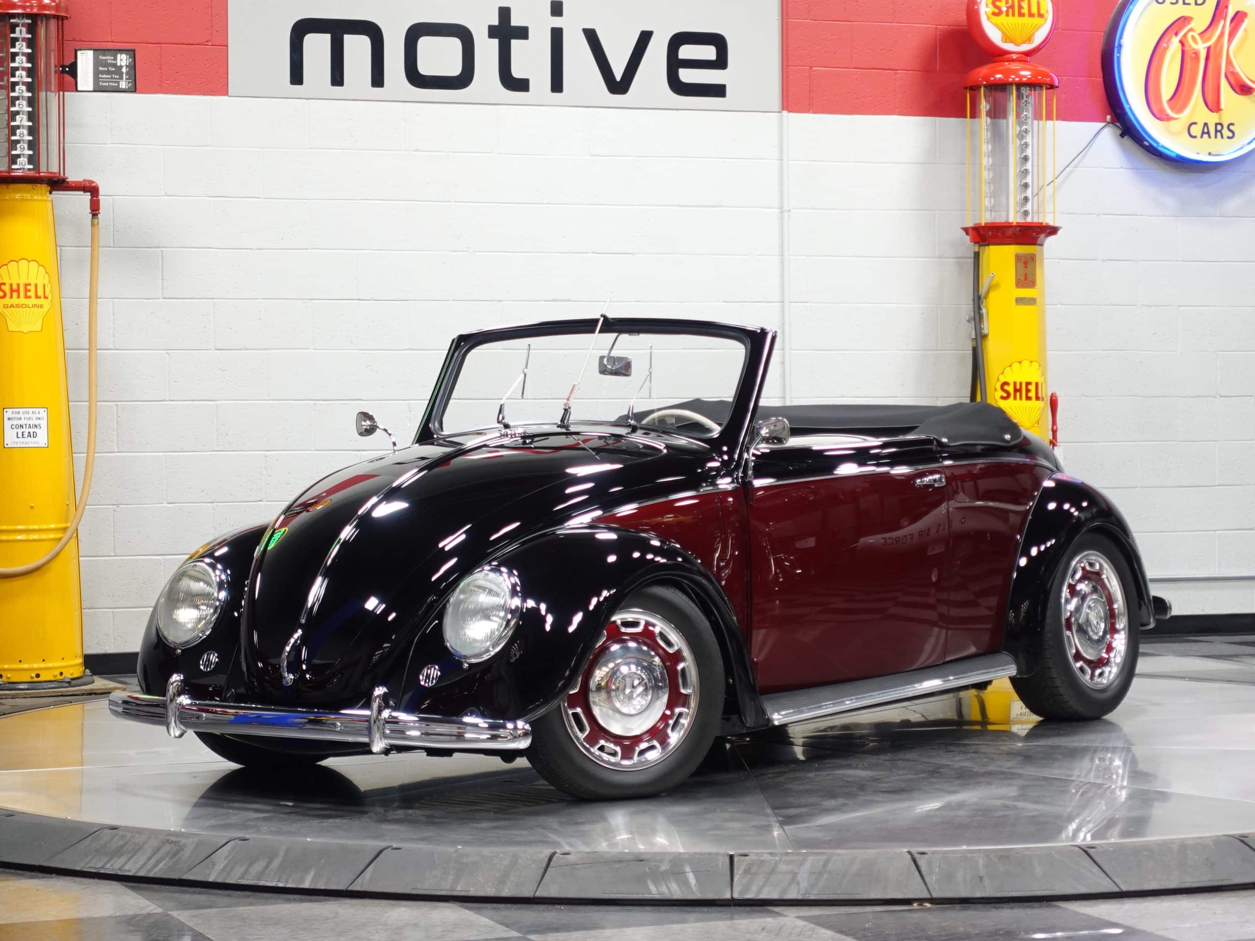 Renowned custom builder Dave Kindig and his team performed a complete body-off custom build to create a one-of-a-kind 1950 Volkswagen Hebmuller Cabriolet. Kindig, of Kindig-It Design in Utah, calls the Hebmuller the rarest and coolest Volkswagen. The team started with a complete genuine Hebmuller, a special sports version of the VW Type 1 of which fewer than 700 were produced. VW Trends Magazine says approximately 100 are believed to exist today. The Kindig team started by installing a custom VW engine generating 176 horsepower. Then the engineers went to work to install a Vanagon automatic transmission for driving ease and to handle the extra power. Other mechanical upgrades include 4-wheel disc brakes, and a fully independent coilover suspension, which gives the car a refined, lowered stance. The sheetmetal was stripped, custom metalwork performed, and custom paint applied. The two-tone paint colors are Kindig’s own mixes of Bad Blood Red and Black Hole Black. Soft leather seats in pale gray complement the gray and black interior, which is a fascinating blend of classic and modern elements from the vintage analog clock to the tidy Dakota Digital gauges. Please be sure to see the detailed photos at www.maxmotive.com.