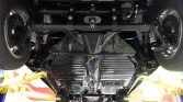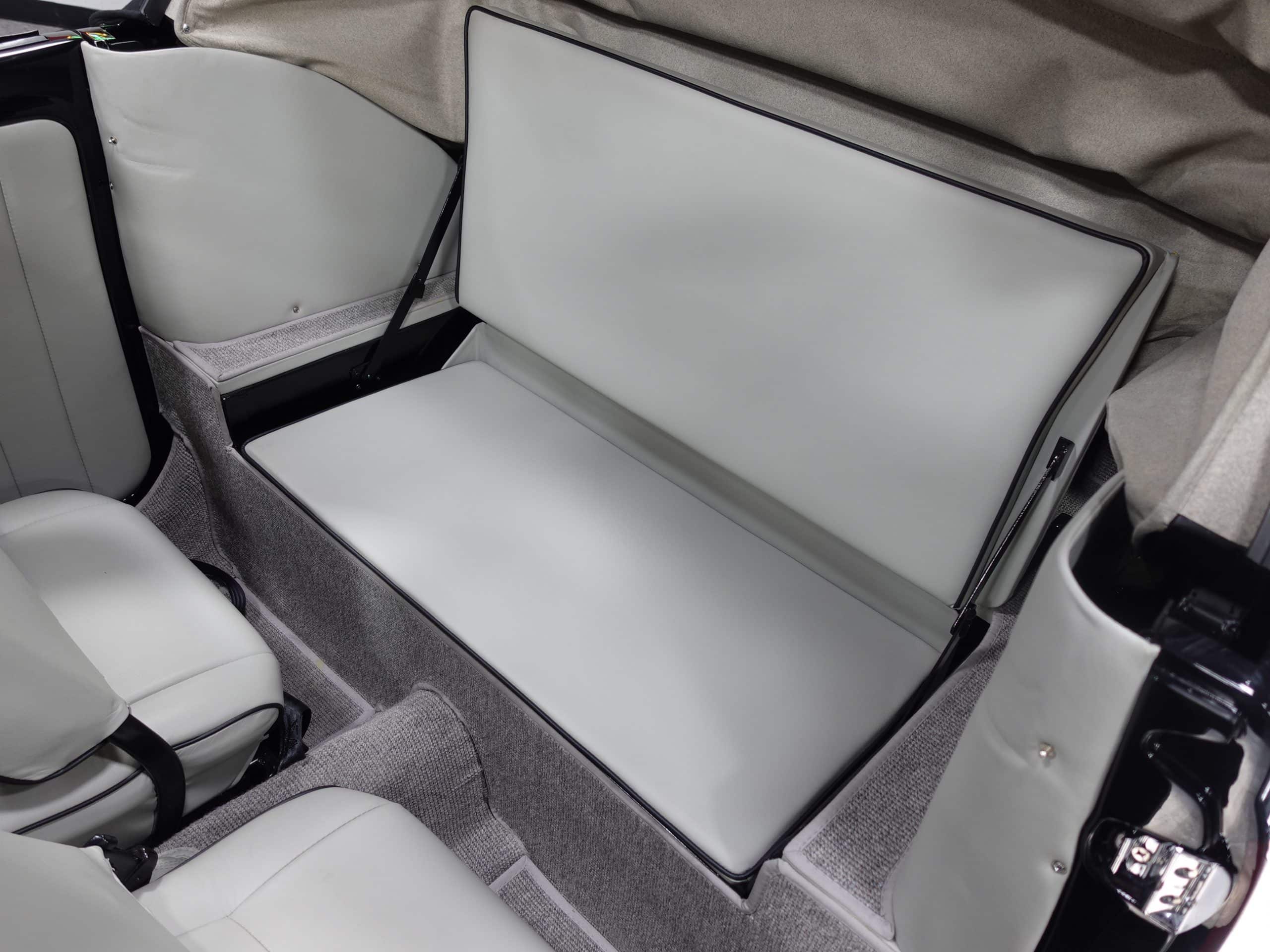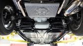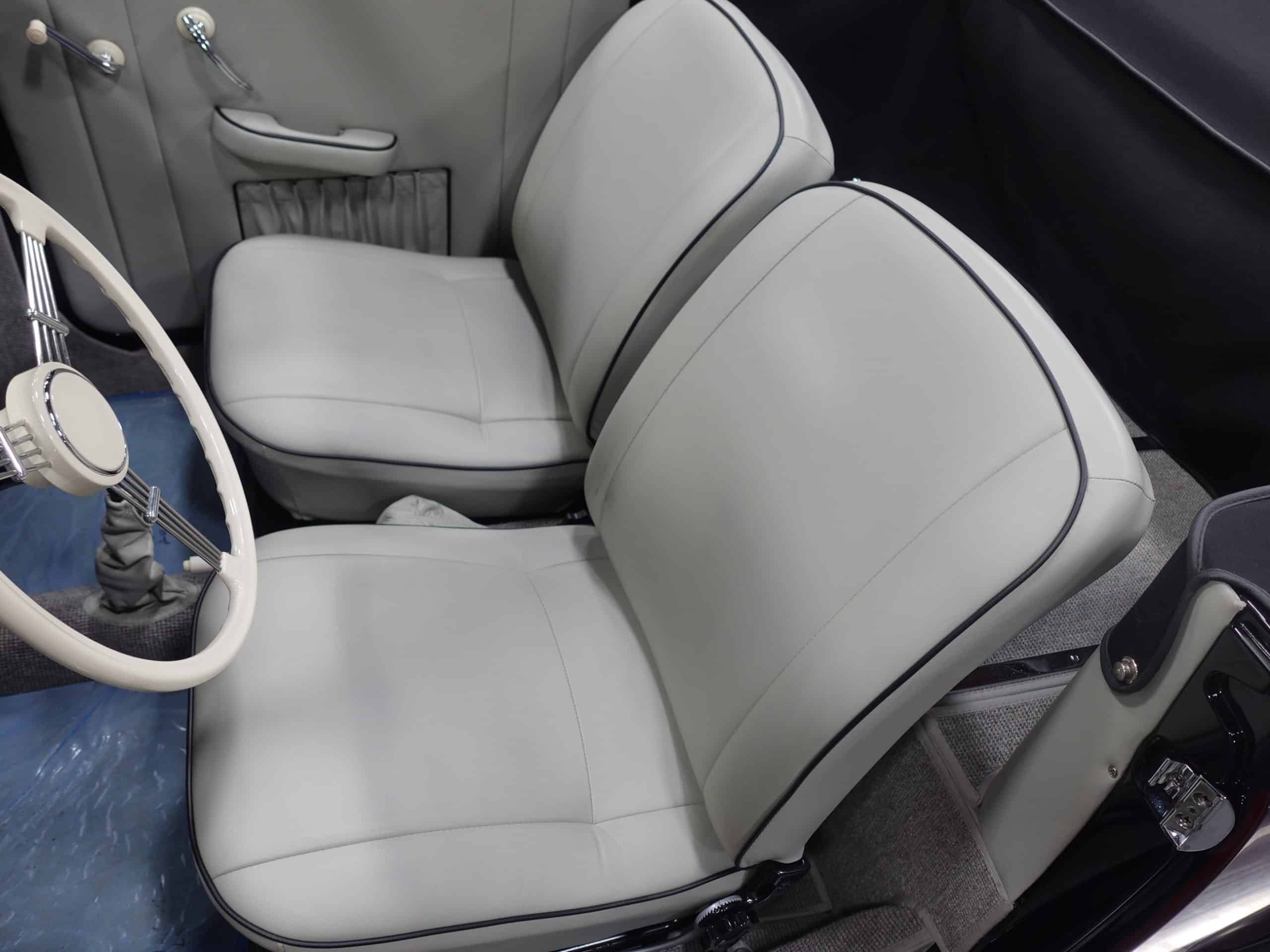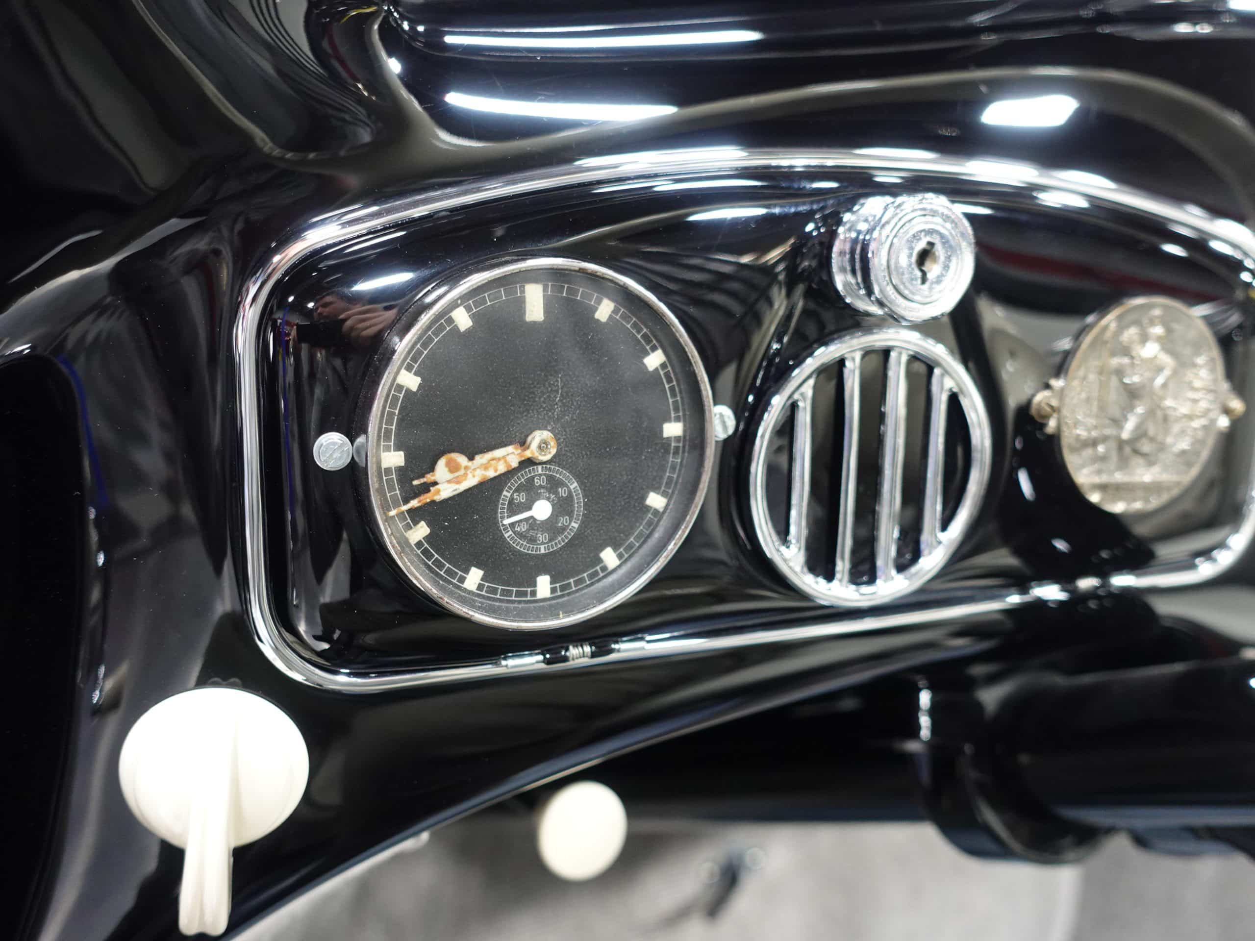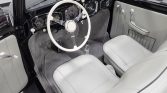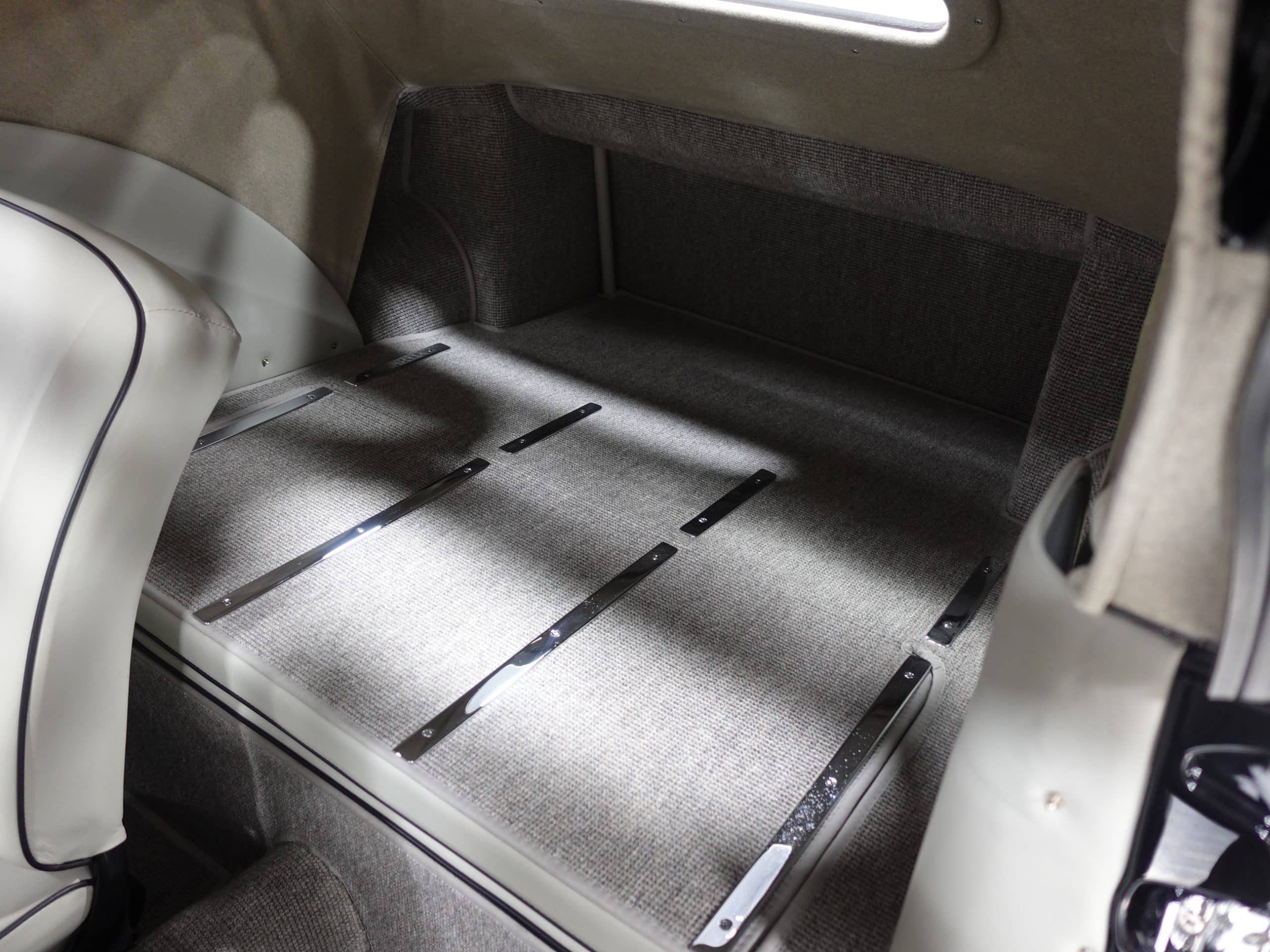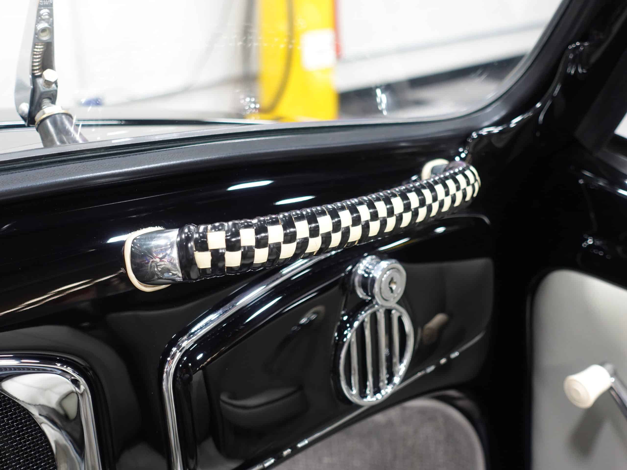 Renowned custom builder Dave Kindig and his team performed a complete body-off custom build to create a one-of-a-kind 1950 Volkswagen Hebmuller Cabriolet. Kindig, of Kindig-It Design in Utah, calls the Hebmuller the rarest and coolest Volkswagen. The team started with a complete genuine Hebmuller, a special sports version of the VW Type 1 of which fewer than 700 were produced. VW Trends Magazine says approximately 100 are believed to exist today. The Kindig team started by installing a custom VW engine generating 176 horsepower. Then the engineers went to work to install a Vanagon automatic transmission for driving ease and to handle the extra power. Other mechanical upgrades include 4-wheel disc brakes, and a fully independent coilover suspension, which gives the car a refined, lowered stance. The sheetmetal was stripped, custom metalwork performed, and custom paint applied. The two-tone paint colors are Kindig’s own mixes of Bad Blood Red and Black Hole Black. Soft leather seats in pale gray complement the gray and black interior, which is a fascinating blend of classic and modern elements from the vintage analog clock to the tidy Dakota Digital gauges. Please be sure to see the detailed photos at www.maxmotive.com.