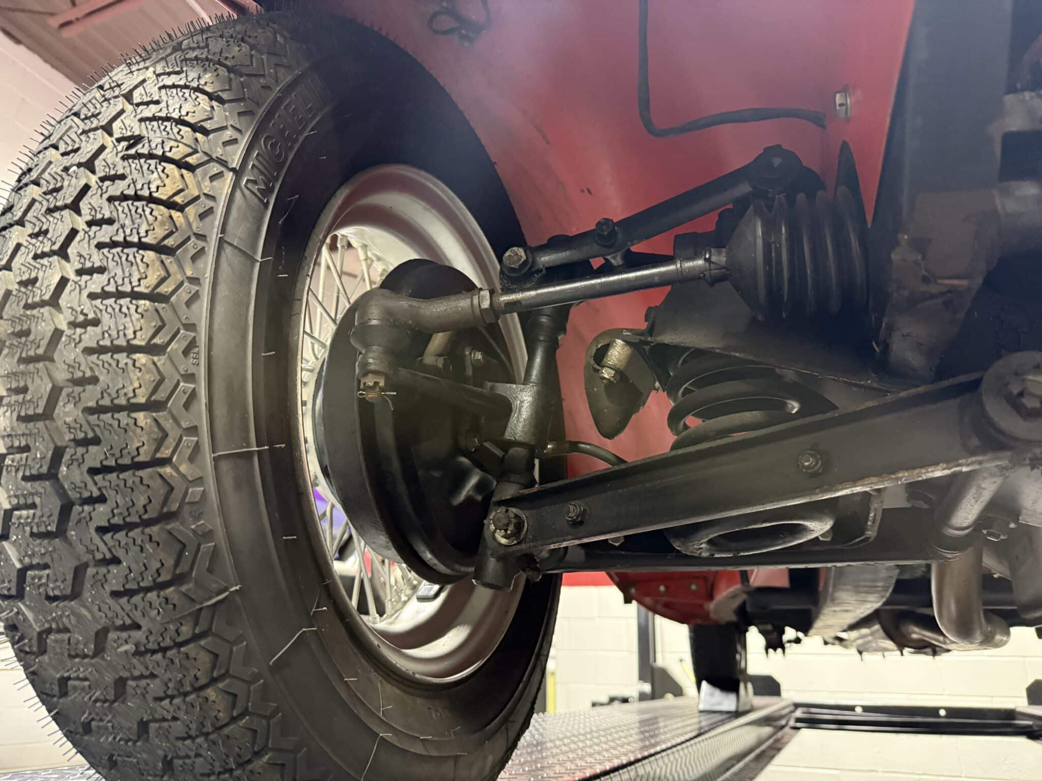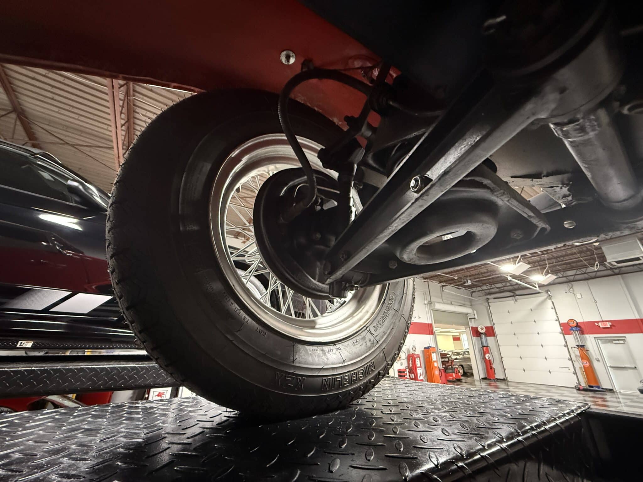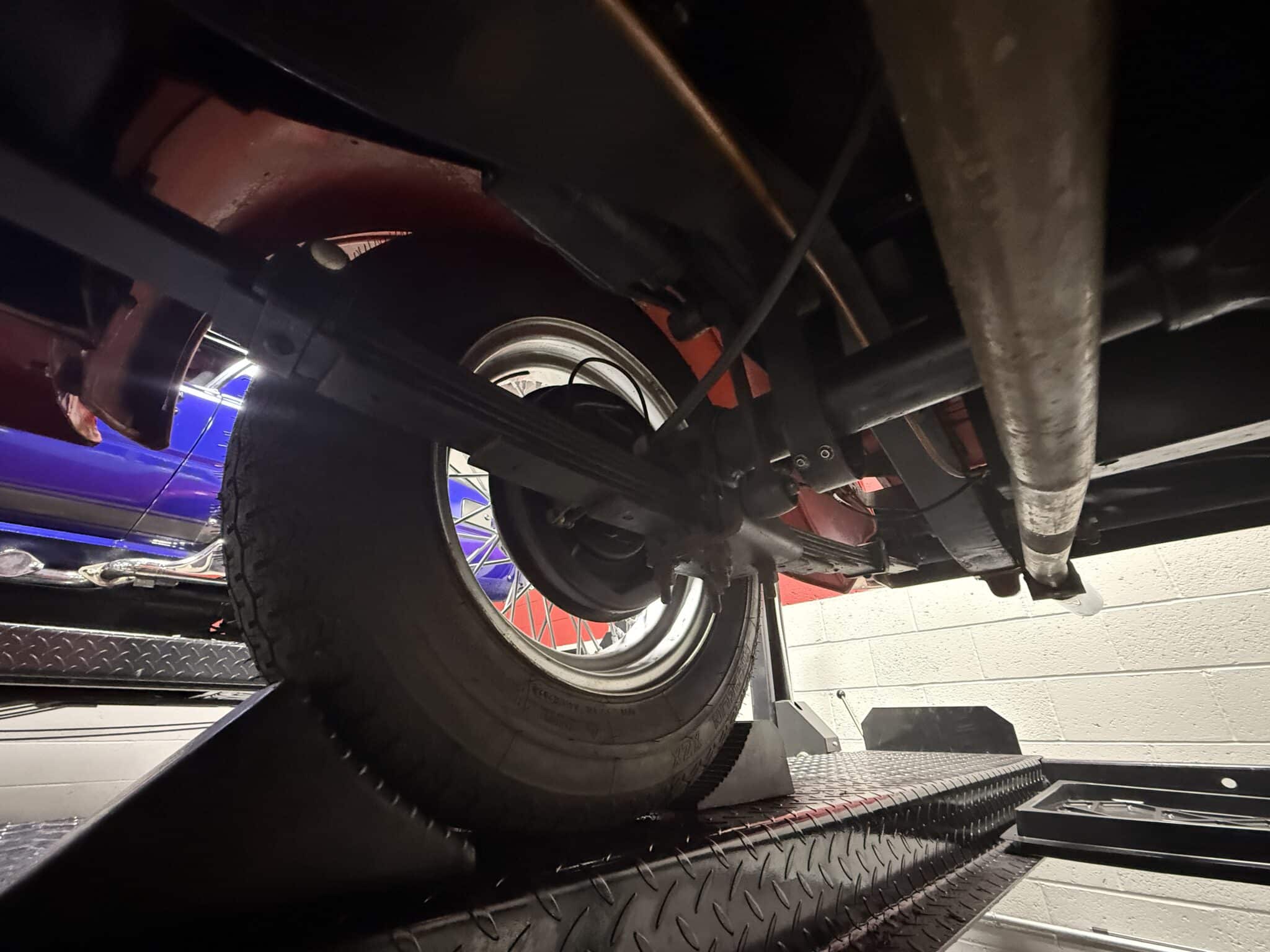 • 15-inch wire wheels with chrome hubcaps and period-style tires