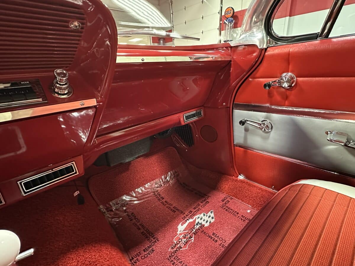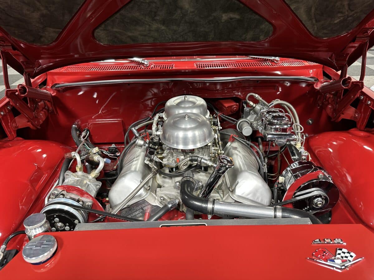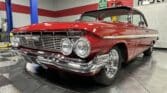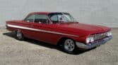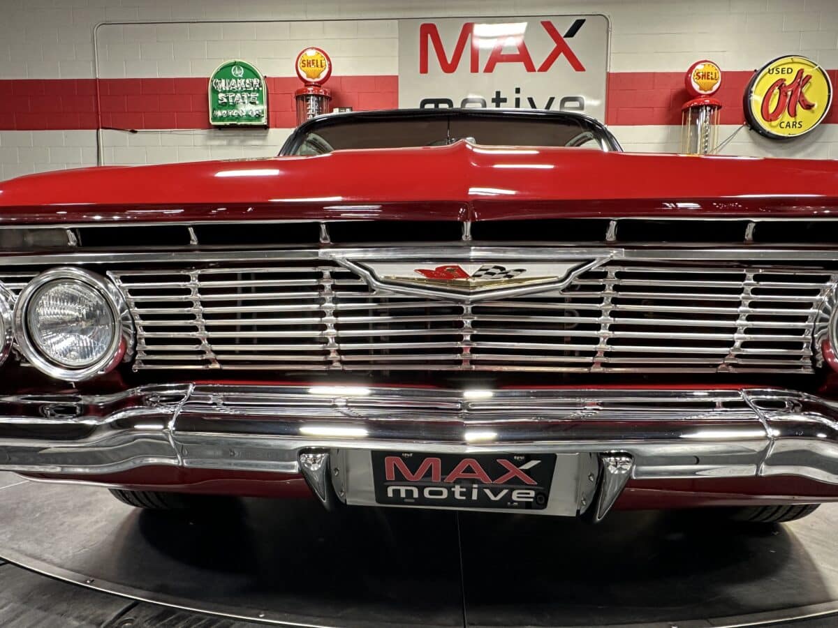 MaxMotive is pleased to present this beautifully turned out 1961 Chevrolet Impala 2dr Sport Coupe aka Bubble Top. The project began with a clean North Carolina car. It was completed in 2020 and driven 2952 miles since. The beautiful paint is Montero Red base with five coats of clear. Under the hood is a .030 over, balanced and blueprinted 409 by Bill Kell Racing Engines in Chester WV. It’s loaded with Ross 10:1 forged pistons and an Isky solid cam. On top are two Edelbrock carbs and Edelbrock aluminum heads. They feed into Doug’s Ceramic-coated headers and a 2.5-inch dual exhaust system. The 409 sends its ample power through a 700R4 automatic transmission with a 2400 stall converter to a new US Gear posi rear with 3.70 gears. Tubular A-arms and a HD front sway bar update the handling nicely along with new rear springs, power steering, and power front disc brakes with hydro boost master. It rides on Cragar Street Star chrome wheels and staggered Goodyear touring tires. The all-new red and white cloth and vinyl interior features Vintage Air, Auto Meter gauges, Ididit tilt steering, and an AM/FM stereo. Yes, this 1961 Chevrolet Impala 2dr Sport Coupe is a genuine four-speed, dual-quad, positraction 409! Please see the photos, videos, and details at maxmotive.com.