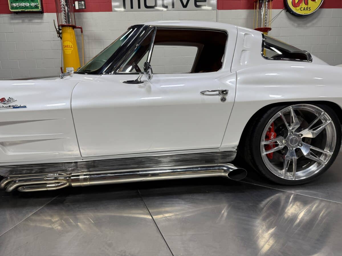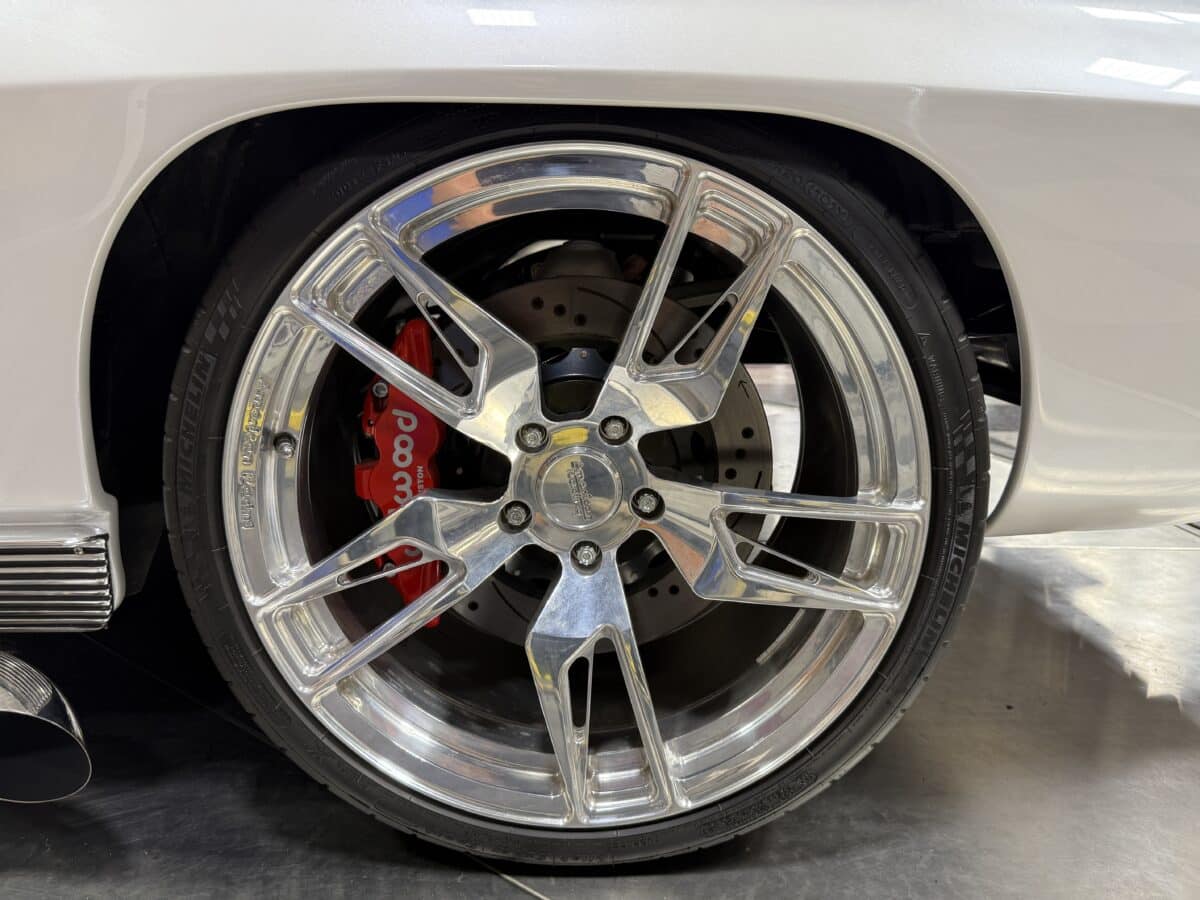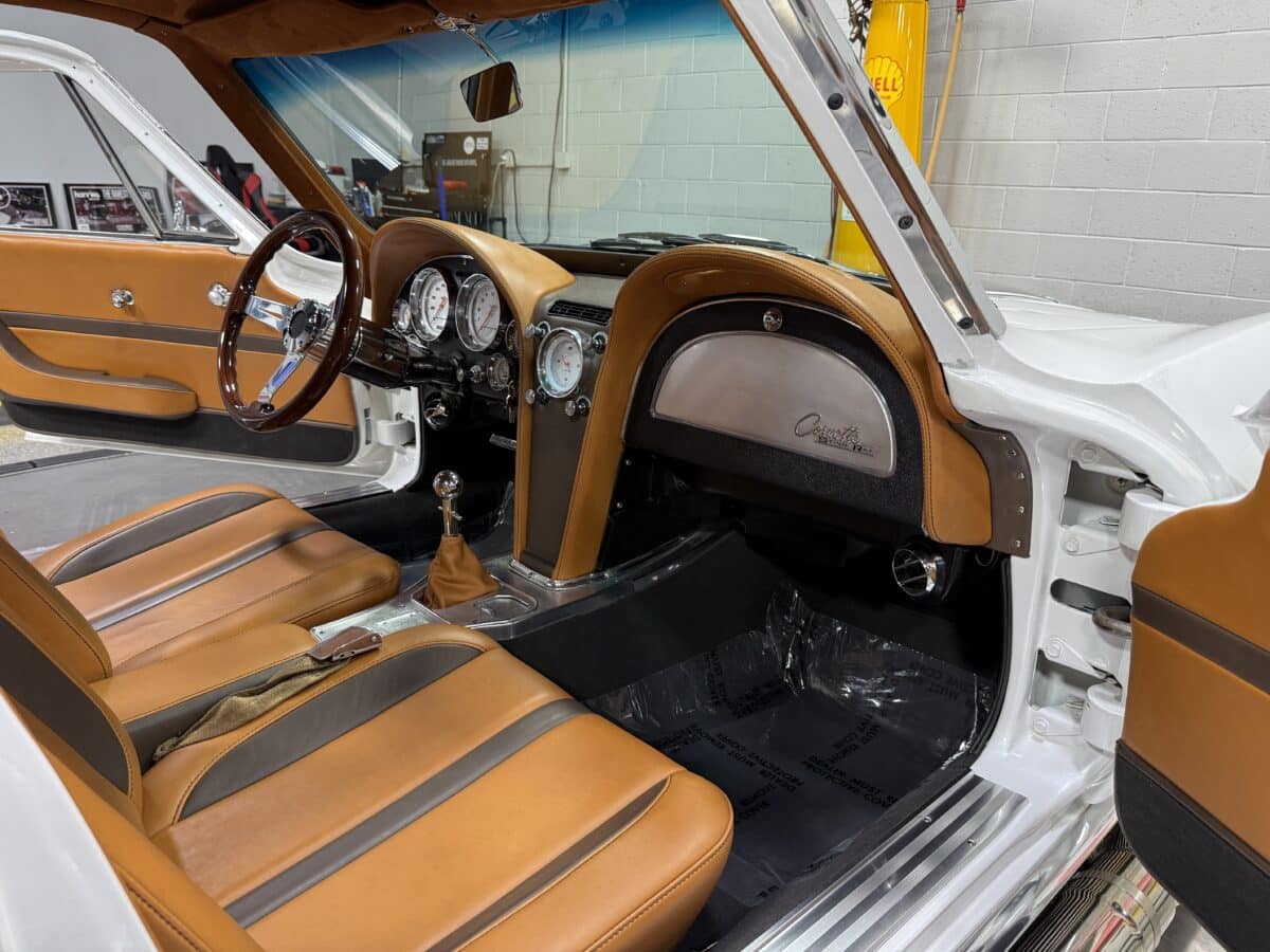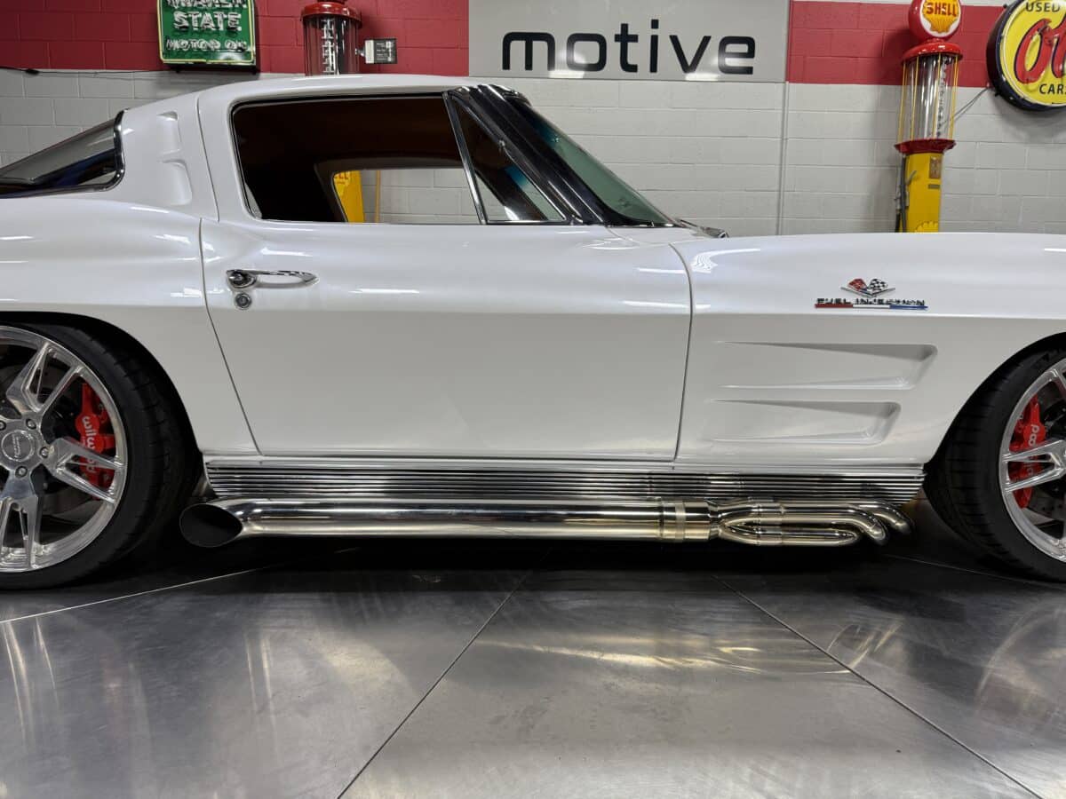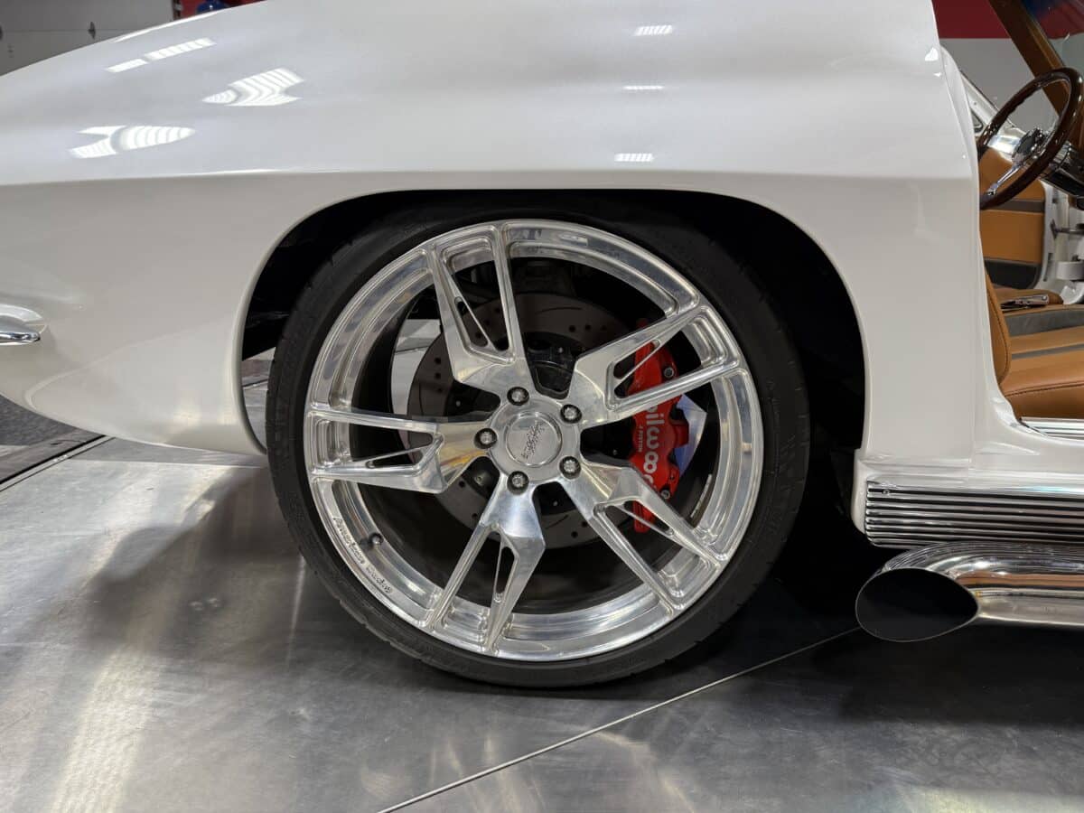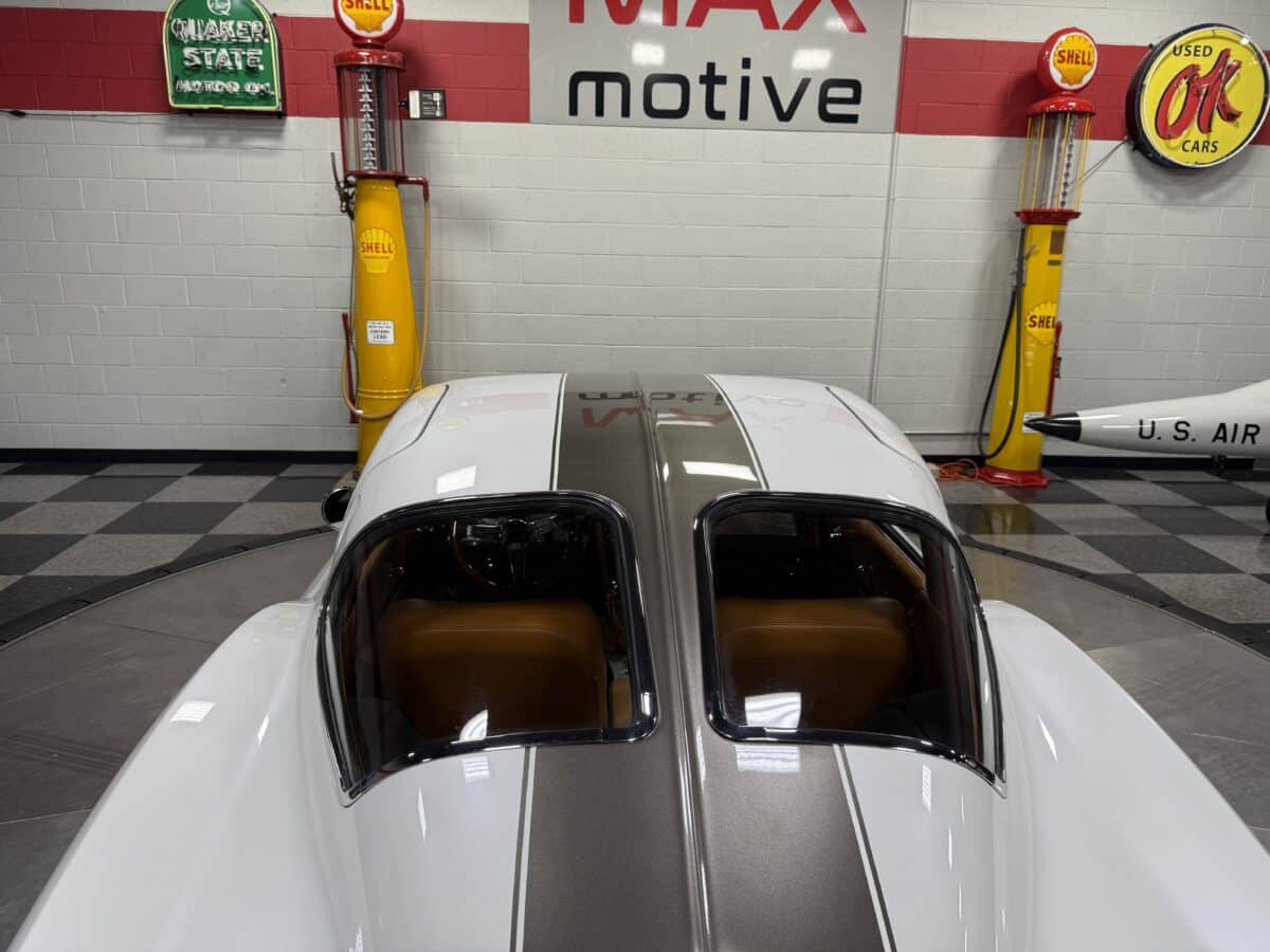 Underneath, a custom mandrel-bent chassis from Street Shop Inc., designed for C7 suspension components, provides a modern driving experience. The chassis features a semi-gloss black powder coated finish for durability and style. Handling and stopping power come courtesy of adjustable QA1 Ultra Ride coil over shocks, Hydro-Boost power rack-and-pinion steering, and Wilwood 4-wheel disc brakes with slotted and drilled rotors, red Wilwood calipers, and a tandem master cylinder. The Tri-coat Metallic White exterior with Gunmetal Grey Metallic stripes perfectly complements the custom Saddle leather interior with Chocolate trim, Vintage Air climate control, Classic Instruments Velocity Series gauges, and striking American Racing chrome wheels (19-inch front, 20-inch rear) wrapped in Michelin Pilot Sport 4S tires. This Corvette embodies the perfect marriage of timeless design and modern engineering.