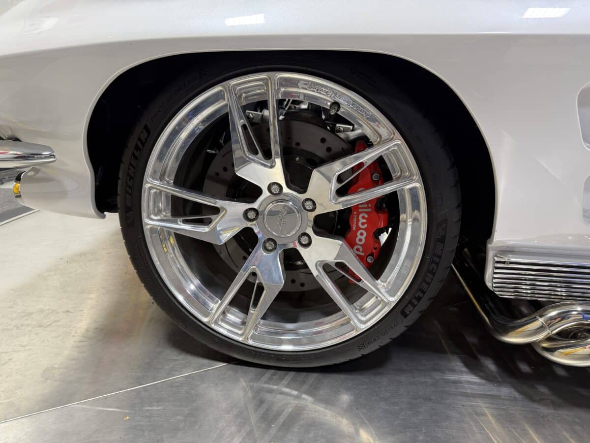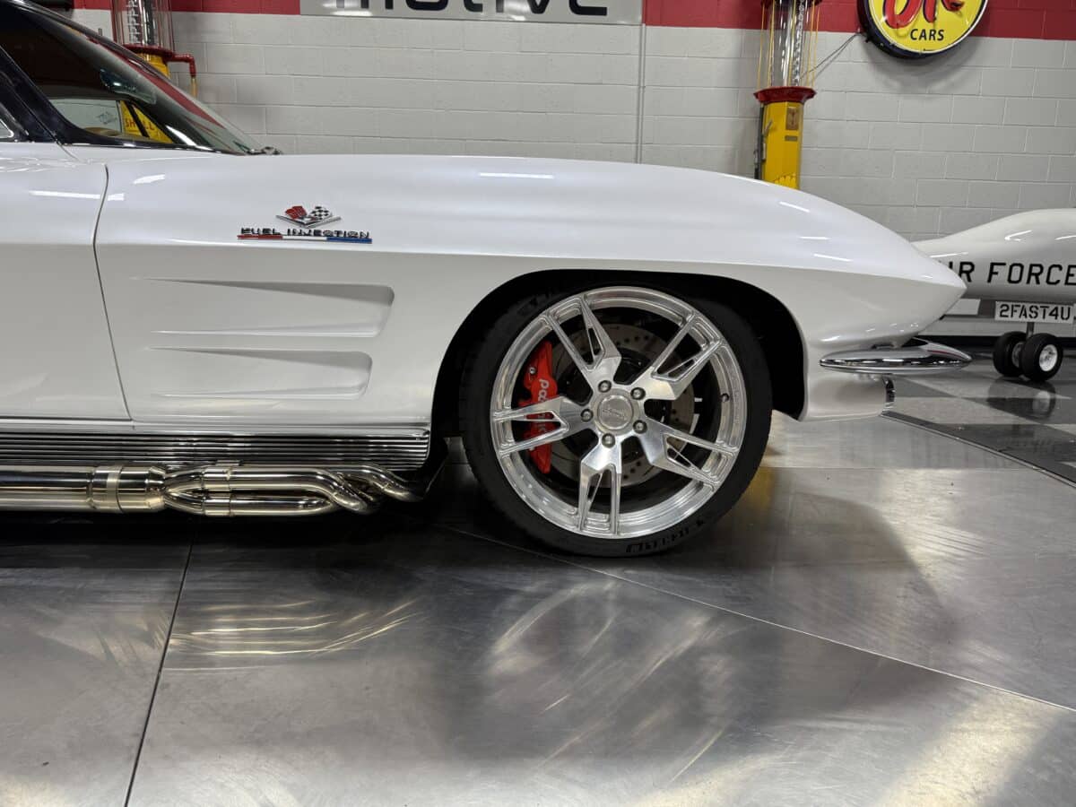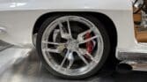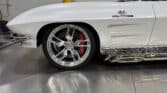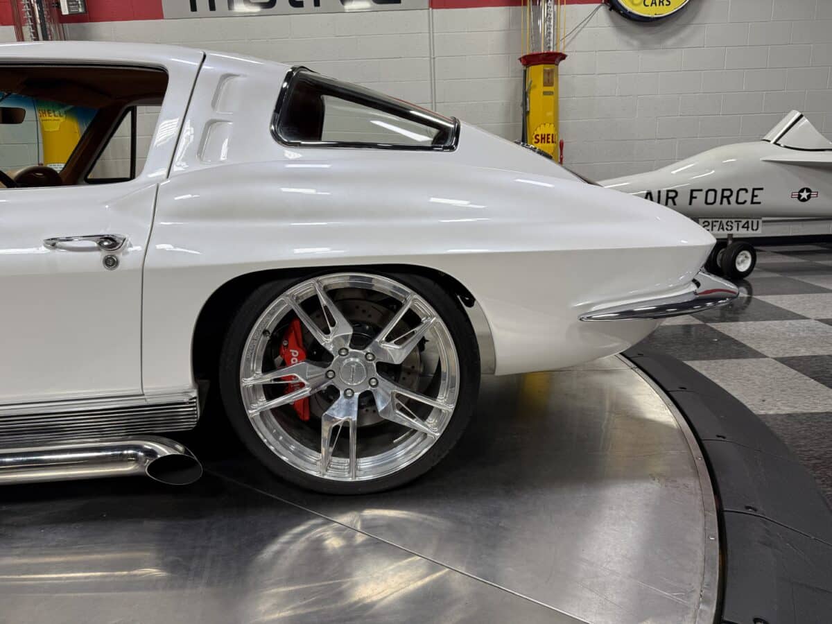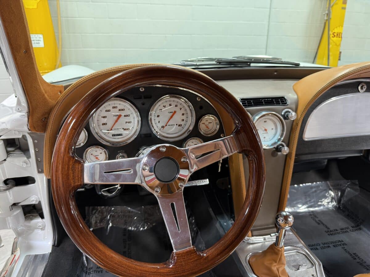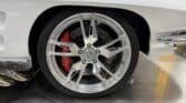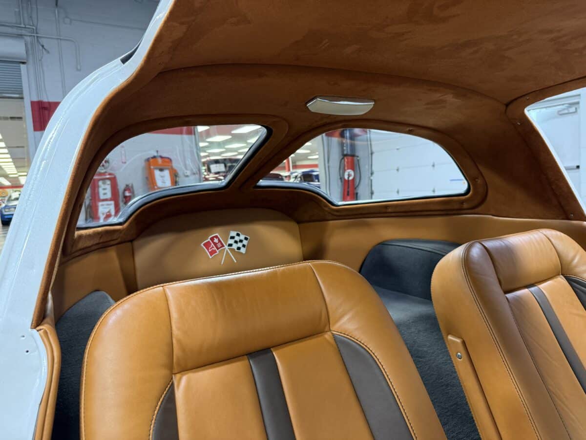 Underneath, a custom mandrel-bent chassis from Street Shop Inc., designed for C7 suspension components, provides a modern driving experience. The chassis features a semi-gloss black powder coated finish for durability and style. Handling and stopping power come courtesy of adjustable QA1 Ultra Ride coil over shocks, Hydro-Boost power rack-and-pinion steering, and Wilwood 4-wheel disc brakes with slotted and drilled rotors, red Wilwood calipers, and a tandem master cylinder. The Tri-coat Metallic White exterior with Gunmetal Grey Metallic stripes perfectly complements the custom Saddle leather interior with Chocolate trim, Vintage Air climate control, Classic Instruments Velocity Series gauges, and striking American Racing chrome wheels (19-inch front, 20-inch rear) wrapped in Michelin Pilot Sport 4S tires. This Corvette embodies the perfect marriage of timeless design and modern engineering.