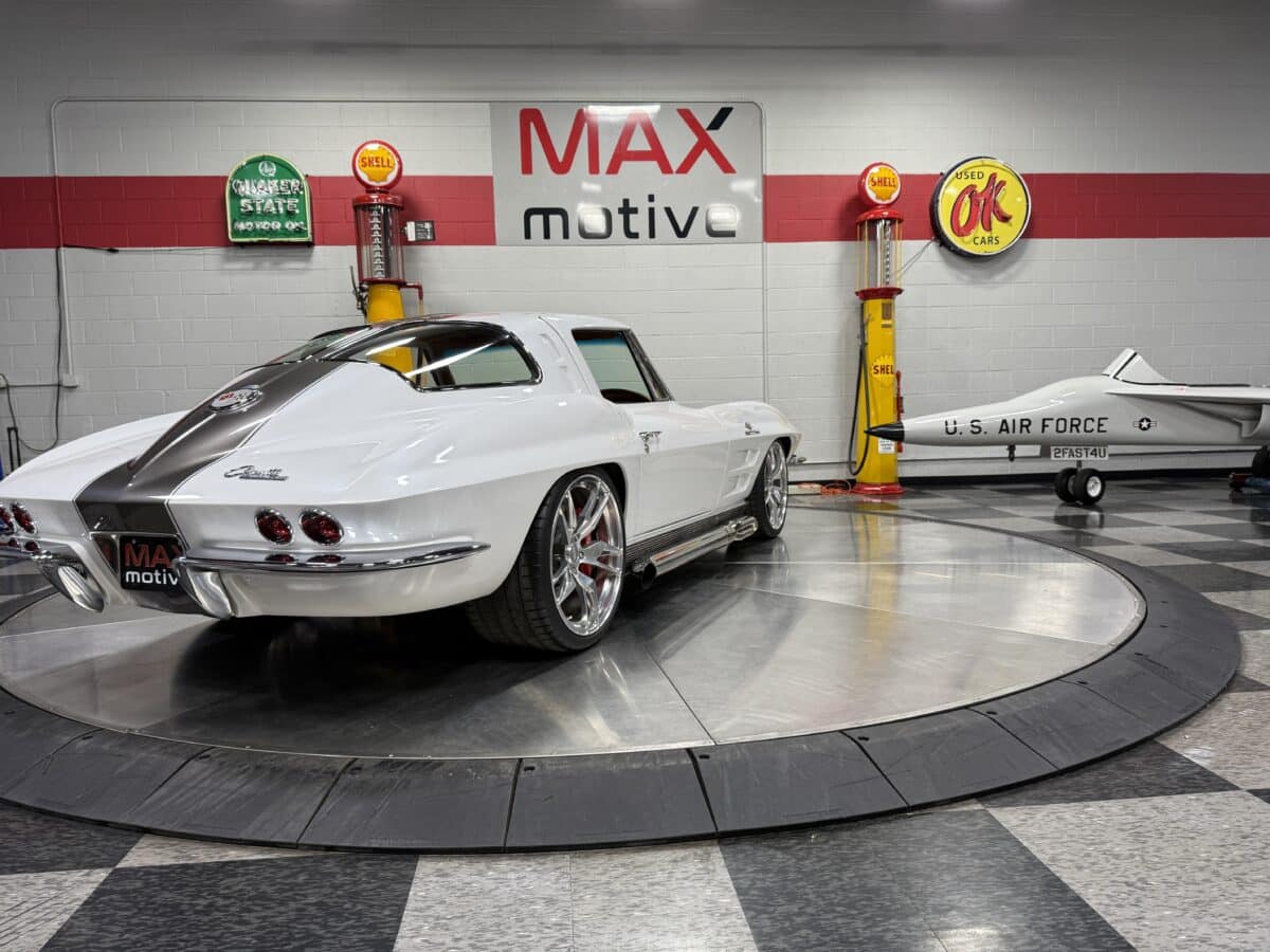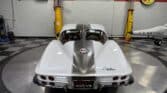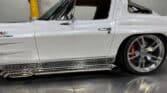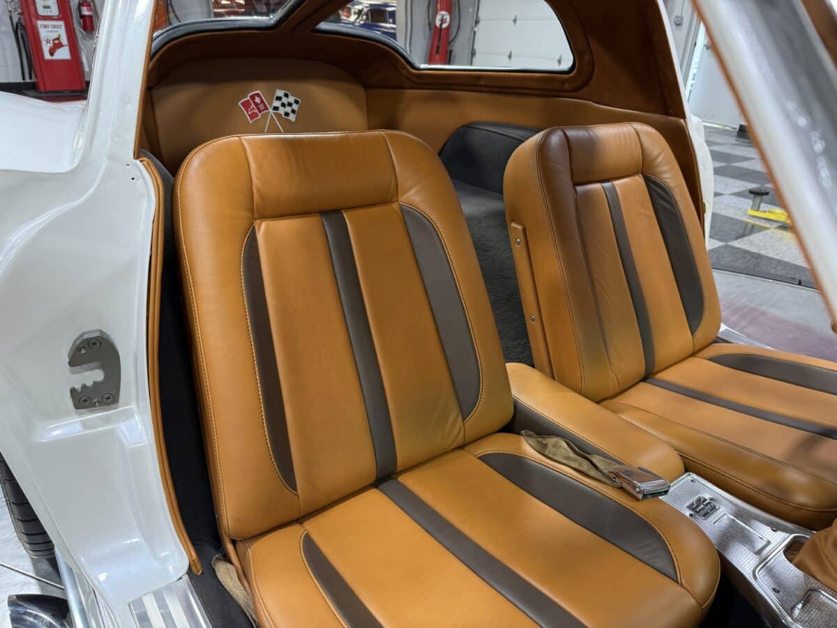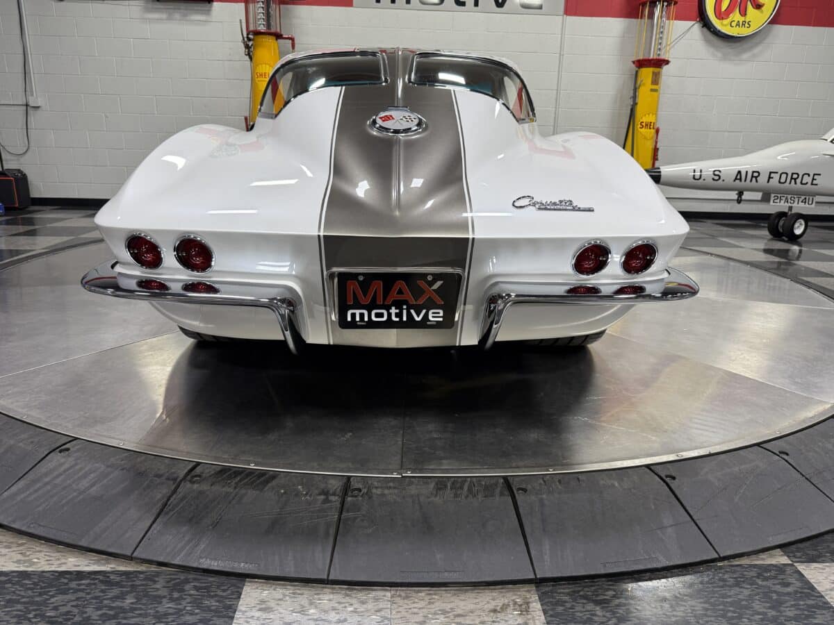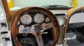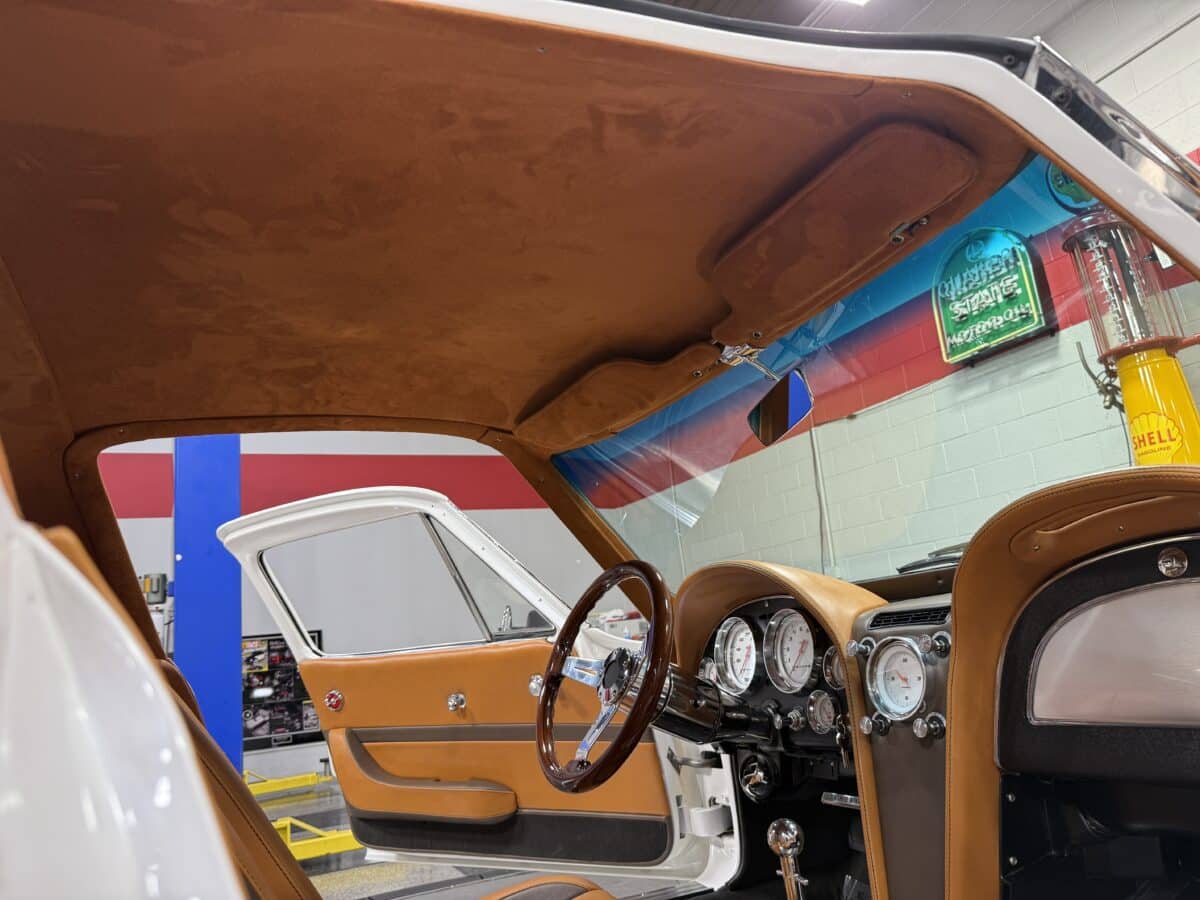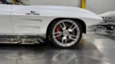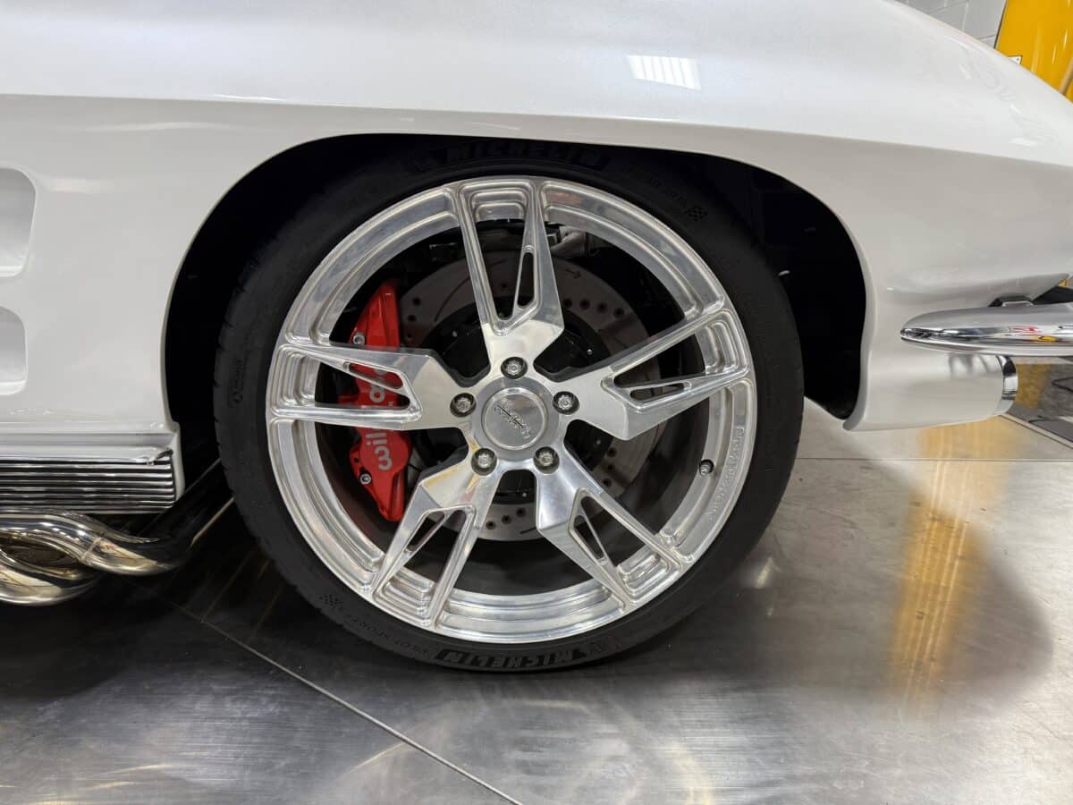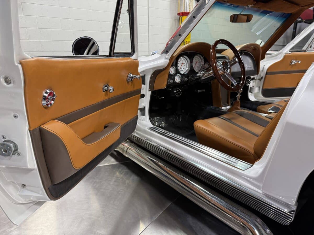 Underneath, a custom mandrel-bent chassis from Street Shop Inc., designed for C7 suspension components, provides a modern driving experience. The chassis features a semi-gloss black powder coated finish for durability and style. Handling and stopping power come courtesy of adjustable QA1 Ultra Ride coil over shocks, Hydro-Boost power rack-and-pinion steering, and Wilwood 4-wheel disc brakes with slotted and drilled rotors, red Wilwood calipers, and a tandem master cylinder. The Tri-coat Metallic White exterior with Gunmetal Grey Metallic stripes perfectly complements the custom Saddle leather interior with Chocolate trim, Vintage Air climate control, Classic Instruments Velocity Series gauges, and striking American Racing chrome wheels (19-inch front, 20-inch rear) wrapped in Michelin Pilot Sport 4S tires. This Corvette embodies the perfect marriage of timeless design and modern engineering.