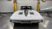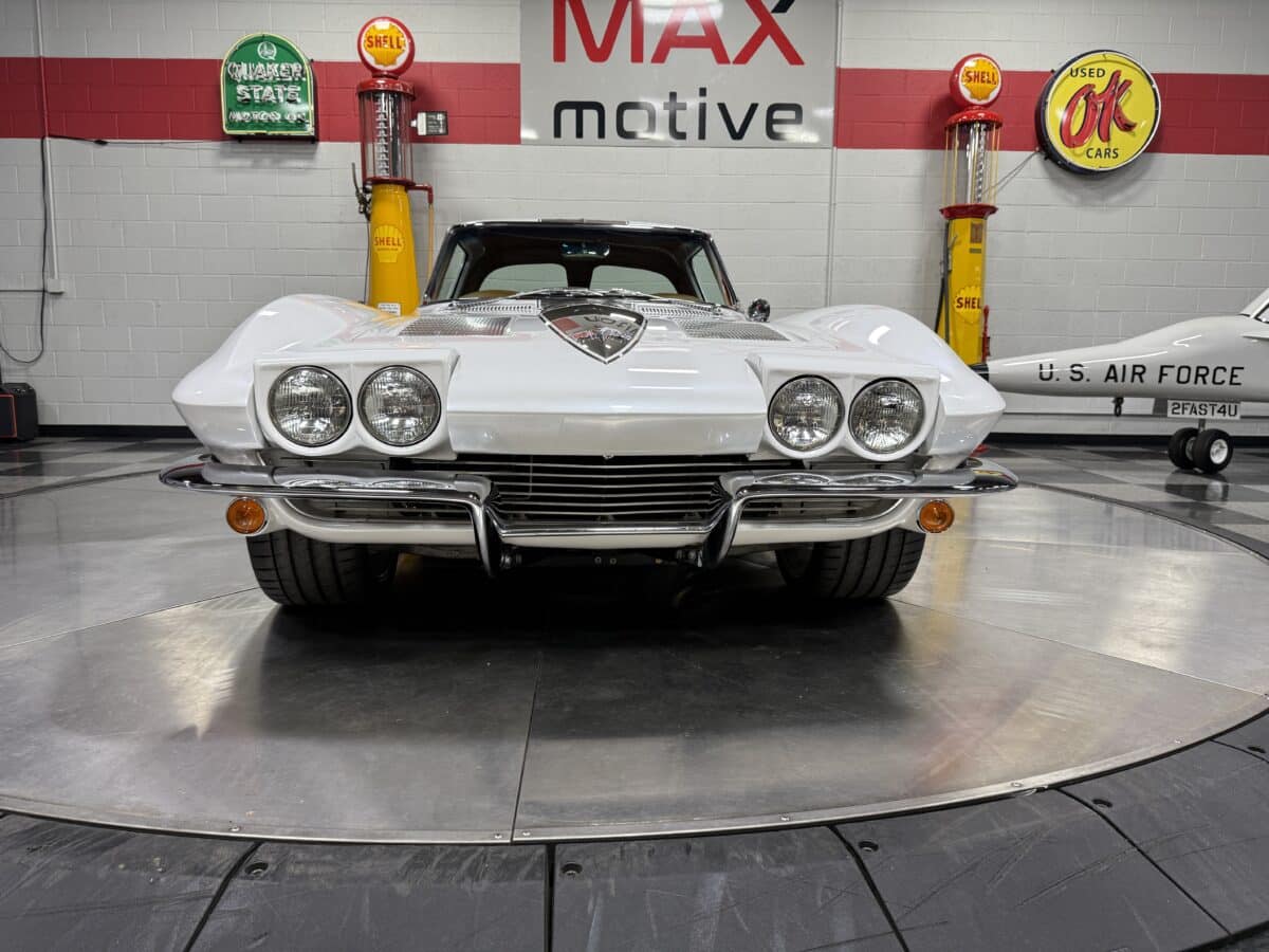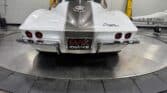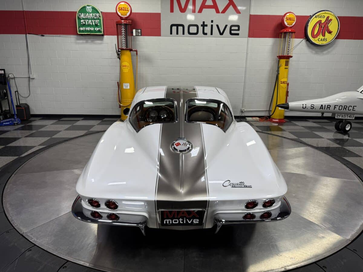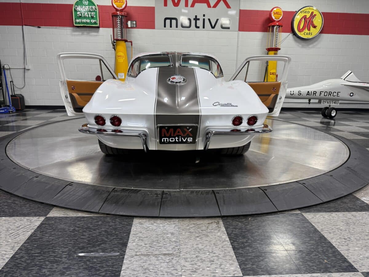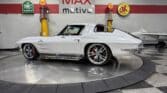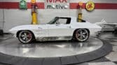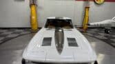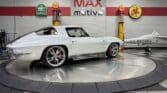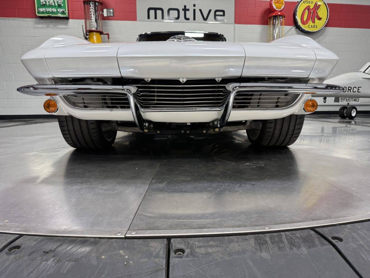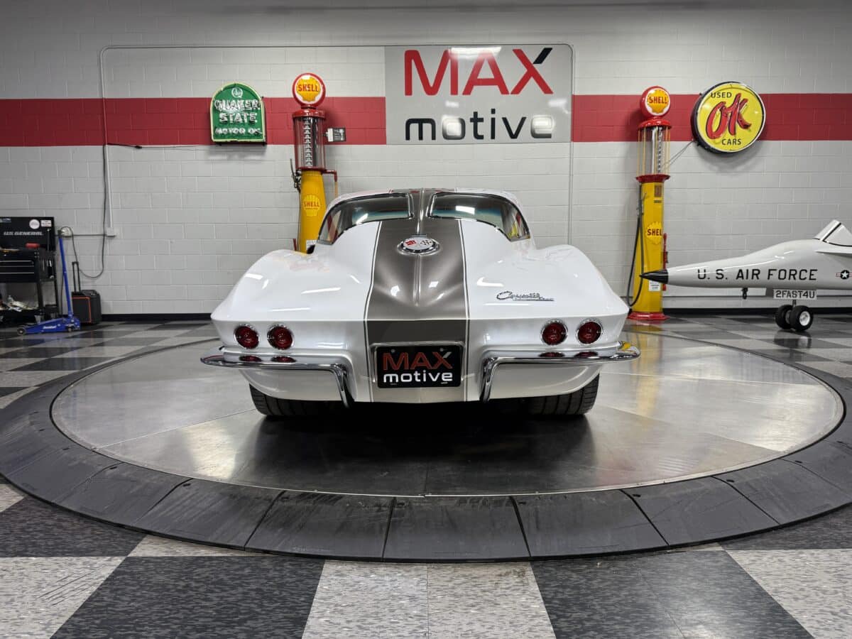 Underneath, a custom mandrel-bent chassis from Street Shop Inc., designed for C7 suspension components, provides a modern driving experience. The chassis features a semi-gloss black powder coated finish for durability and style. Handling and stopping power come courtesy of adjustable QA1 Ultra Ride coil over shocks, Hydro-Boost power rack-and-pinion steering, and Wilwood 4-wheel disc brakes with slotted and drilled rotors, red Wilwood calipers, and a tandem master cylinder. The Tri-coat Metallic White exterior with Gunmetal Grey Metallic stripes perfectly complements the custom Saddle leather interior with Chocolate trim, Vintage Air climate control, Classic Instruments Velocity Series gauges, and striking American Racing chrome wheels (19-inch front, 20-inch rear) wrapped in Michelin Pilot Sport 4S tires. This Corvette embodies the perfect marriage of timeless design and modern engineering.