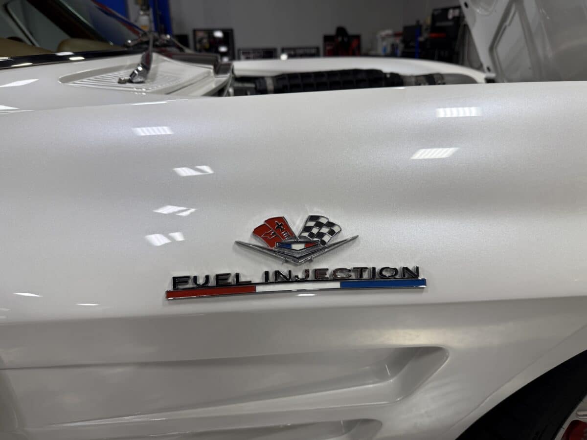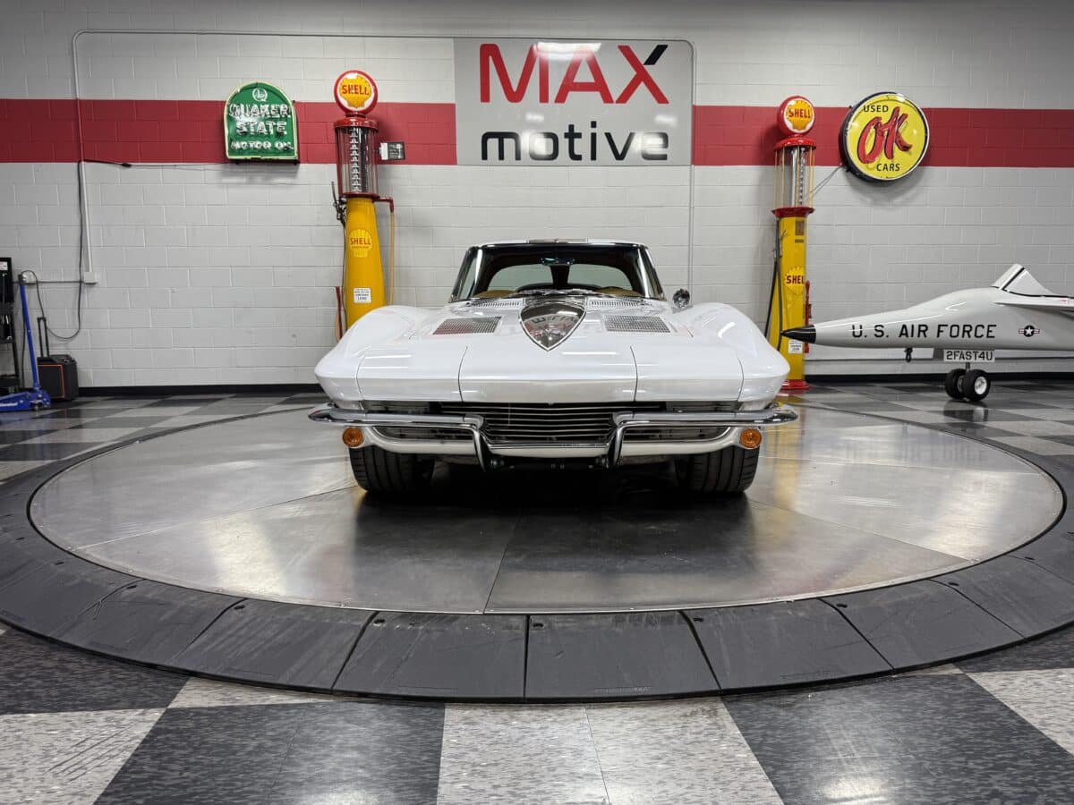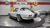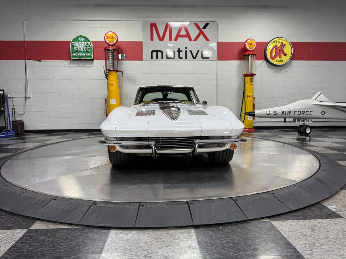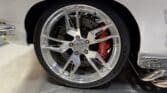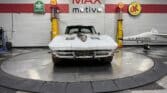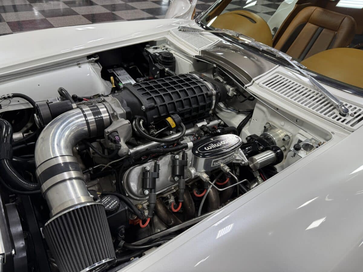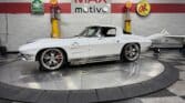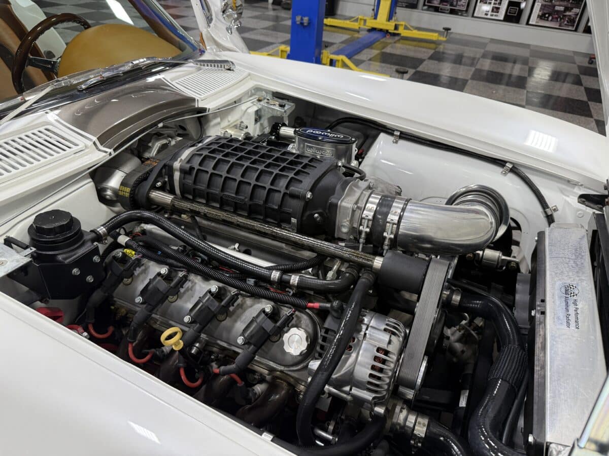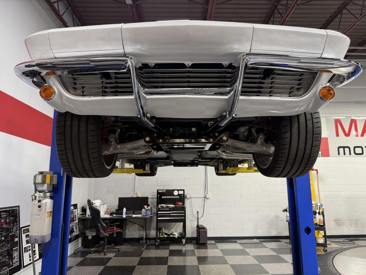 Underneath, a custom mandrel-bent chassis from Street Shop Inc., designed for C7 suspension components, provides a modern driving experience. The chassis features a semi-gloss black powder coated finish for durability and style. Handling and stopping power come courtesy of adjustable QA1 Ultra Ride coil over shocks, Hydro-Boost power rack-and-pinion steering, and Wilwood 4-wheel disc brakes with slotted and drilled rotors, red Wilwood calipers, and a tandem master cylinder. The Tri-coat Metallic White exterior with Gunmetal Grey Metallic stripes perfectly complements the custom Saddle leather interior with Chocolate trim, Vintage Air climate control, Classic Instruments Velocity Series gauges, and striking American Racing chrome wheels (19-inch front, 20-inch rear) wrapped in Michelin Pilot Sport 4S tires. This Corvette embodies the perfect marriage of timeless design and modern engineering.