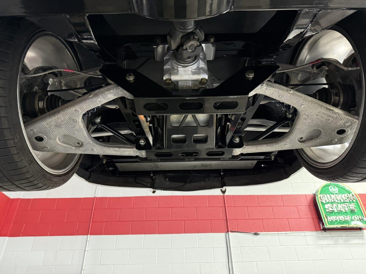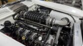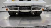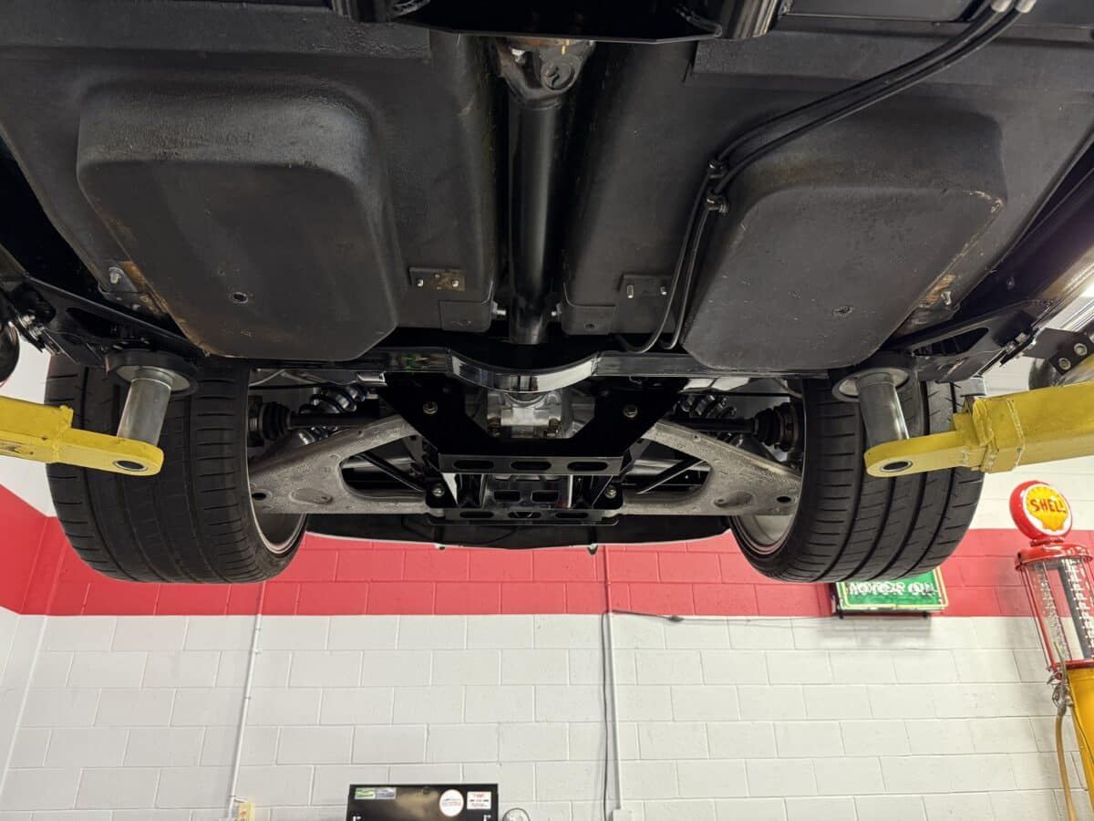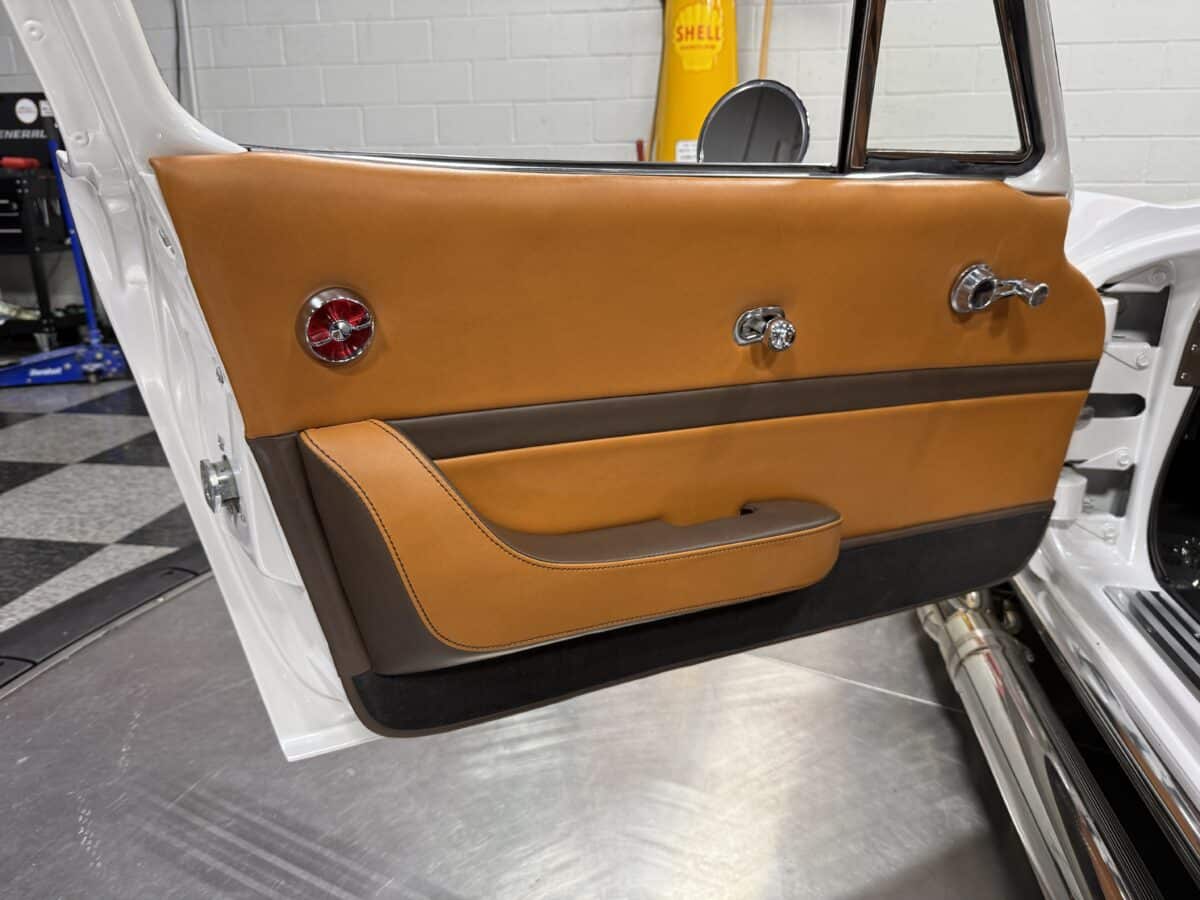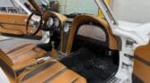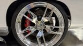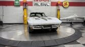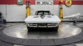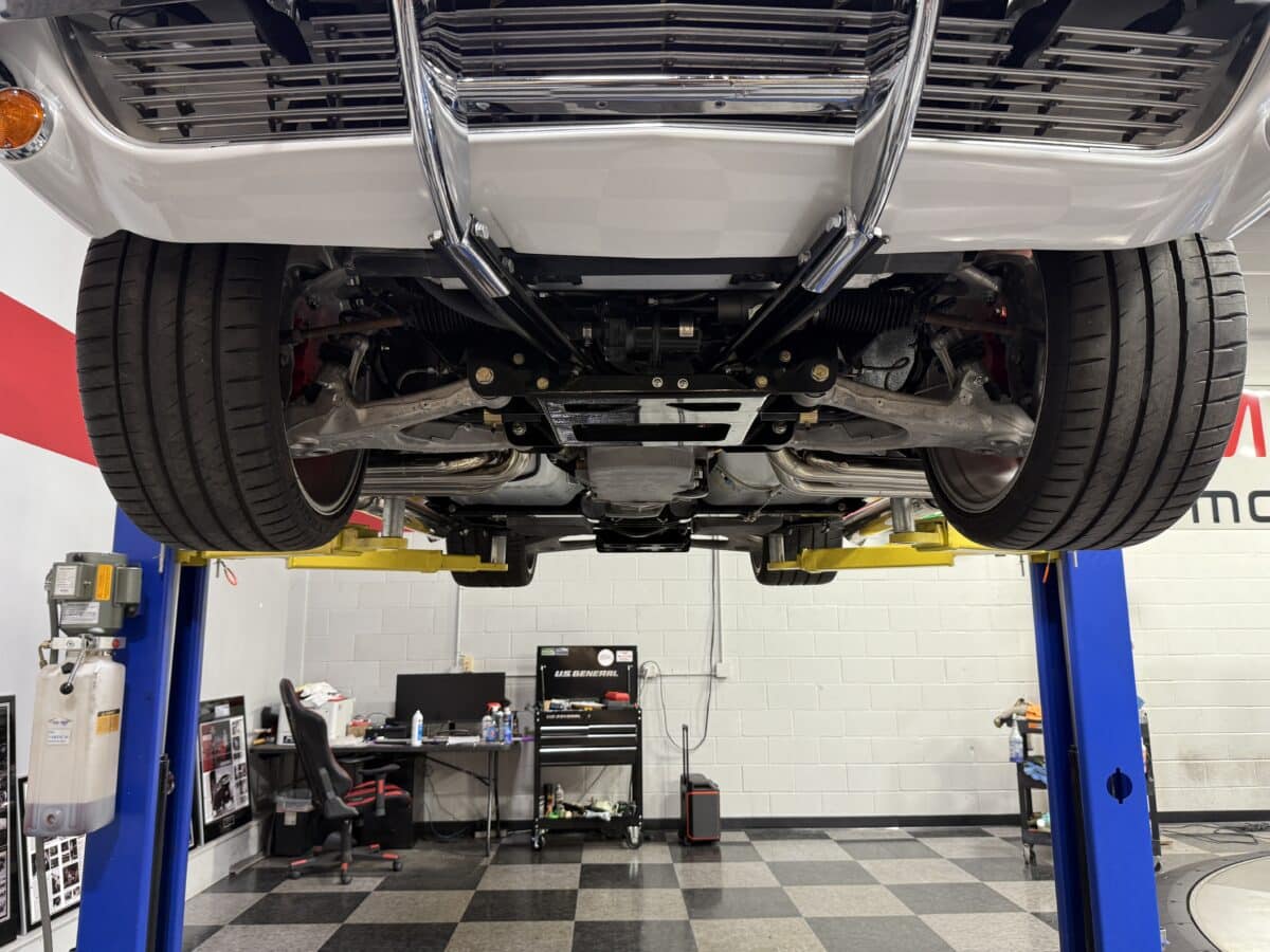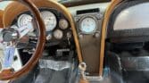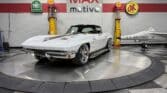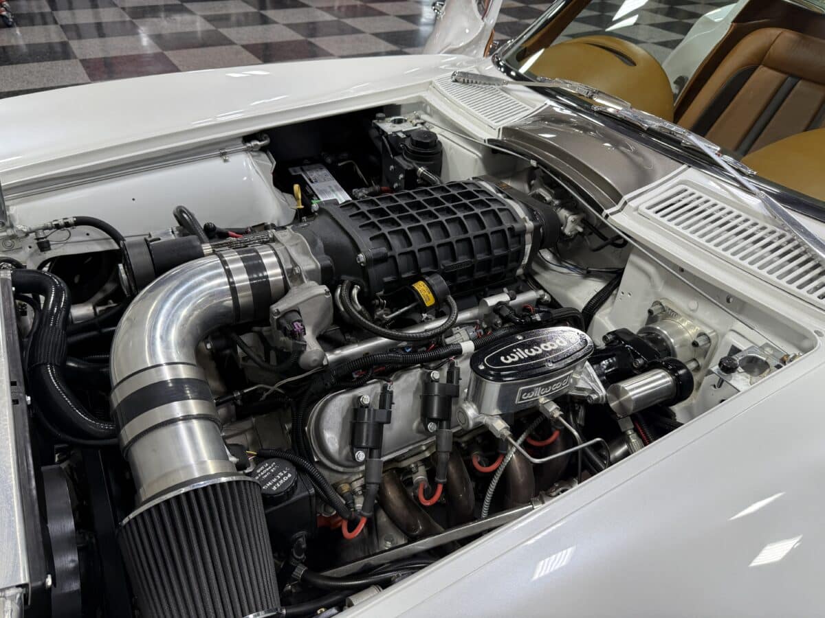 Underneath, a custom mandrel-bent chassis from Street Shop Inc., designed for C7 suspension components, provides a modern driving experience. The chassis features a semi-gloss black powder coated finish for durability and style. Handling and stopping power come courtesy of adjustable QA1 Ultra Ride coil over shocks, Hydro-Boost power rack-and-pinion steering, and Wilwood 4-wheel disc brakes with slotted and drilled rotors, red Wilwood calipers, and a tandem master cylinder. The Tri-coat Metallic White exterior with Gunmetal Grey Metallic stripes perfectly complements the custom Saddle leather interior with Chocolate trim, Vintage Air climate control, Classic Instruments Velocity Series gauges, and striking American Racing chrome wheels (19-inch front, 20-inch rear) wrapped in Michelin Pilot Sport 4S tires. This Corvette embodies the perfect marriage of timeless design and modern engineering.