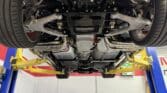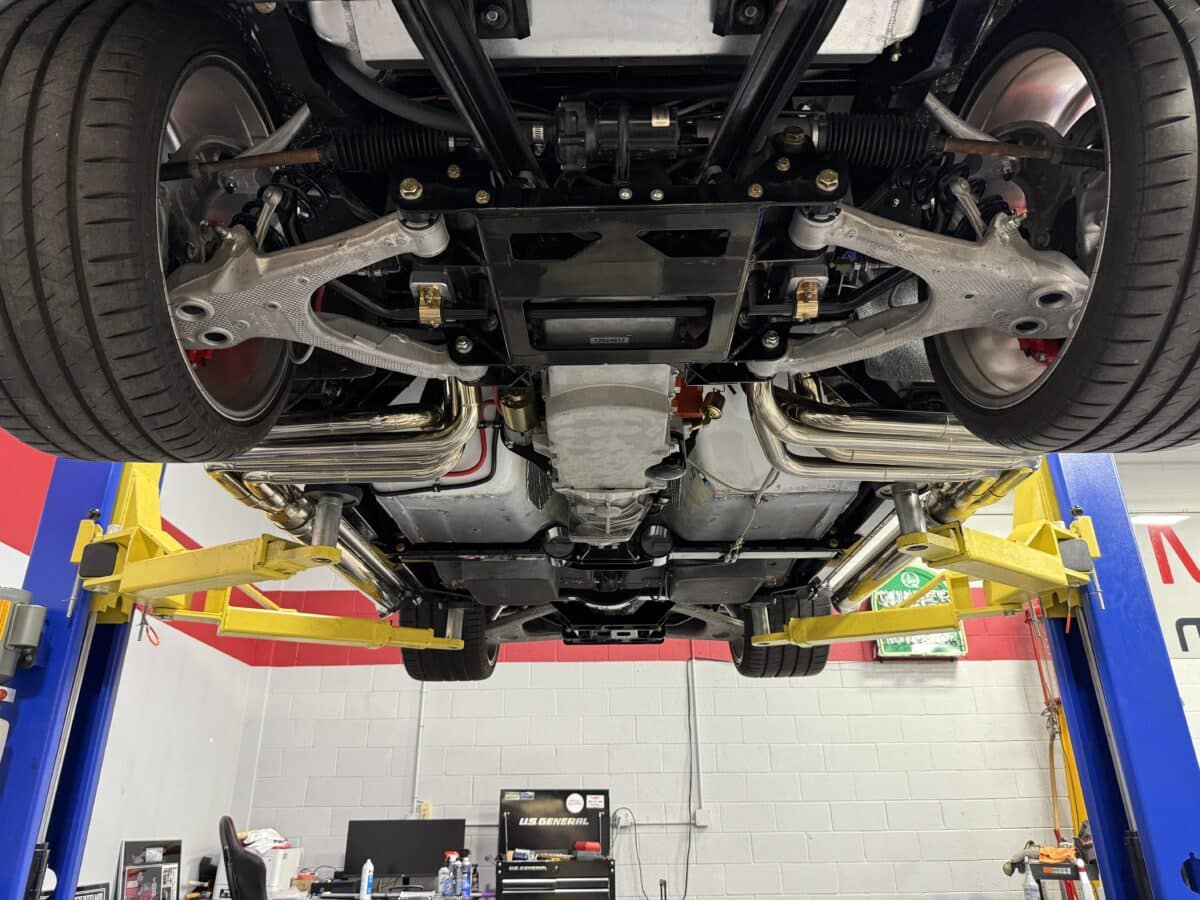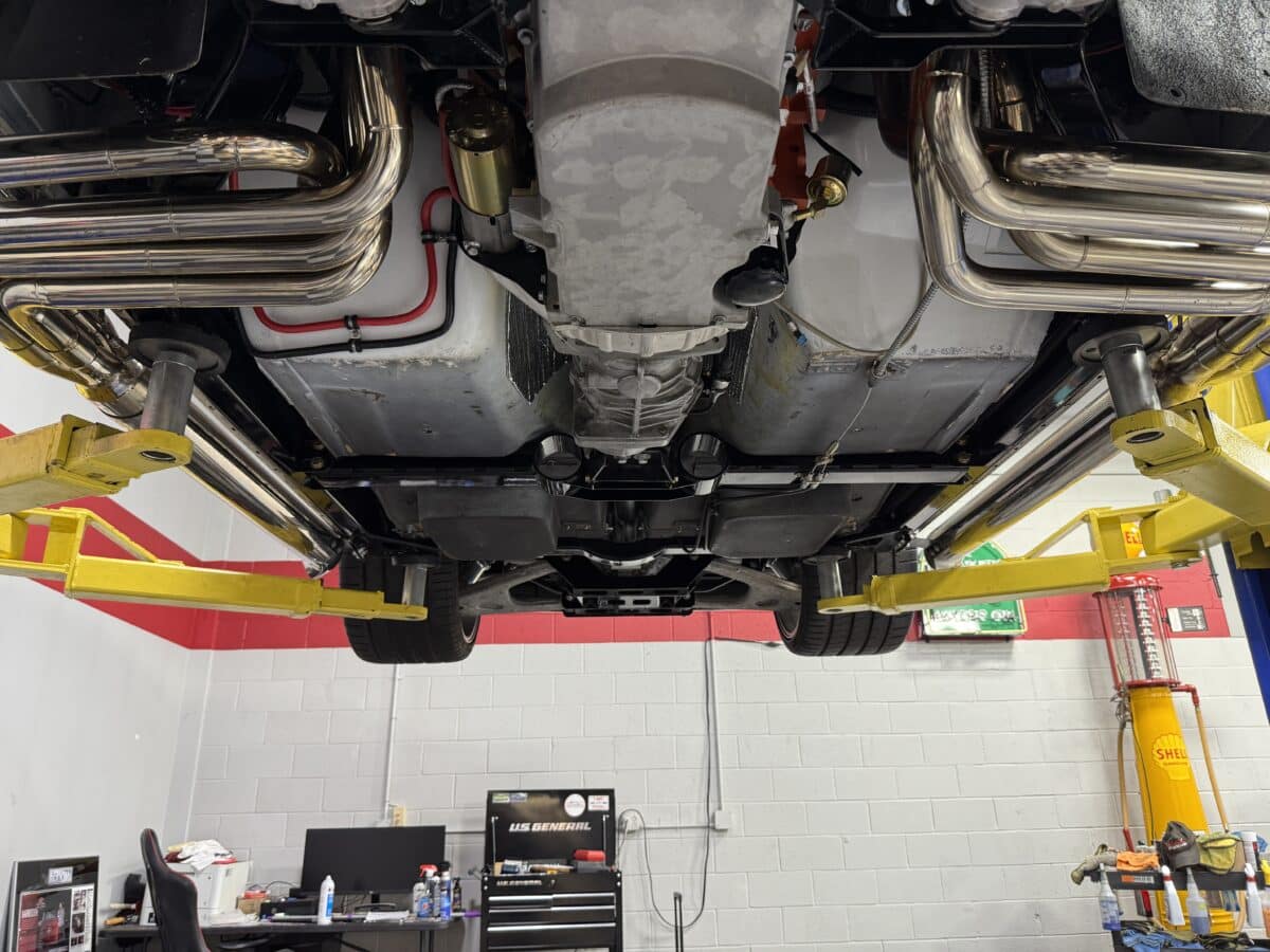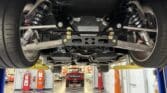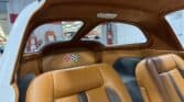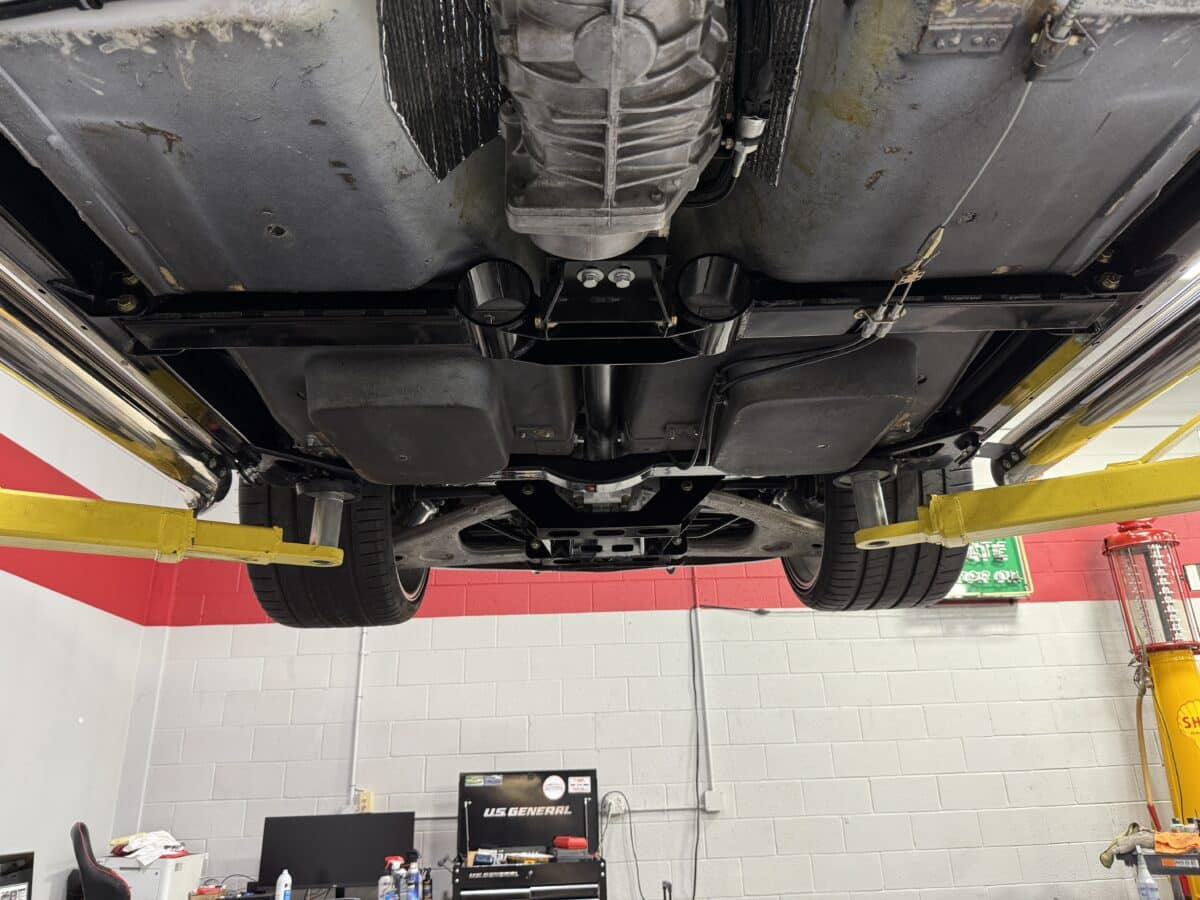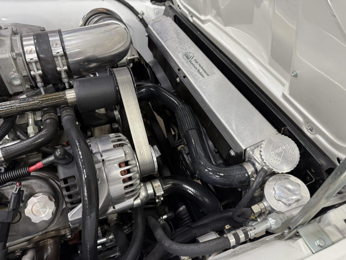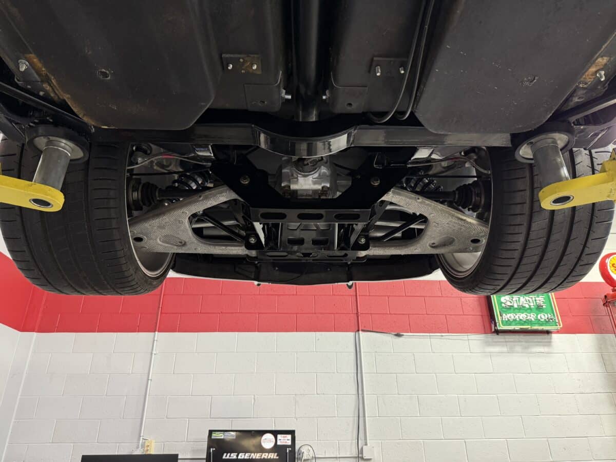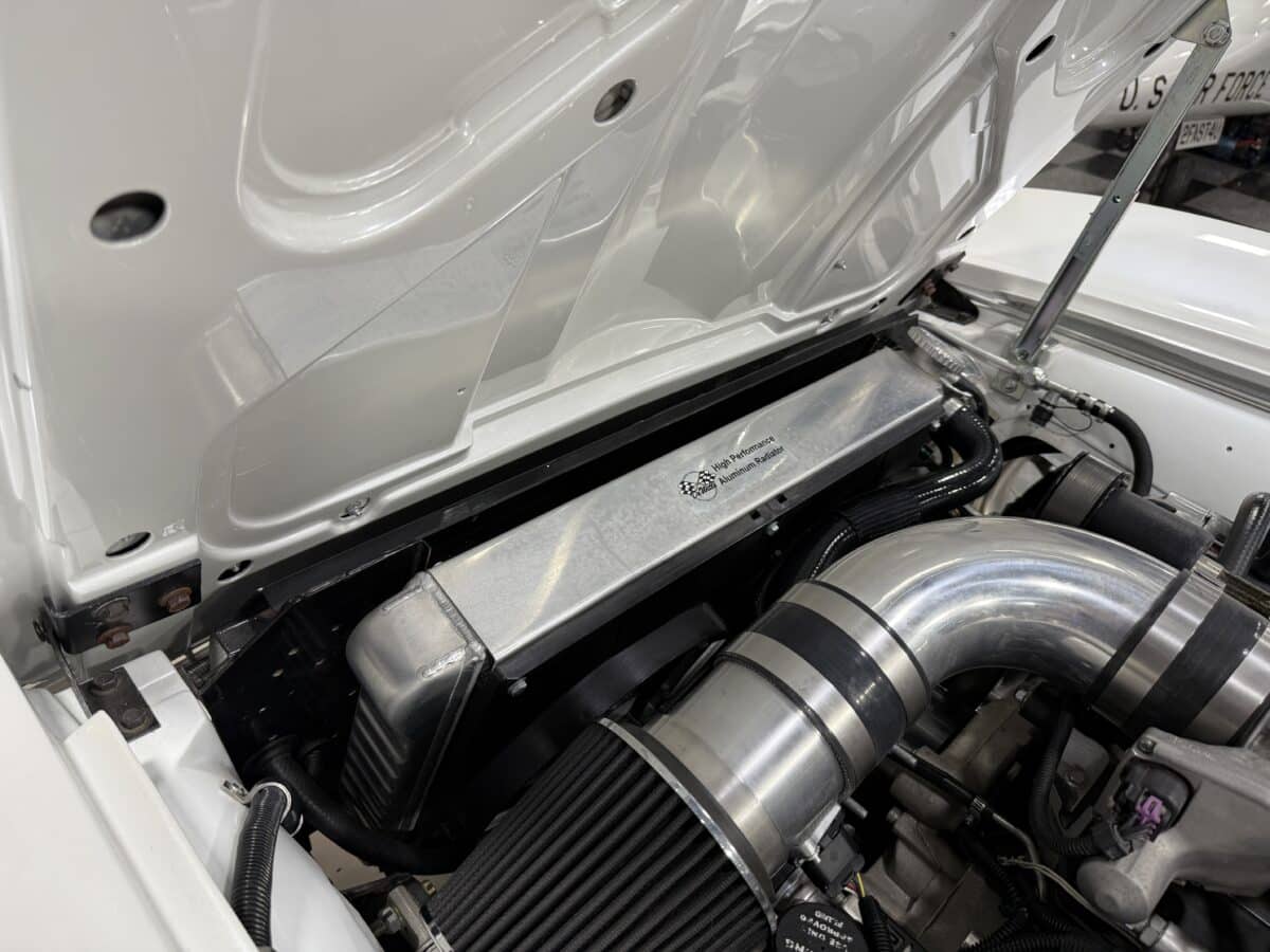 Underneath, a custom mandrel-bent chassis from Street Shop Inc., designed for C7 suspension components, provides a modern driving experience. The chassis features a semi-gloss black powder coated finish for durability and style. Handling and stopping power come courtesy of adjustable QA1 Ultra Ride coil over shocks, Hydro-Boost power rack-and-pinion steering, and Wilwood 4-wheel disc brakes with slotted and drilled rotors, red Wilwood calipers, and a tandem master cylinder. The Tri-coat Metallic White exterior with Gunmetal Grey Metallic stripes perfectly complements the custom Saddle leather interior with Chocolate trim, Vintage Air climate control, Classic Instruments Velocity Series gauges, and striking American Racing chrome wheels (19-inch front, 20-inch rear) wrapped in Michelin Pilot Sport 4S tires. This Corvette embodies the perfect marriage of timeless design and modern engineering.