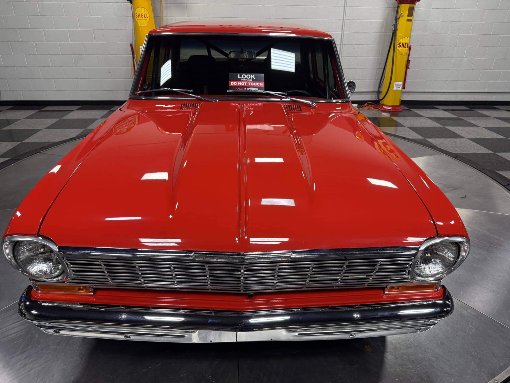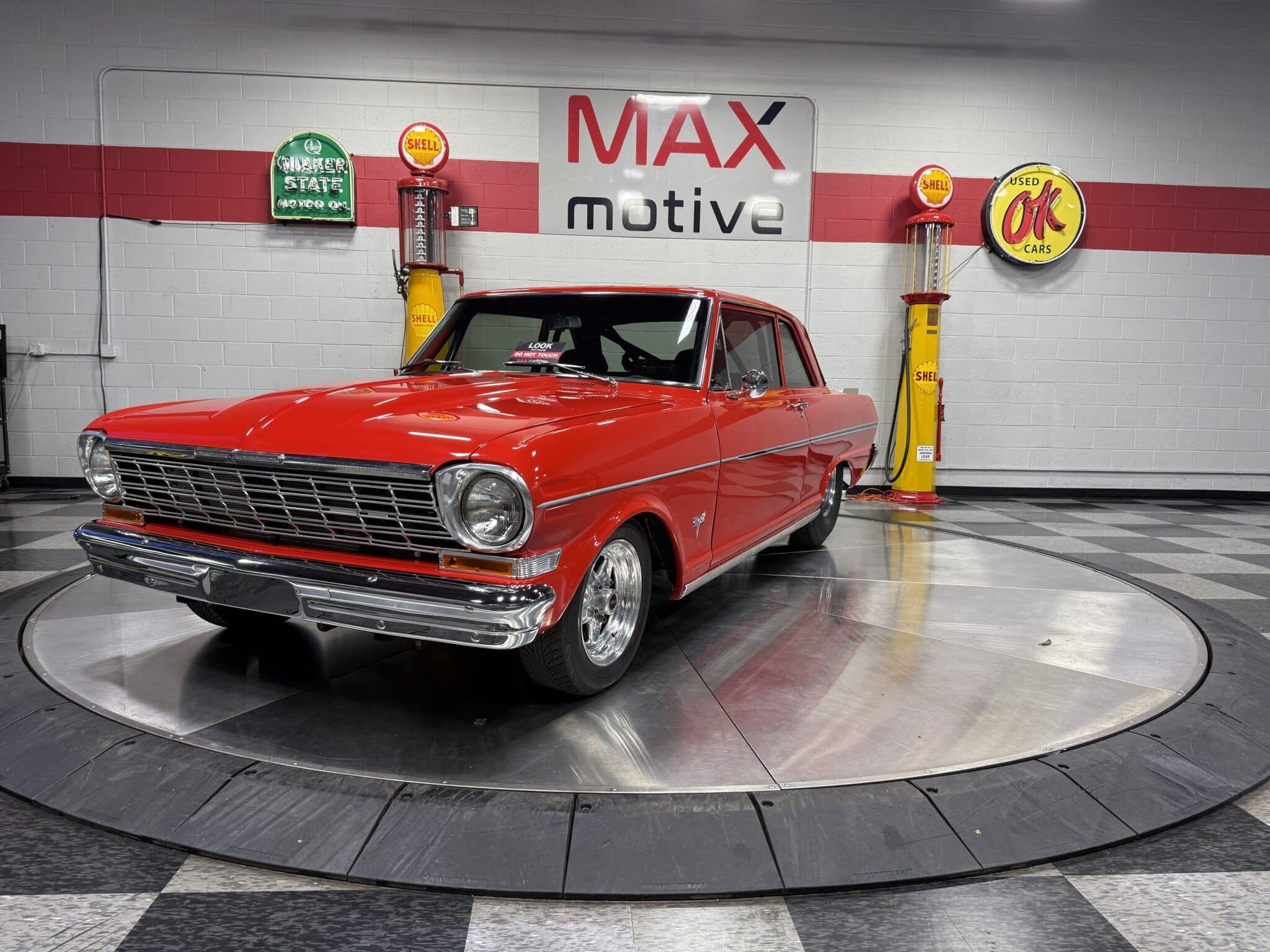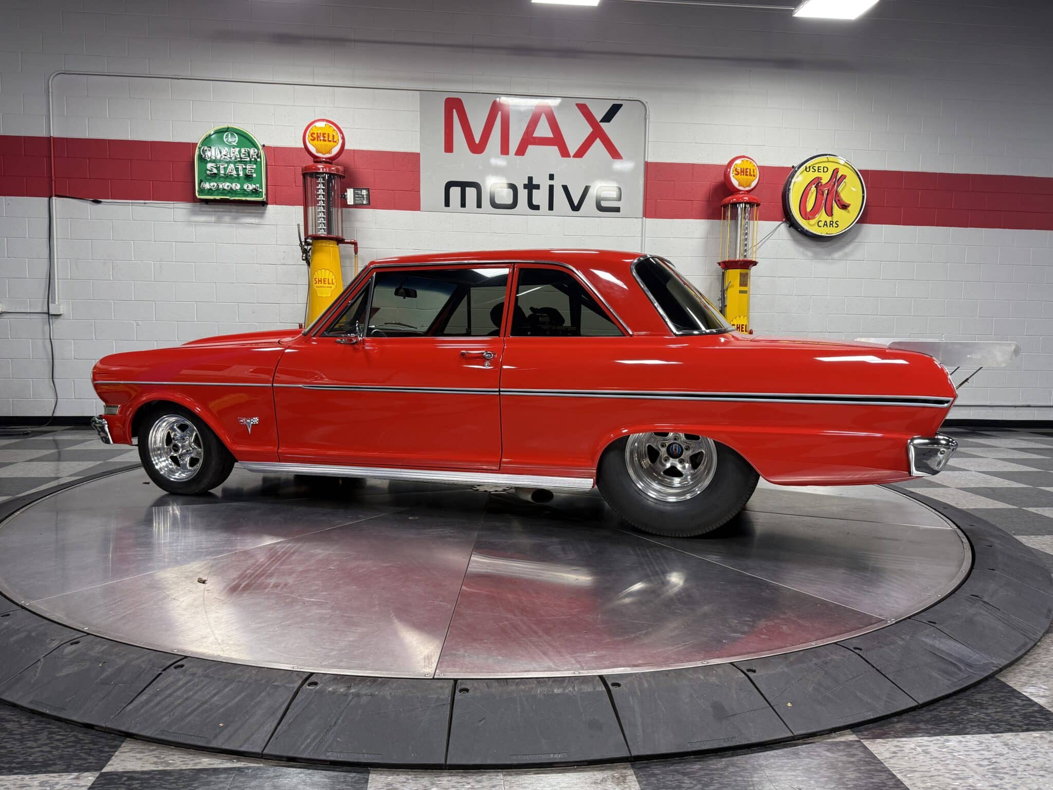 MaxMotive is proud to offer this 1964 Chevrolet Nova Pro Street. Originally a California car, this Nova retains its classic Chevy appeal while incorporating the right performance upgrades for street and show enjoyment. The exterior presents in bright red with airbrushed body side moldings and chrome bumpers and trim. The stance immediately sets the tone, thanks to a tubbed rear, narrowed Currie 9-inch rear, and Weld Racing ProStar wheels wrapped in Mickey Thompson Sportsman tires.