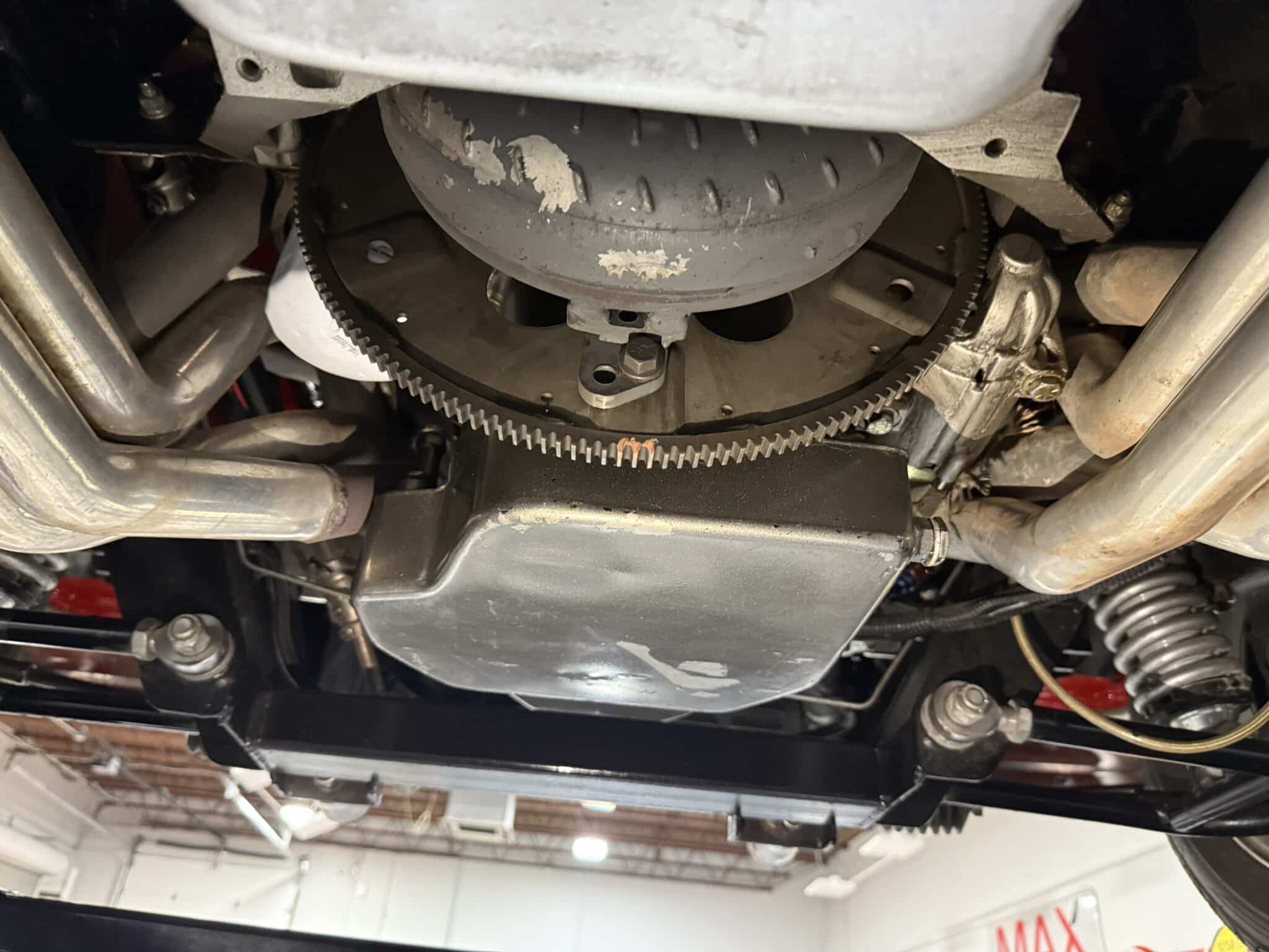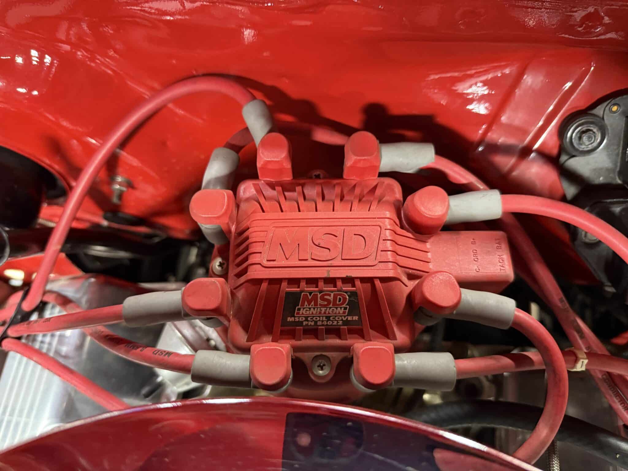 Power comes from a 400ci small-block Chevy equipped with Edelbrock Performer RPM aluminum heads, Holley carburetor, MSD ignition, and Hooker headers feeding a 3-inch dual exhaust that exits neatly ahead of the rear tires. Cooling and fuel delivery are handled by an aluminum radiator with electric fans and an aluminum fuel cell mounted through the trunk floor with a Holley electric fuel pump.
