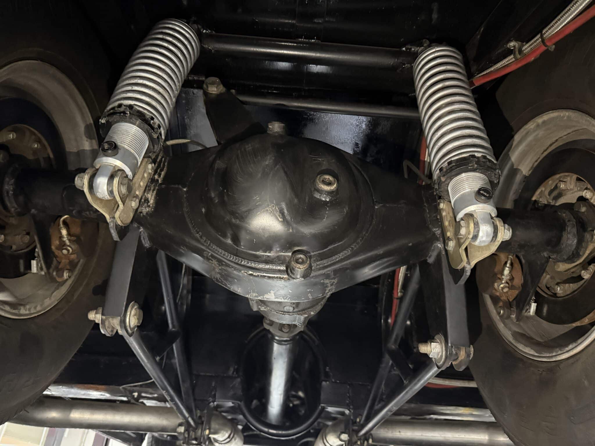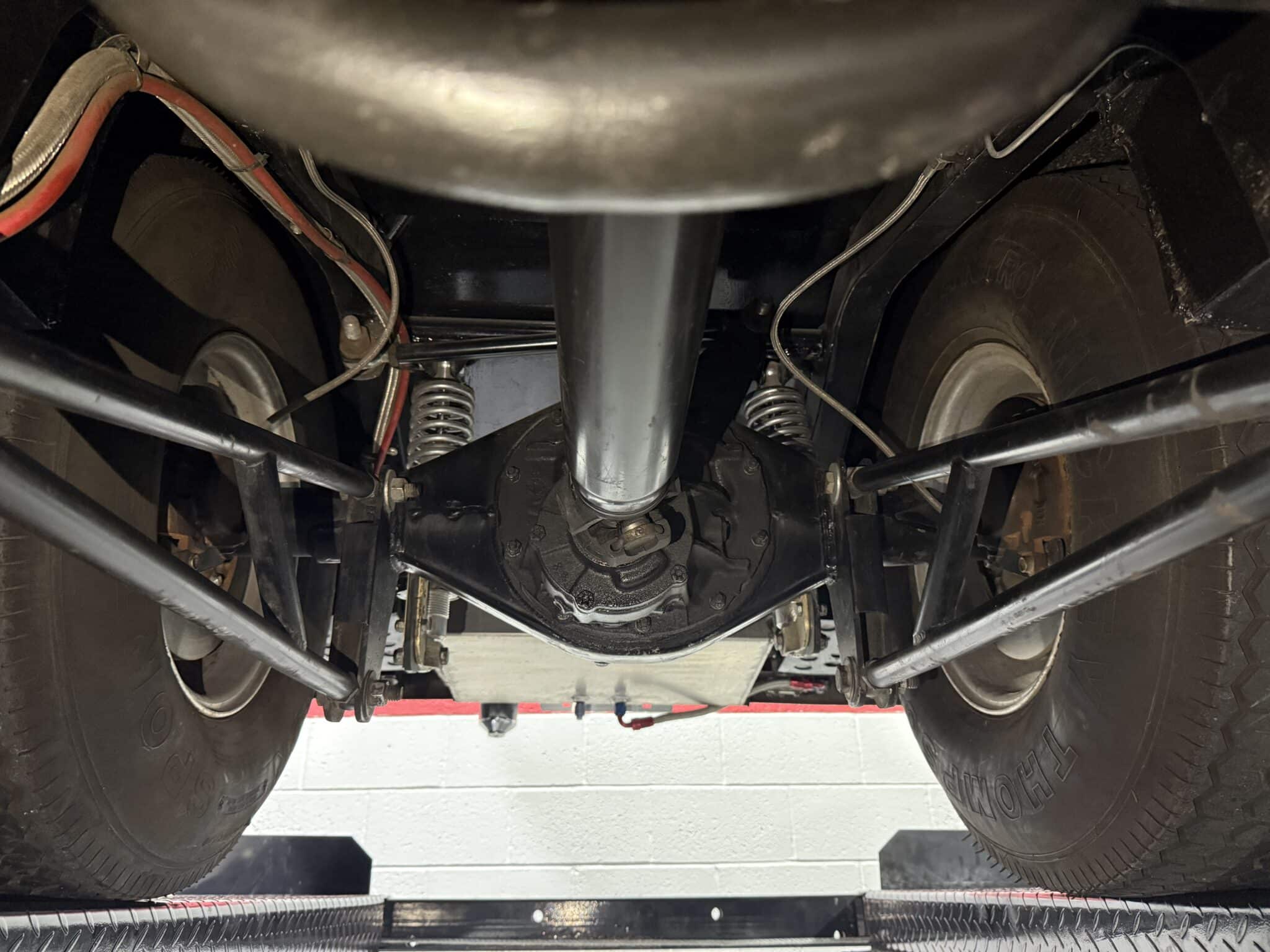 Underneath, a Mustang II front suspension with tubular control arms and coil-overs, paired with a back-half chassis, ladder-bar rear suspension, panhard bar, and rear coil-overs, provides excellent ride quality and traction. The car uses a manual steering rack and four-wheel disc brakes with vacuum assist for confident control.