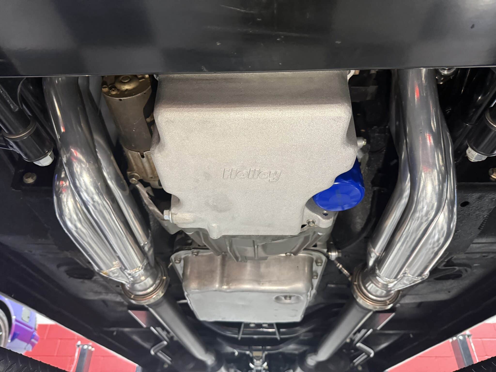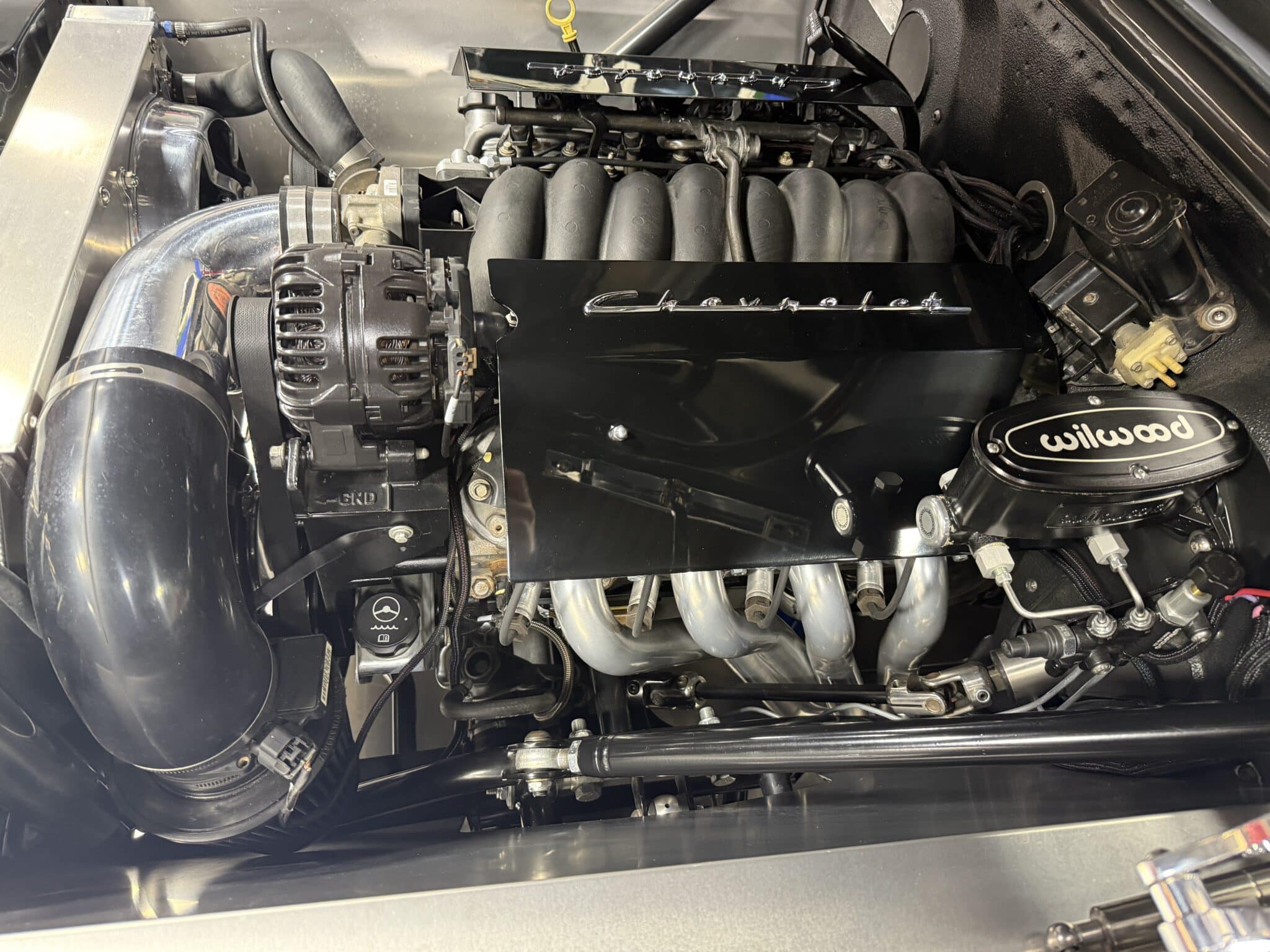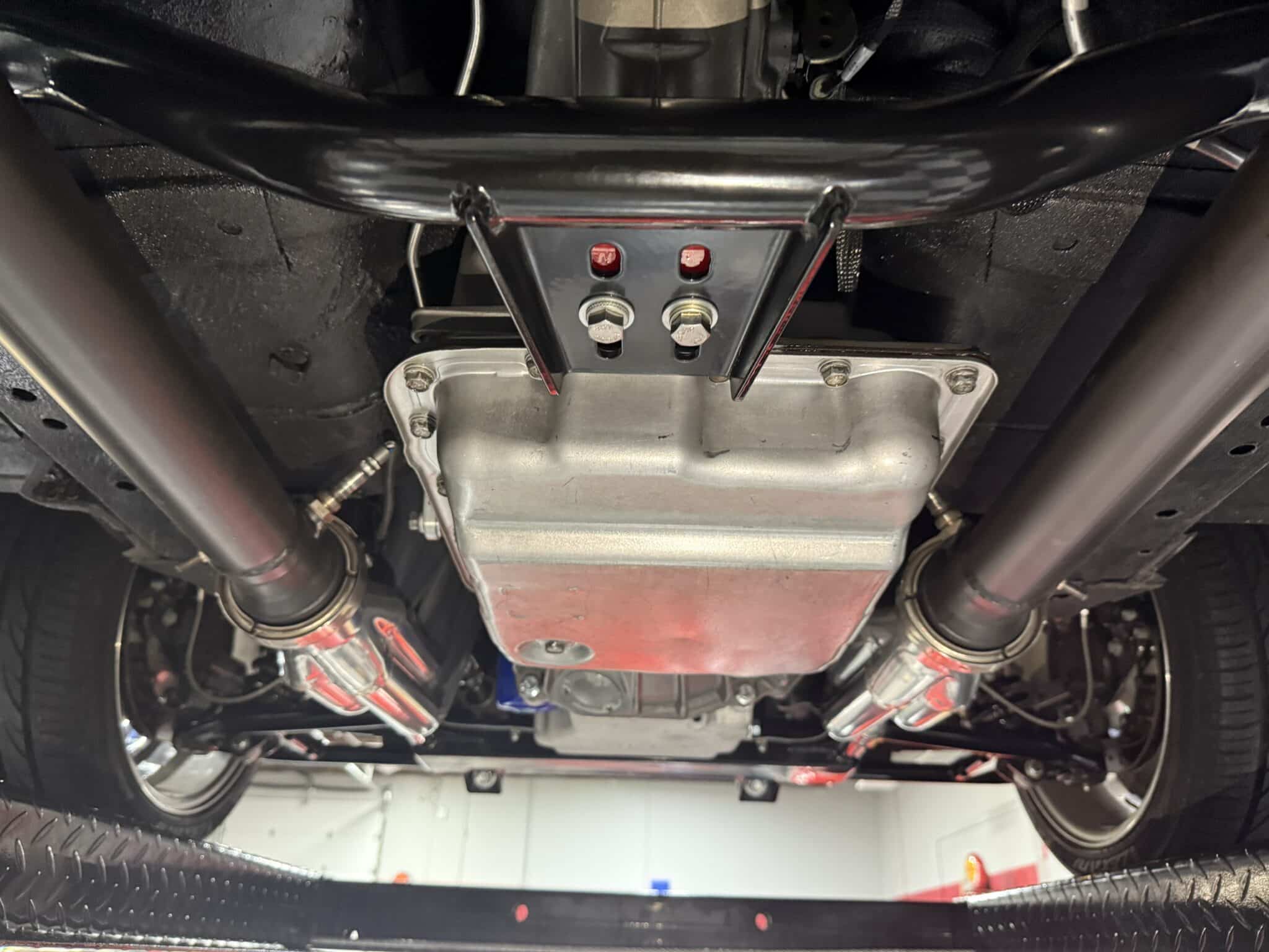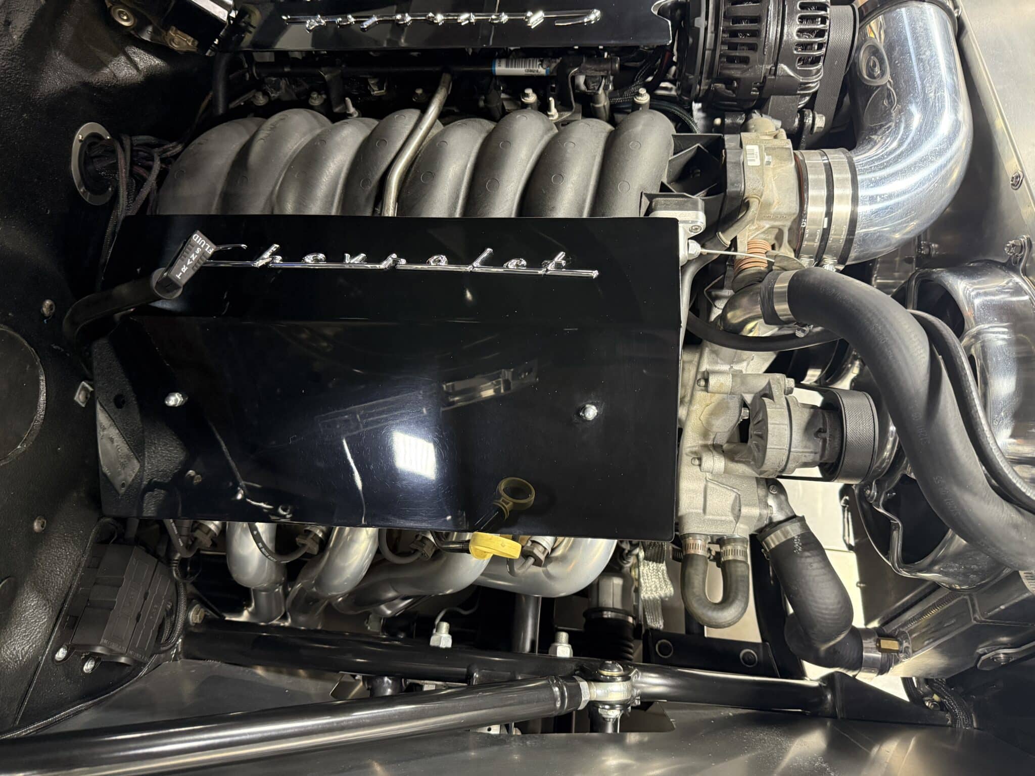 The engine bay is neatly detailed and highly finished, featuring custom sheet-metal inner fenders, Eddie Motorsports billet hood hinges with gas struts, an aluminum radiator with dual electric fans, a billet overflow tank, and a custom cold-air intake. Long-tube headers feed a 2.75-inch custom exhaust with V-band clamps, Flowmaster mufflers, and polished rectangular tips that exit cleanly in front of the rear wheels.