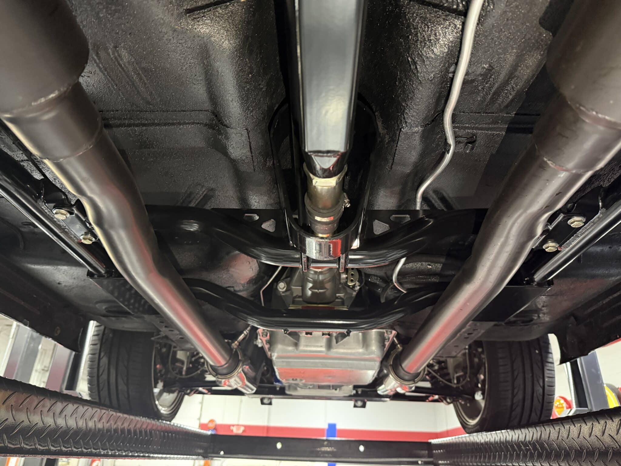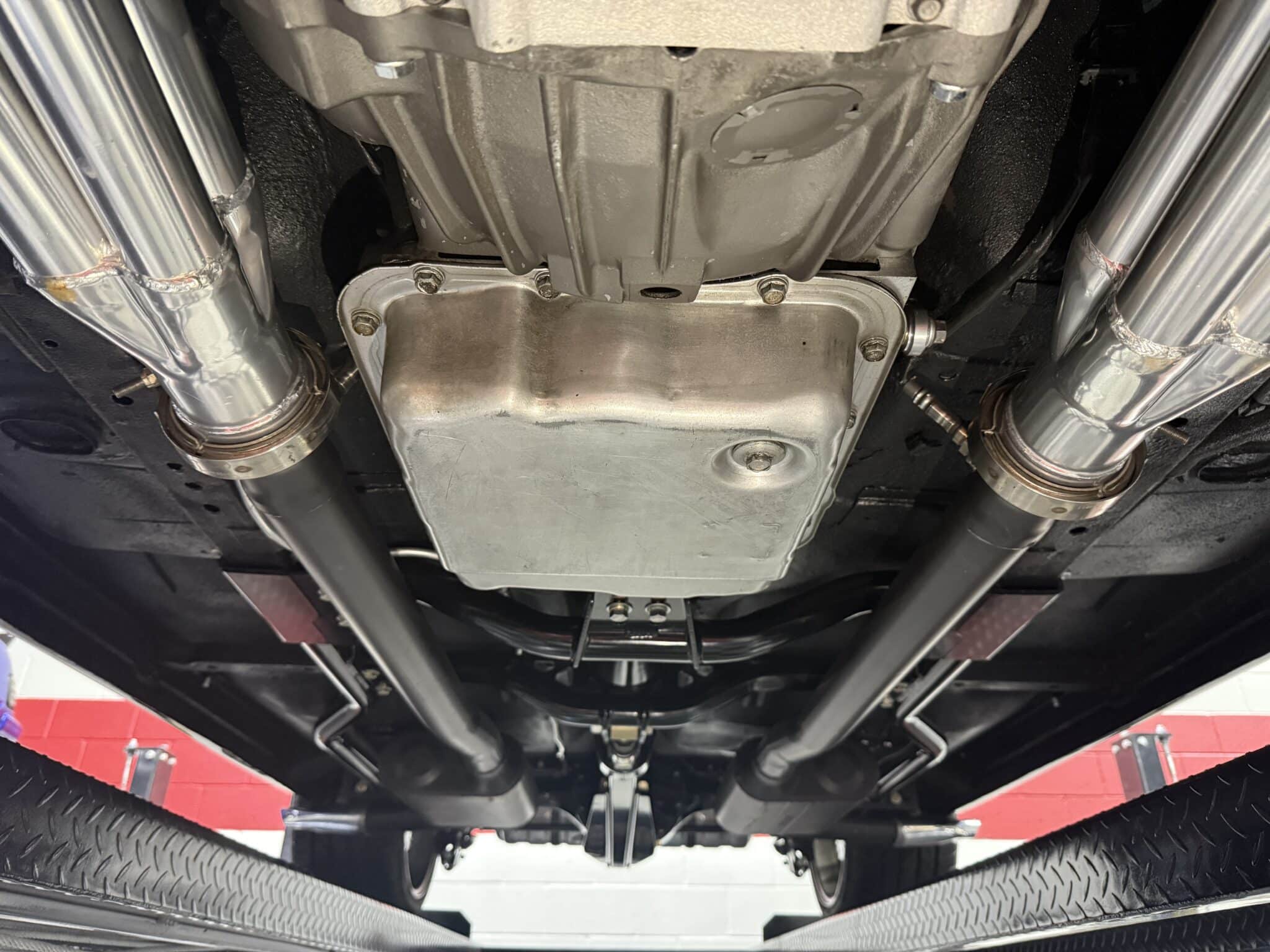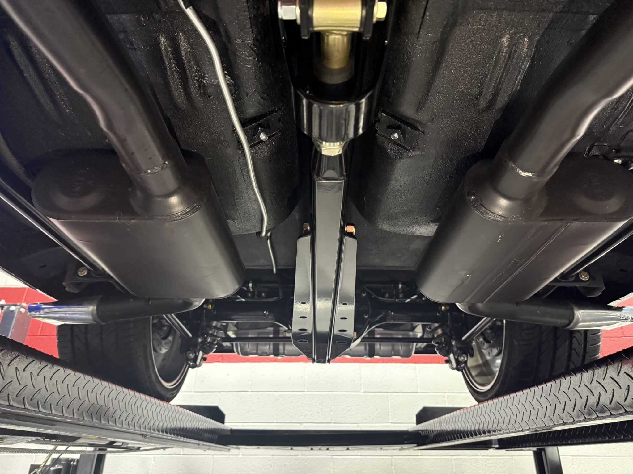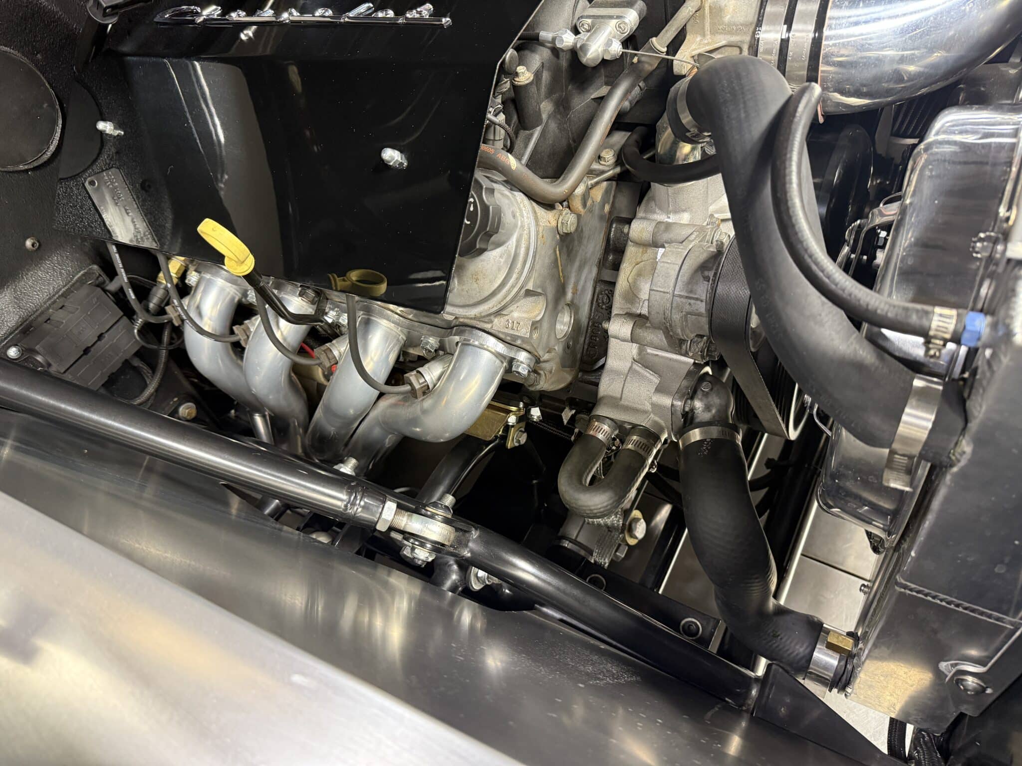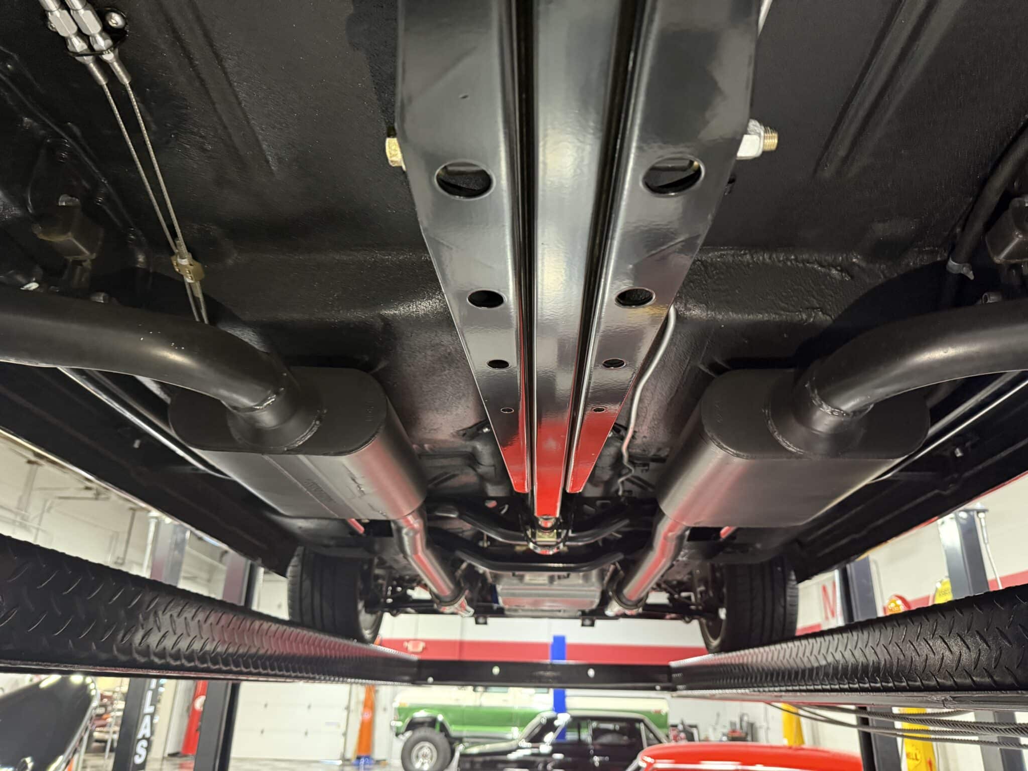 The engine bay is neatly detailed and highly finished, featuring custom sheet-metal inner fenders, Eddie Motorsports billet hood hinges with gas struts, an aluminum radiator with dual electric fans, a billet overflow tank, and a custom cold-air intake. Long-tube headers feed a 2.75-inch custom exhaust with V-band clamps, Flowmaster mufflers, and polished rectangular tips that exit cleanly in front of the rear wheels.