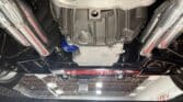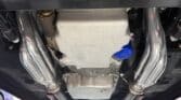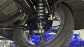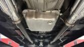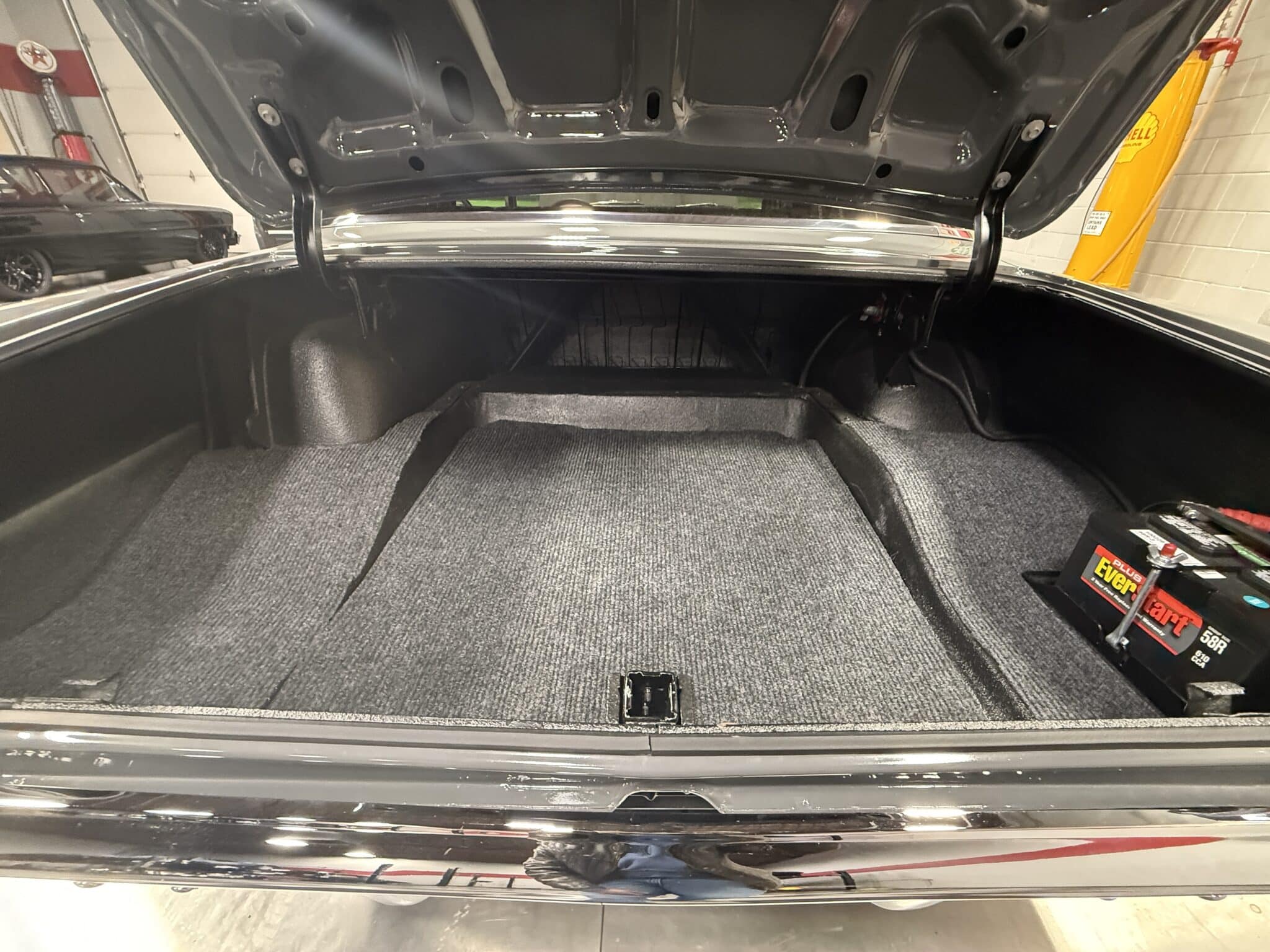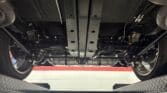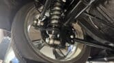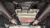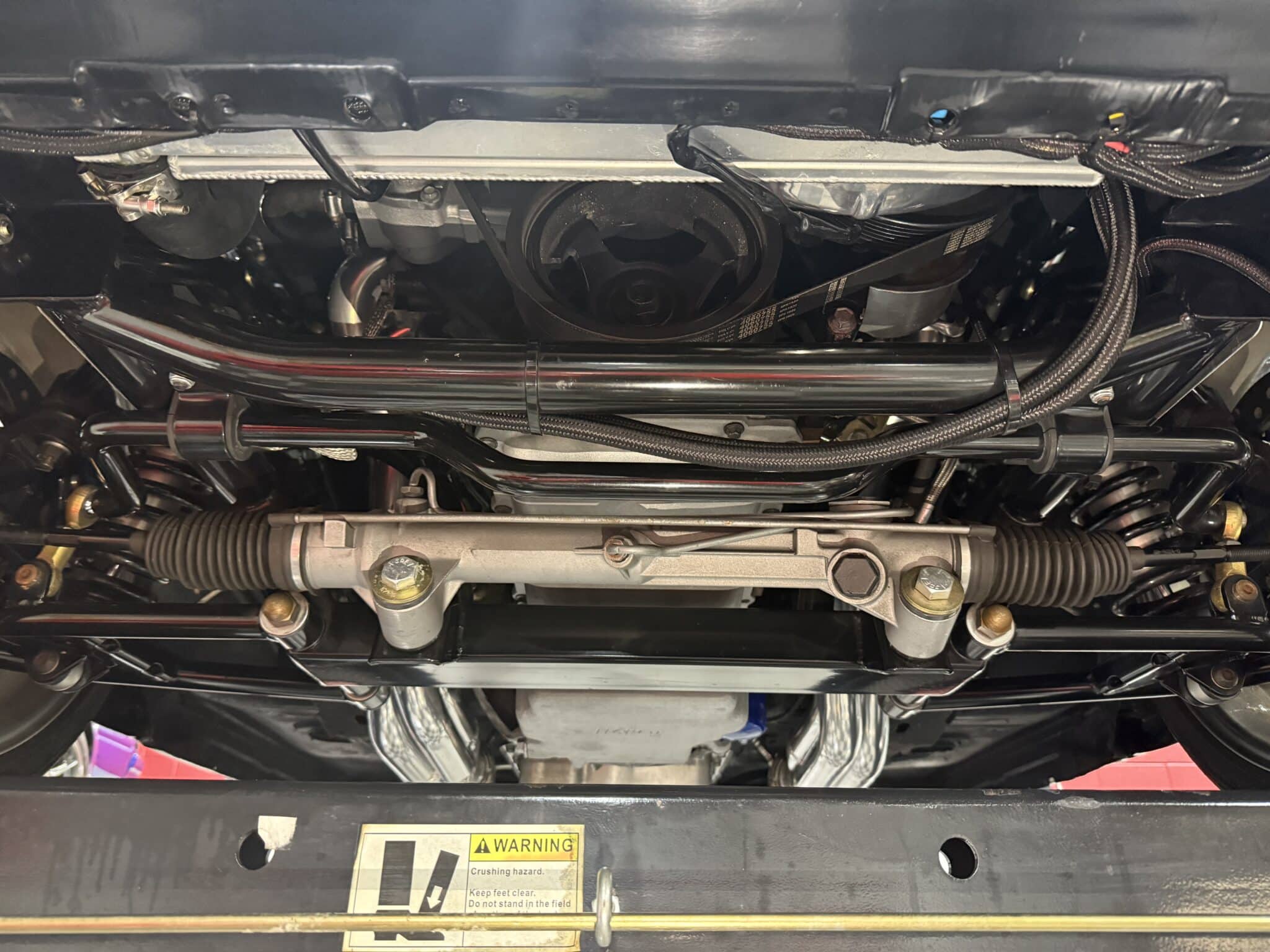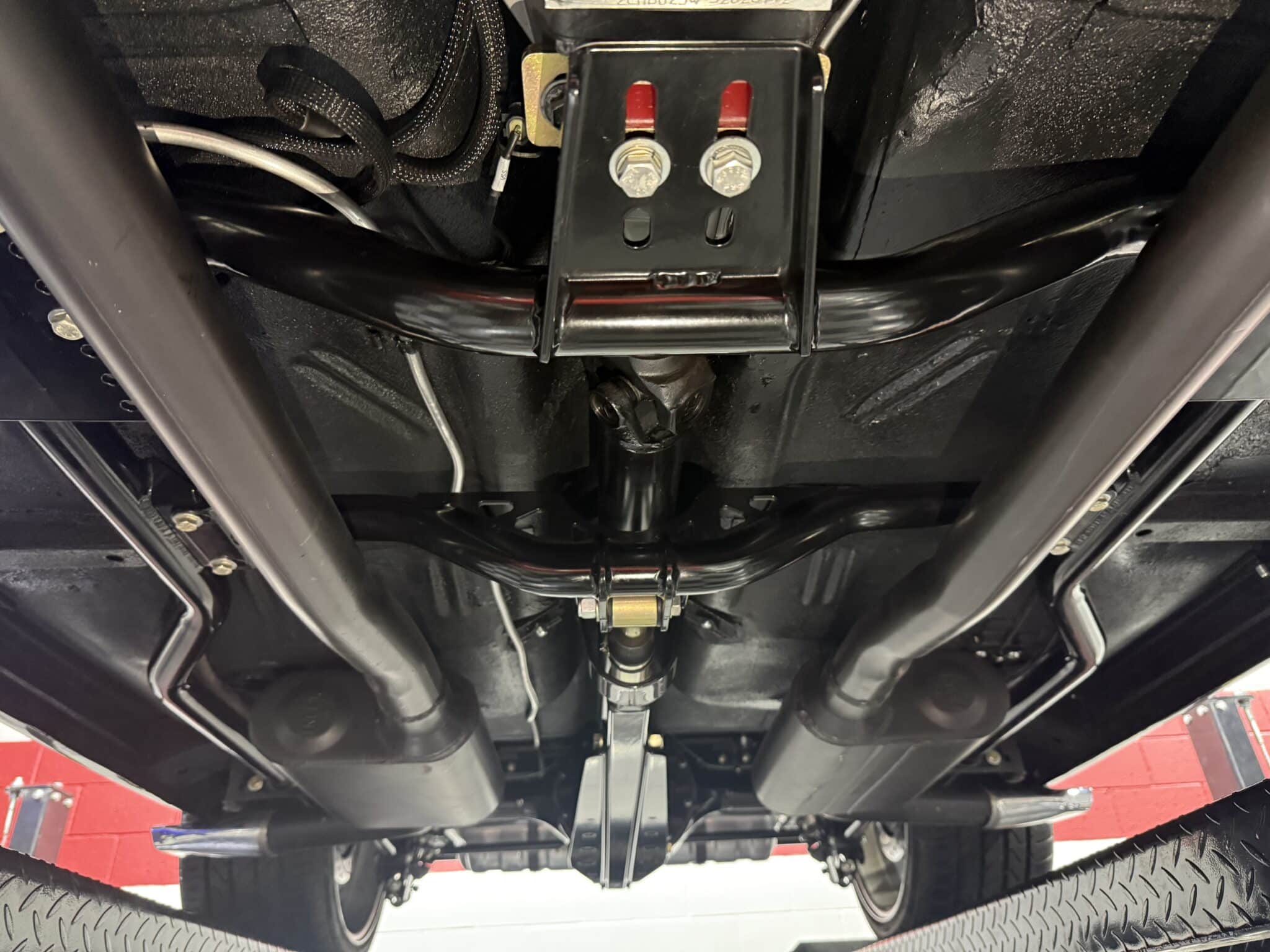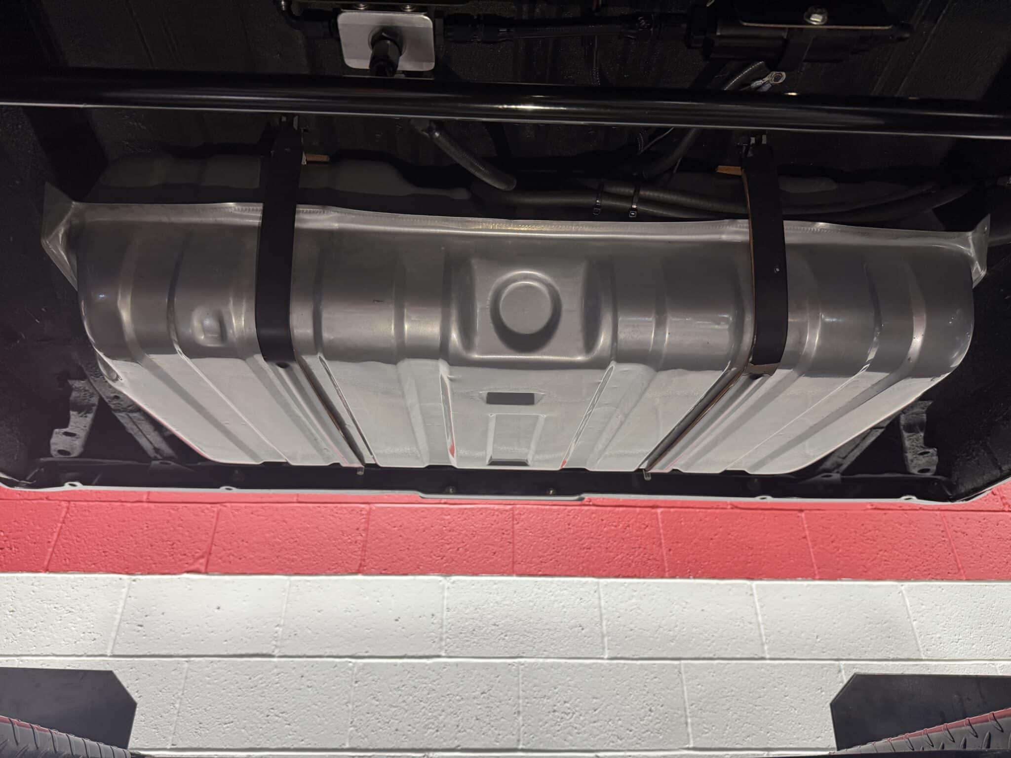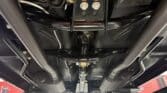 The engine bay is neatly detailed and highly finished, featuring custom sheet-metal inner fenders, Eddie Motorsports billet hood hinges with gas struts, an aluminum radiator with dual electric fans, a billet overflow tank, and a custom cold-air intake. Long-tube headers feed a 2.75-inch custom exhaust with V-band clamps, Flowmaster mufflers, and polished rectangular tips that exit cleanly in front of the rear wheels.