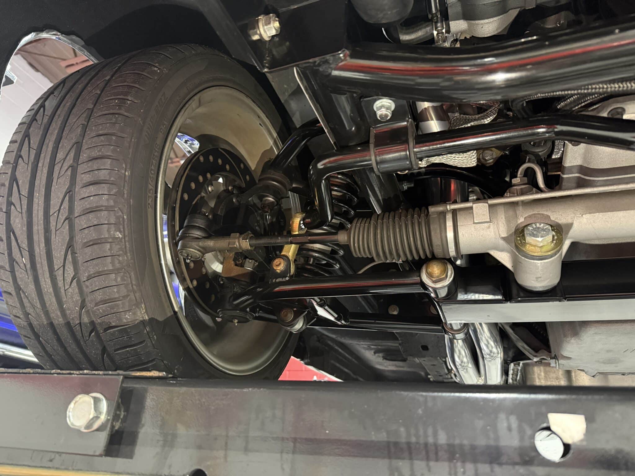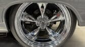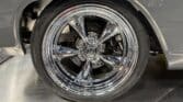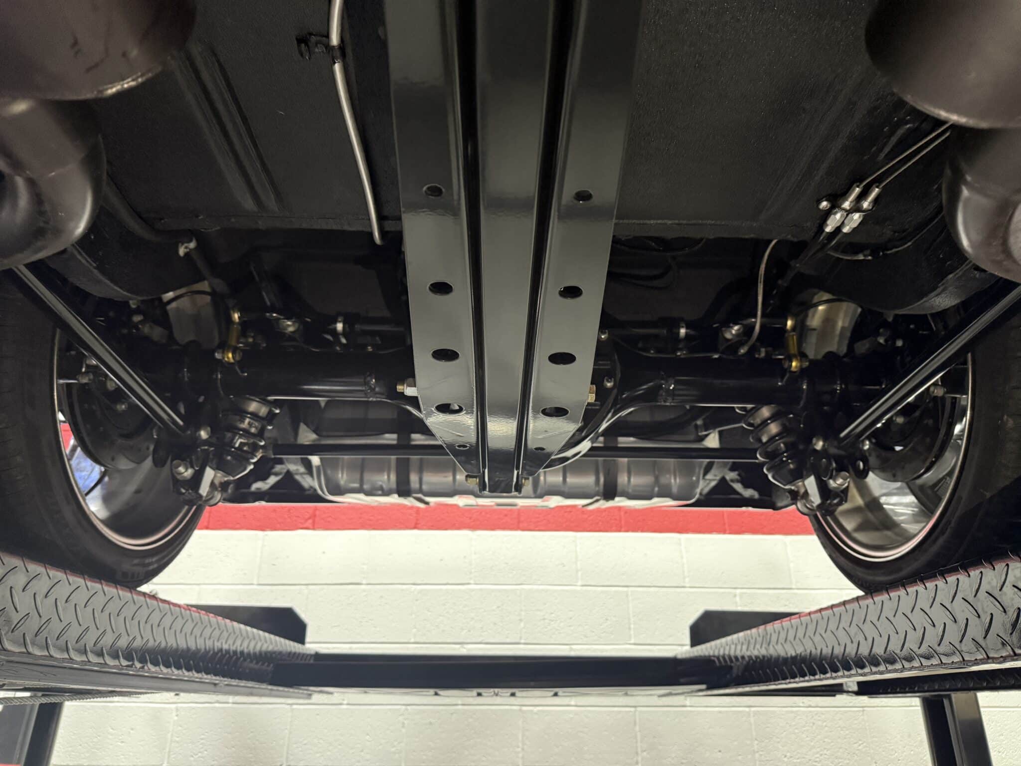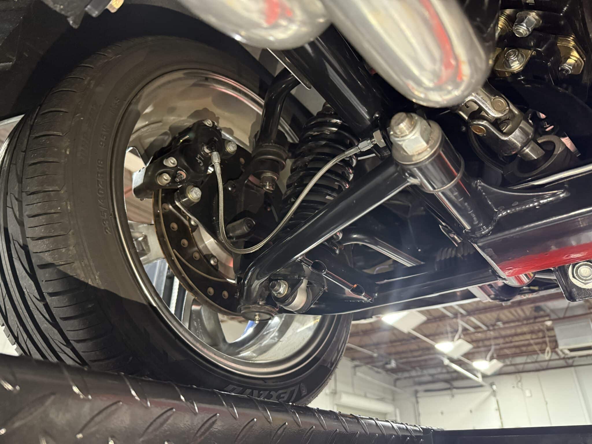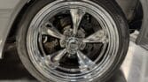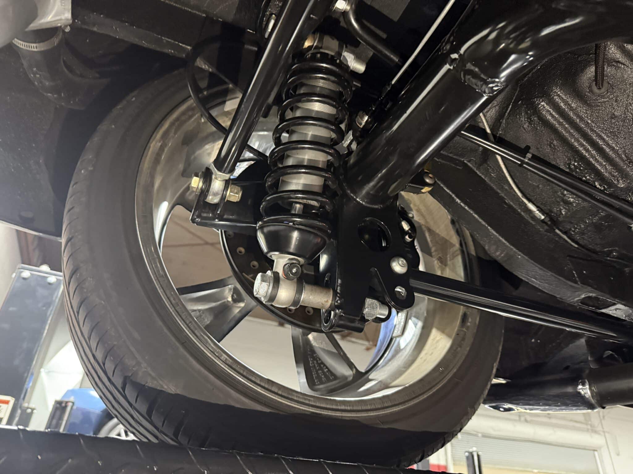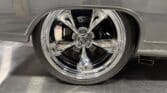 Handling and braking have been modernized with full tubular front and rear suspension, Ridetech adjustable coilovers, Wilwood 4-wheel disc brakes, and a Wilwood master cylinder with adjustable proportioning valve. The car sits on polished American Racing Torq Thrust II wheels—18-inch fronts wrapped in 235/40ZR18 tires and 20-inch rears wrapped in 275/35ZR20 tires. A Ford 9-inch rear end and mini-tubbed rear wheel housings complete the aggressive stance.