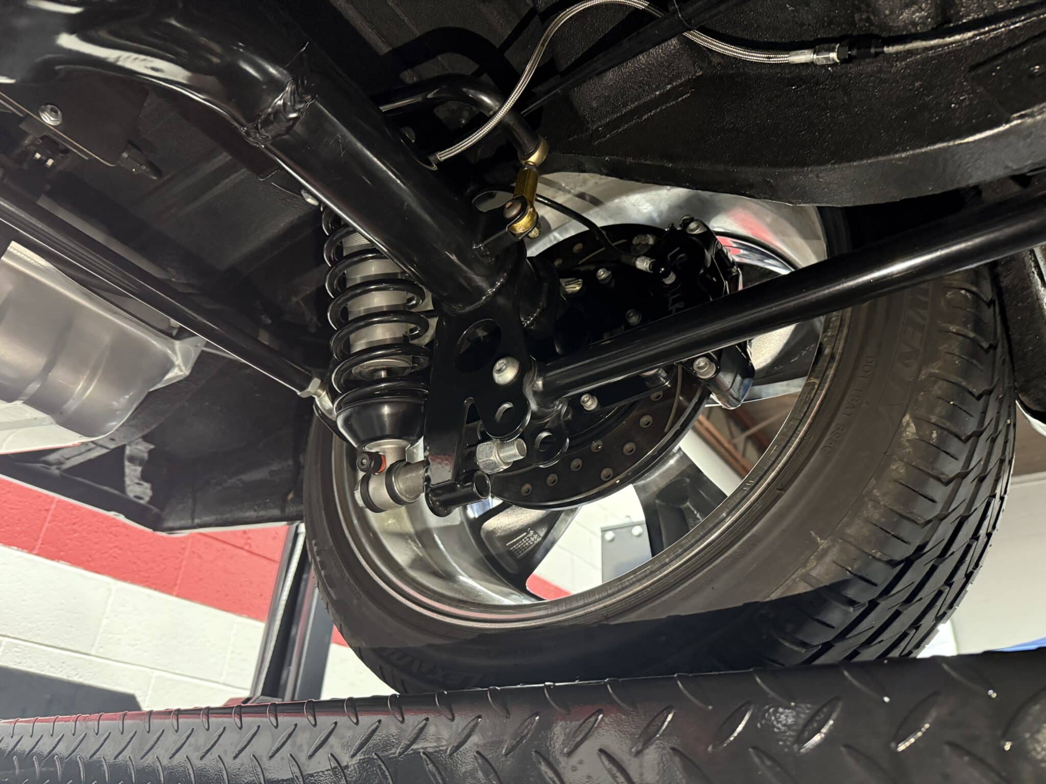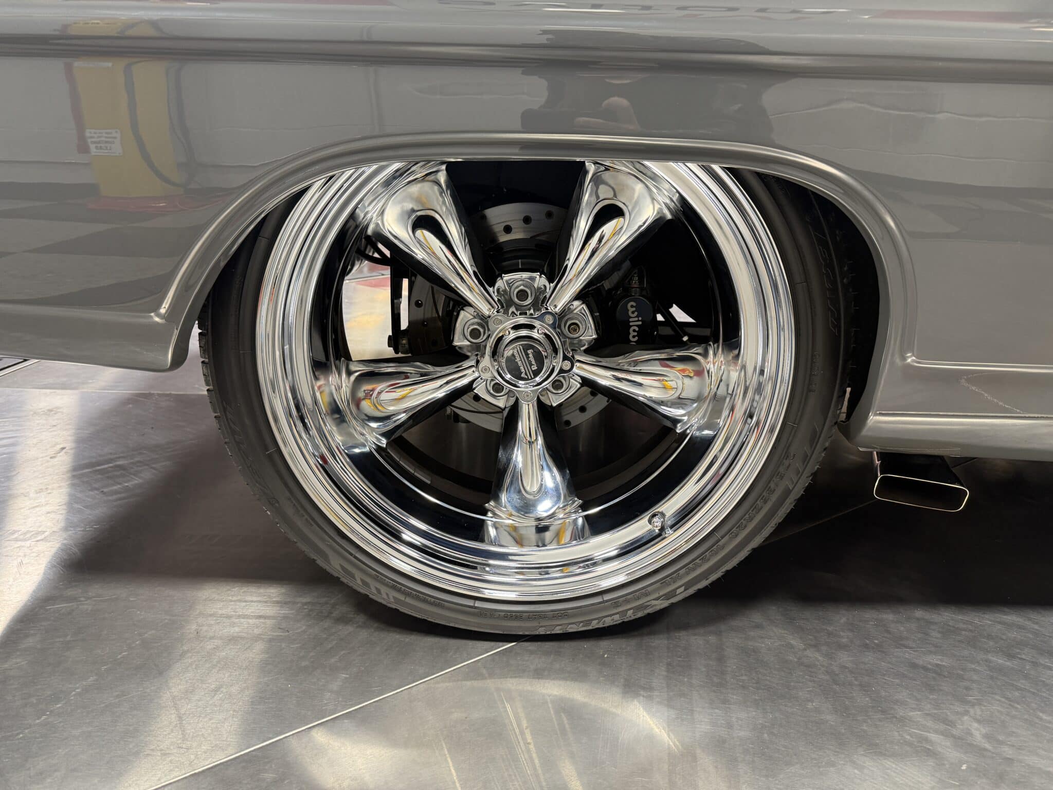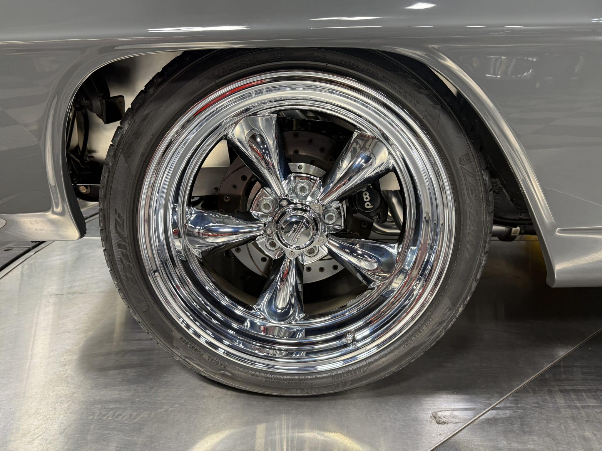 Handling and braking have been modernized with full tubular front and rear suspension, Ridetech adjustable coilovers, Wilwood 4-wheel disc brakes, and a Wilwood master cylinder with adjustable proportioning valve. The car sits on polished American Racing Torq Thrust II wheels—18-inch fronts wrapped in 235/40ZR18 tires and 20-inch rears wrapped in 275/35ZR20 tires. A Ford 9-inch rear end and mini-tubbed rear wheel housings complete the aggressive stance.