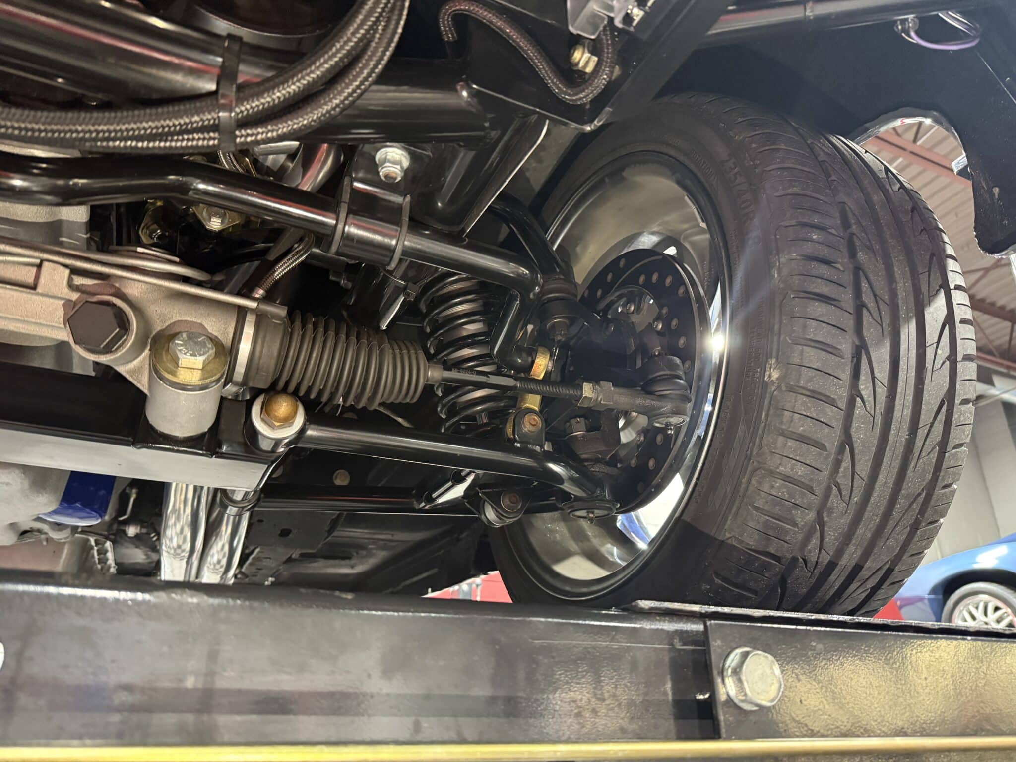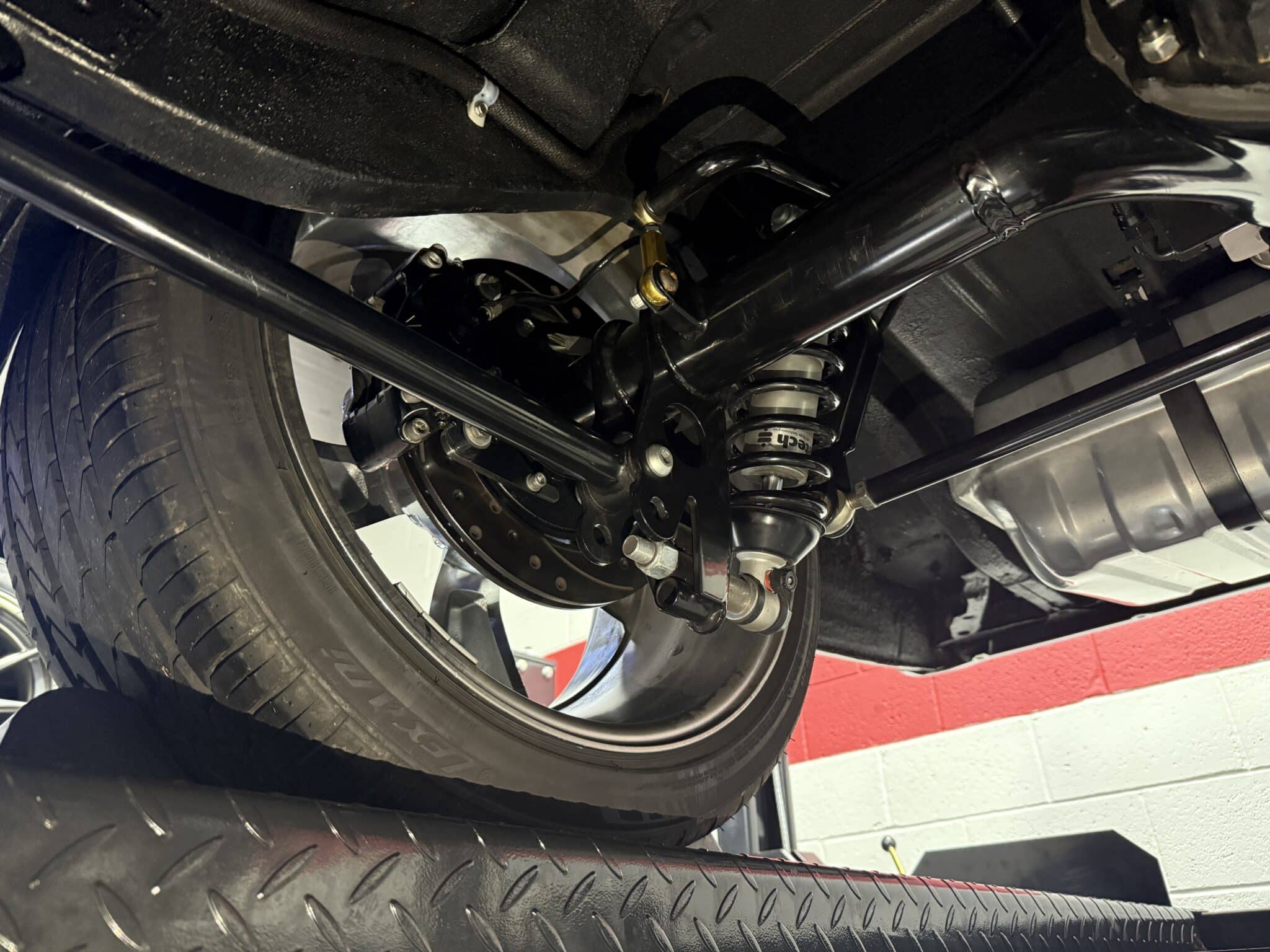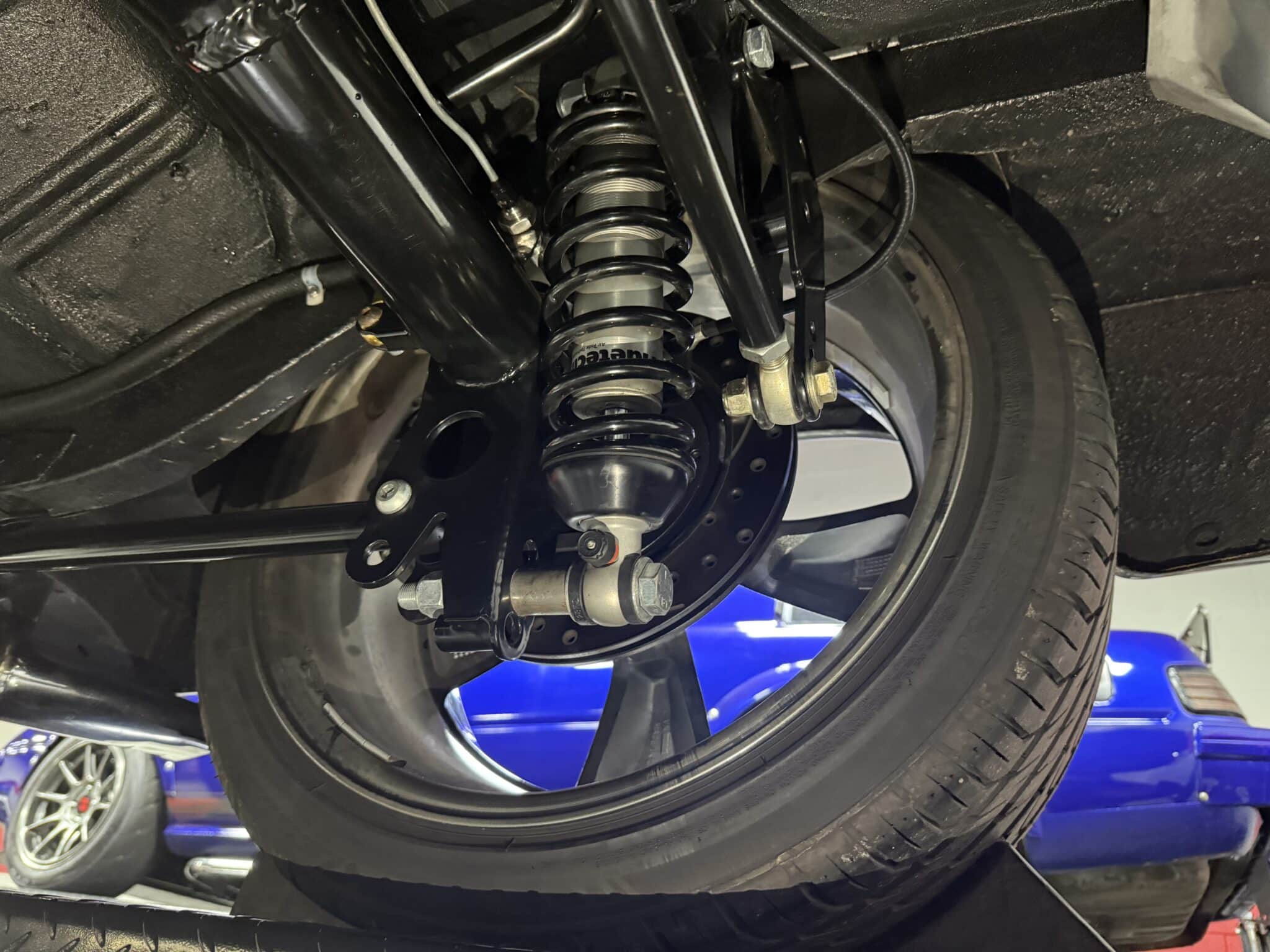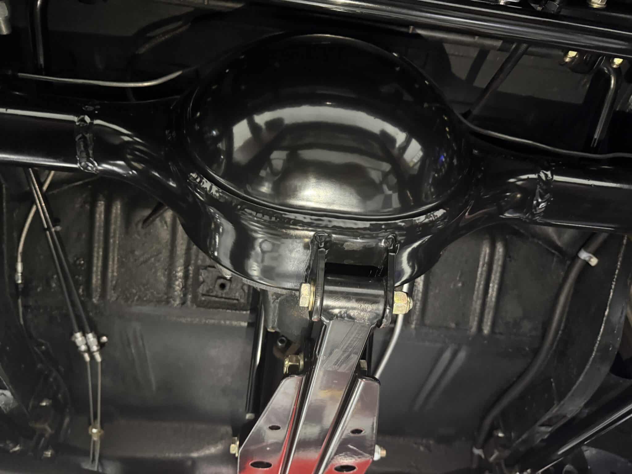 Handling and braking have been modernized with full tubular front and rear suspension, Ridetech adjustable coilovers, Wilwood 4-wheel disc brakes, and a Wilwood master cylinder with adjustable proportioning valve. The car sits on polished American Racing Torq Thrust II wheels—18-inch fronts wrapped in 235/40ZR18 tires and 20-inch rears wrapped in 275/35ZR20 tires. A Ford 9-inch rear end and mini-tubbed rear wheel housings complete the aggressive stance.