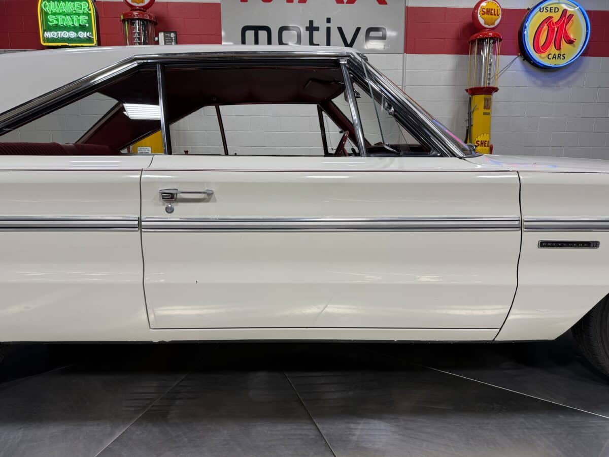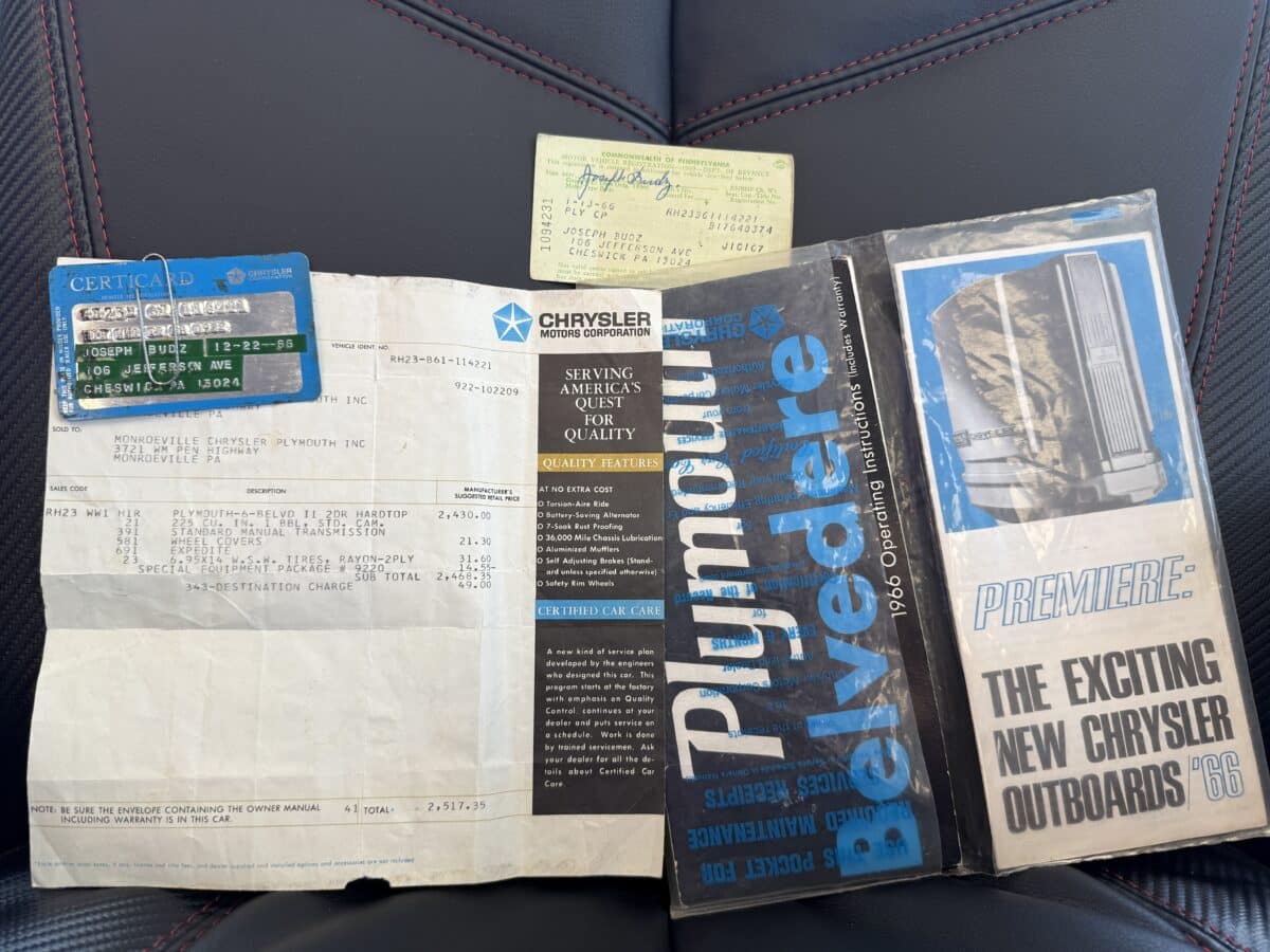If only cars could talk and tell their history, the stories they would have. This incredible time capsule 1966 Belvedere, luckily can talk and share her stories. This Belvedere can be traced with documentation back to it’s original owners who won a raffle on December 22, 1965. The family, like who most entered a raffle, did not expect to win. To their surprise when they won the raffle, they immediately made plans to sell the 2 door Belvedere you see pictured. The raffle winning family required a 4 door car to fit their growing family. Luckily a local family stepped up, and on 1-13-1966, all paperwork had been transferred, and the new family took ownership of their brand new 2 door white Belvedere when it arrived at Monroeville PA Chrysler Plymouth dealership. This same family meticulously cared for, stored, and maintained this gem since when the car was new in January 1966 until now. This is such a rare opportunity for a car with so well of a documented history to come up for sale. From grandfather, to son, to grandson, and now the Belvedere is looking for the right family to carry on the new legacy of it’s life. So you will be the fourth owner , but the first owner outside of a well documented same family car since 1966. This Belvedere in 1966 was light on factory options, but as time turned, that made this Belvedere more rare. Coming off the Chrysler assembly line, this Belvedere boasts a slant 6 225 Cubic Inch 6 cylinder engine, paired to a 3 speed manual transmission. The Belvedere is a three on the tree shifter, with manual brakes, and manual steering. Do not let the scaled down factory options from 1966 fool you, the meticulous maintenance through almost 60 years make this Belvedere a breeze to drive. The Belvedere still proudly wears her original paint, and her original interior. The interior is a sight to behold. The headliner, door panels, and seats are all in amazing condition. For a family to keep an interior this pristine for almost 60 years, shows the incredible amount of care that went into the car’s preservation. The floors were undercoated years back to protect the car. Although the undercoating is starting to peel, the floors are solid as can be. Please remember while viewing the underside of the car, that is a super solid original floor and trunk pan in this Belvedere. The undercoating is what you see peeling on the underside pictures. The family even made an additional trunk liner and placed it over the original trunk liner. Original fender tag and Chrysler Certicard are present and included with the car. Please look through the pictures and enjoy this timeless classic, but let’s not forget the amount of care and time it takes to keep a car this original through three generations of sons. Generational family car’s like this one rarely come up for sale. Any more documentation, or questions please reach out to the sale’s team, and you can see more pictures and videos at www.maxmotive.com