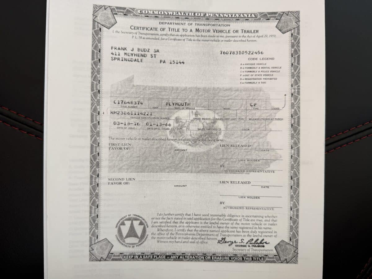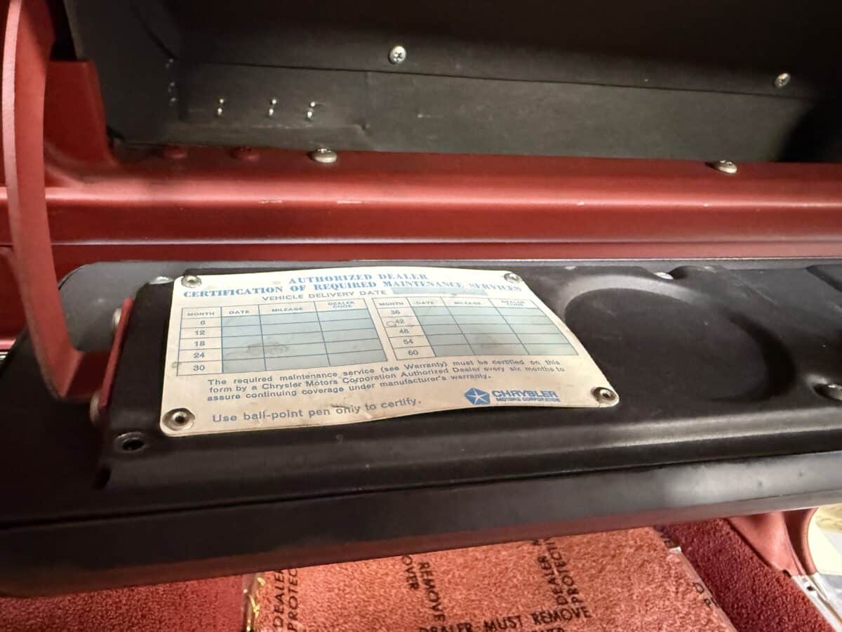 • Original dealer receipt showing delivery to Monroeville PA Chrysler Plymouth dealership