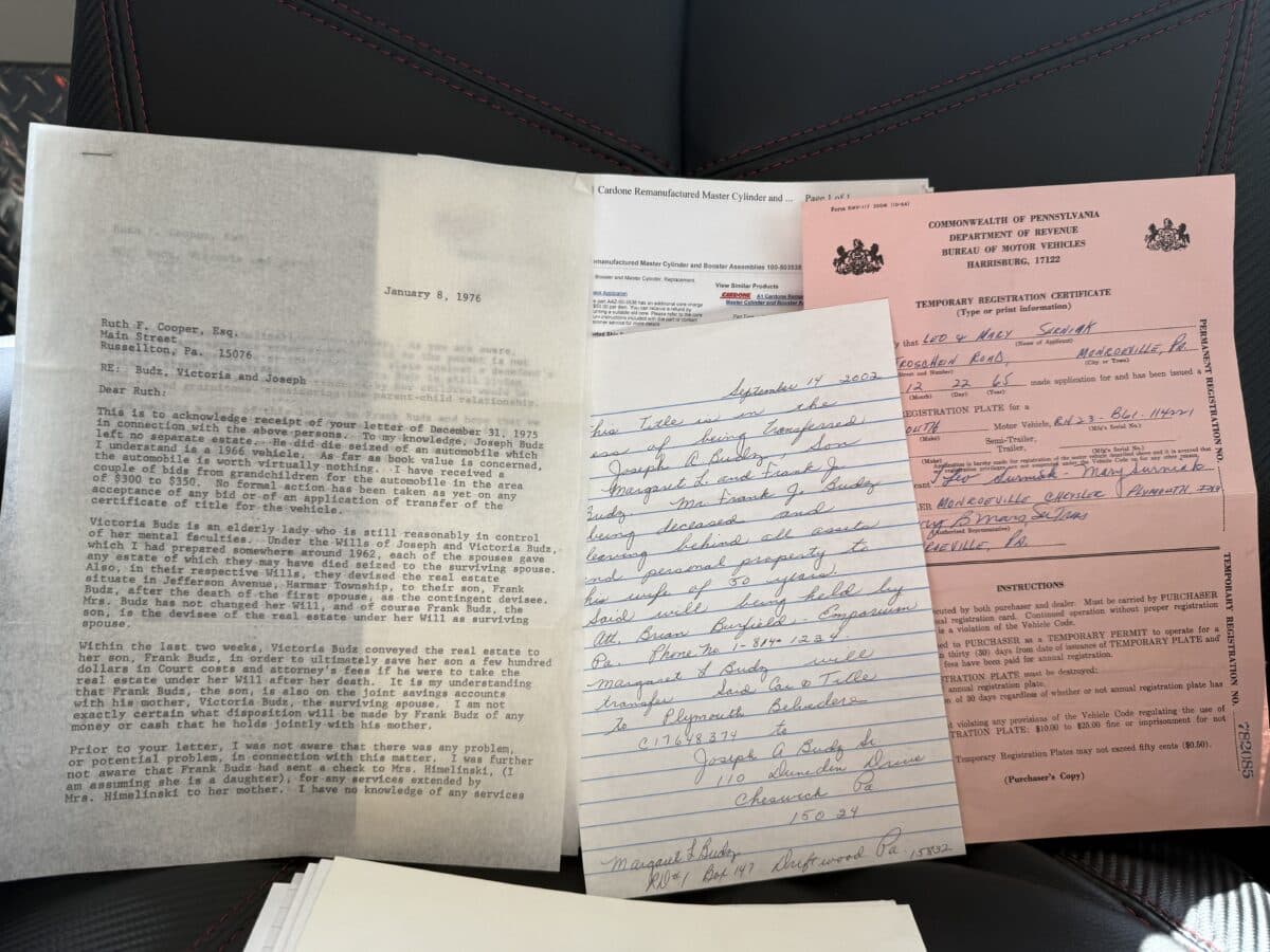 • Handwritten paperwork from 2002 showing acknowledging ownership transfer from son to grandson of original owner (third owner of car, all within same family)