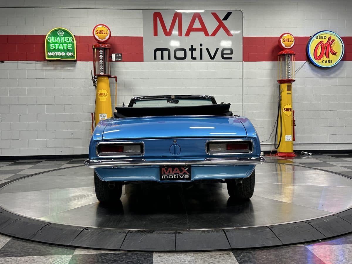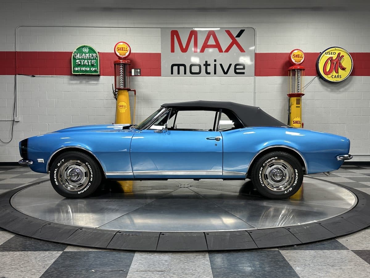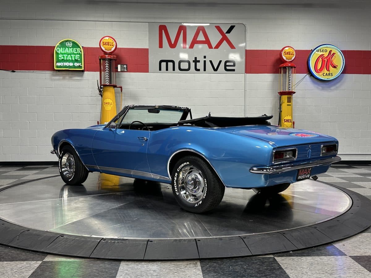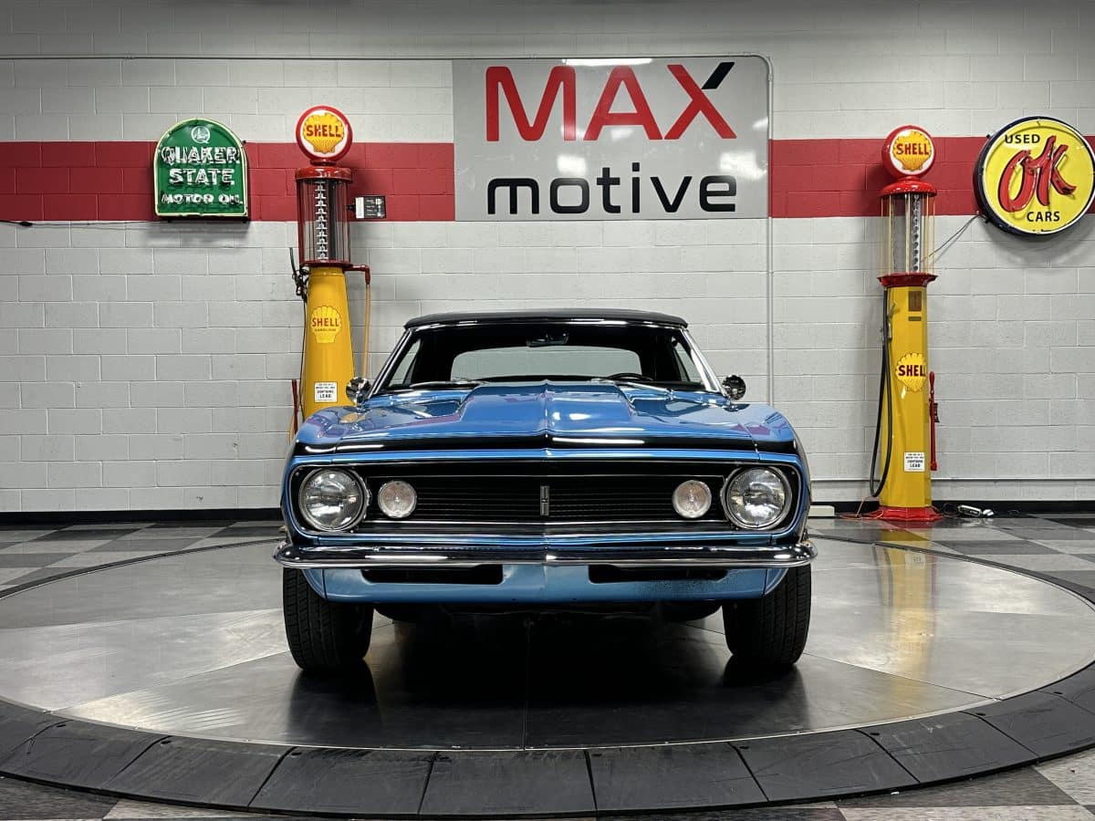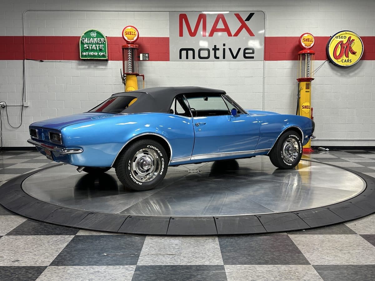Now offered at MaxMotive, a true classic 1967 Chevrolet Camaro Convertible with both traditional and modern upgrades. The fresh 355ci small block has been balanced with the clutch and flywheel, and fitted with Wiseco forged flat top pistons and a steel crank. A special grind Sig Erson cam activates Harland Sharp roller rockers. On top, a 750cfm Holley carb feeds an Edelbrock Victor Jr intake and Bowtie heads. Hooker headers send the exhaust out through dual pipes, and the sound is just right. A four-speed manual transmission with Hurst T-handle shifter adds to the vintage muscle vibe. The interior has the classic Camaro feel with a full set of Dakota Digital gauges and a Custom Autosound radio seamlessly integrated into the dash. The fresh build has been driven approximately 40 miles; in fact the digital speedometer has not yet been calibrated. The paint is a beautiful Marina Blue, combined with the black vinyl interior and rally wheels, delivers a classic Camaro look, and a functional cowl scoop adorns the hood. Those rallies are wrapped in staggered sized Cooper Cobra white letter radial tires, 215/70R15 in front and meaty 245/60R15s in the rear. The 1967 Chevrolet Camaro Convertible is literally an icon in the classic car and hot rodding worlds, and this outstanding example is freshly built with quality components, and is available now ready to cruise. Please be sure to see the detailed photos at www.maxmotive.com