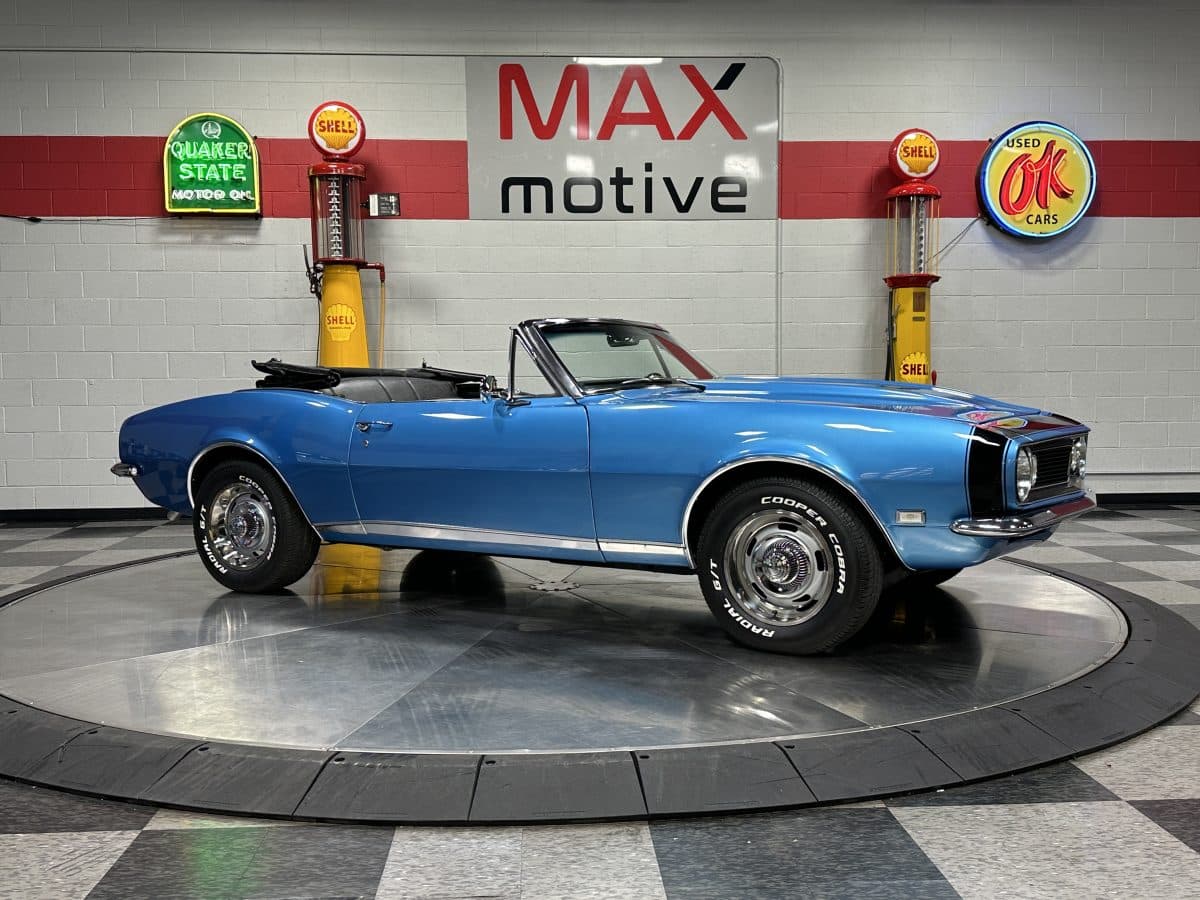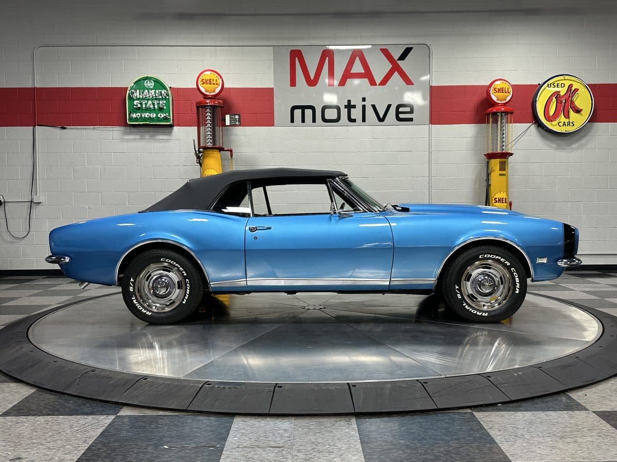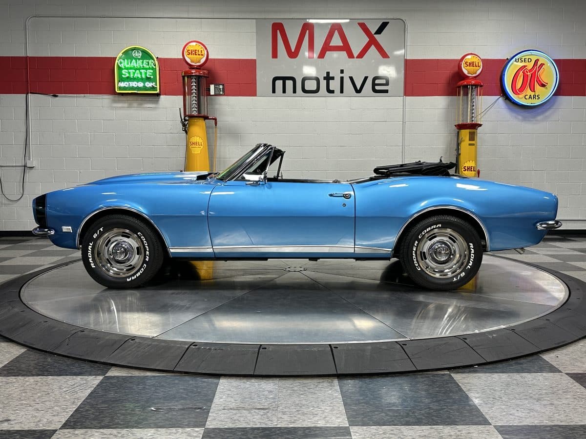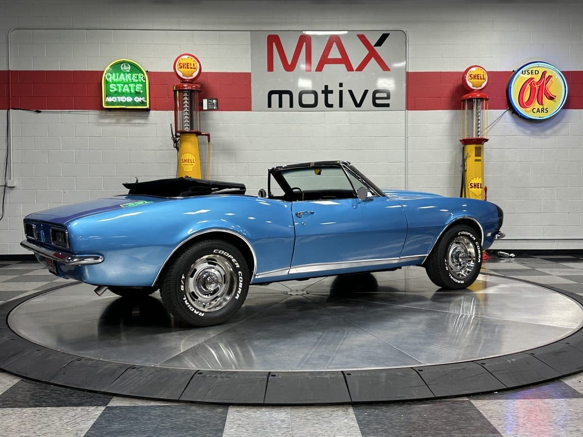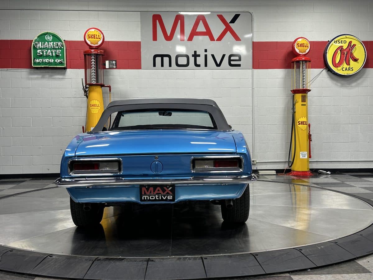 Now offered at MaxMotive, a true classic 1967 Chevrolet Camaro Convertible with both traditional and modern upgrades. The fresh 355ci small block has been balanced with the clutch and flywheel, and fitted with Wiseco forged flat top pistons and a steel crank. A special grind Sig Erson cam activates Harland Sharp roller rockers. On top, a 750cfm Holley carb feeds an Edelbrock Victor Jr intake and Bowtie heads. Hooker headers send the exhaust out through dual pipes, and the sound is just right. A four-speed manual transmission with Hurst T-handle shifter adds to the vintage muscle vibe. The interior has the classic Camaro feel with a full set of Dakota Digital gauges and a Custom Autosound radio seamlessly integrated into the dash. The fresh build has been driven approximately 40 miles; in fact the digital speedometer has not yet been calibrated. The paint is a beautiful Marina Blue, combined with the black vinyl interior and rally wheels, delivers a classic Camaro look, and a functional cowl scoop adorns the hood. Those rallies are wrapped in staggered sized Cooper Cobra white letter radial tires, 215/70R15 in front and meaty 245/60R15s in the rear. The 1967 Chevrolet Camaro Convertible is literally an icon in the classic car and hot rodding worlds, and this outstanding example is freshly built with quality components, and is available now ready to cruise. Please be sure to see the detailed photos at www.maxmotive.com