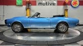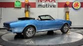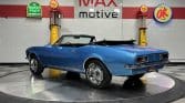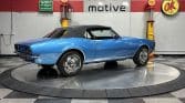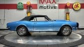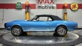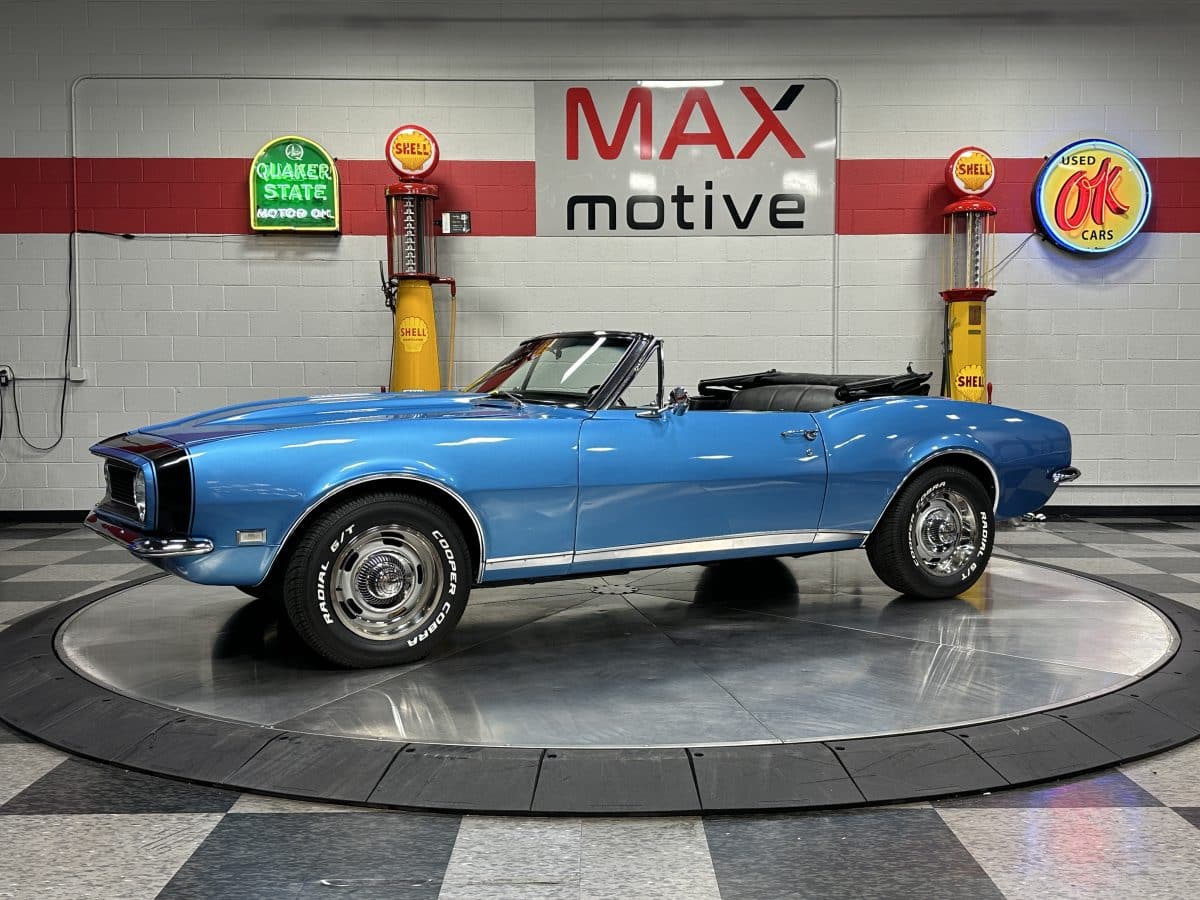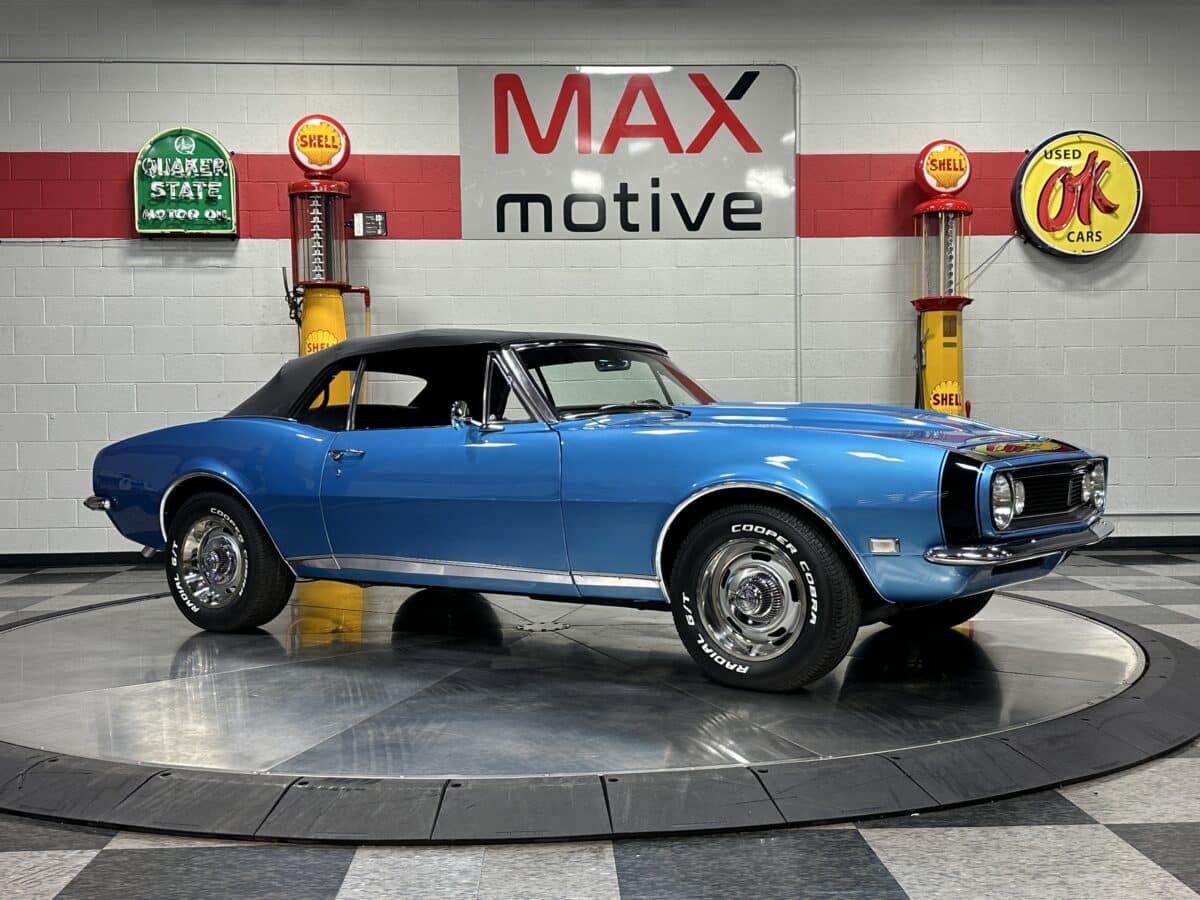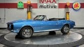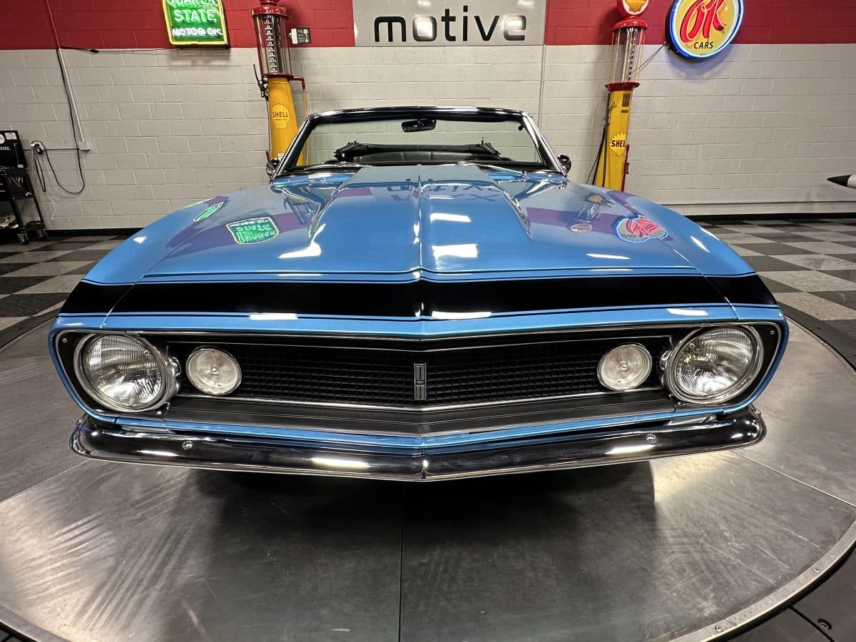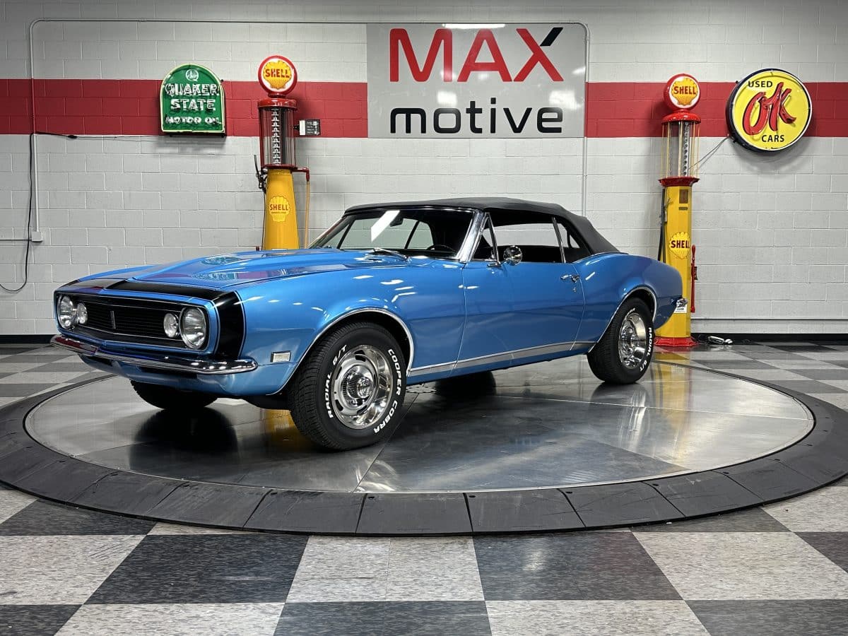 Now offered at MaxMotive, a true classic 1967 Chevrolet Camaro Convertible with both traditional and modern upgrades. The fresh 355ci small block has been balanced with the clutch and flywheel, and fitted with Wiseco forged flat top pistons and a steel crank. A special grind Sig Erson cam activates Harland Sharp roller rockers. On top, a 750cfm Holley carb feeds an Edelbrock Victor Jr intake and Bowtie heads. Hooker headers send the exhaust out through dual pipes, and the sound is just right. A four-speed manual transmission with Hurst T-handle shifter adds to the vintage muscle vibe. The interior has the classic Camaro feel with a full set of Dakota Digital gauges and a Custom Autosound radio seamlessly integrated into the dash. The fresh build has been driven approximately 40 miles; in fact the digital speedometer has not yet been calibrated. The paint is a beautiful Marina Blue, combined with the black vinyl interior and rally wheels, delivers a classic Camaro look, and a functional cowl scoop adorns the hood. Those rallies are wrapped in staggered sized Cooper Cobra white letter radial tires, 215/70R15 in front and meaty 245/60R15s in the rear. The 1967 Chevrolet Camaro Convertible is literally an icon in the classic car and hot rodding worlds, and this outstanding example is freshly built with quality components, and is available now ready to cruise. Please be sure to see the detailed photos at www.maxmotive.com