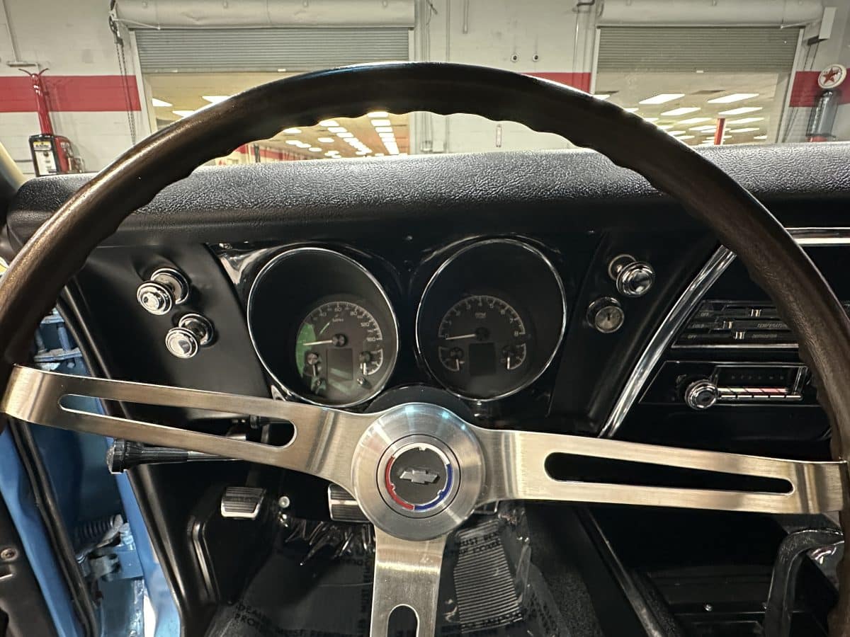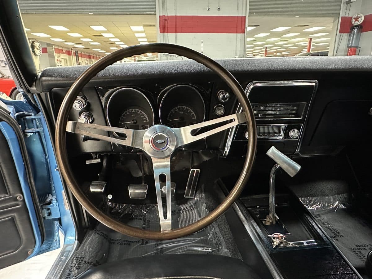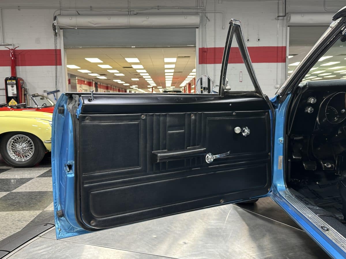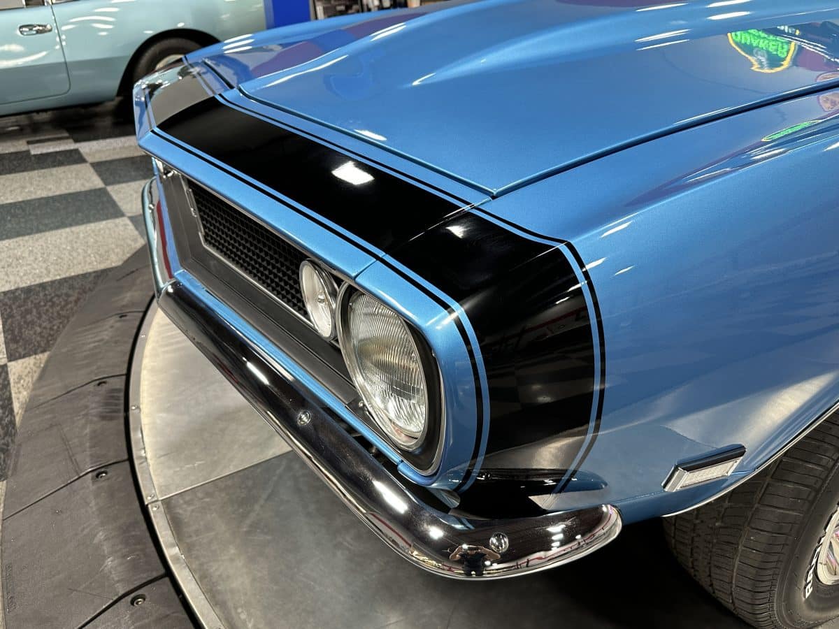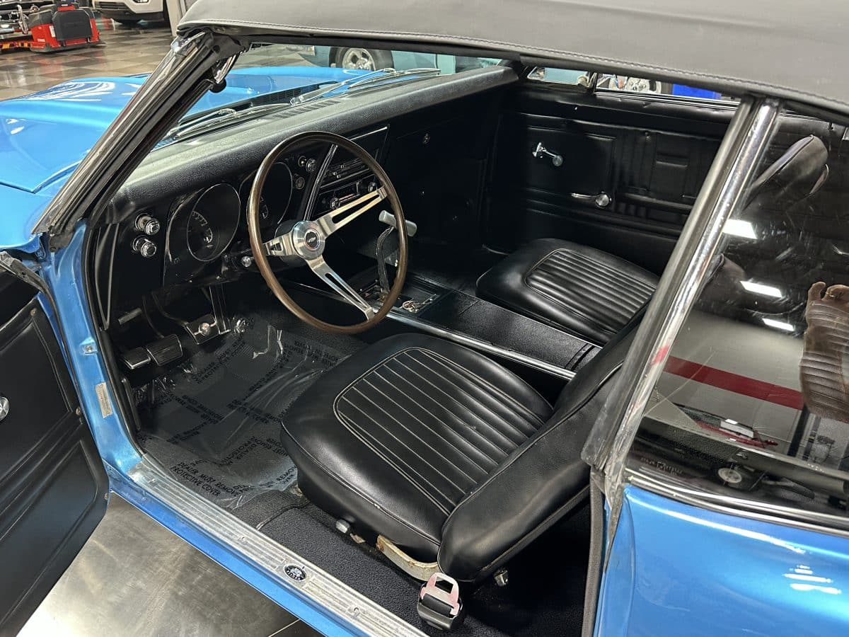 Now offered at MaxMotive, a true classic 1967 Chevrolet Camaro Convertible with both traditional and modern upgrades. The fresh 355ci small block has been balanced with the clutch and flywheel, and fitted with Wiseco forged flat top pistons and a steel crank. A special grind Sig Erson cam activates Harland Sharp roller rockers. On top, a 750cfm Holley carb feeds an Edelbrock Victor Jr intake and Bowtie heads. Hooker headers send the exhaust out through dual pipes, and the sound is just right. A four-speed manual transmission with Hurst T-handle shifter adds to the vintage muscle vibe. The interior has the classic Camaro feel with a full set of Dakota Digital gauges and a Custom Autosound radio seamlessly integrated into the dash. The fresh build has been driven approximately 40 miles; in fact the digital speedometer has not yet been calibrated. The paint is a beautiful Marina Blue, combined with the black vinyl interior and rally wheels, delivers a classic Camaro look, and a functional cowl scoop adorns the hood. Those rallies are wrapped in staggered sized Cooper Cobra white letter radial tires, 215/70R15 in front and meaty 245/60R15s in the rear. The 1967 Chevrolet Camaro Convertible is literally an icon in the classic car and hot rodding worlds, and this outstanding example is freshly built with quality components, and is available now ready to cruise. Please be sure to see the detailed photos at www.maxmotive.com