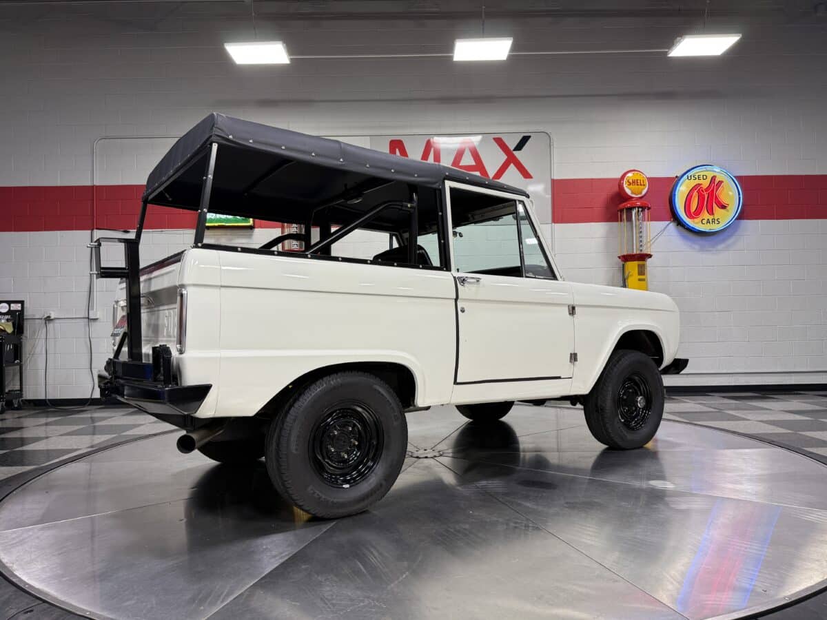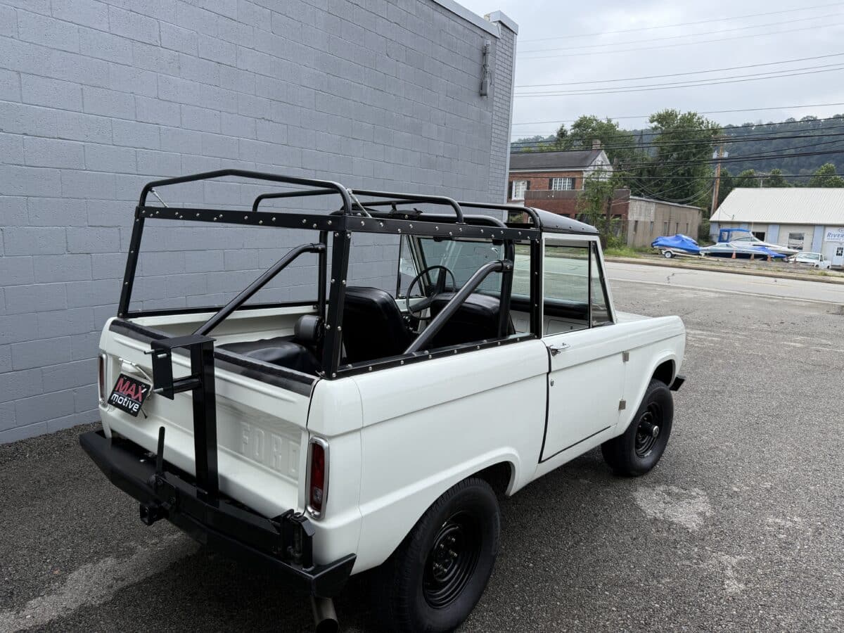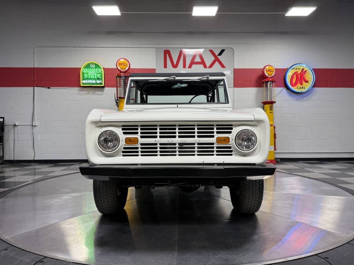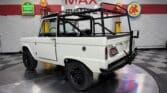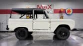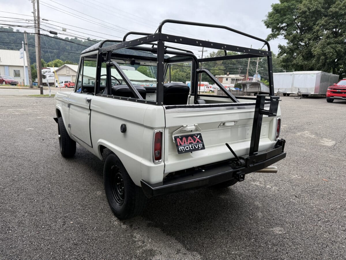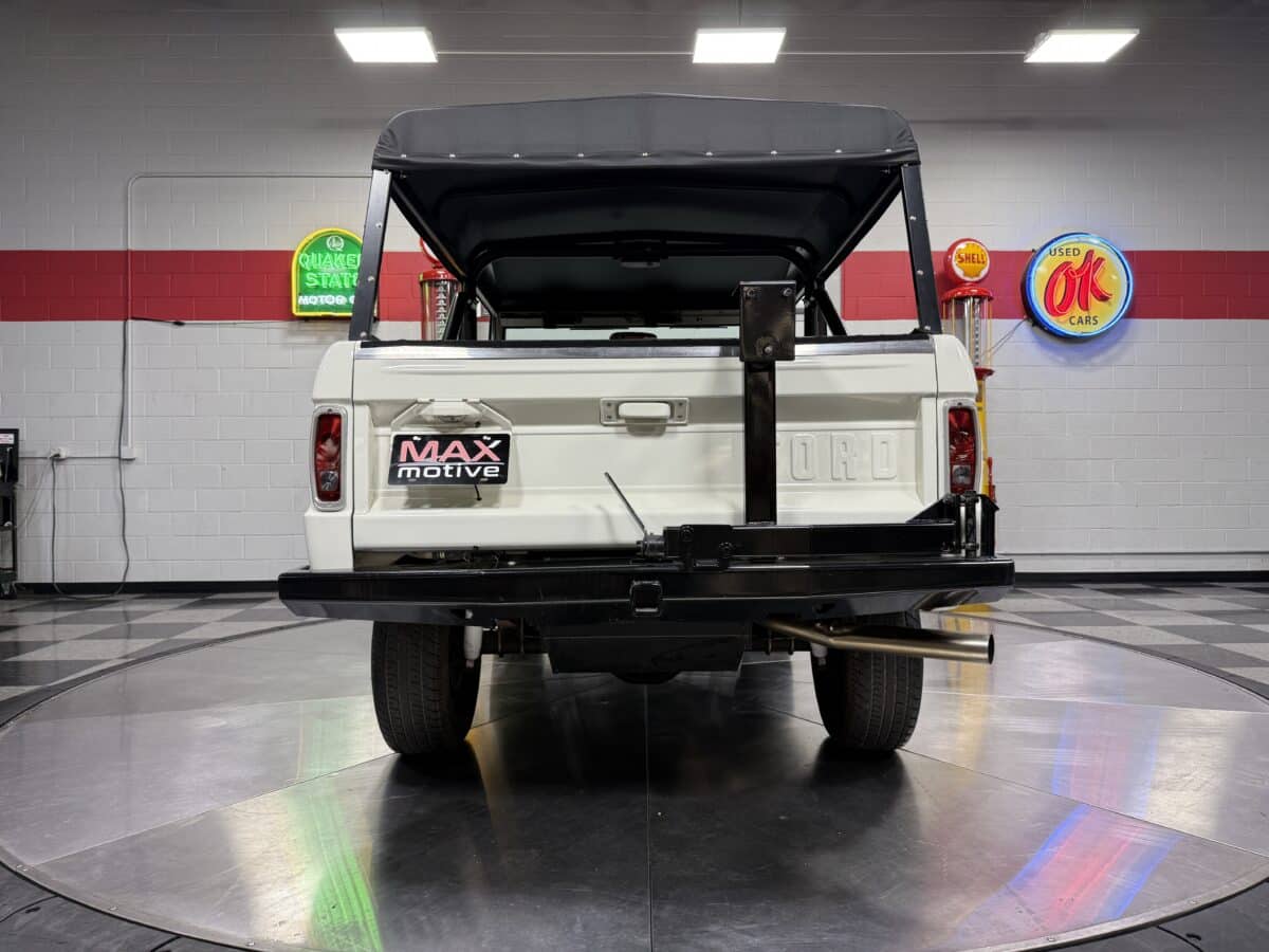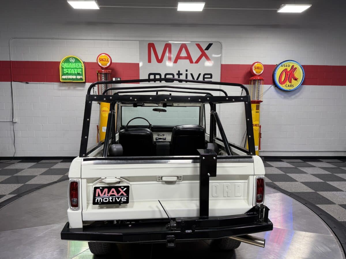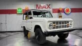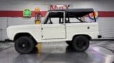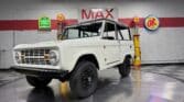 Maxmotive is pleased to offer this stunning, rugged, ready to turn heads 1968 Bronco. This Bronco has received a nice boost in horsepower from the Foxbody 5.0 V-8 engine that was swapped in from a 1989 Mustang. The top end of the engine was gone over prior to install, and shorty headers were added to ensure optimal performance and sound. Speaking of engine sound, the engine proudly rumbles through a Magnaflow muffler. Under the hood, an upgraded aluminum radiator makes sure that 5.0 engine stays nice and cool. The soft top is new, within the last 18 months. The inside rear wheels were texture sprayed in matching white paint. Heavy duty aftermarket bumpers front and rear, with a matching heavy duty fifth wheel spare in the back of the Bronco. New and updated front wiper motor system, Retrosound aftermarket radio, and aftermarket speakers make sure driving the Bronco is just as enjoyable as staring at the Bronco. The front driveshaft is not installed currently, so the Bronco is currently set up as a two wheel drive Bronco. For more pictures and information, please visit our website www.maxmotive.com