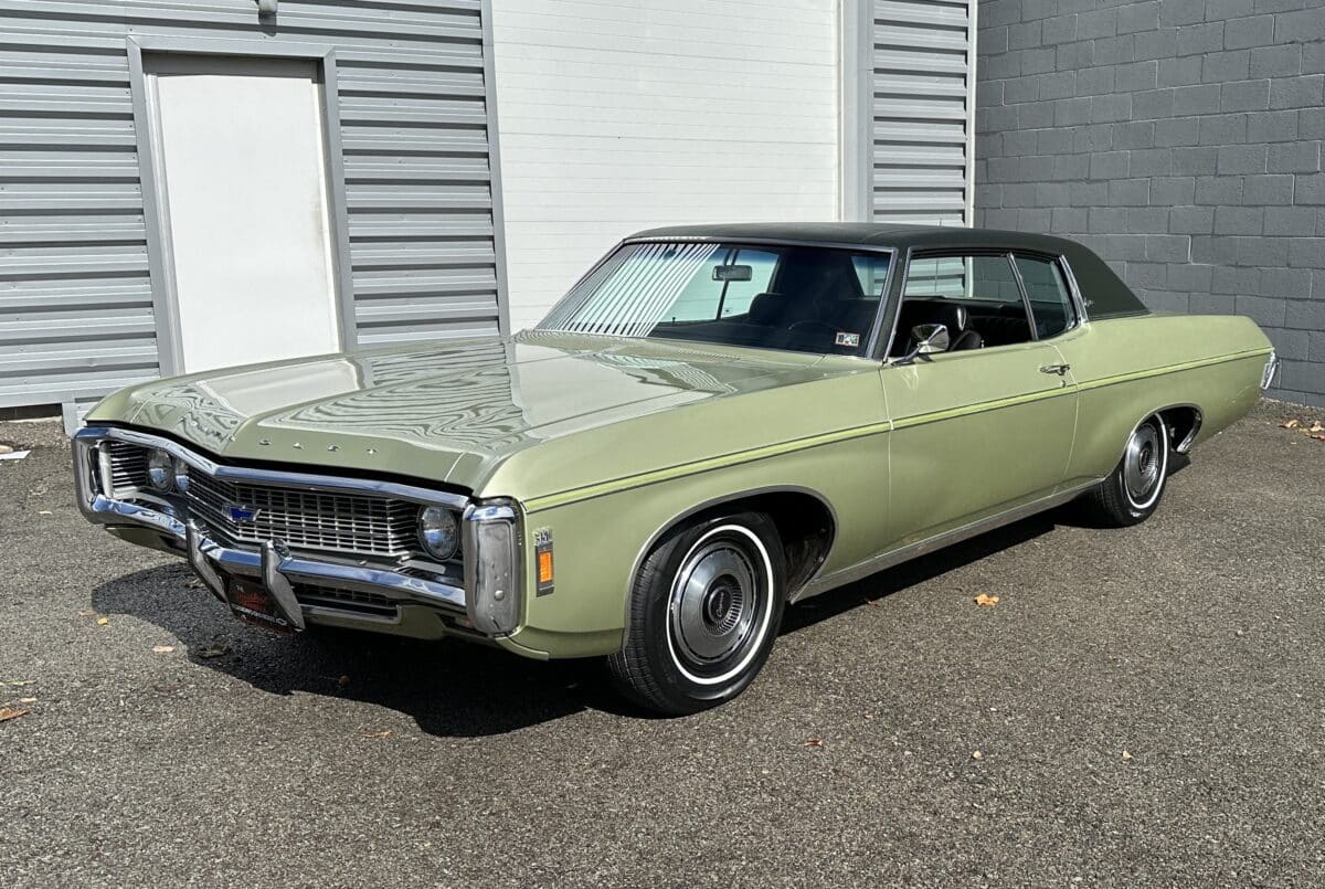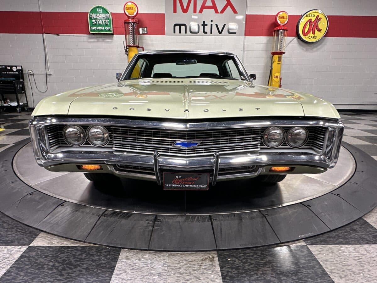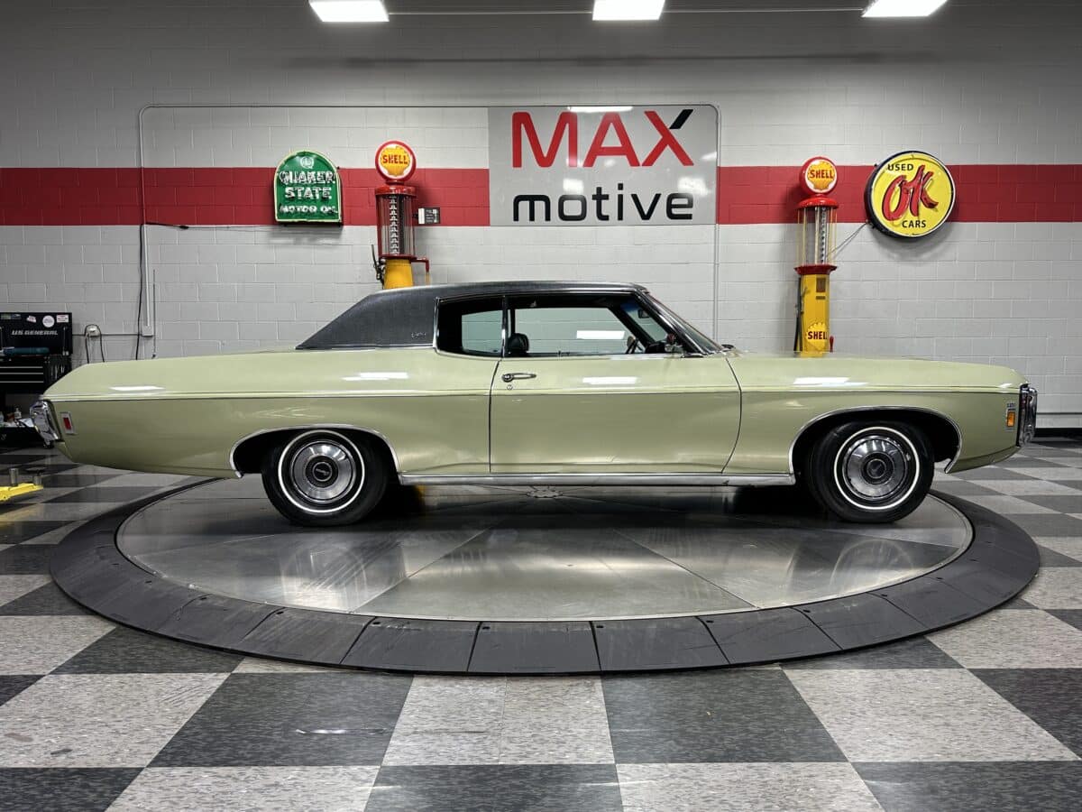 MaxMotive is pleased to offer this handsome, numbers matching 1969 Chevrolet Caprice 2-door Coupe. The original option code LM1 255 horsepower 350ci V8 engine resides under that long hood, mated to the tried and true Turbo 350 automatic transmission. That the car has been well cared for is apparent in its appearance, and that attention applies right up to the present. Just 400 miles ago, the power front disc brake conversion was installed with a new master cylinder and vacuum booster. In the rear, new wheel cylinders were installed and the 10 bolt rear received new axle bearings as well. A fresh oil change plus a radiator flush and fill assure this Caprice continues to deliver that classic smoothness. The original Frigidaire air conditioning has also been properly maintained, charged with fresh refrigerant, and thus lives up to its name. Classic proportions and appearance characterize the car with its Frost Green exterior paint, Dark Green vinyl top, the original Caprice wheel covers, and a plush black cloth interior with split bench seat. It also features power steering, the original AM radio, and cruise control. The cavernous trunk contains the original jack and spare tire along with a car cover. A car that harkens back to a renaissance period for American automobiles, loaded with familiar and time-honored hardware, this 1969 Chevrolet Caprice is a desirable find. Please be sure to see the detailed photos at www.maxmotive.com.