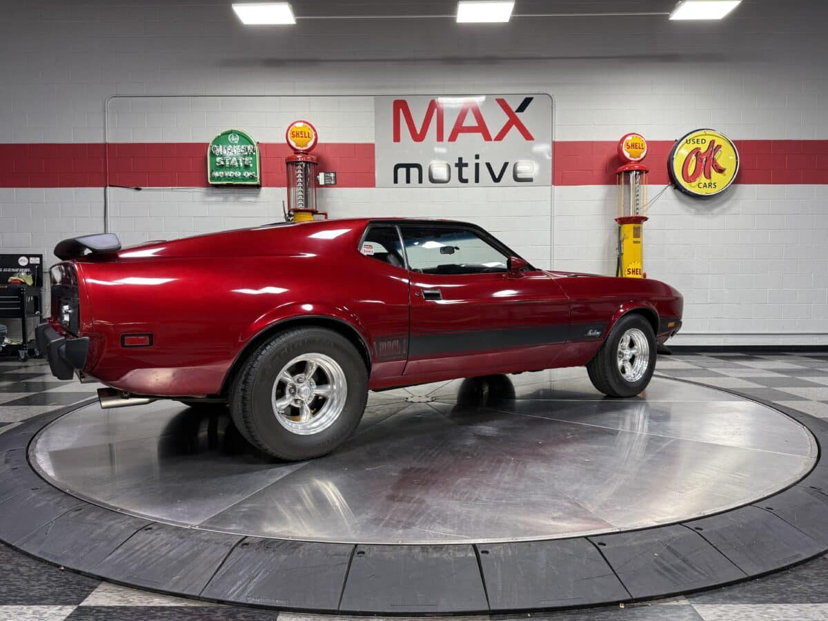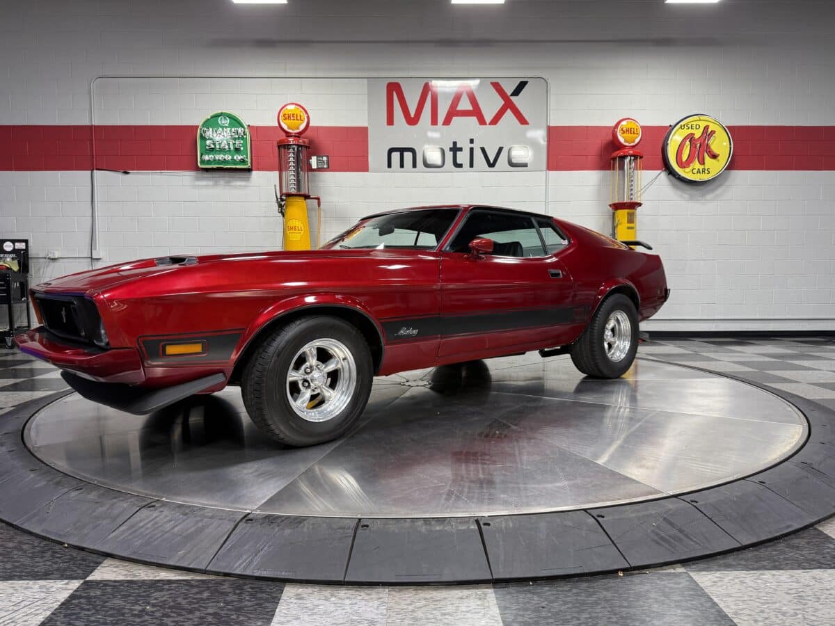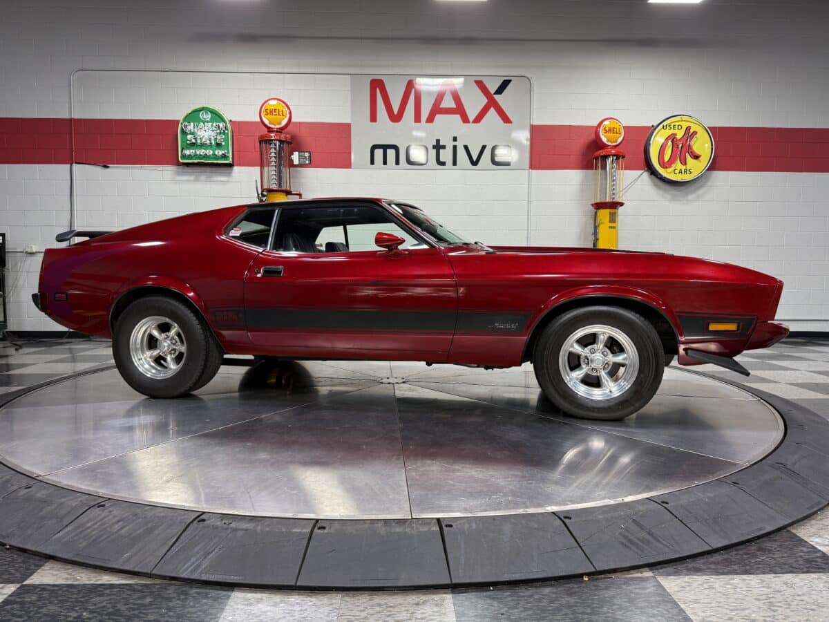 Maxmotive is proud to offer this 1973 Mustang Mach 1 Mustang. Sporting a 351 Windsor V-8 engine under the hood paired to a Tremec 5 speed manual transmission. Shifting is enjoyed through the Hurst shifter. The engine has some nice upgrades including AFR Aluminum cylinder heads, a Holley Pro Form 750 CFM carburetor. The engine has long tube headers allowing it to breathe into a dual exhaust system with aftermarket mufflers. There are QTP exhaust cutouts installed as well, allowing the exhaust to go from a mild to wild sound with a flip of the switch inside the cabin. A Moser 4.11 gear set has been installed into the Ford 9” rear axle. With all of the power, rigidity and body strength become a key component. Welded in sub-frame connectors, in addition to rear leaf spring helpers keep the Mustang body secure. Disc brakes at all 4 corners handle the stopping power. The front calipers are Wilwood, while the rear are a standard OEM set up. A new proportioning valve and brake reservoir were installed within the last year. Red LED halo rings in the headlights help give the stylish Mustang an aggressive, but recognizable look. The heater system and windshield wiper motor are not hooked up, so both systems are currently inoperable. For more pictures and information, check out our website www.maxmotive.com