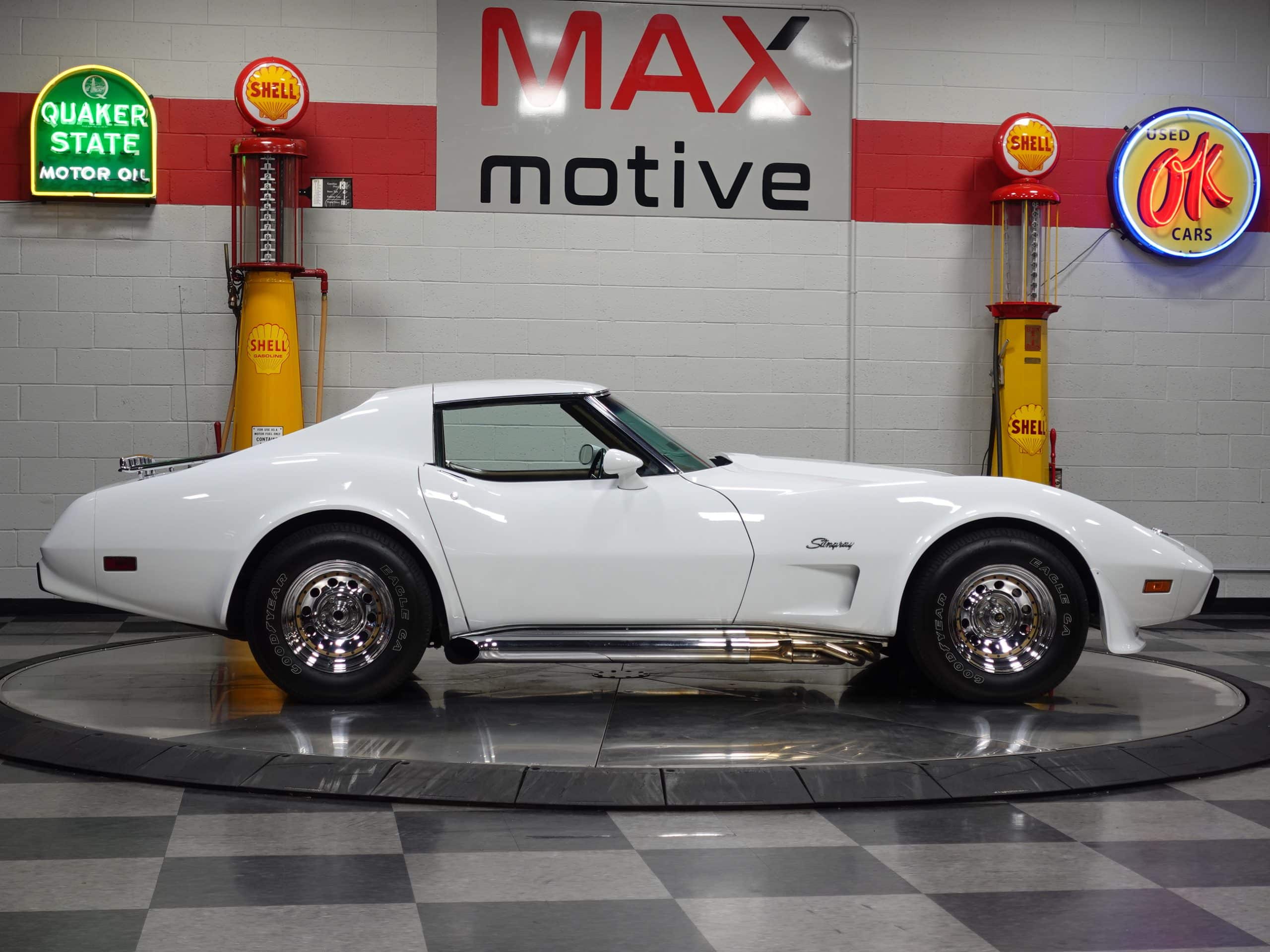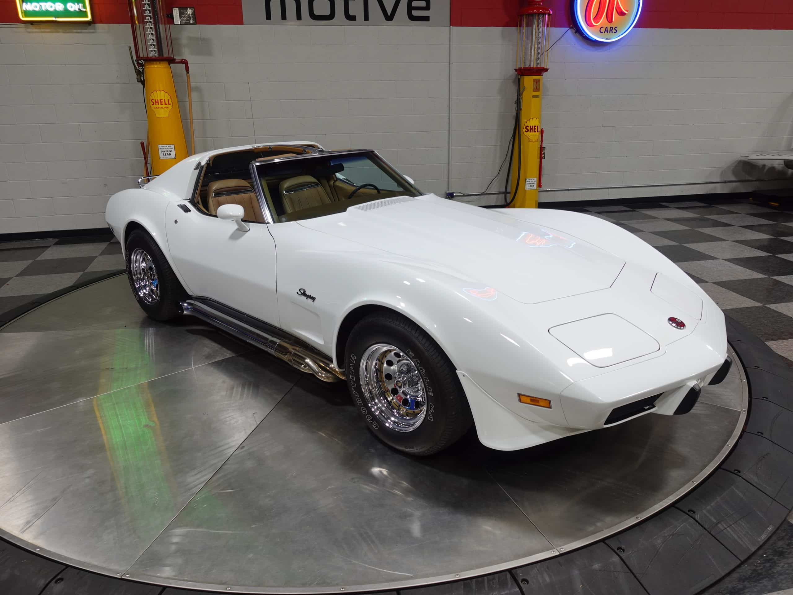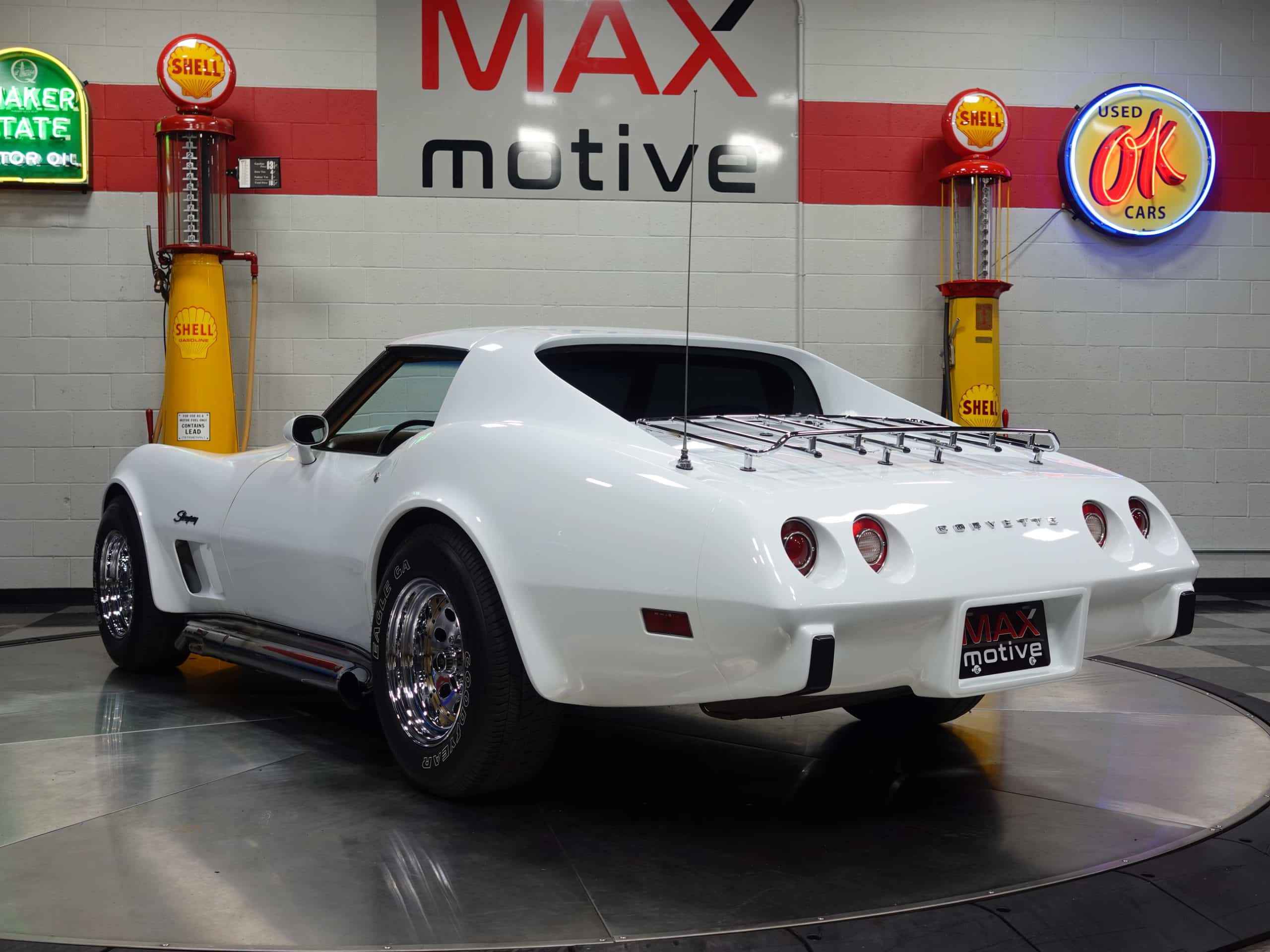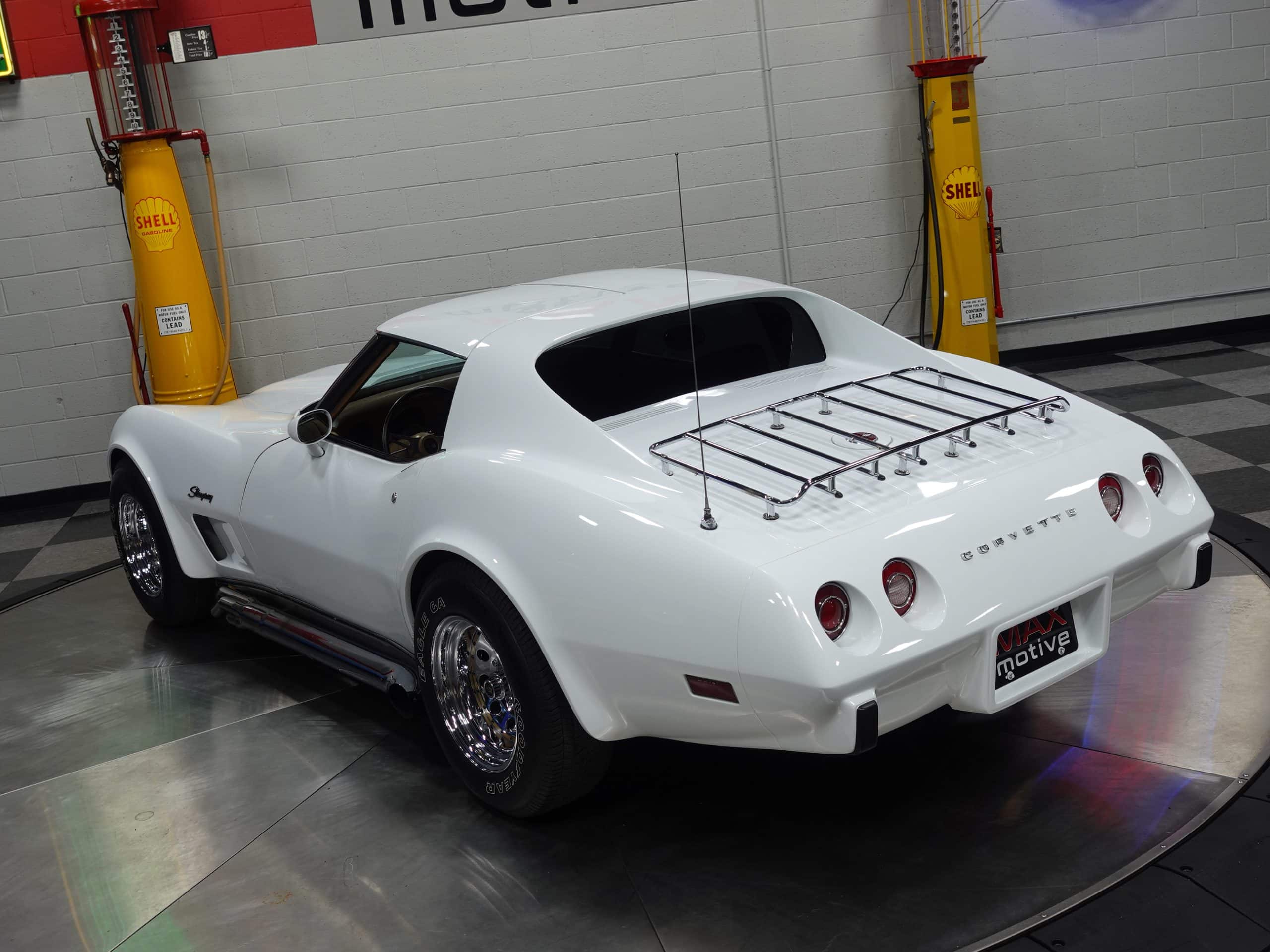 Here’s a classic hot rod in Classic White, a 1975 Chevrolet Corvette Stingray Coupe available from the MaxMotive Pittsburgh Showroom. It has the classic drivetrain consisting of a 350ci small block with a Holley 4-barrel and chrome Hooker Super Competition headers dumping into chrome side pipes, and a four-speed manual transmission with Hurst T-handle shifter. Chrome Keystone wheels are wrapped in outline white letter Goodyear Eagle radials. The Medium Saddle interior shows that this is an original air conditioned car, and a Sun Super Tach II and a SoundStream stereo with cassette have been added. It comes with the vinyl bags for the T-roofs for sunny-day cruising. This 1975 Chevrolet Corvette Stingray Coupe is ready for miles of cruising enjoyment. Be sure to check out the detailed photos at www.maxmotive.com.